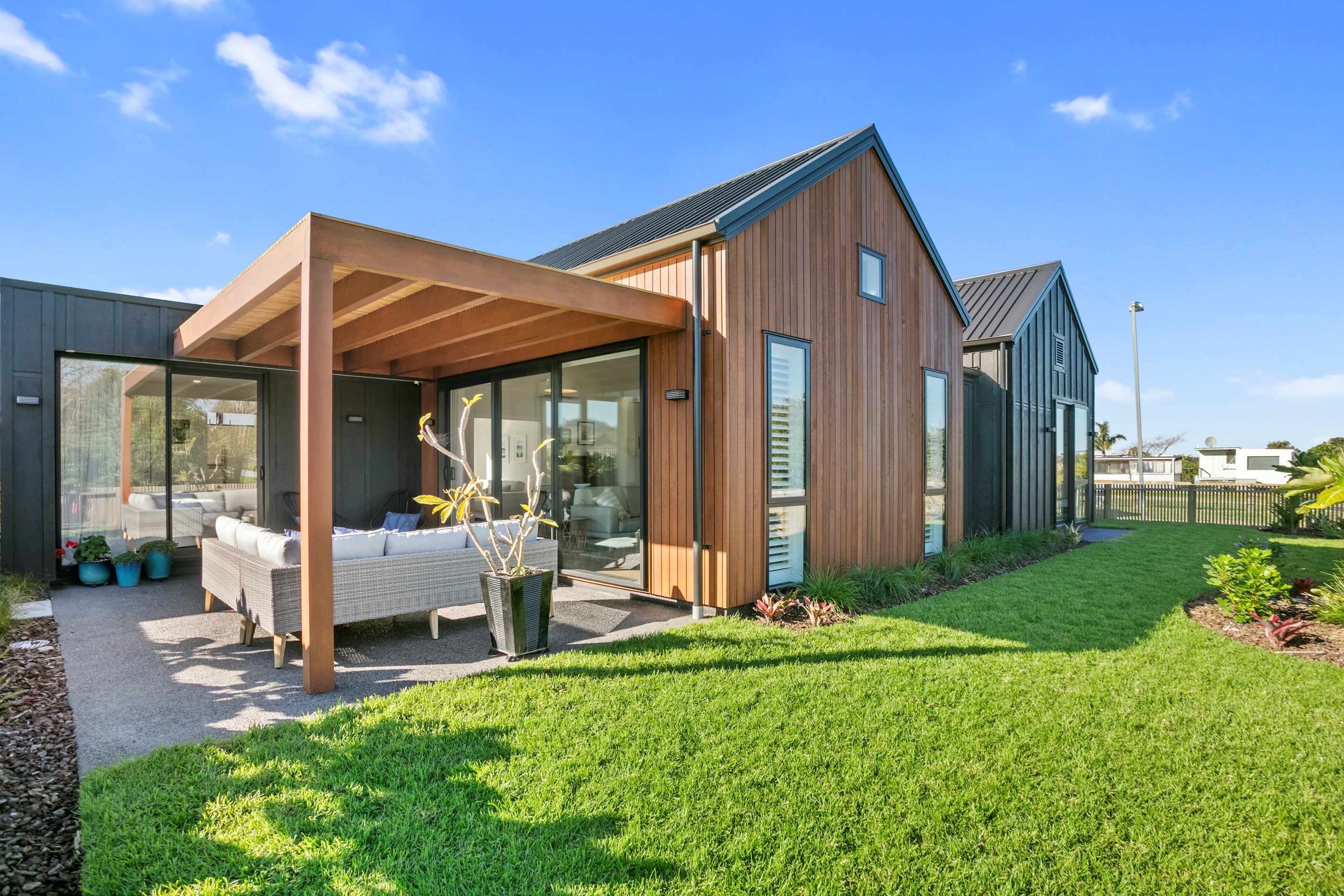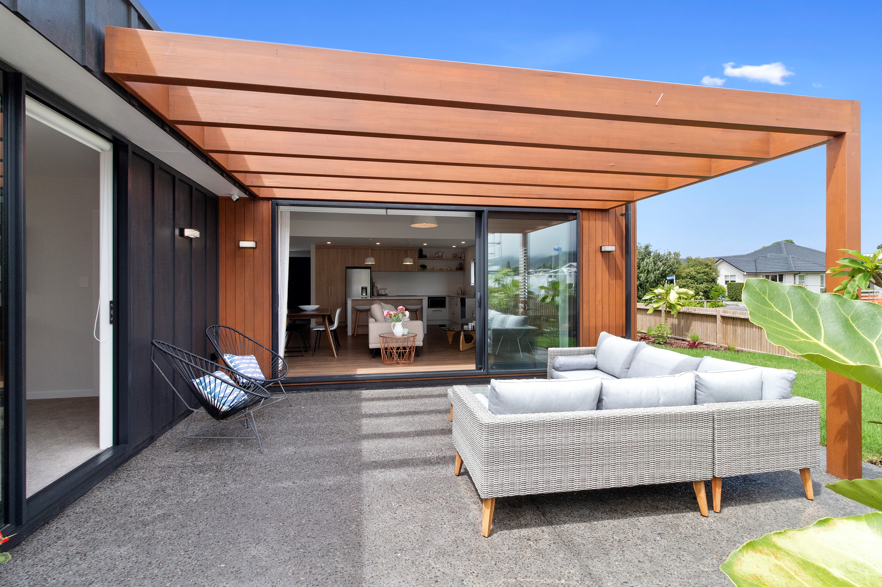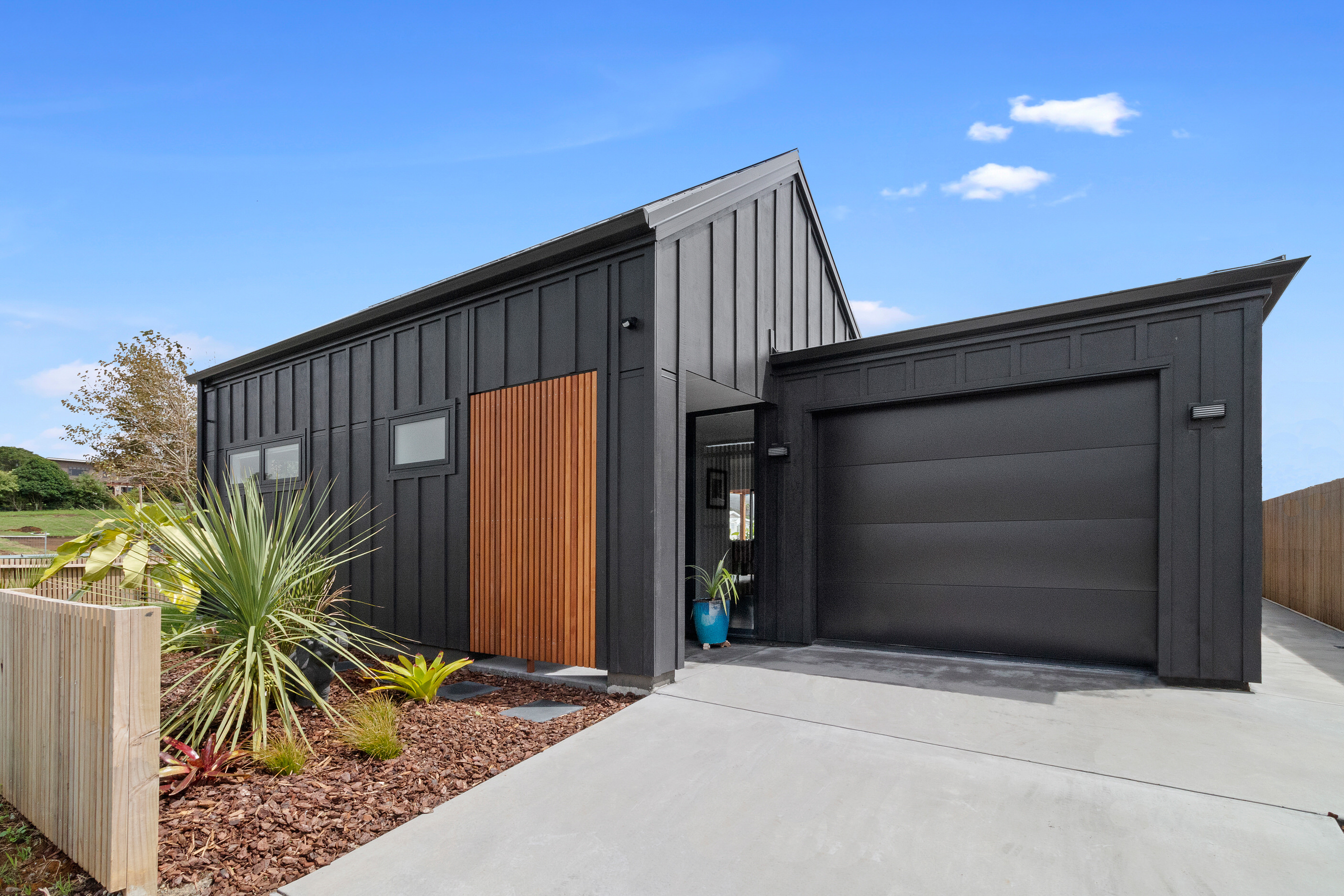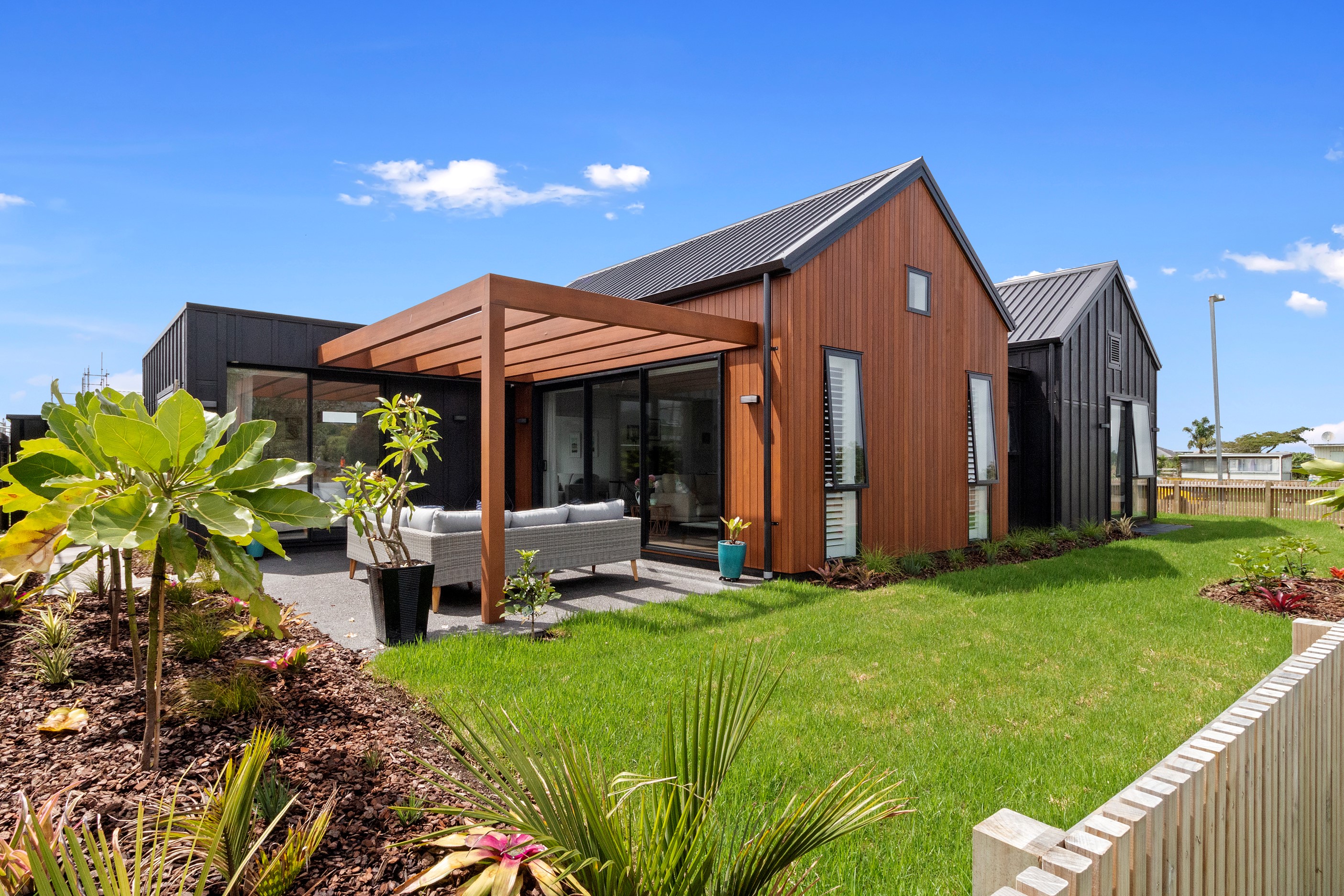 Dark exteriors are a bold choice. When well executed, the result can be striking, and this three-bedroom home is a prime example. Offset by warm vertical cedar features, black board-and-batten cladding and black iron roofing create moody sophistication. Step inside and dark becomes light in a crisp white palette paired with timber flooring and cabinetry. Although modest in size, every inch of this 140sqm home has been designed to enhance its sense of spaciousness. In the living area, large sliding doors take advantage of the north-facing aspect and lead to an outdoor area beneath a stylish timber pergola. With versatile spaces, it’s clear that this home is all about family flexibility. A well-considered floorplan allows for two double bedrooms and an additional room has been designed to serve as a third bedroom, office or second living area. The internally accessible carpeted garage will no doubt become a hobby haven or weekend hangout space for kids and teens. Clever use of space continues into both of the fully tiled bathrooms, which feature large walk-in showers. As a bonus, an outdoor shower can be used to wash off sand and salt from the nearby beach.