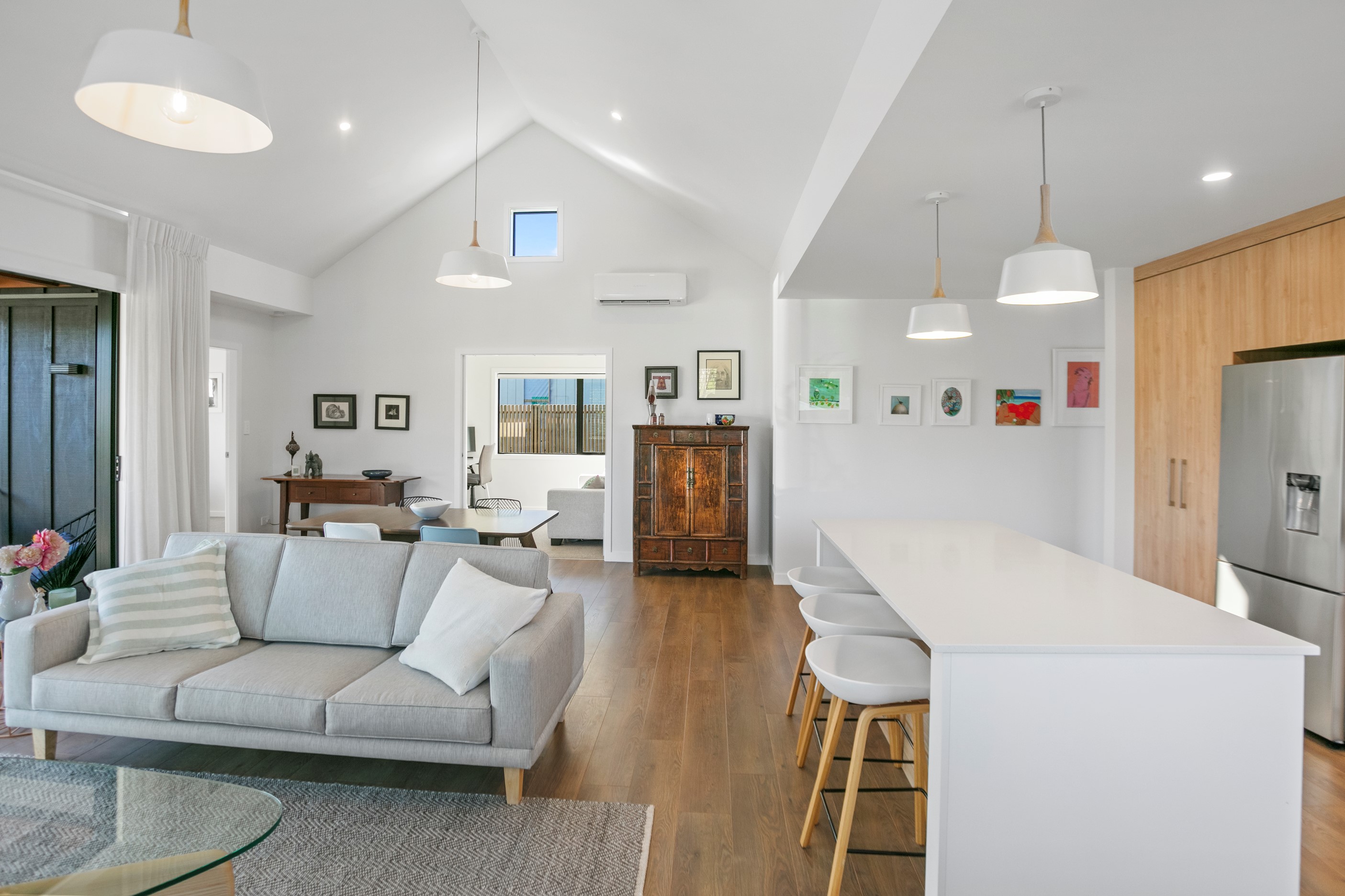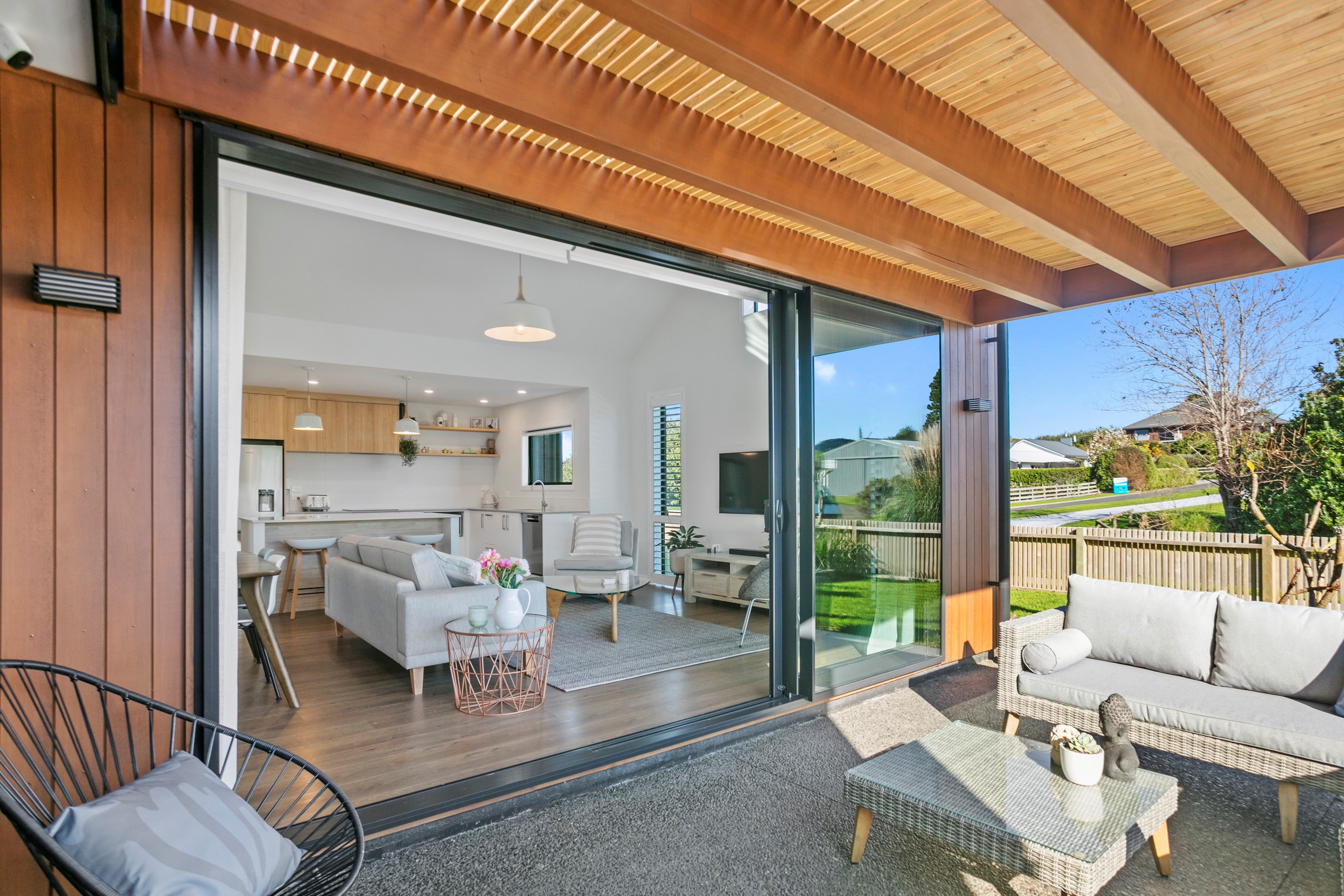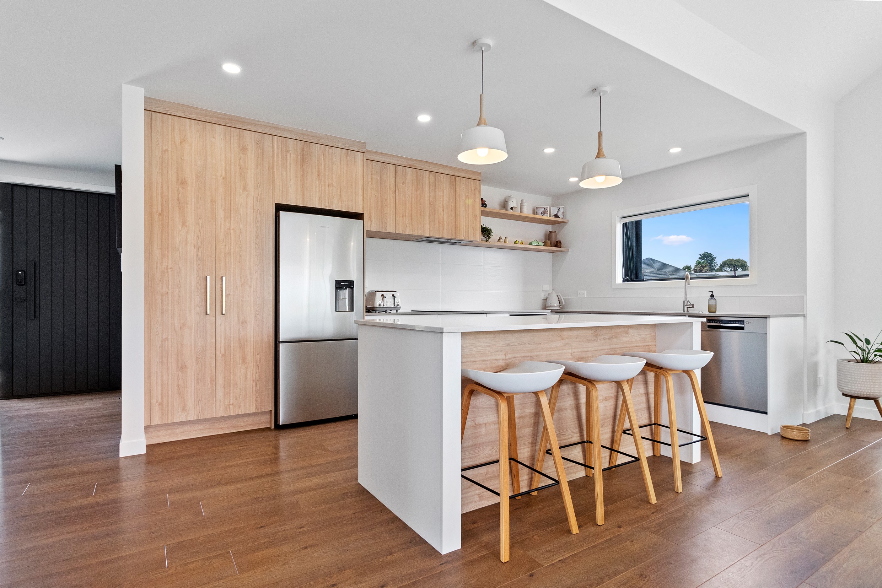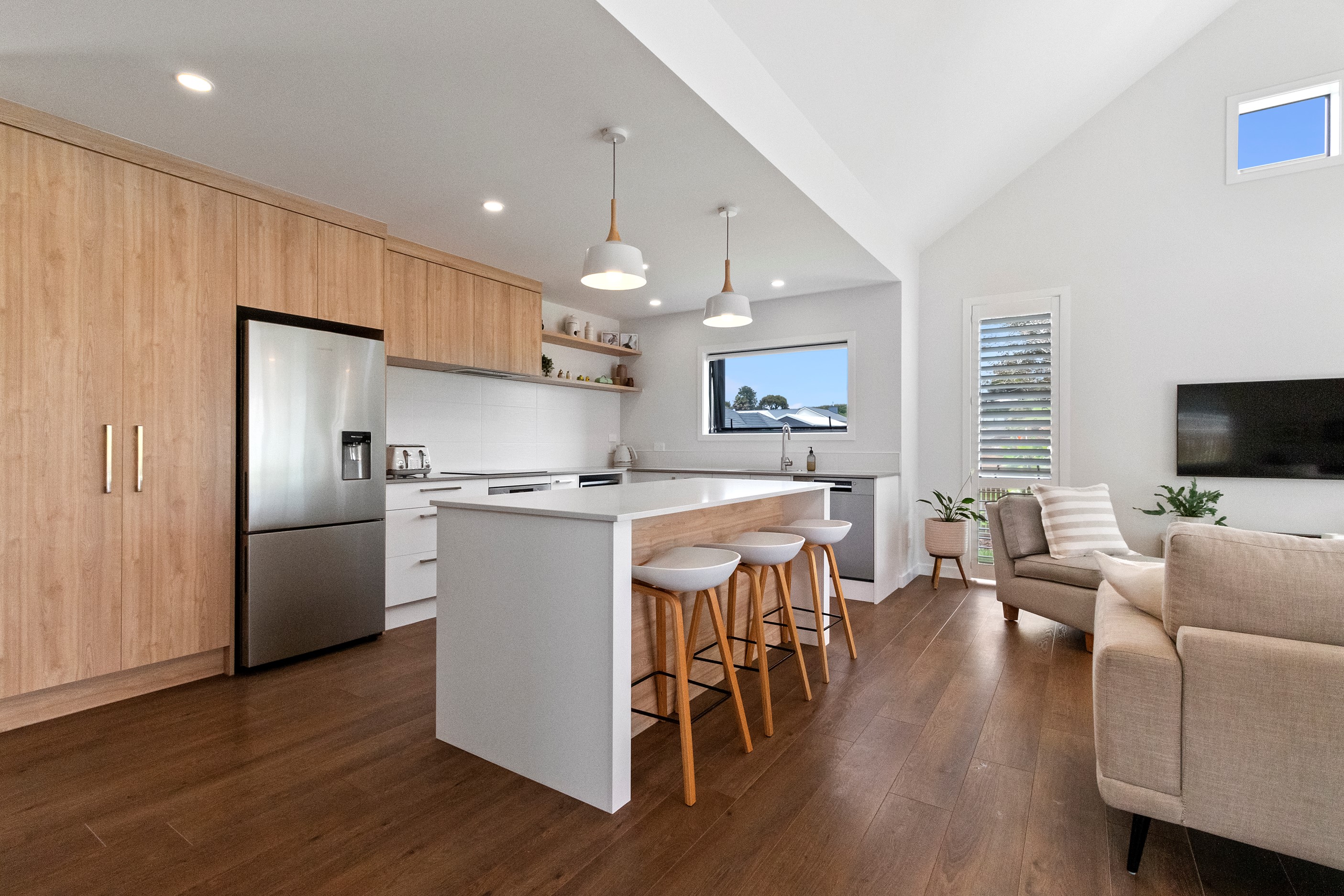 Dark exteriors are a bold choice. When well executed, the result can be striking, and this three-bedroom home is a prime example. Offset by warm vertical cedar features, black board-and-batten cladding and black iron roofing create moody sophistication. Step inside and dark becomes light in a crisp white palette paired with timber flooring and cabinetry. Although modest in size, every inch of this 140sqm home has been designed to enhance its sense of spaciousness. In the living area, large sliding doors take advantage of the north-facing aspect and lead to an outdoor area beneath a stylish timber pergola. With versatile spaces, it’s clear that this home is all about family flexibility. A well-considered floorplan allows for two double bedrooms and an additional room has been designed to serve as a third bedroom, office or second living area. The internally accessible carpeted garage will no doubt become a hobby haven or weekend hangout space for kids and teens. Clever use of space continues into both of the fully tiled bathrooms, which feature large walk-in showers. As a bonus, an outdoor shower can be used to wash off sand and salt from the nearby beach.