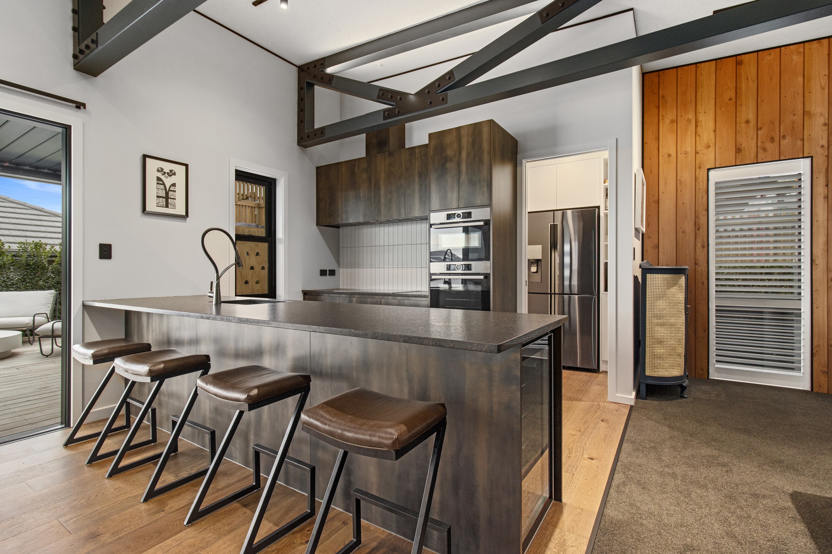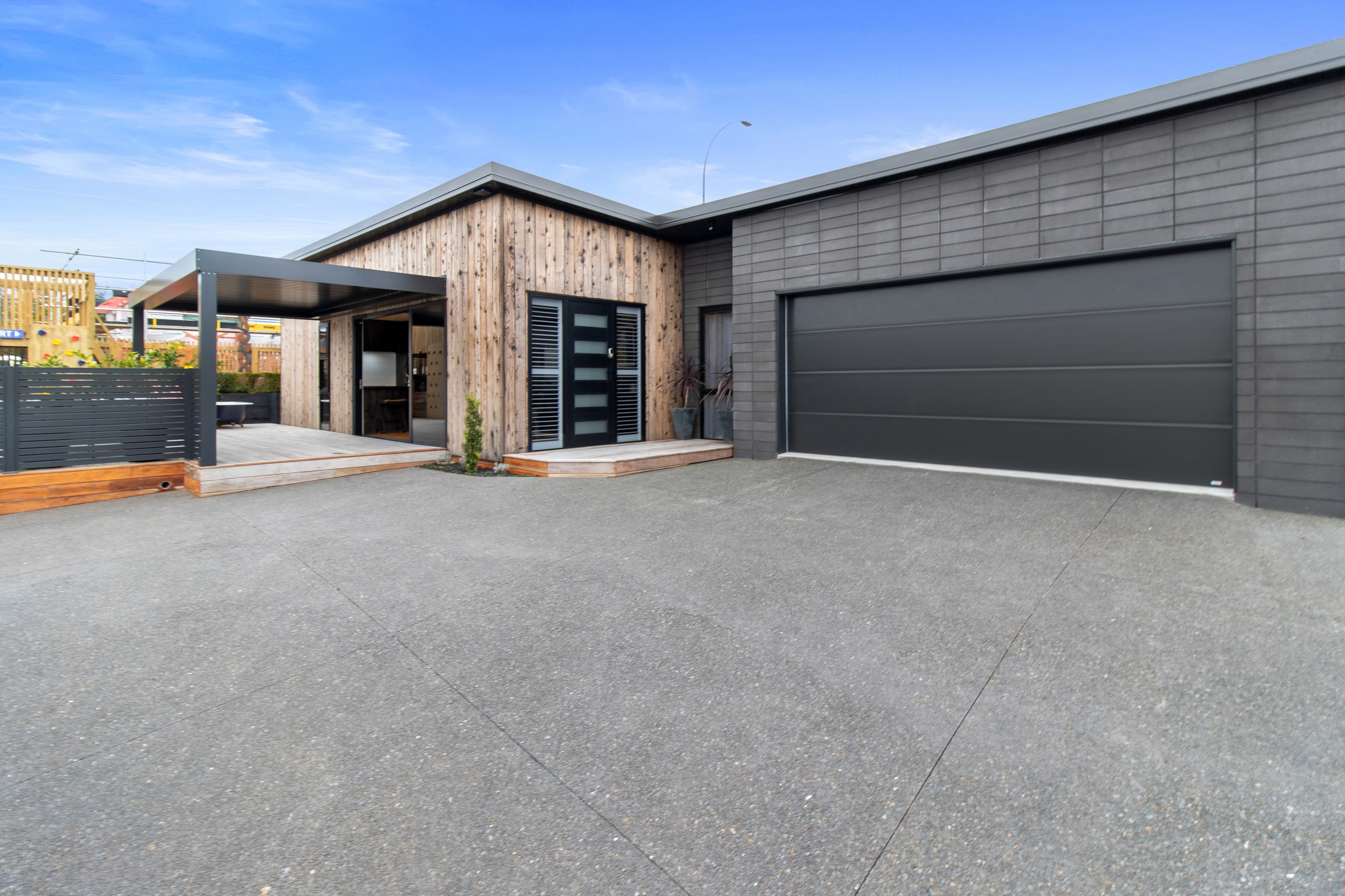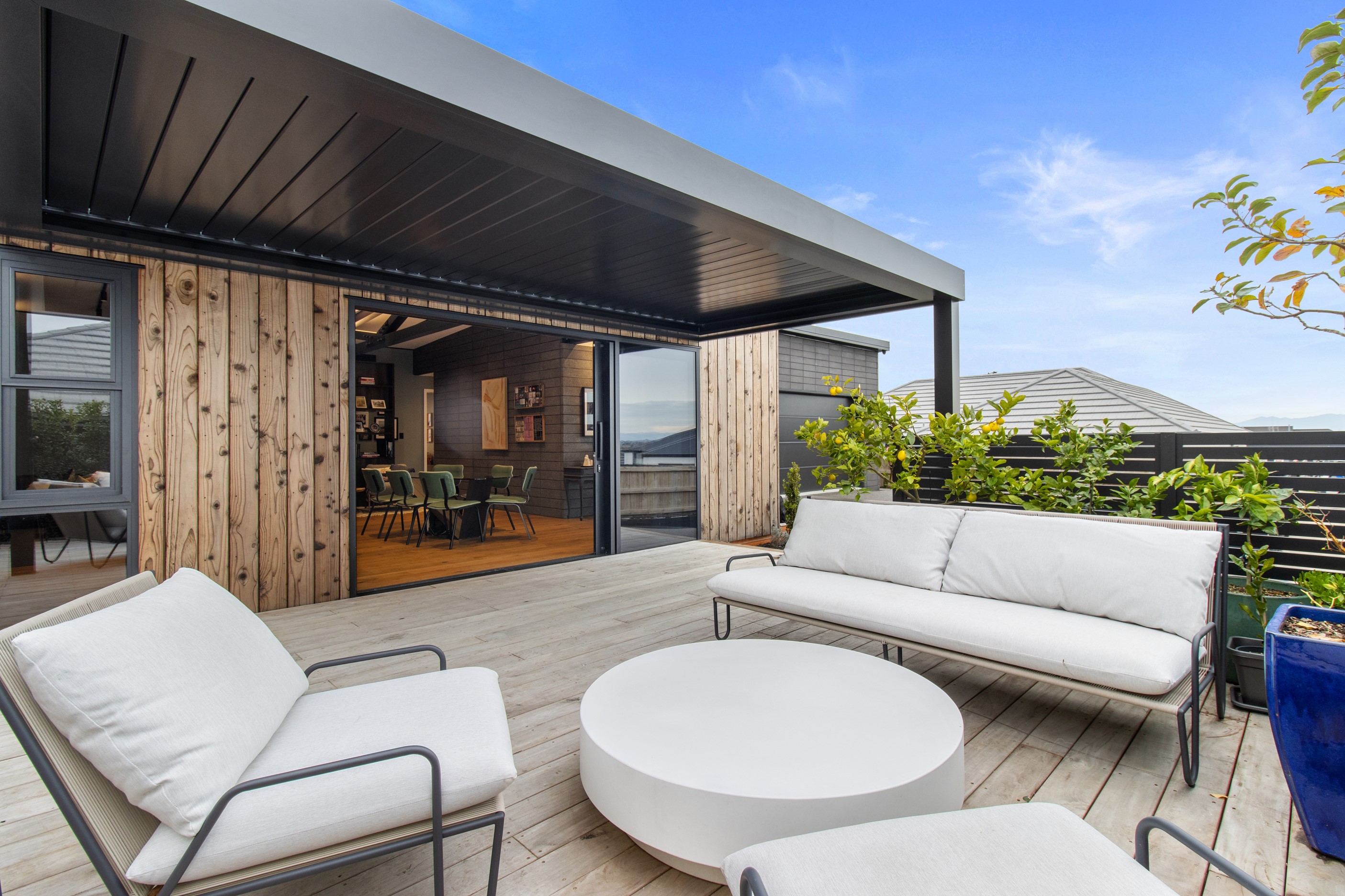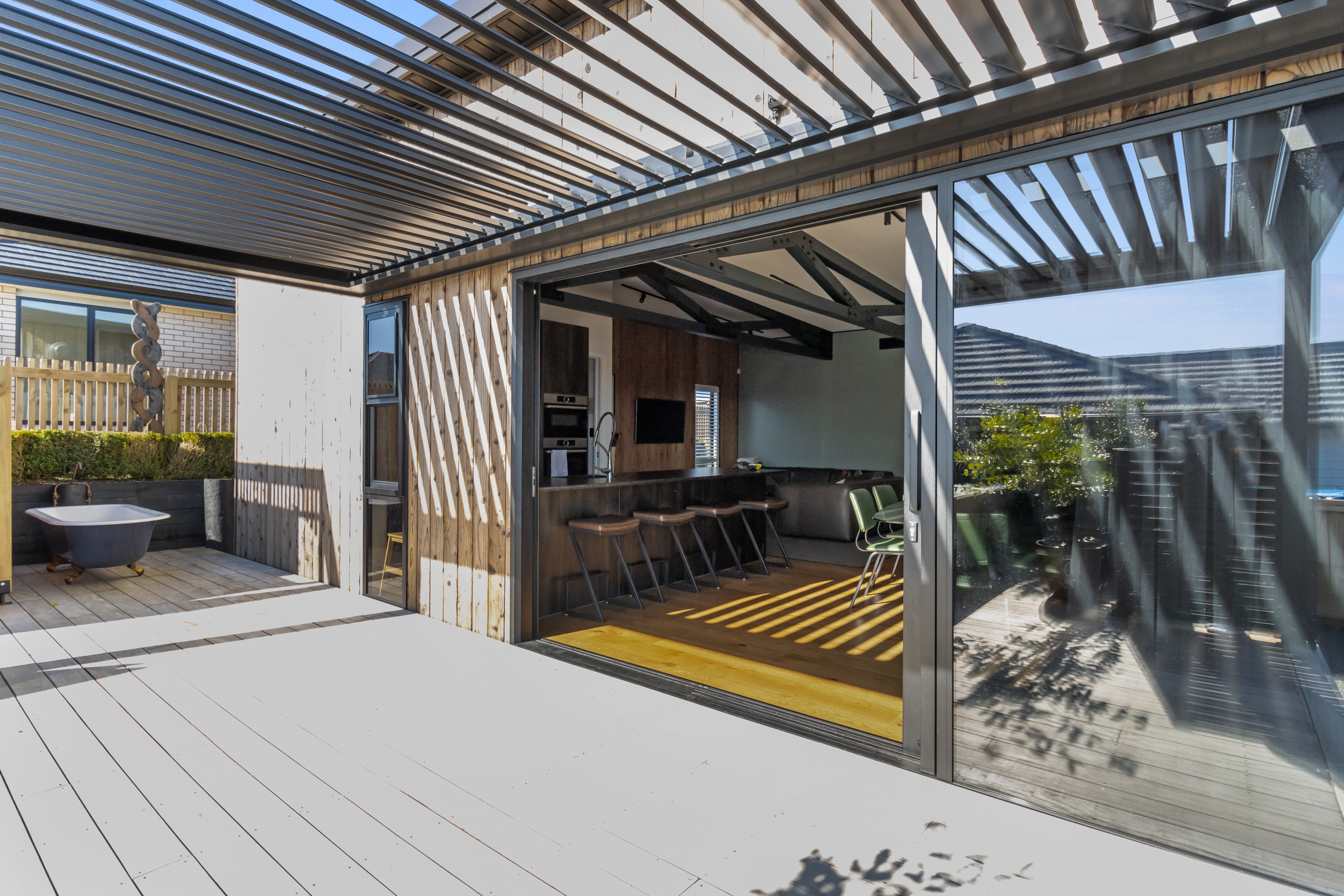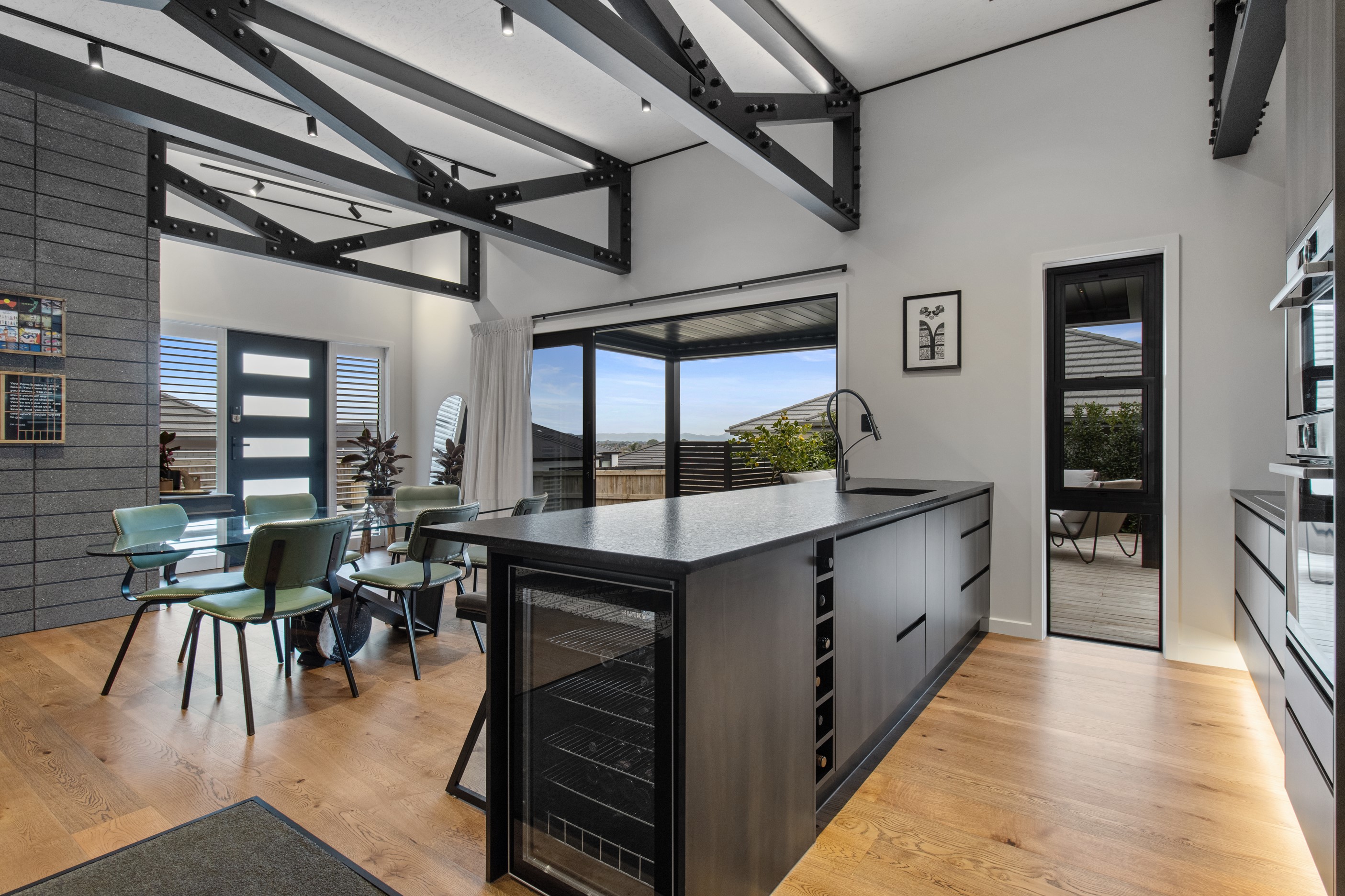 This 180sqm modern family home utilises every inch of its suburban section, orientated perfectly to capture the surrounding views and magnificent sunsets. Enlightened product choices showcase how a smaller home can be practical while still packing a design punch. Minimal maintenance and a strong interior-exterior cohesion set this open-plan home apart. Stunning, locally sourced redwood Pika-Pika-finished cladding adds natural warmth to the exterior. Manicured gardens, a large covered deck complete with a kids’ fort and bath round out the owner’s vision for an urban retreat. Step off the deck through the large sliding doors and be welcomed by an expansive kitchen, living and dining room. Exposed beams catch the eye and are beautifully highlighted by statement fixings and lighting. The honed brick and redwood feature walls perfectly complement the kitchen cabinetry and leathered-granite benchtop. The continuity of key design elements like the custom cabinetry in the living, bedrooms, ensuite and bathroom enhance the feeling of sophistication. The large family bathroom offers another wow moment with designer tiles, a freestanding stone bath and a one-off semi-circular mirror. It’s the definition of opulence.