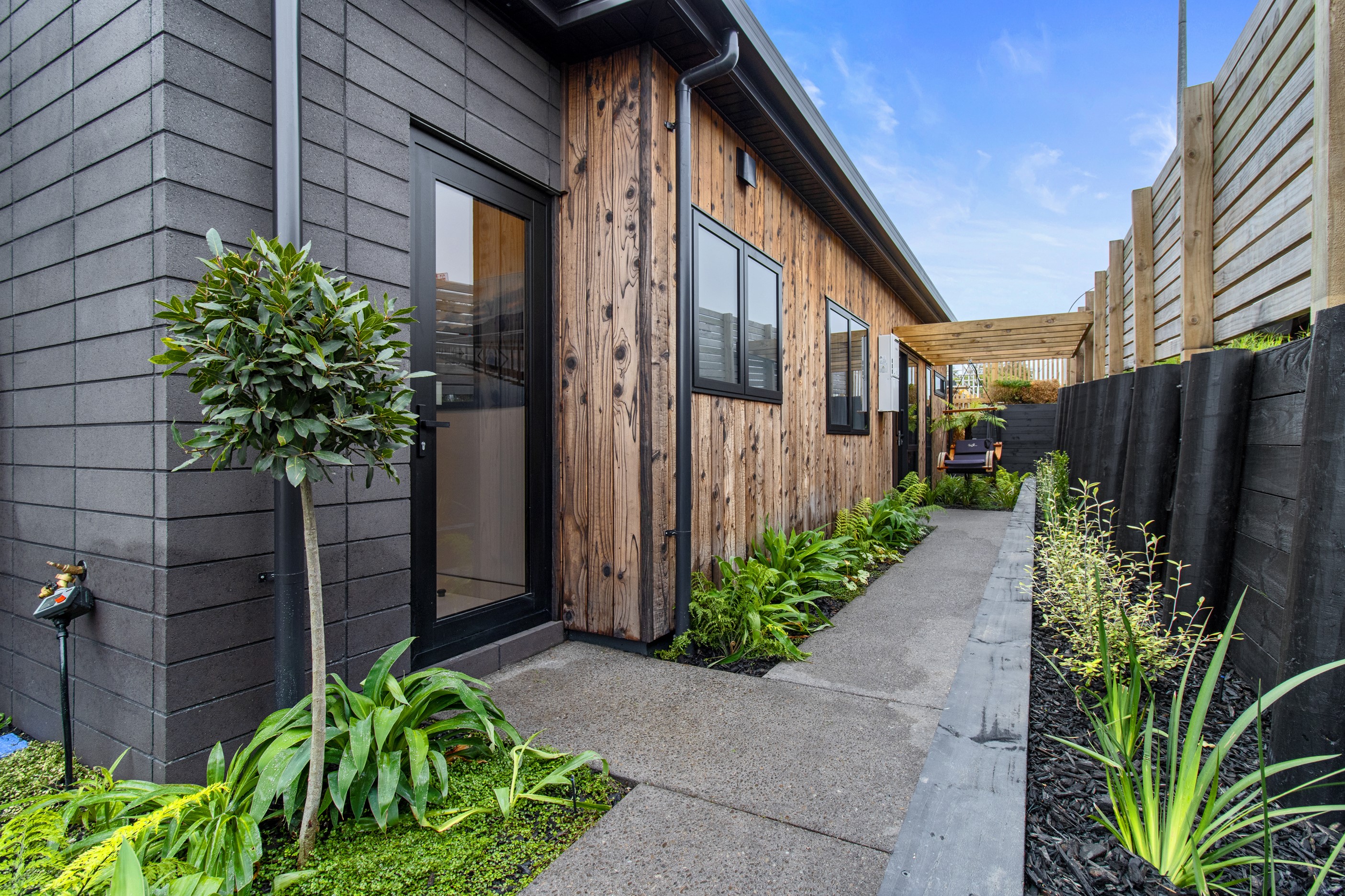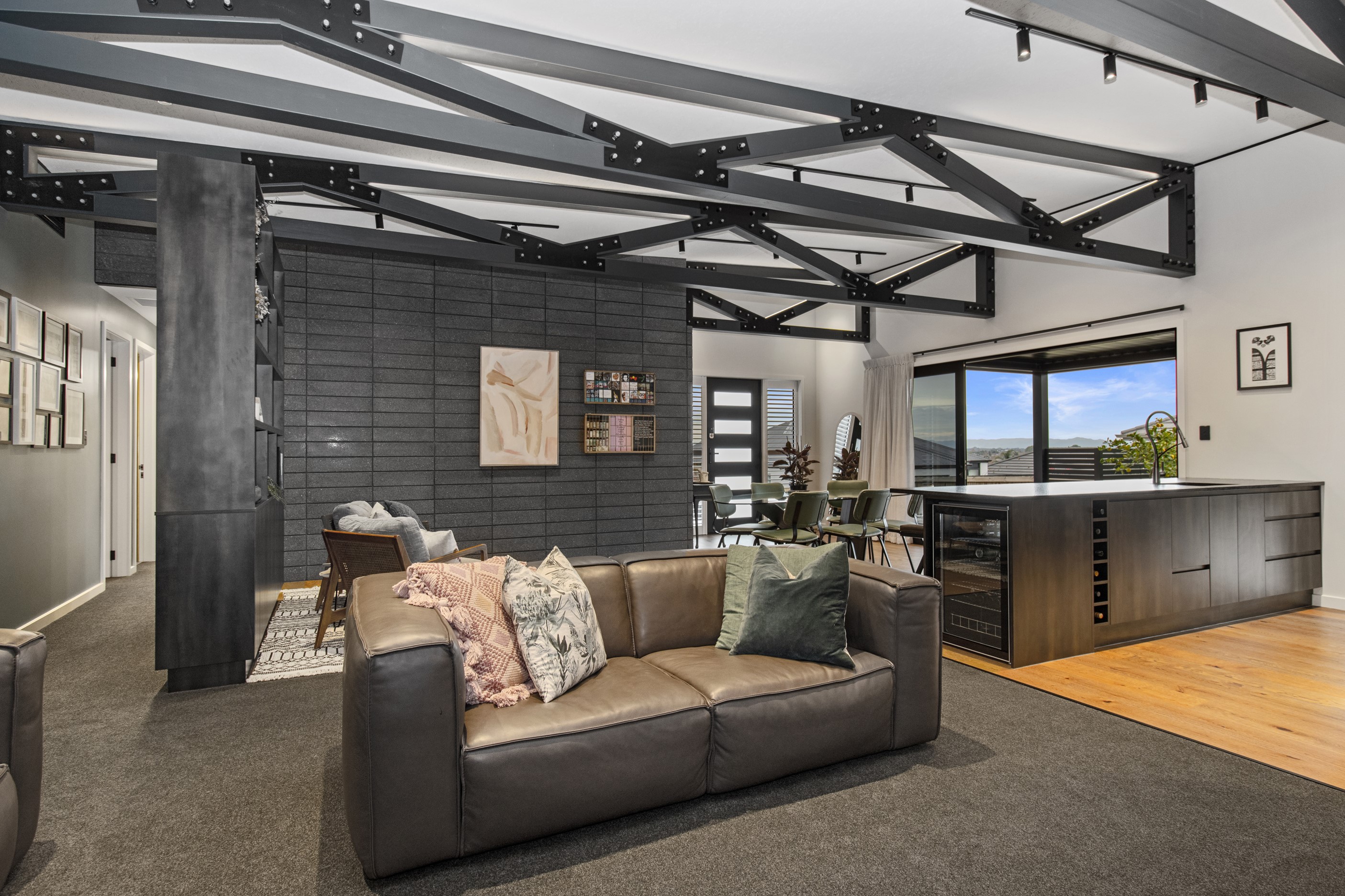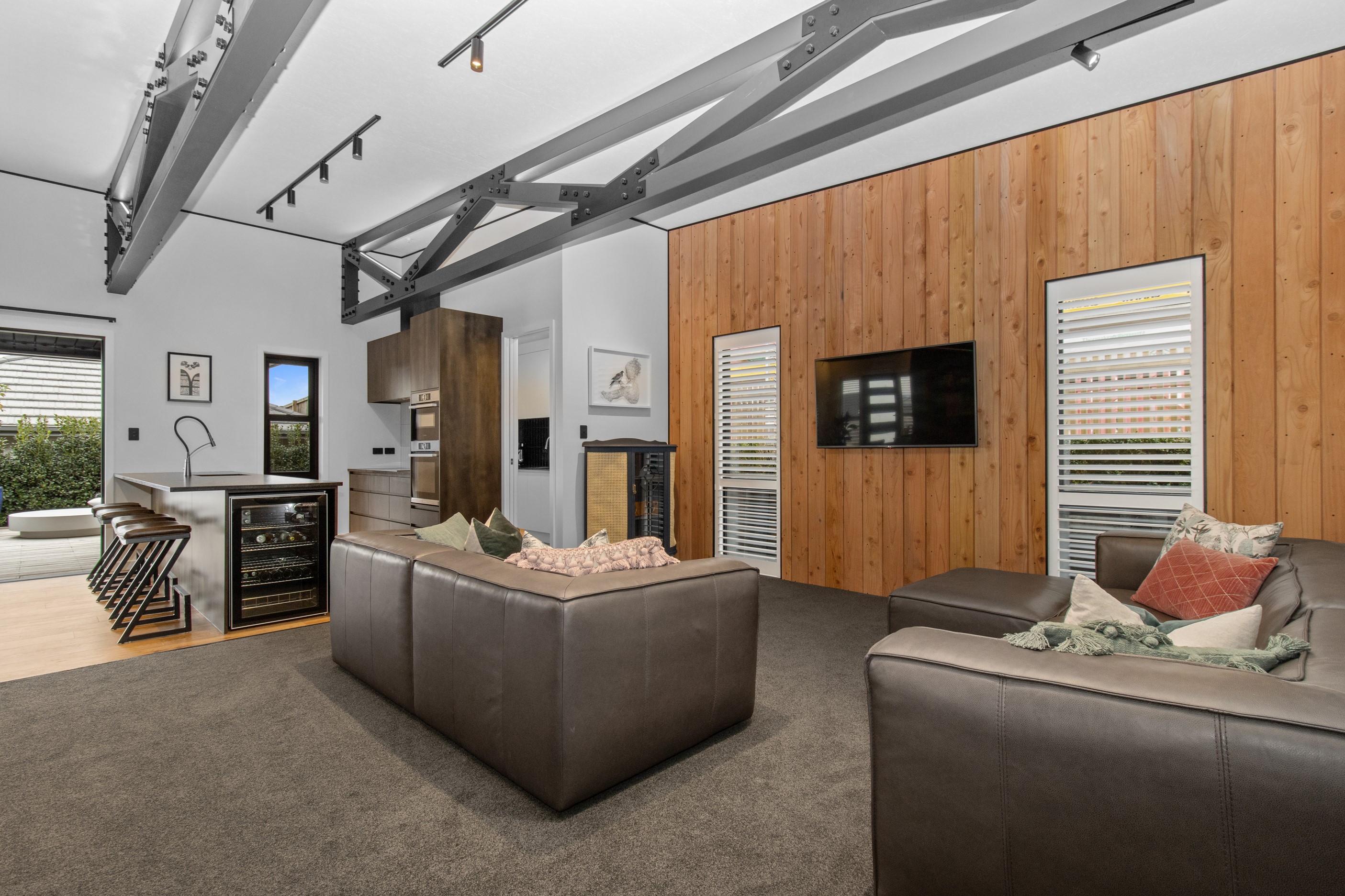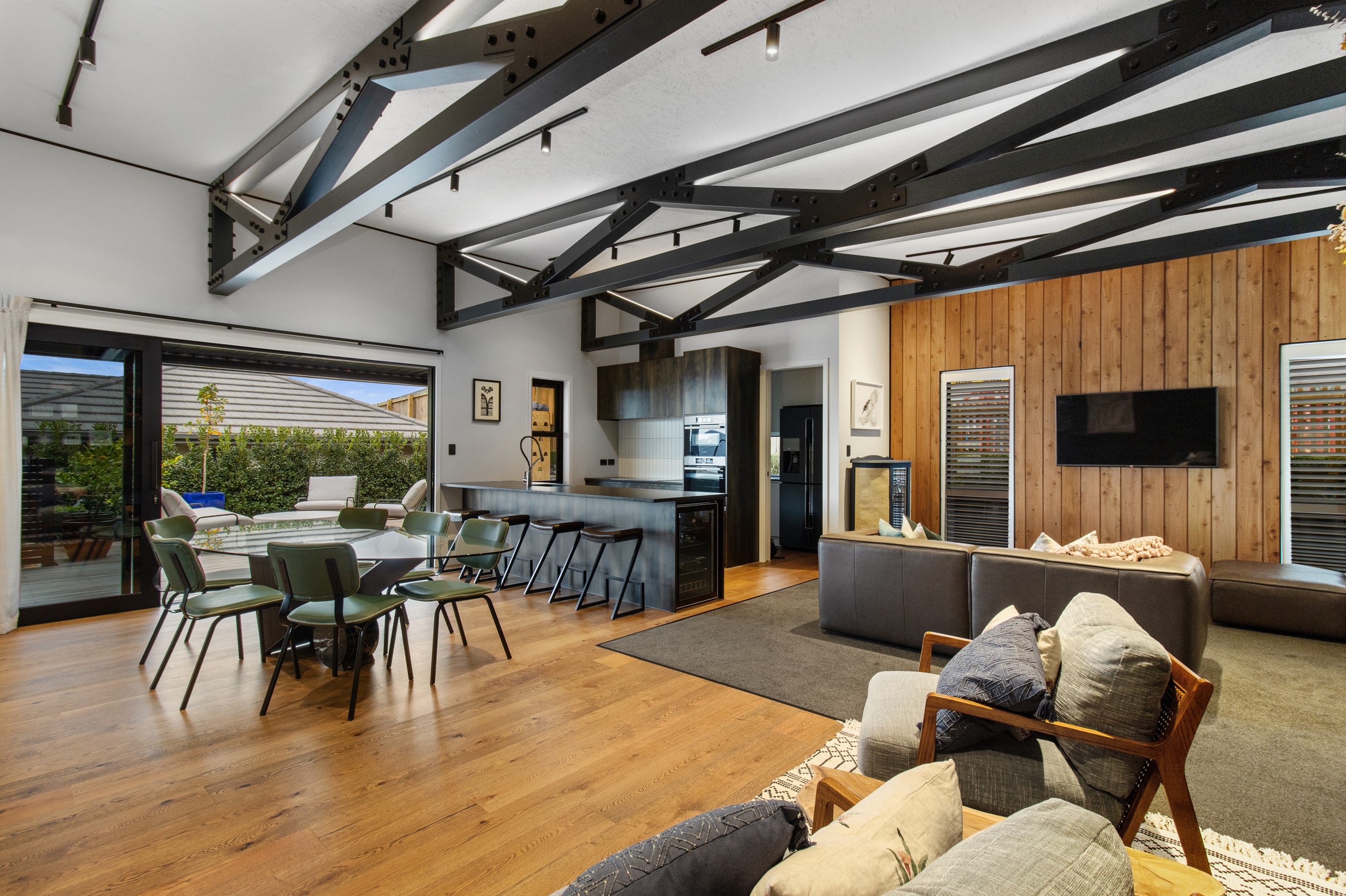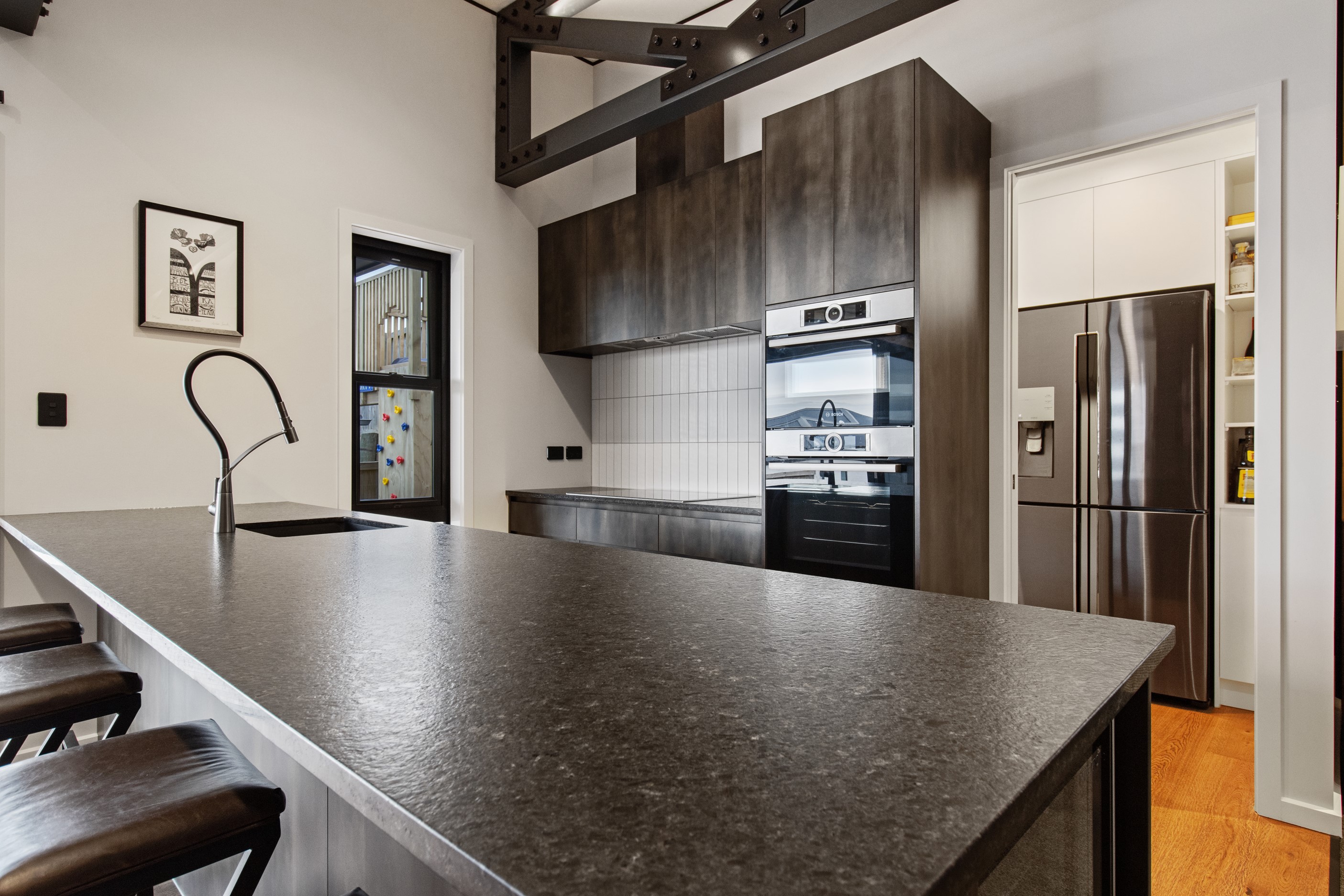 This 180sqm modern family home utilises every inch of its suburban section, orientated perfectly to capture the surrounding views and magnificent sunsets. Enlightened product choices showcase how a smaller home can be practical while still packing a design punch. Minimal maintenance and a strong interior-exterior cohesion set this open-plan home apart. Stunning, locally sourced redwood Pika-Pika-finished cladding adds natural warmth to the exterior. Manicured gardens, a large covered deck complete with a kids’ fort and bath round out the owner’s vision for an urban retreat. Step off the deck through the large sliding doors and be welcomed by an expansive kitchen, living and dining room. Exposed beams catch the eye and are beautifully highlighted by statement fixings and lighting. The honed brick and redwood feature walls perfectly complement the kitchen cabinetry and leathered-granite benchtop. The continuity of key design elements like the custom cabinetry in the living, bedrooms, ensuite and bathroom enhance the feeling of sophistication. The large family bathroom offers another wow moment with designer tiles, a freestanding stone bath and a one-off semi-circular mirror. It’s the definition of opulence.