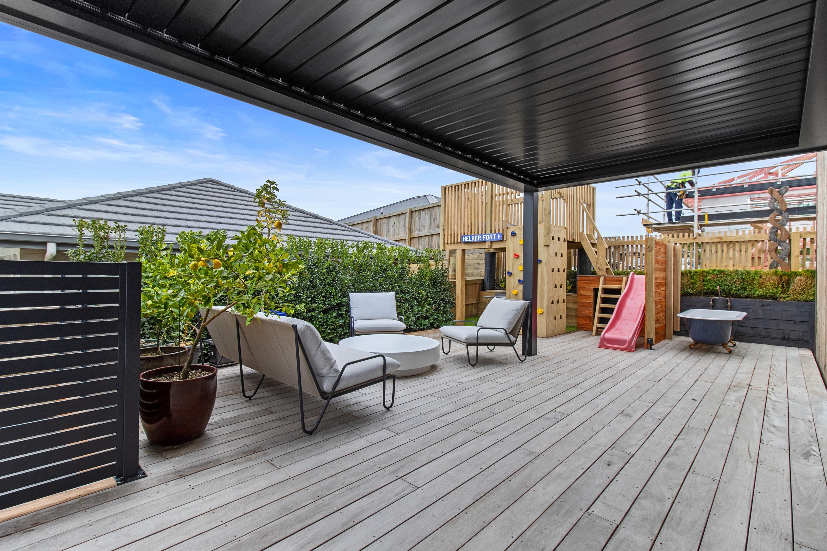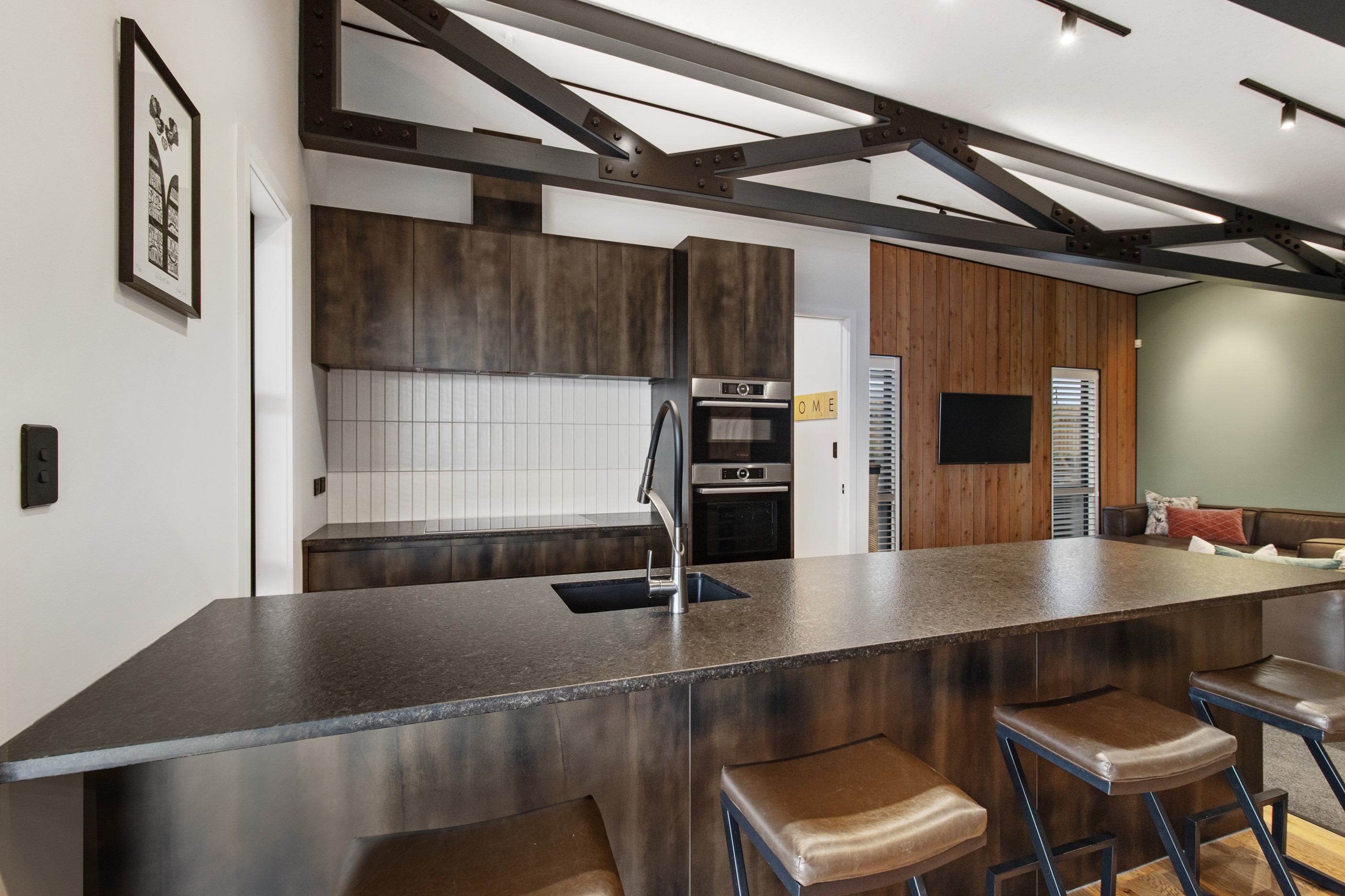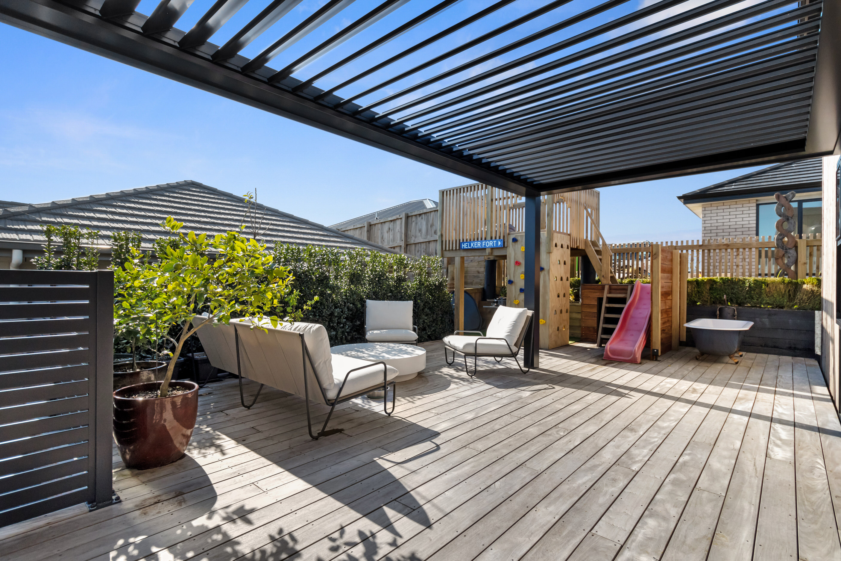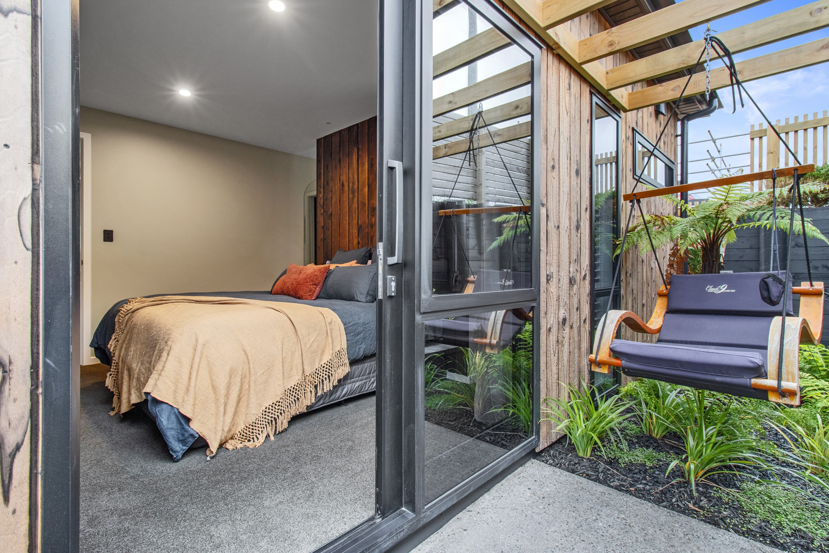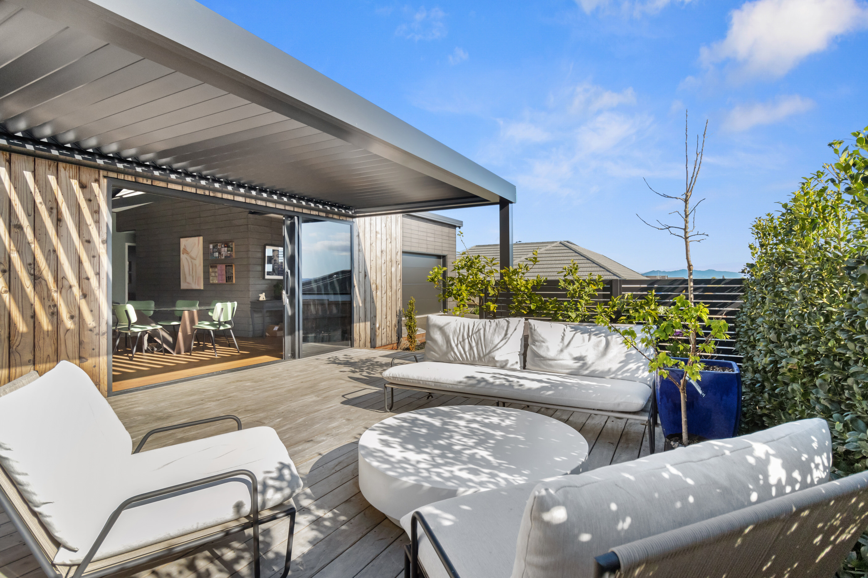 This 180sqm modern family home utilises every inch of its suburban section, orientated perfectly to capture the surrounding views and magnificent sunsets. Enlightened product choices showcase how a smaller home can be practical while still packing a design punch. Minimal maintenance and a strong interior-exterior cohesion set this open-plan home apart. Stunning, locally sourced redwood Pika-Pika-finished cladding adds natural warmth to the exterior. Manicured gardens, a large covered deck complete with a kids’ fort and bath round out the owner’s vision for an urban retreat. Step off the deck through the large sliding doors and be welcomed by an expansive kitchen, living and dining room. Exposed beams catch the eye and are beautifully highlighted by statement fixings and lighting. The honed brick and redwood feature walls perfectly complement the kitchen cabinetry and leathered-granite benchtop. The continuity of key design elements like the custom cabinetry in the living, bedrooms, ensuite and bathroom enhance the feeling of sophistication. The large family bathroom offers another wow moment with designer tiles, a freestanding stone bath and a one-off semi-circular mirror. It’s the definition of opulence.