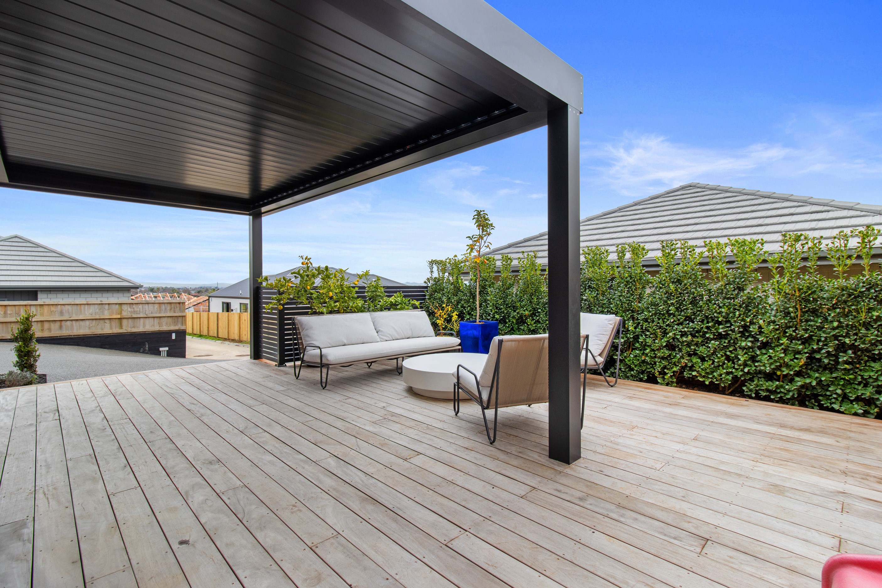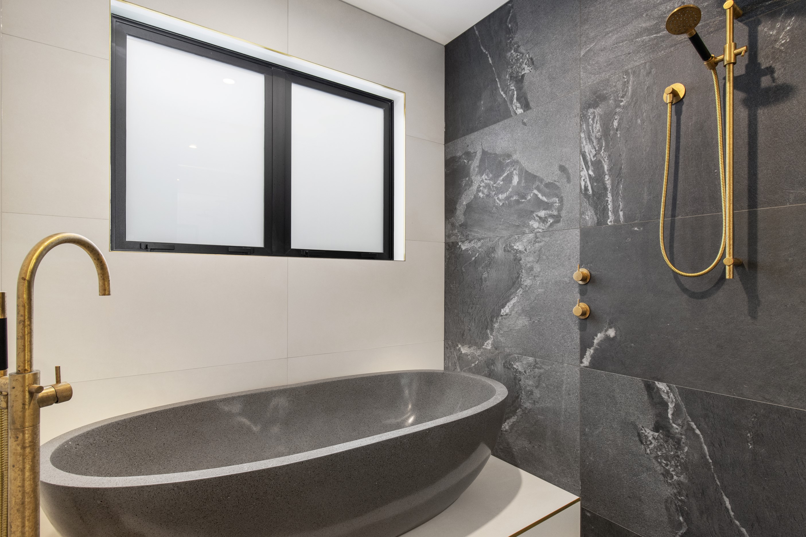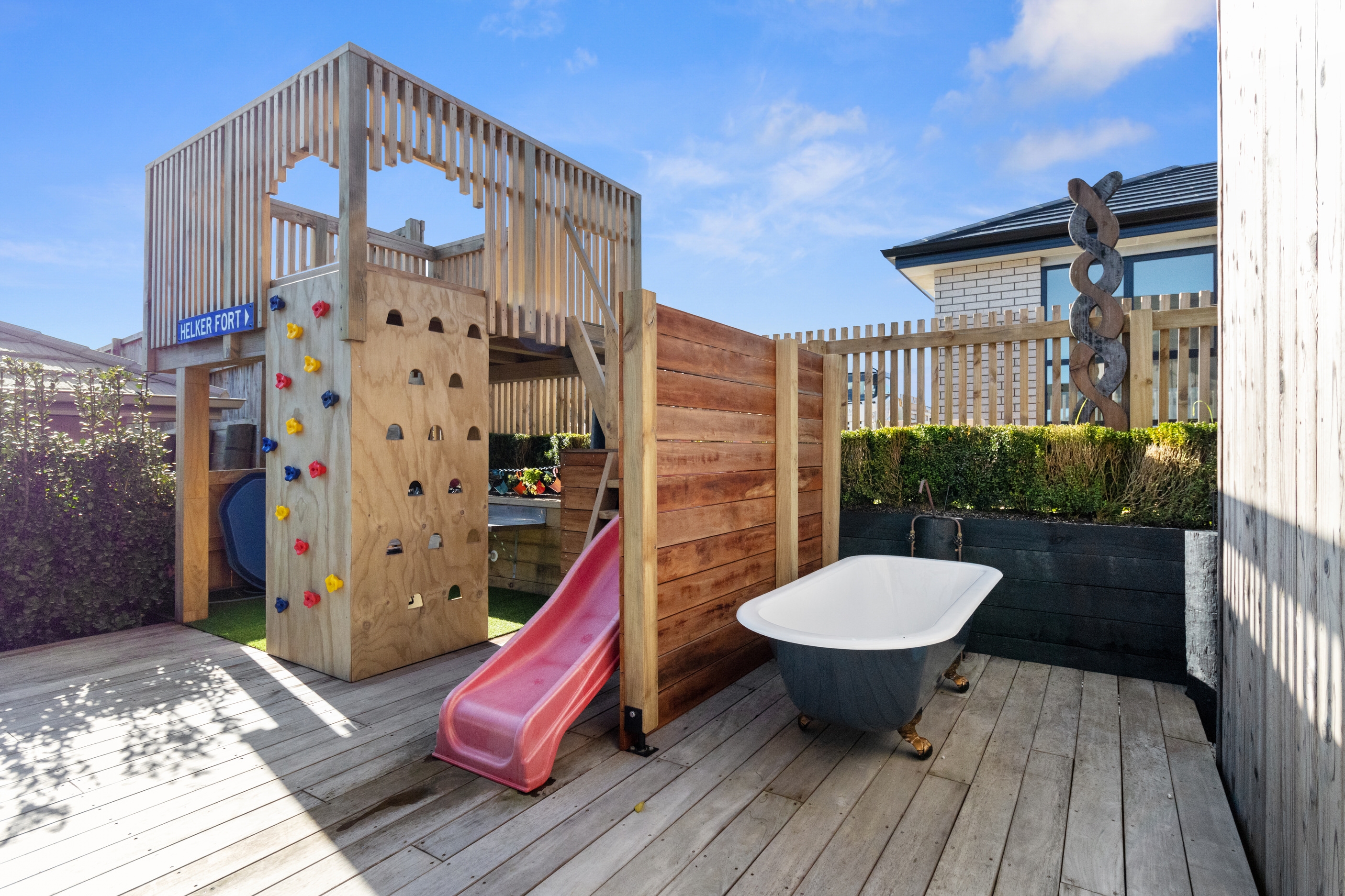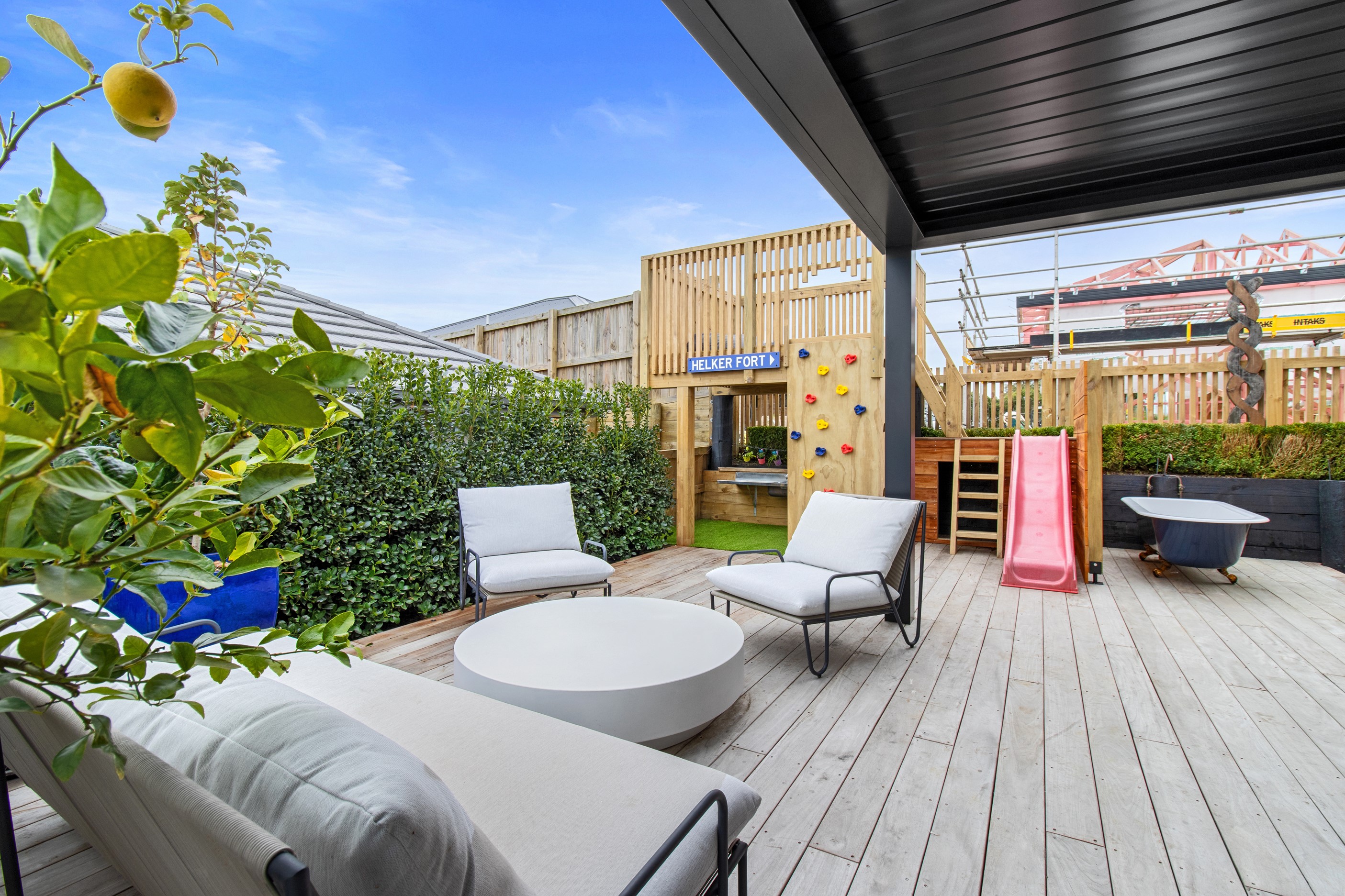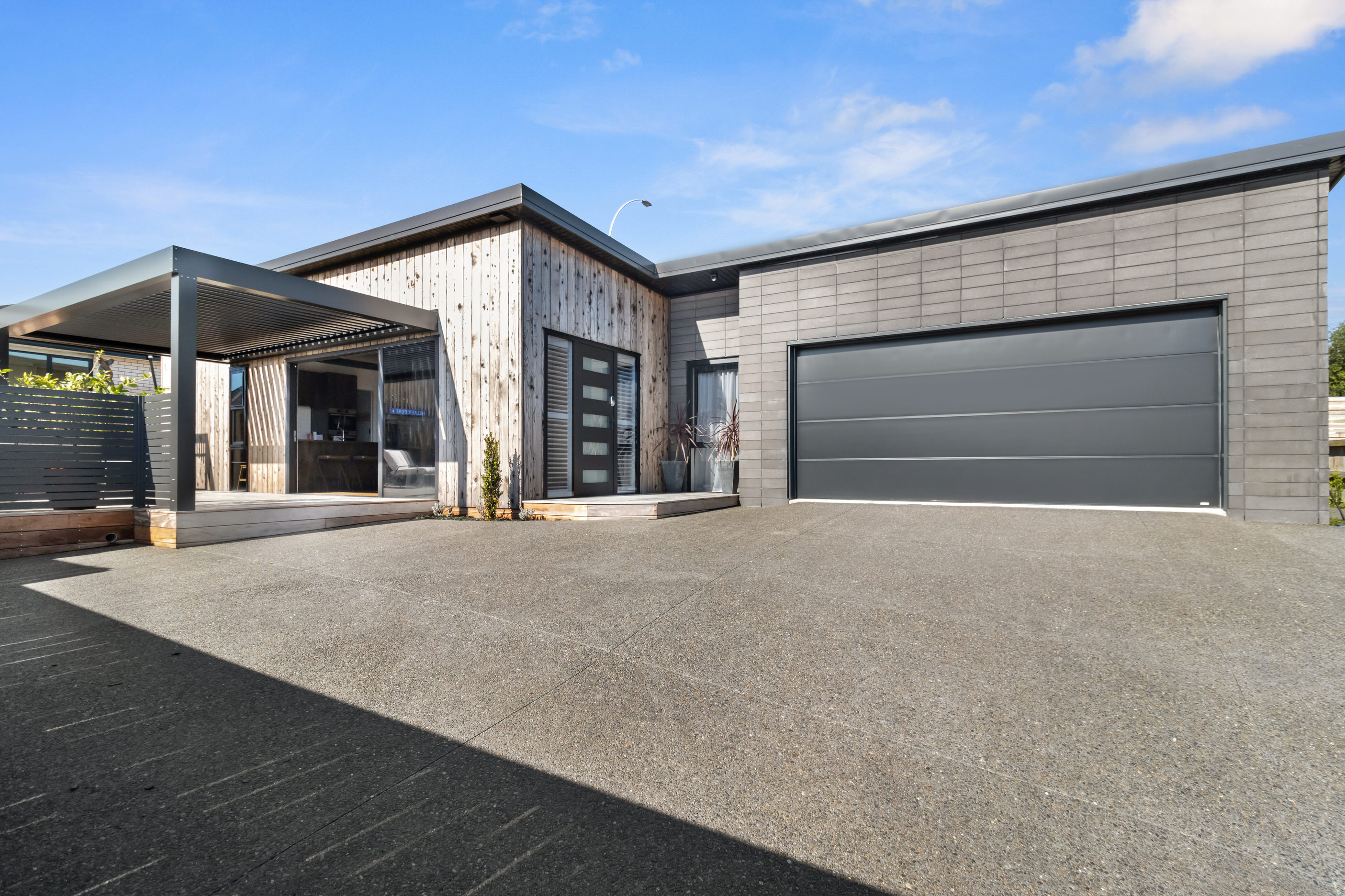 This 180sqm modern family home utilises every inch of its suburban section, orientated perfectly to capture the surrounding views and magnificent sunsets. Enlightened product choices showcase how a smaller home can be practical while still packing a design punch. Minimal maintenance and a strong interior-exterior cohesion set this open-plan home apart. Stunning, locally sourced redwood Pika-Pika-finished cladding adds natural warmth to the exterior. Manicured gardens, a large covered deck complete with a kids’ fort and bath round out the owner’s vision for an urban retreat. Step off the deck through the large sliding doors and be welcomed by an expansive kitchen, living and dining room. Exposed beams catch the eye and are beautifully highlighted by statement fixings and lighting. The honed brick and redwood feature walls perfectly complement the kitchen cabinetry and leathered-granite benchtop. The continuity of key design elements like the custom cabinetry in the living, bedrooms, ensuite and bathroom enhance the feeling of sophistication. The large family bathroom offers another wow moment with designer tiles, a freestanding stone bath and a one-off semi-circular mirror. It’s the definition of opulence.