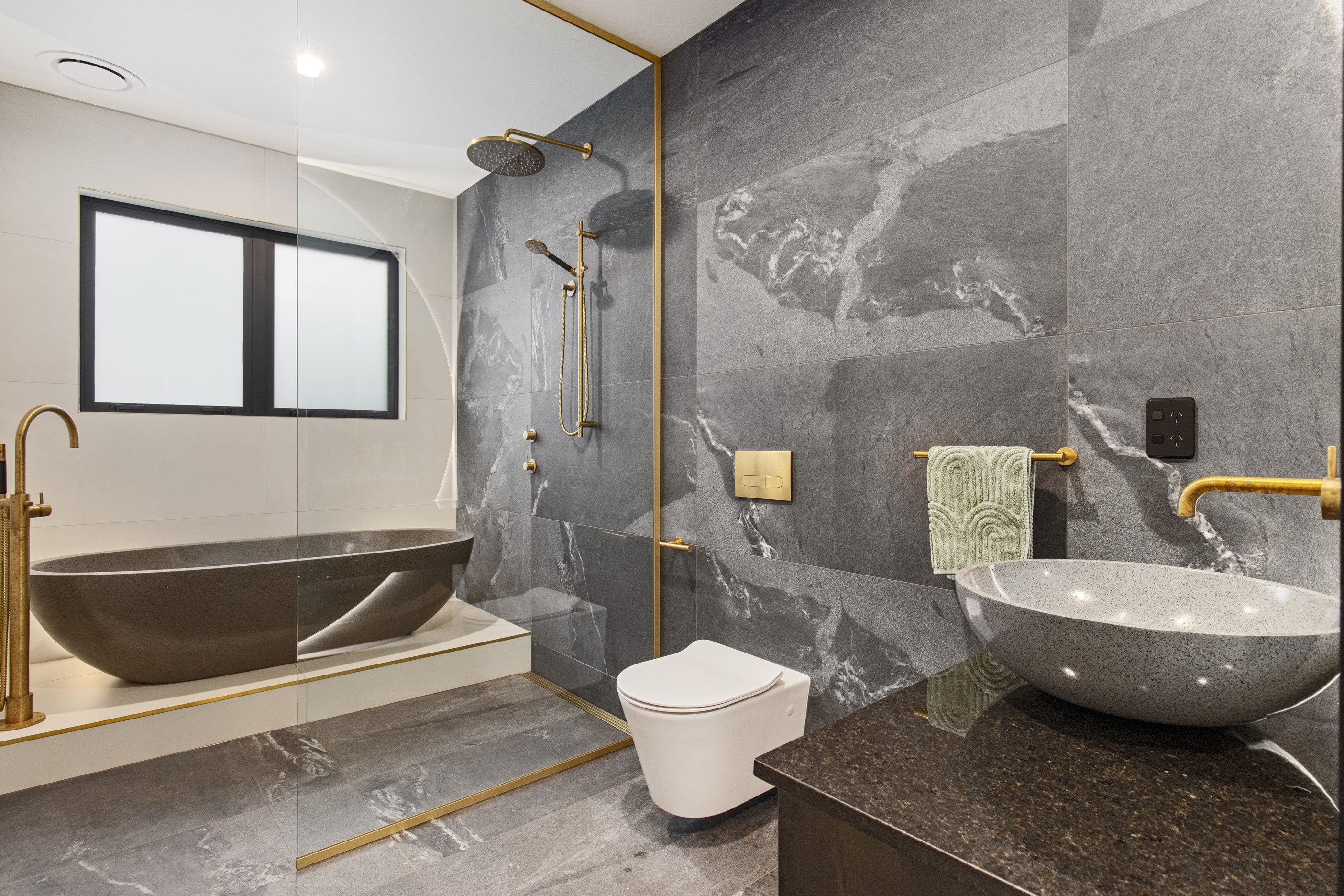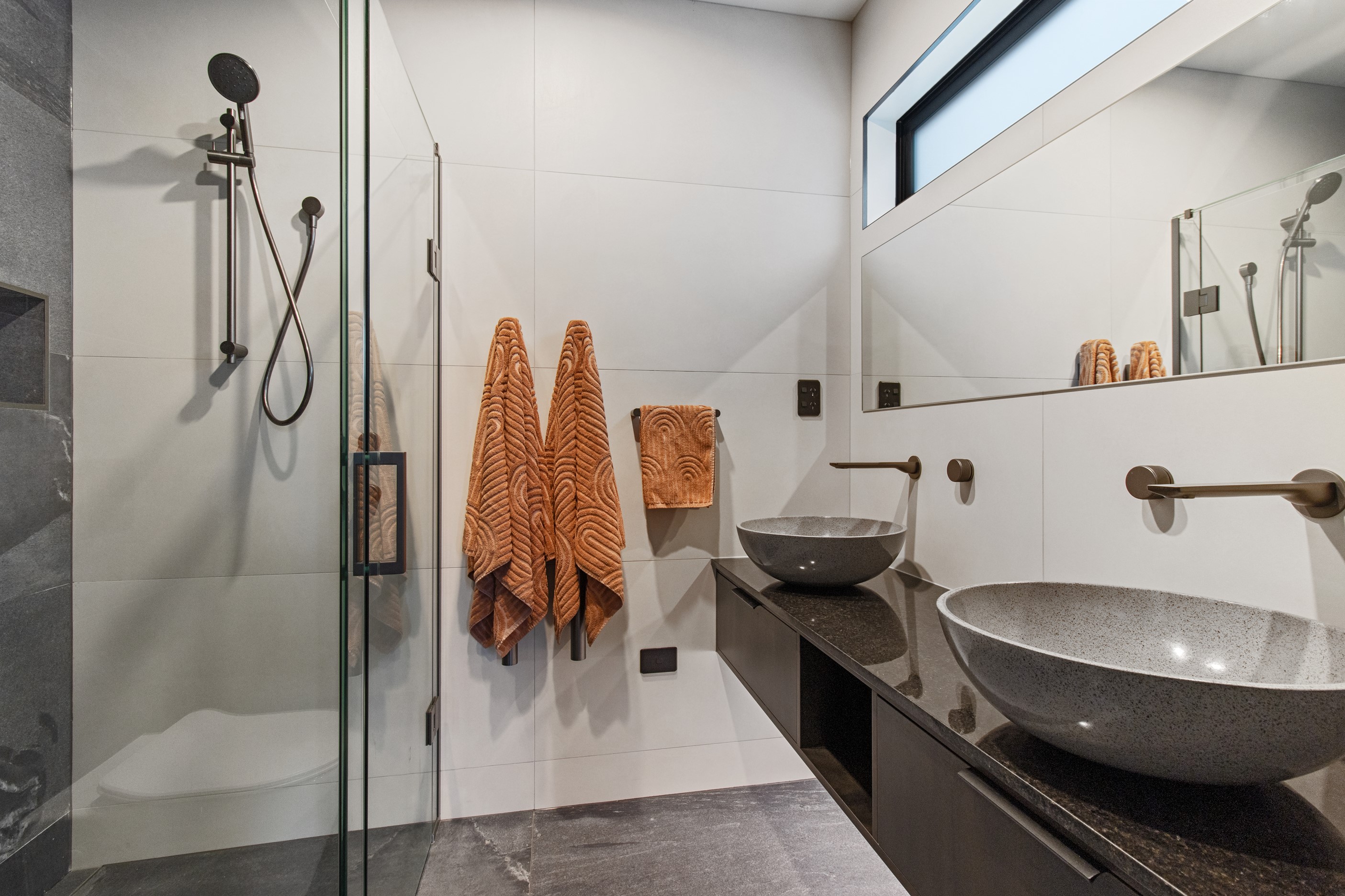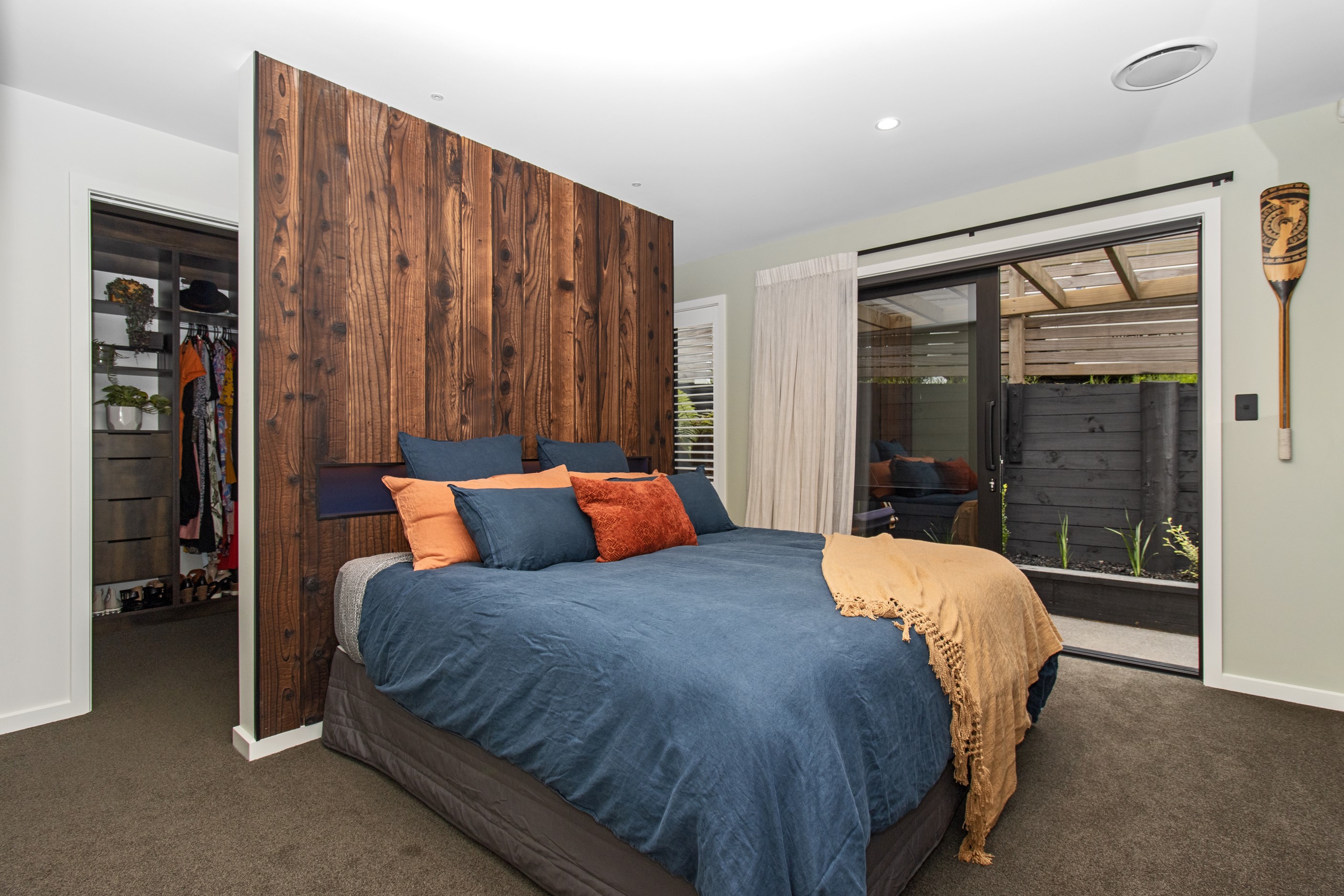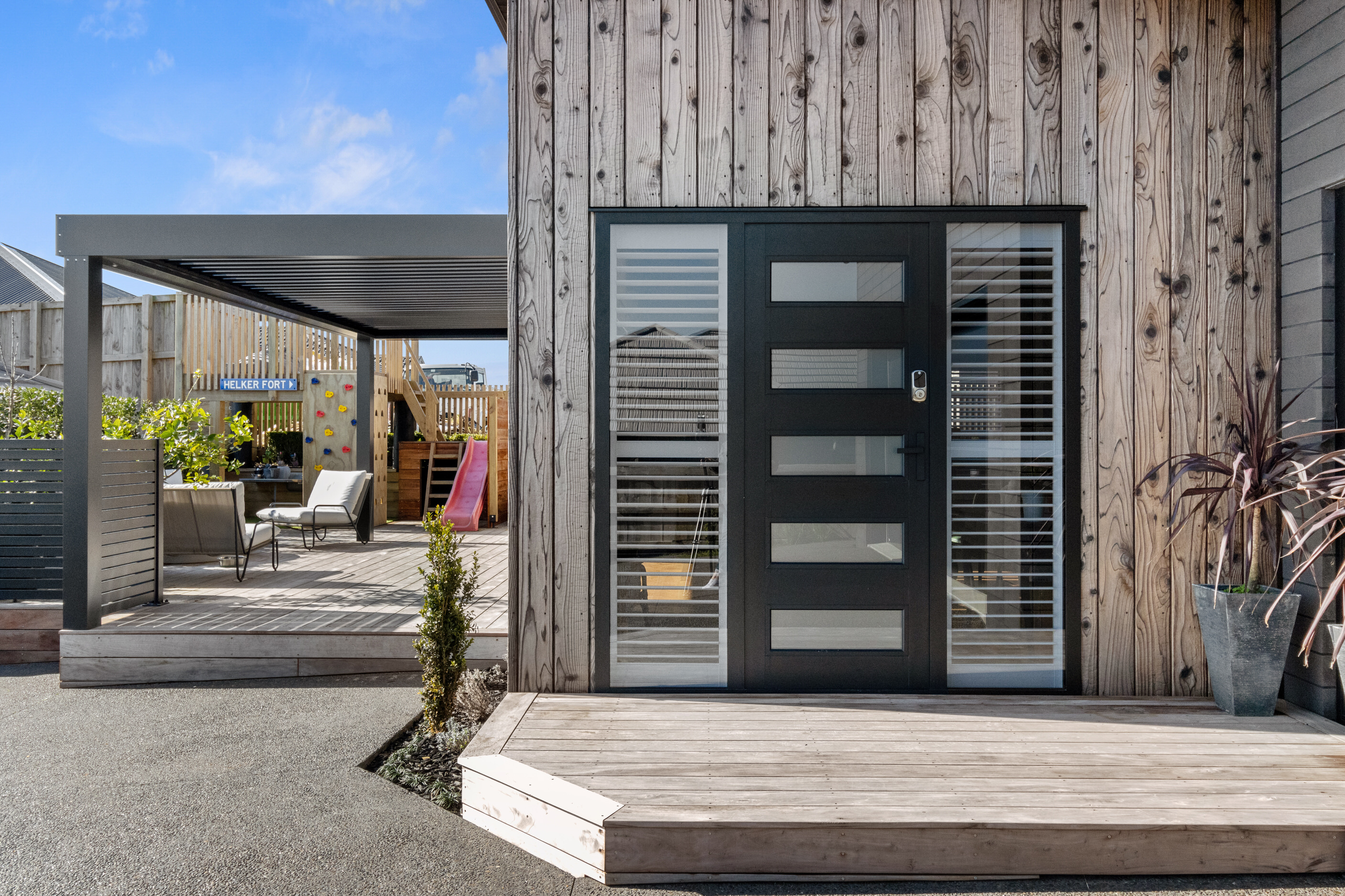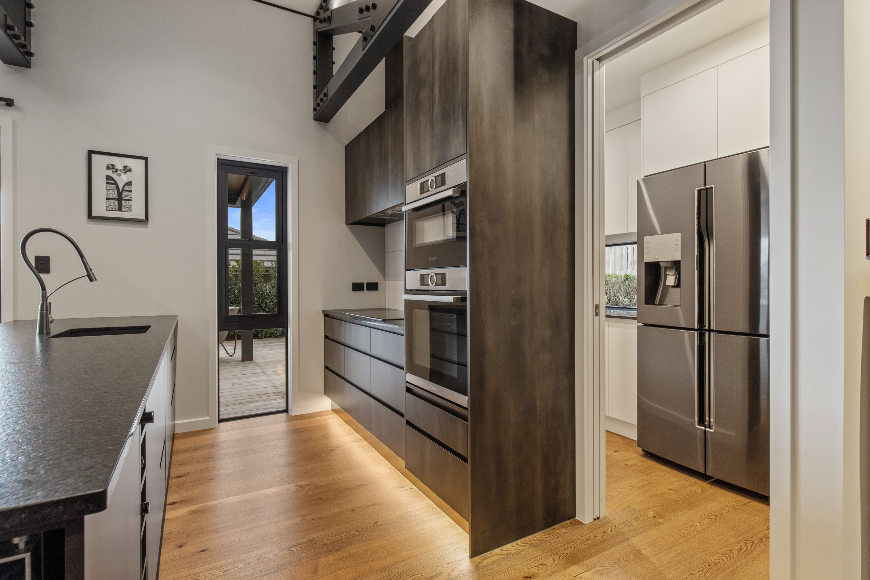 This 180sqm modern family home utilises every inch of its suburban section, orientated perfectly to capture the surrounding views and magnificent sunsets. Enlightened product choices showcase how a smaller home can be practical while still packing a design punch. Minimal maintenance and a strong interior-exterior cohesion set this open-plan home apart. Stunning, locally sourced redwood Pika-Pika-finished cladding adds natural warmth to the exterior. Manicured gardens, a large covered deck complete with a kids’ fort and bath round out the owner’s vision for an urban retreat. Step off the deck through the large sliding doors and be welcomed by an expansive kitchen, living and dining room. Exposed beams catch the eye and are beautifully highlighted by statement fixings and lighting. The honed brick and redwood feature walls perfectly complement the kitchen cabinetry and leathered-granite benchtop. The continuity of key design elements like the custom cabinetry in the living, bedrooms, ensuite and bathroom enhance the feeling of sophistication. The large family bathroom offers another wow moment with designer tiles, a freestanding stone bath and a one-off semi-circular mirror. It’s the definition of opulence.