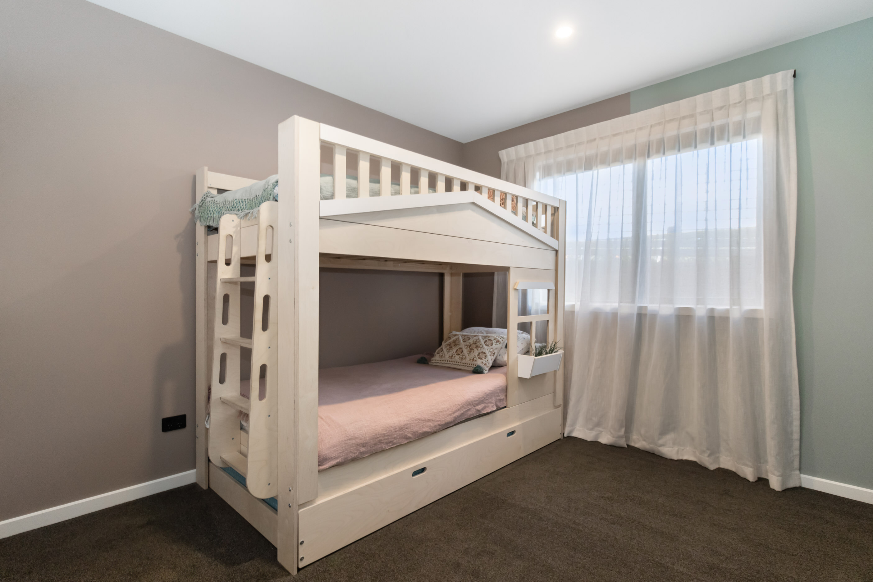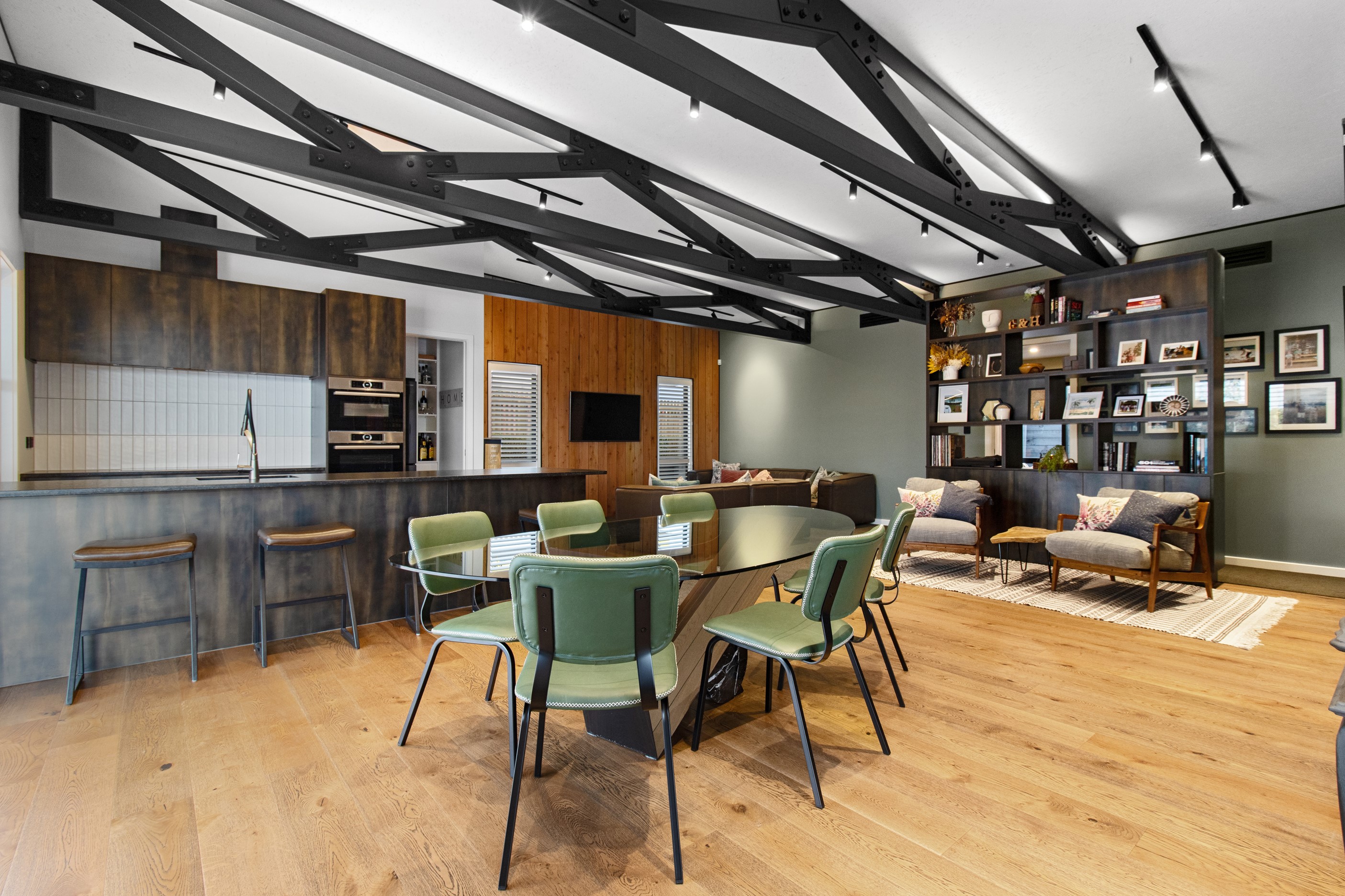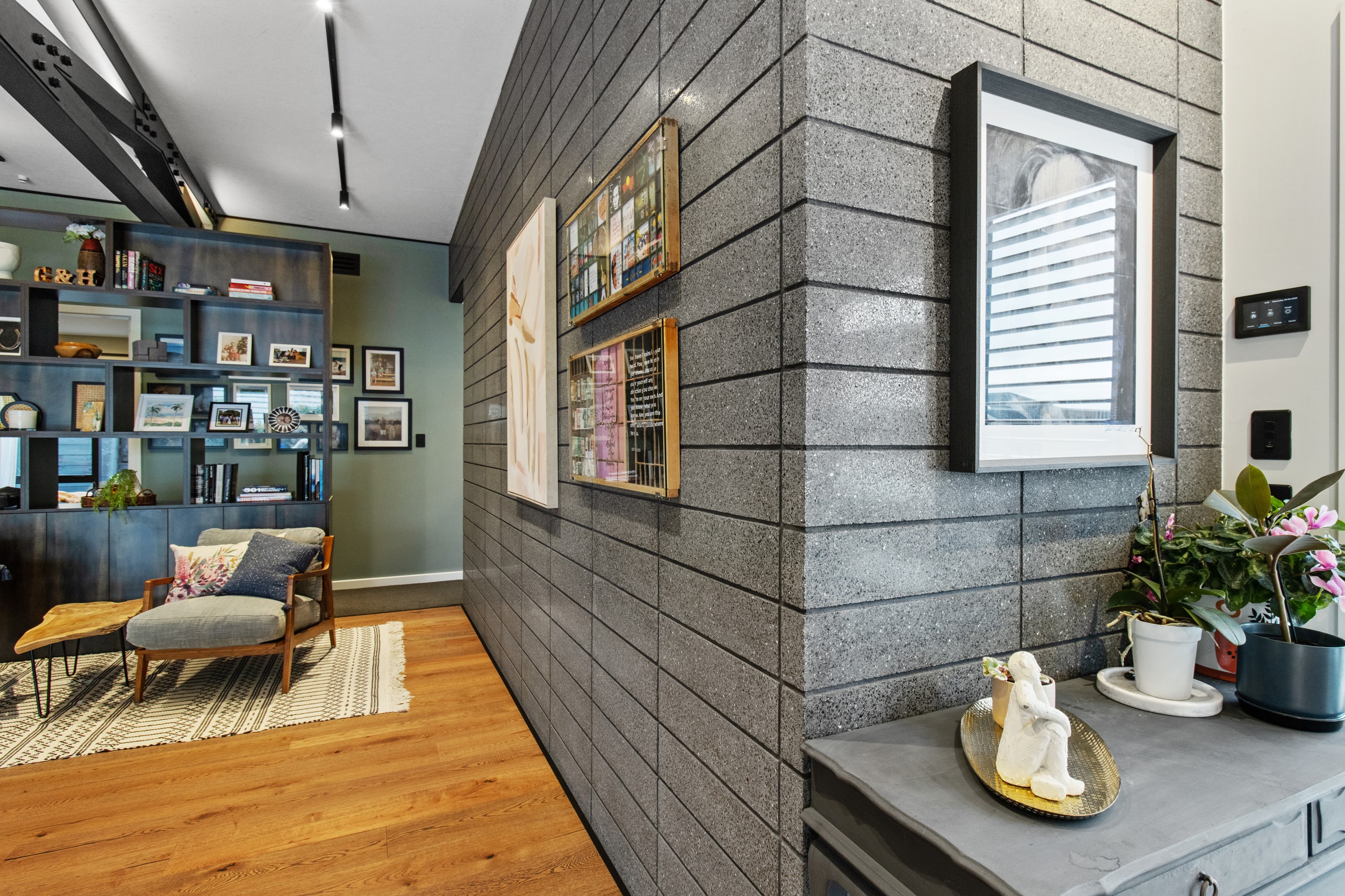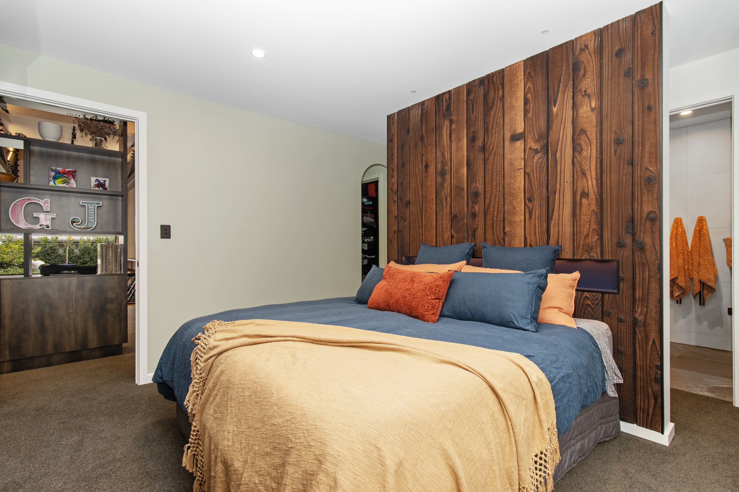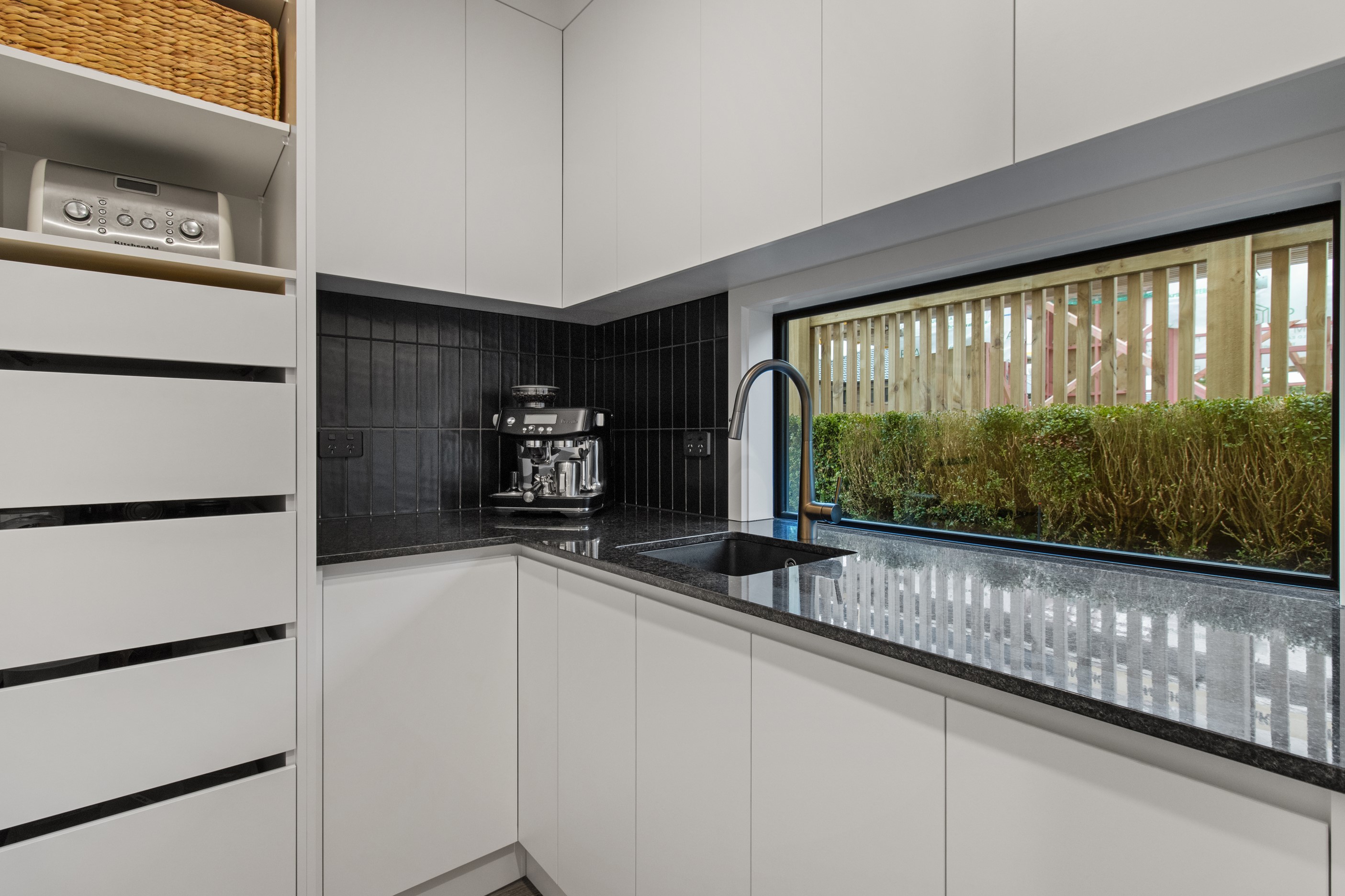 This 180sqm modern family home utilises every inch of its suburban section, orientated perfectly to capture the surrounding views and magnificent sunsets. Enlightened product choices showcase how a smaller home can be practical while still packing a design punch. Minimal maintenance and a strong interior-exterior cohesion set this open-plan home apart. Stunning, locally sourced redwood Pika-Pika-finished cladding adds natural warmth to the exterior. Manicured gardens, a large covered deck complete with a kids’ fort and bath round out the owner’s vision for an urban retreat. Step off the deck through the large sliding doors and be welcomed by an expansive kitchen, living and dining room. Exposed beams catch the eye and are beautifully highlighted by statement fixings and lighting. The honed brick and redwood feature walls perfectly complement the kitchen cabinetry and leathered-granite benchtop. The continuity of key design elements like the custom cabinetry in the living, bedrooms, ensuite and bathroom enhance the feeling of sophistication. The large family bathroom offers another wow moment with designer tiles, a freestanding stone bath and a one-off semi-circular mirror. It’s the definition of opulence.