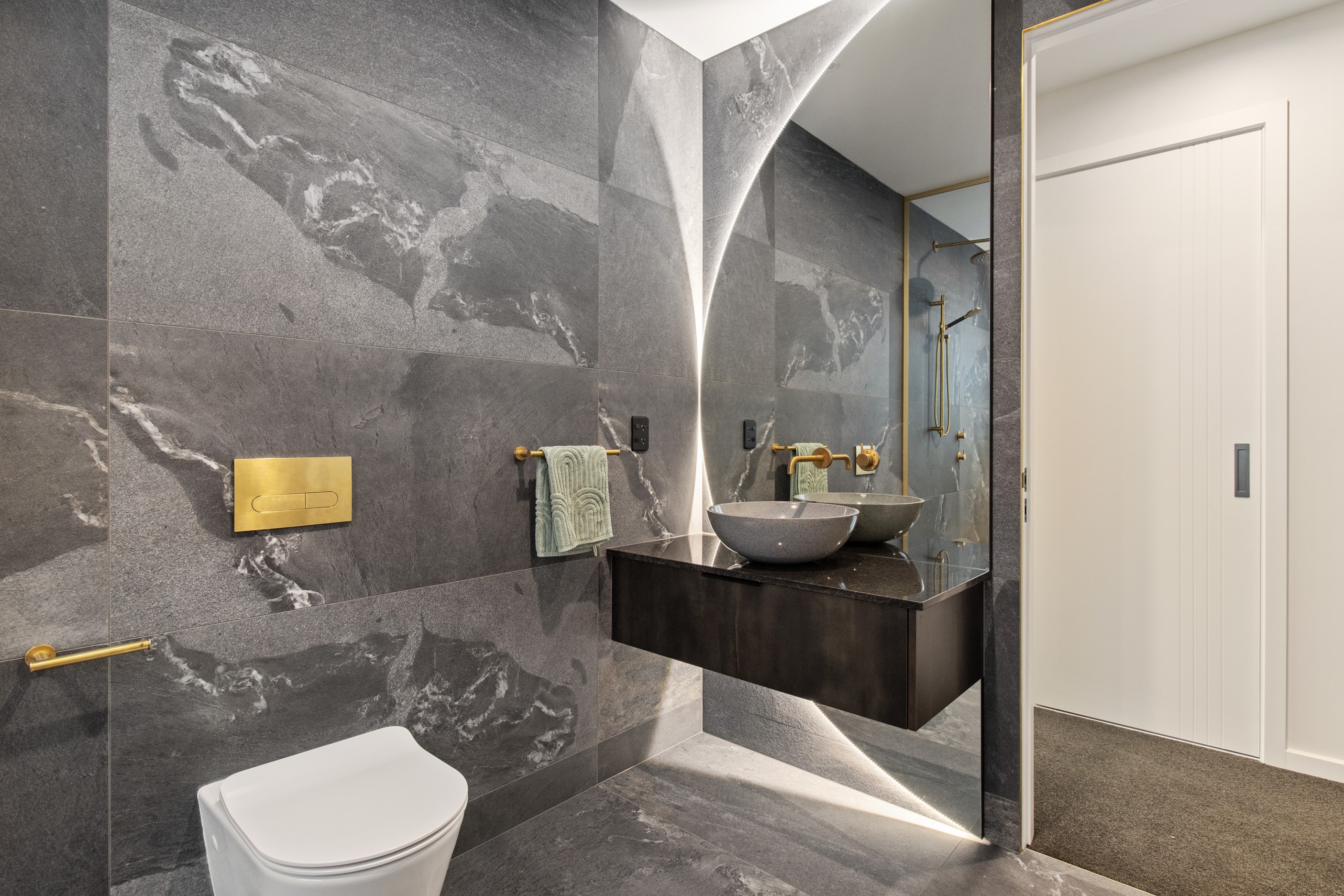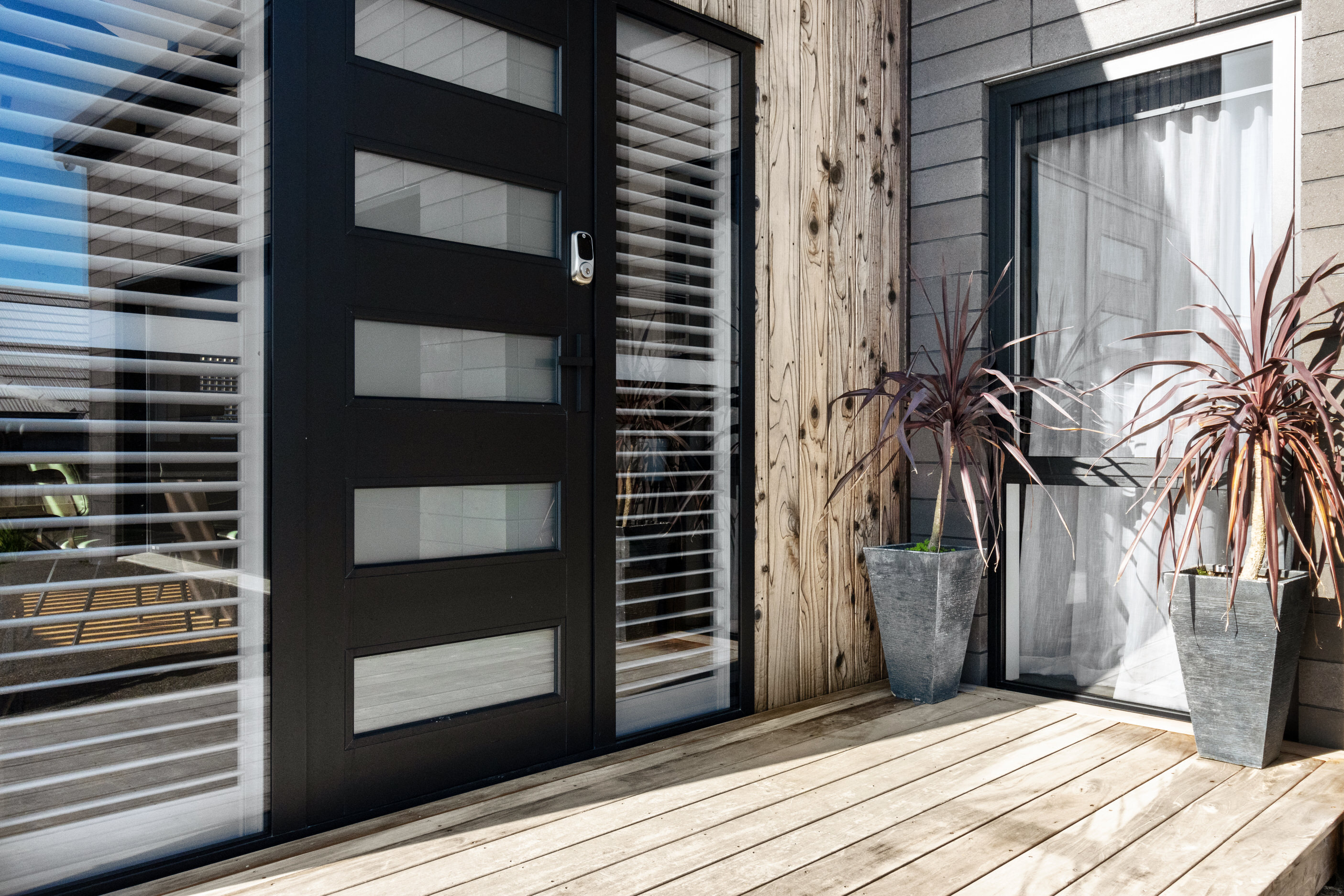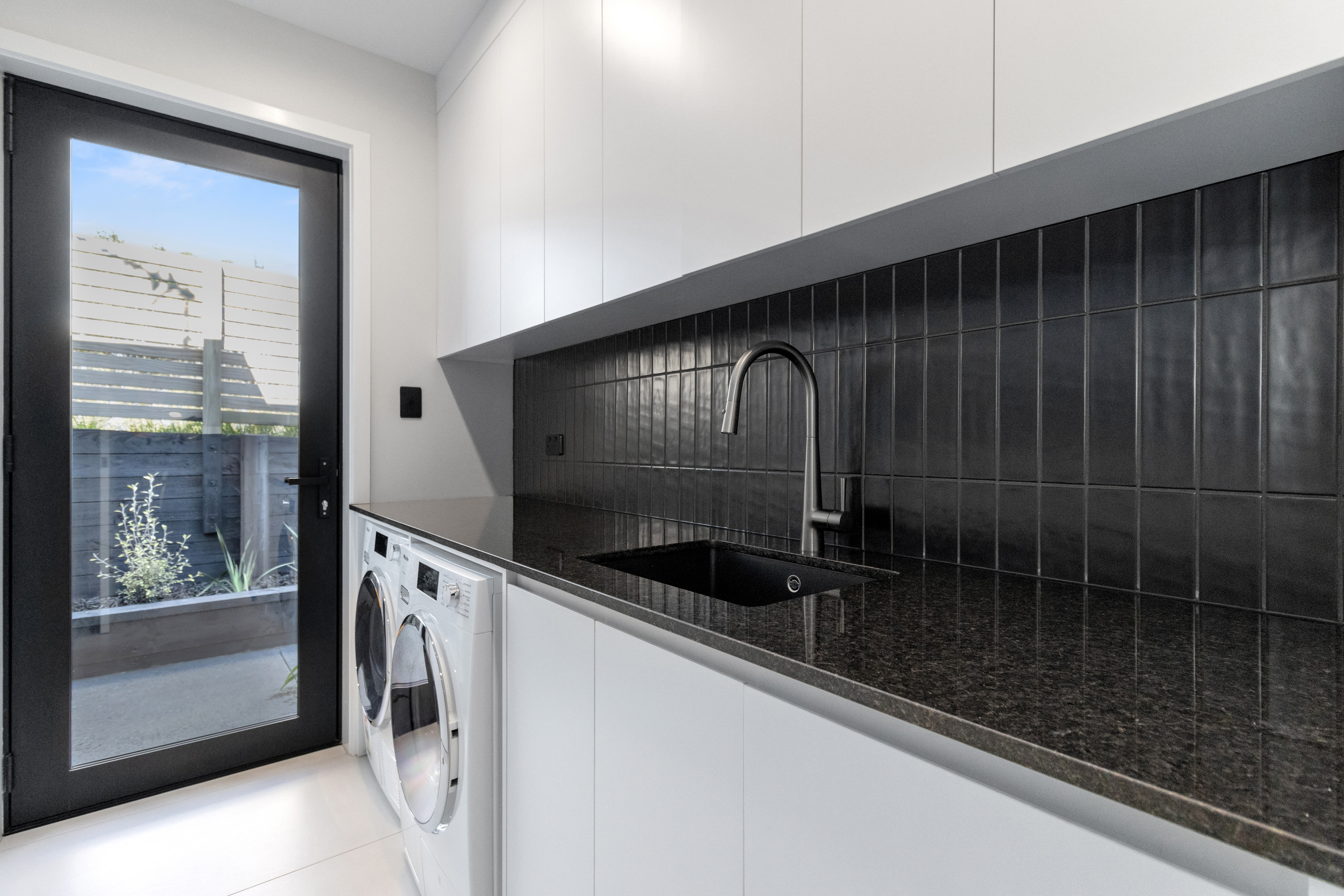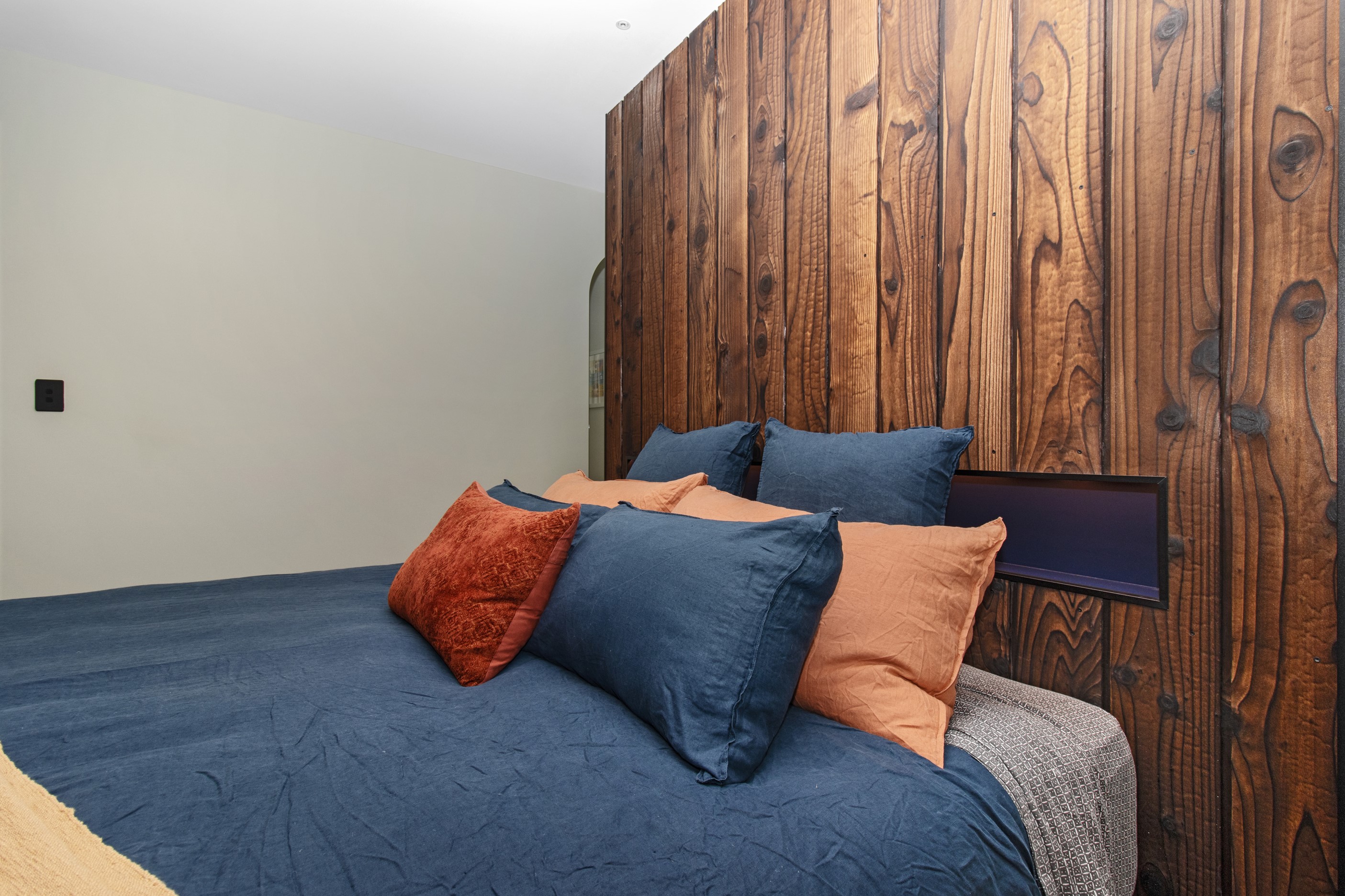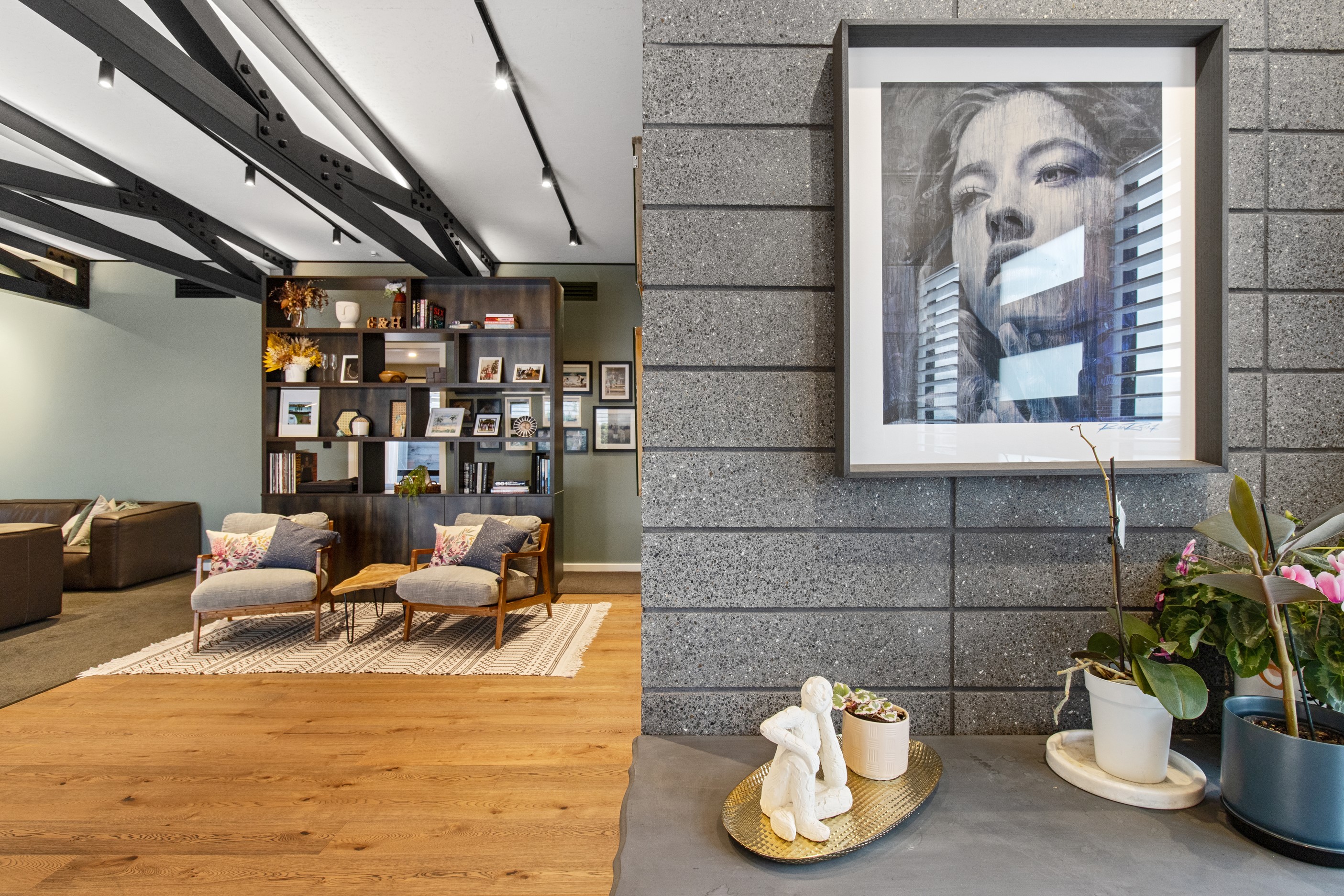 This 180sqm modern family home utilises every inch of its suburban section, orientated perfectly to capture the surrounding views and magnificent sunsets. Enlightened product choices showcase how a smaller home can be practical while still packing a design punch. Minimal maintenance and a strong interior-exterior cohesion set this open-plan home apart. Stunning, locally sourced redwood Pika-Pika-finished cladding adds natural warmth to the exterior. Manicured gardens, a large covered deck complete with a kids’ fort and bath round out the owner’s vision for an urban retreat. Step off the deck through the large sliding doors and be welcomed by an expansive kitchen, living and dining room. Exposed beams catch the eye and are beautifully highlighted by statement fixings and lighting. The honed brick and redwood feature walls perfectly complement the kitchen cabinetry and leathered-granite benchtop. The continuity of key design elements like the custom cabinetry in the living, bedrooms, ensuite and bathroom enhance the feeling of sophistication. The large family bathroom offers another wow moment with designer tiles, a freestanding stone bath and a one-off semi-circular mirror. It’s the definition of opulence.