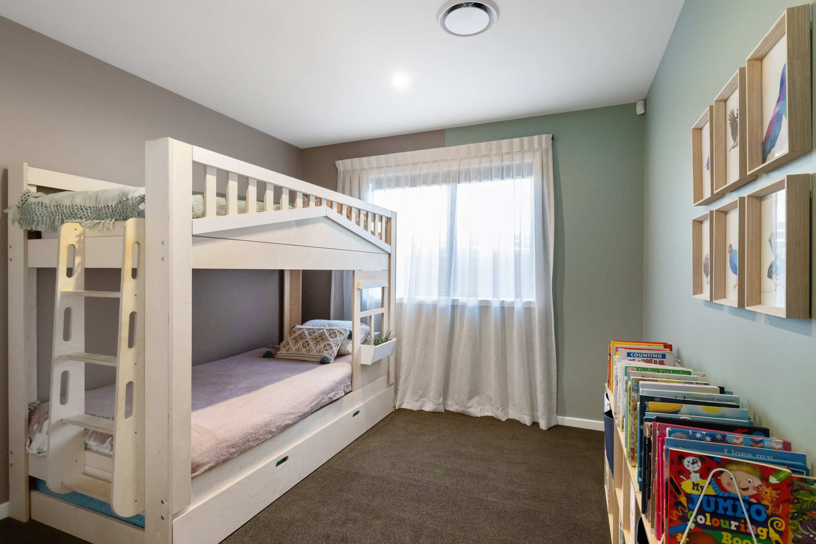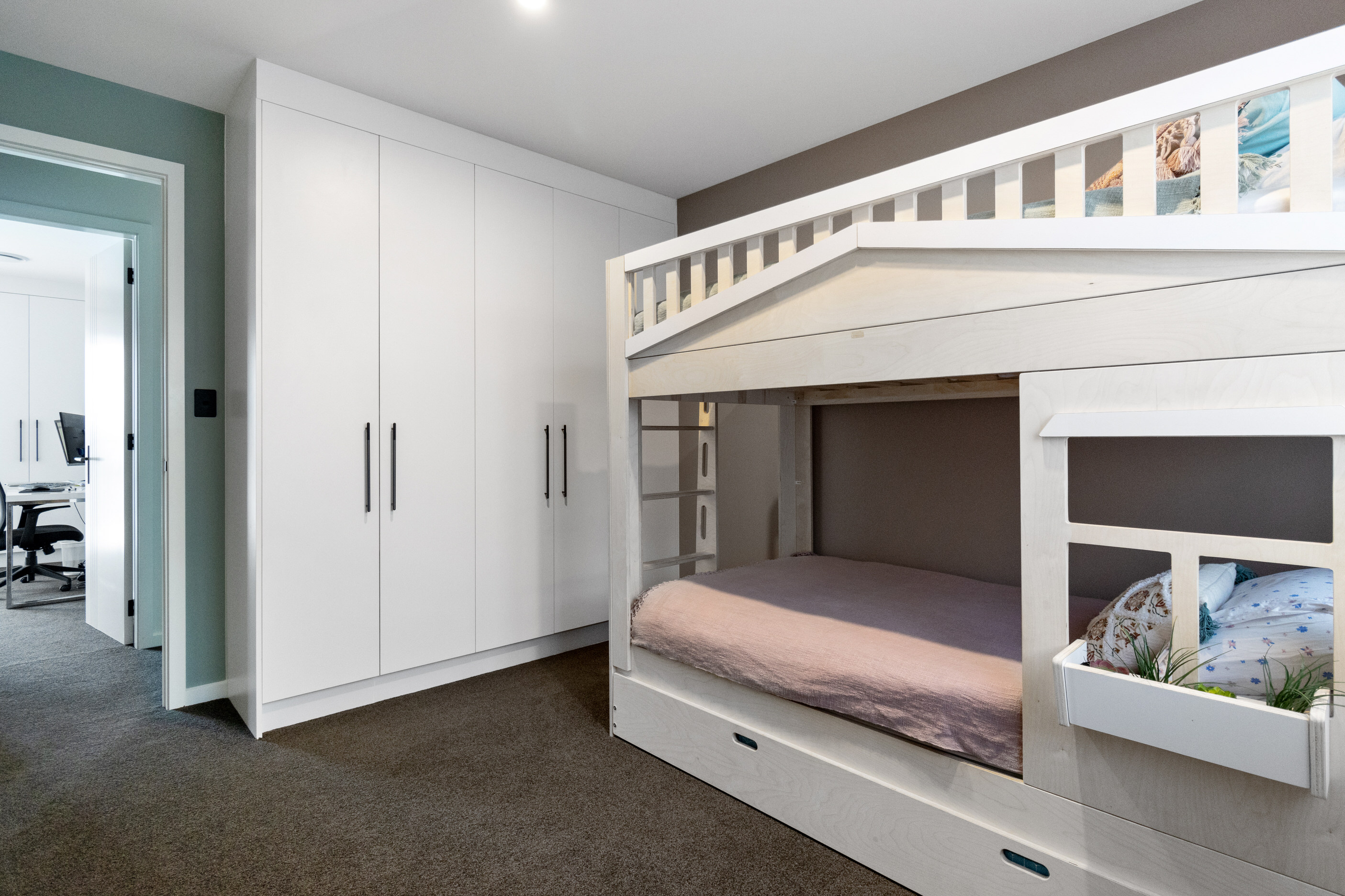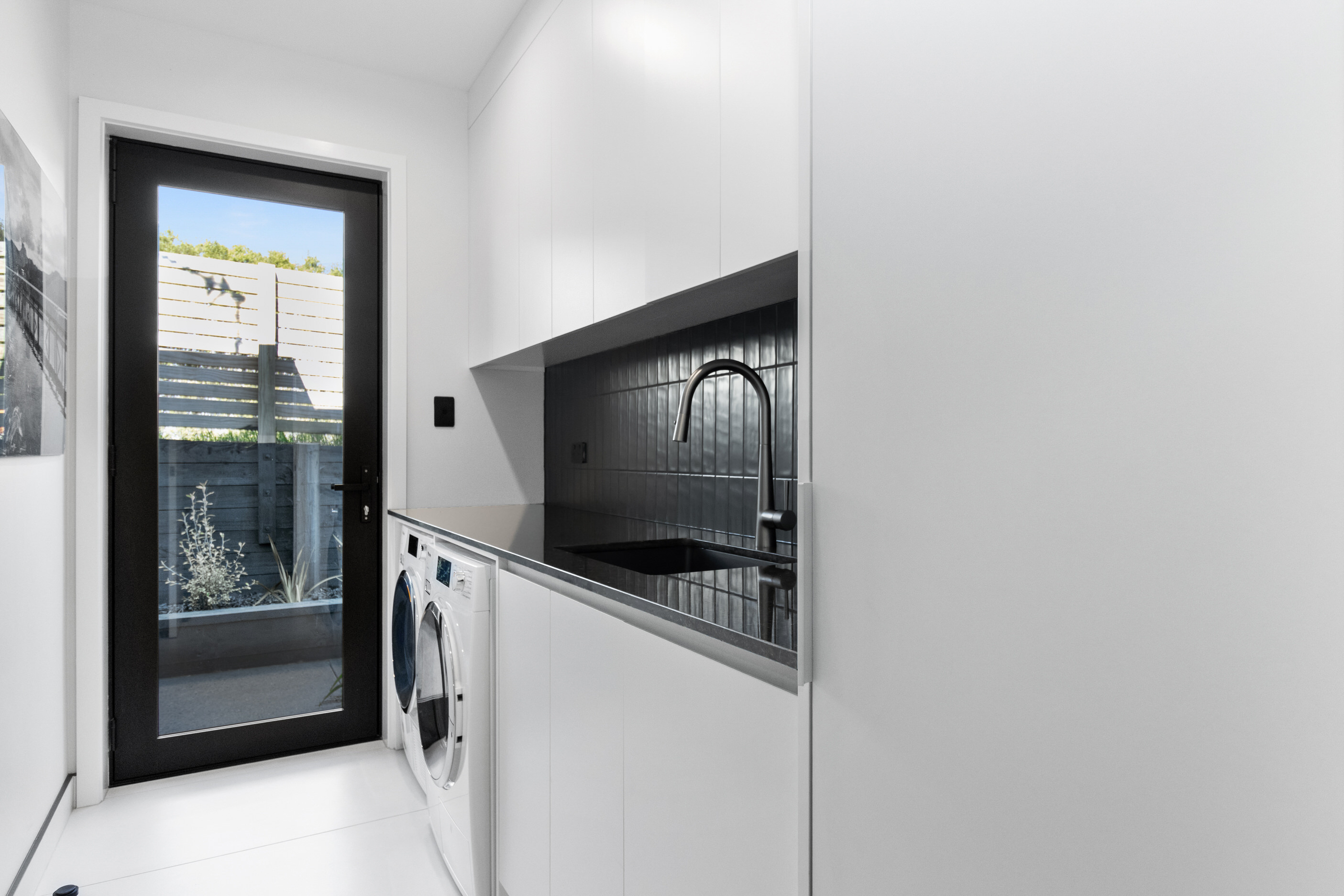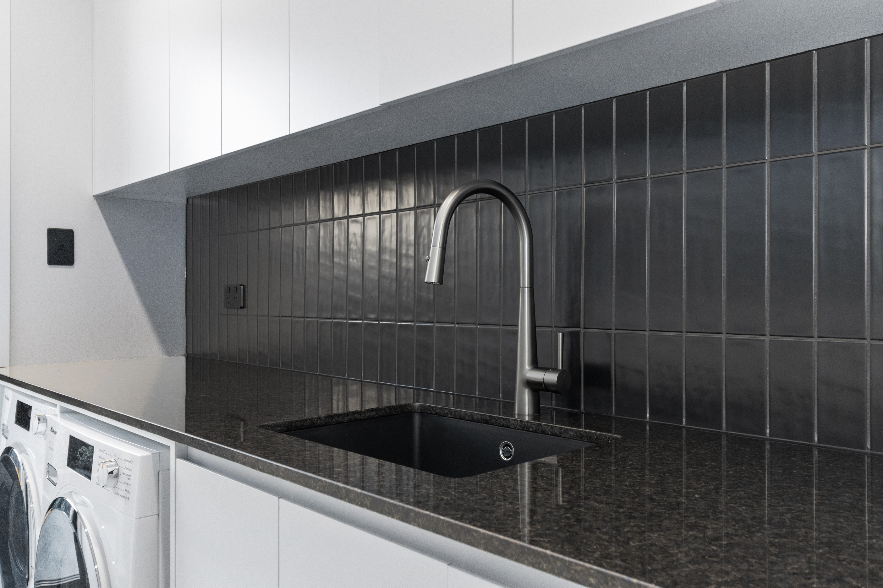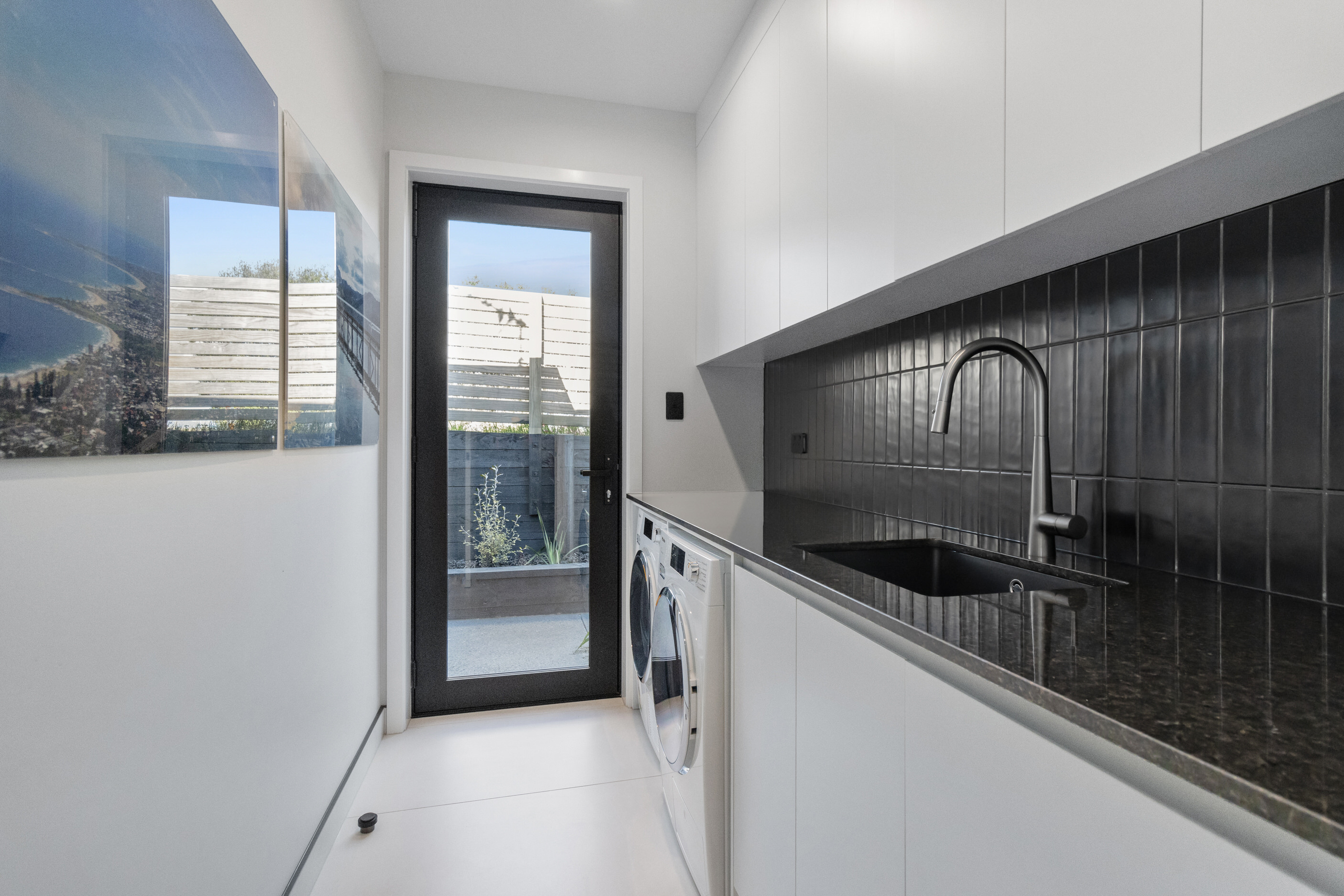 This 180sqm modern family home utilises every inch of its suburban section, orientated perfectly to capture the surrounding views and magnificent sunsets. Enlightened product choices showcase how a smaller home can be practical while still packing a design punch. Minimal maintenance and a strong interior-exterior cohesion set this open-plan home apart. Stunning, locally sourced redwood Pika-Pika-finished cladding adds natural warmth to the exterior. Manicured gardens, a large covered deck complete with a kids’ fort and bath round out the owner’s vision for an urban retreat. Step off the deck through the large sliding doors and be welcomed by an expansive kitchen, living and dining room. Exposed beams catch the eye and are beautifully highlighted by statement fixings and lighting. The honed brick and redwood feature walls perfectly complement the kitchen cabinetry and leathered-granite benchtop. The continuity of key design elements like the custom cabinetry in the living, bedrooms, ensuite and bathroom enhance the feeling of sophistication. The large family bathroom offers another wow moment with designer tiles, a freestanding stone bath and a one-off semi-circular mirror. It’s the definition of opulence.