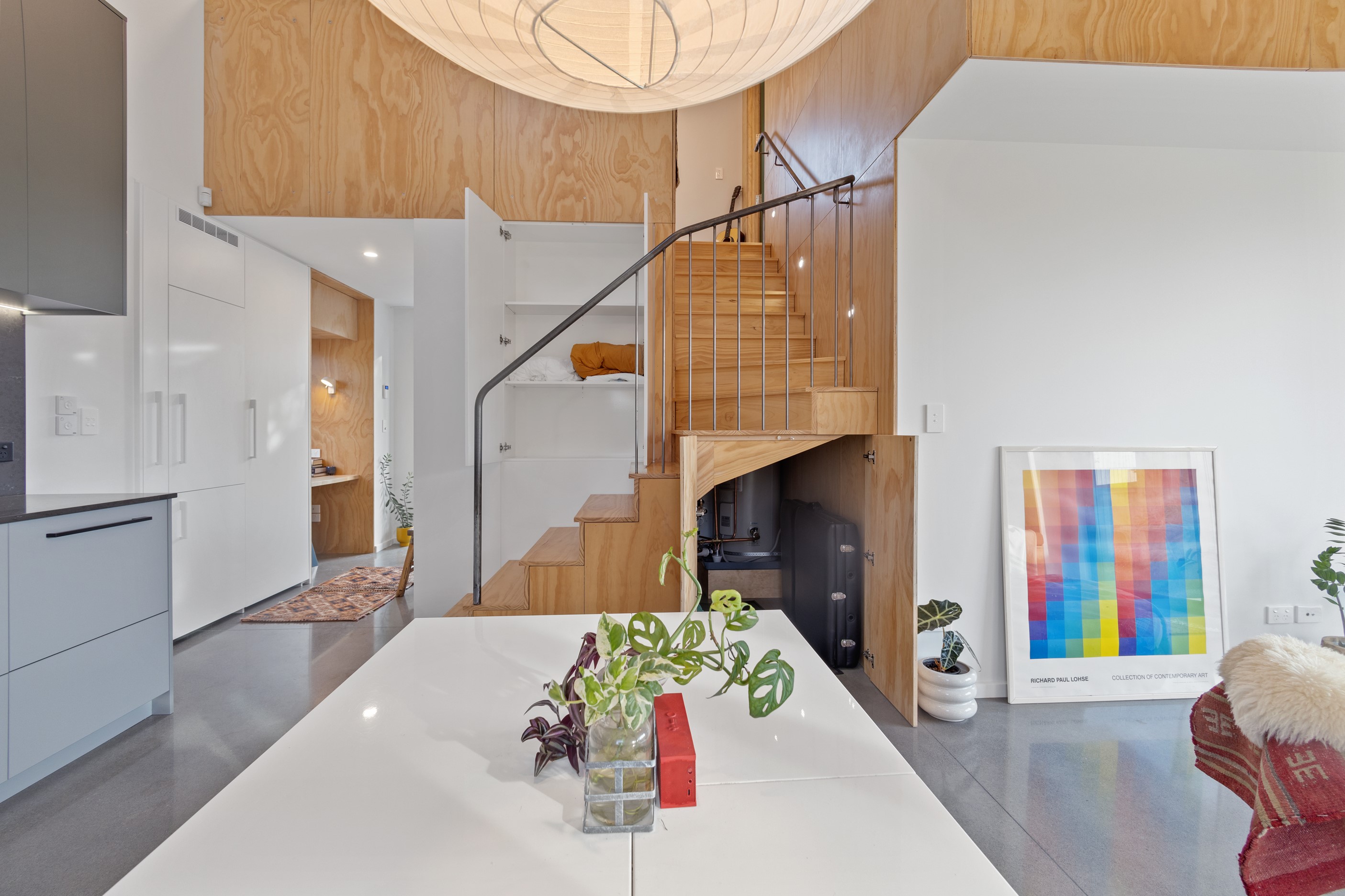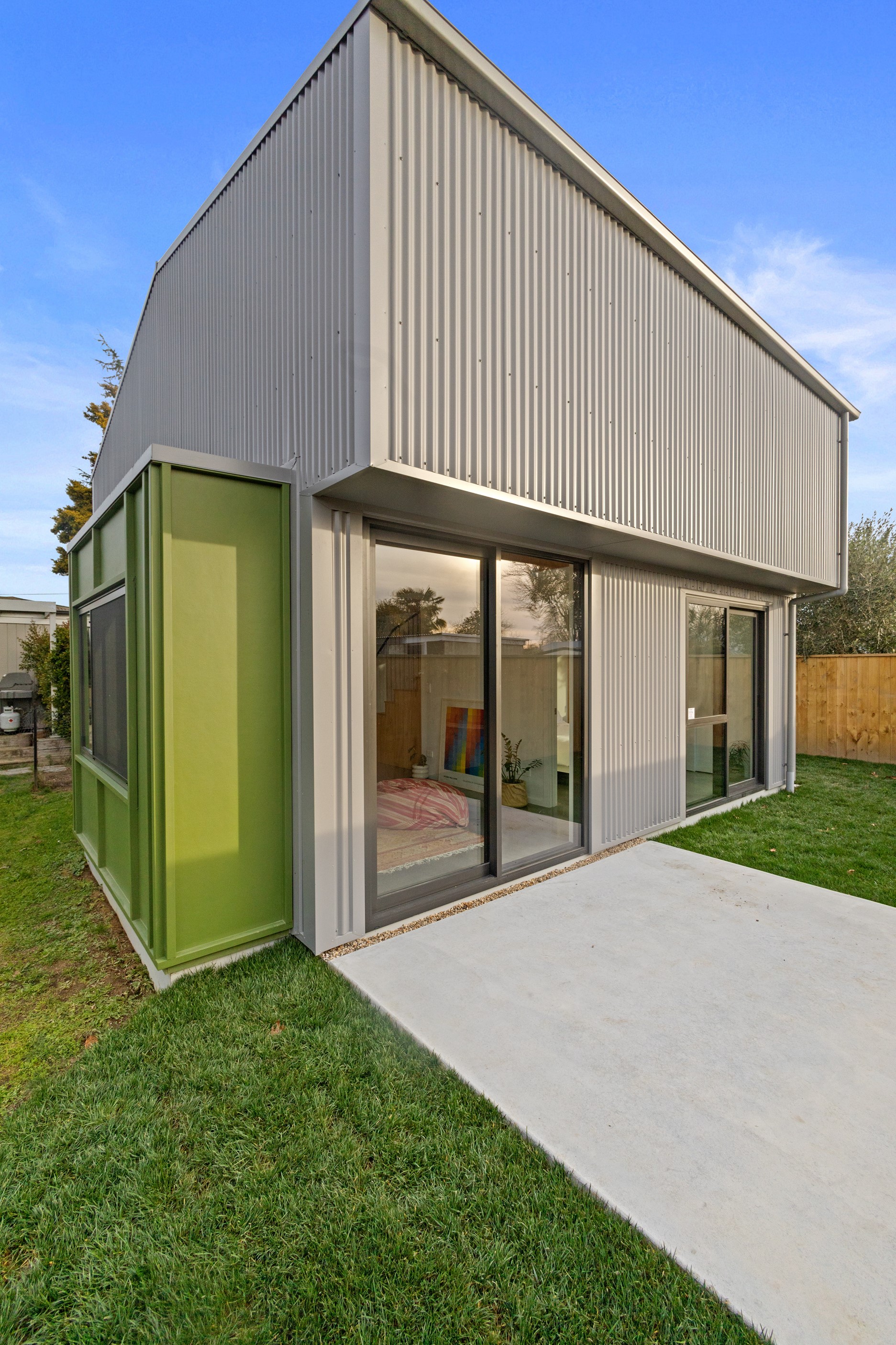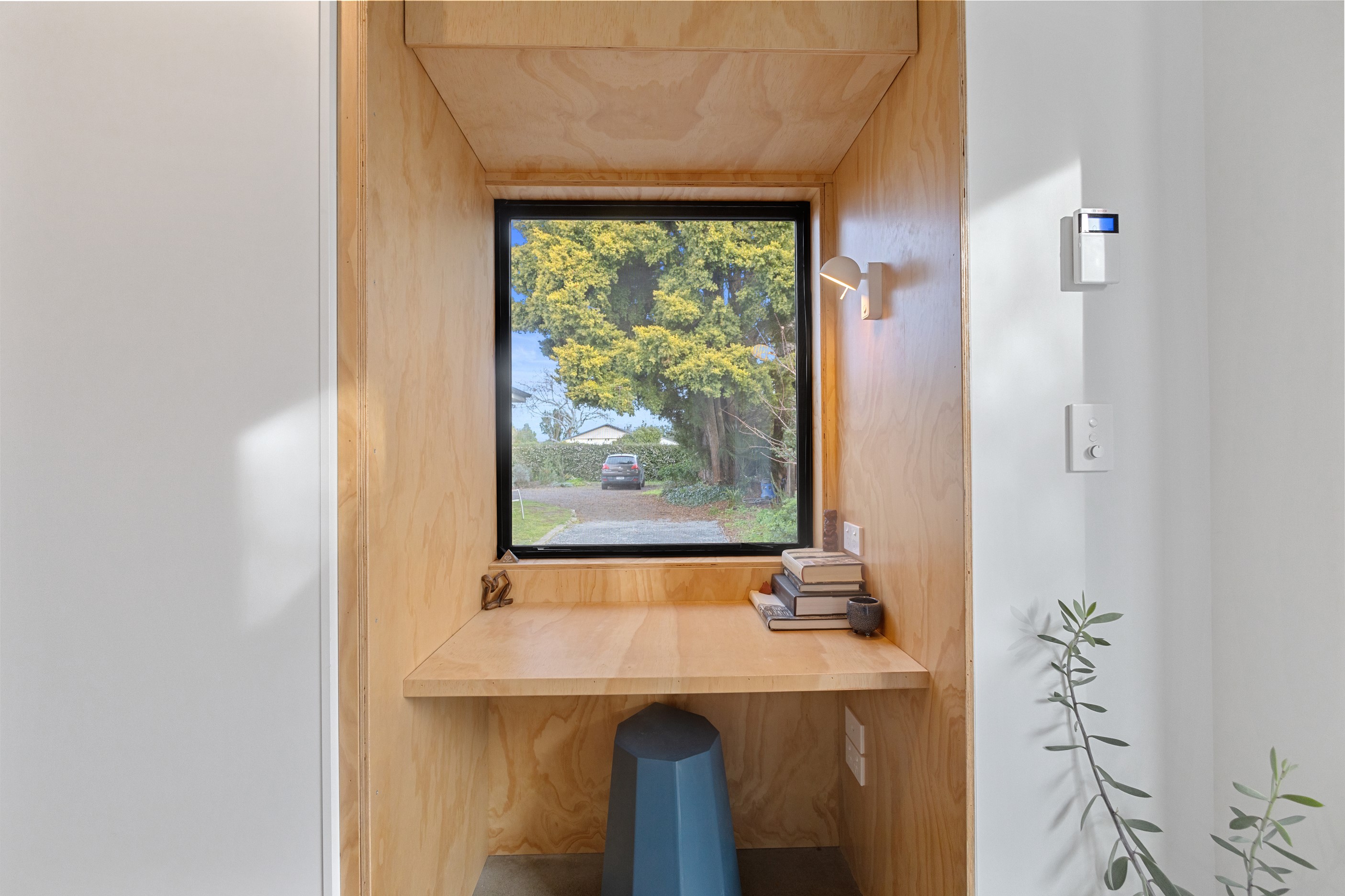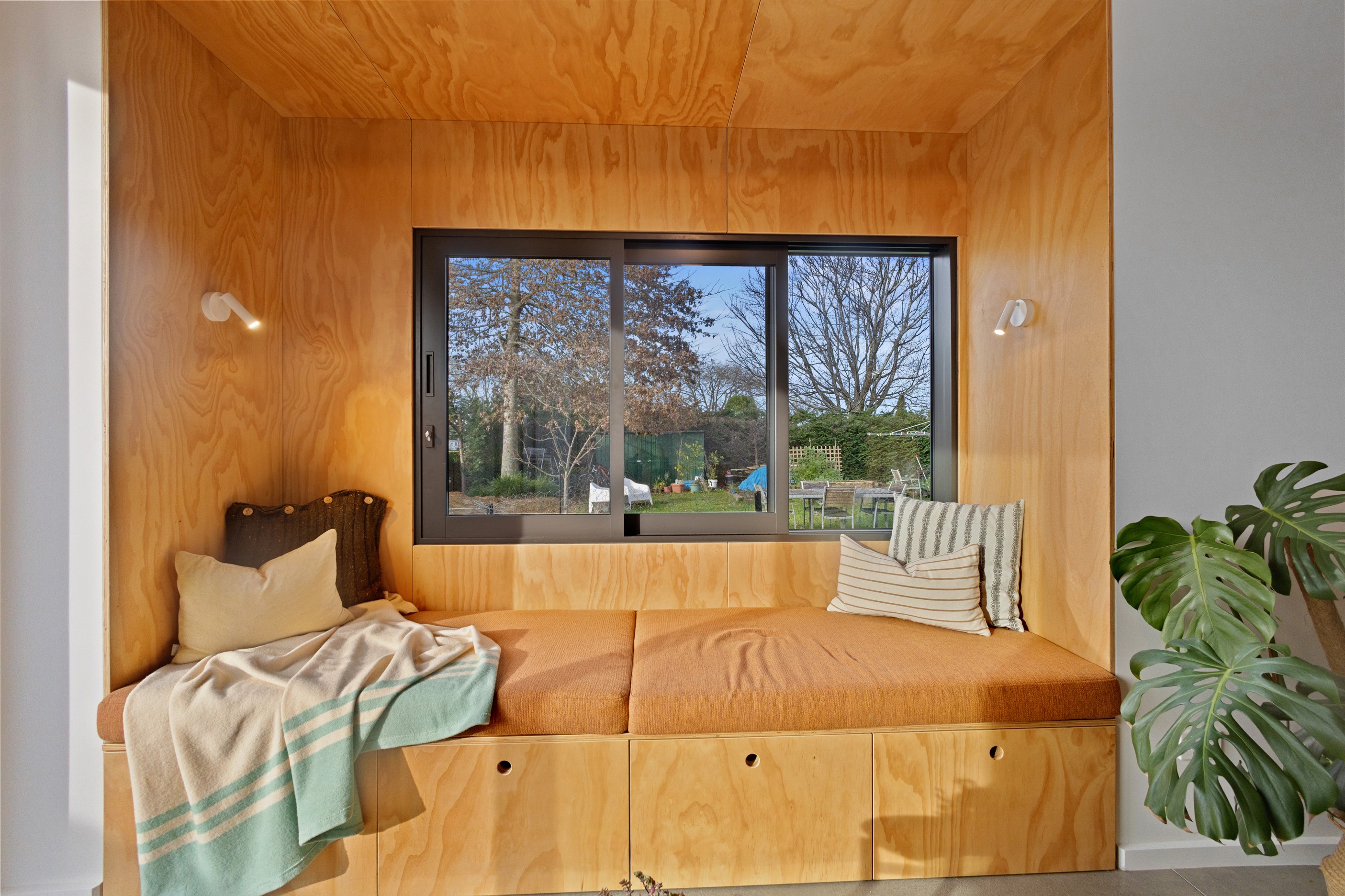 Smart, stylish and compact, this petite home packs plenty into its 73sqm footprint. A secondary dwelling on an established section in Cambridge, it’s full of inspired storage solutions and a delight to inhabit. Intelligent design and a contemporary combination of materials add up to much more than you’d expect, including two bedrooms and two living areas. The second storey accommodates a bedroom and generous office space. Downstairs, a bedroom opens to the outdoors through full-height sliders. Large windows, sliding glass doors and skylights allow natural light to flow in freely throughout the home. The kitchen, living and dining area is a cohesive space and full of storage smarts. Cabinetry-concealed appliances keep the area streamlined, which supports the minimalist design vibe. For a blissful spot to relax, put your feet up on the window seat, which also provides amble storage. Low-maintenance coloursteel cladding and plywood interior walls make this little beauty practical, as well as lending a thoroughly contemporary design edge.