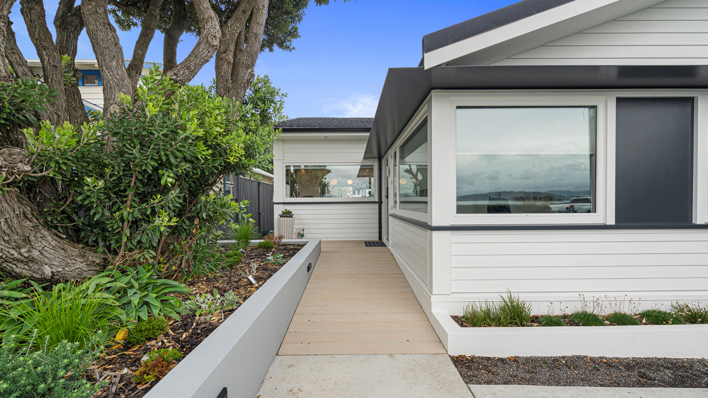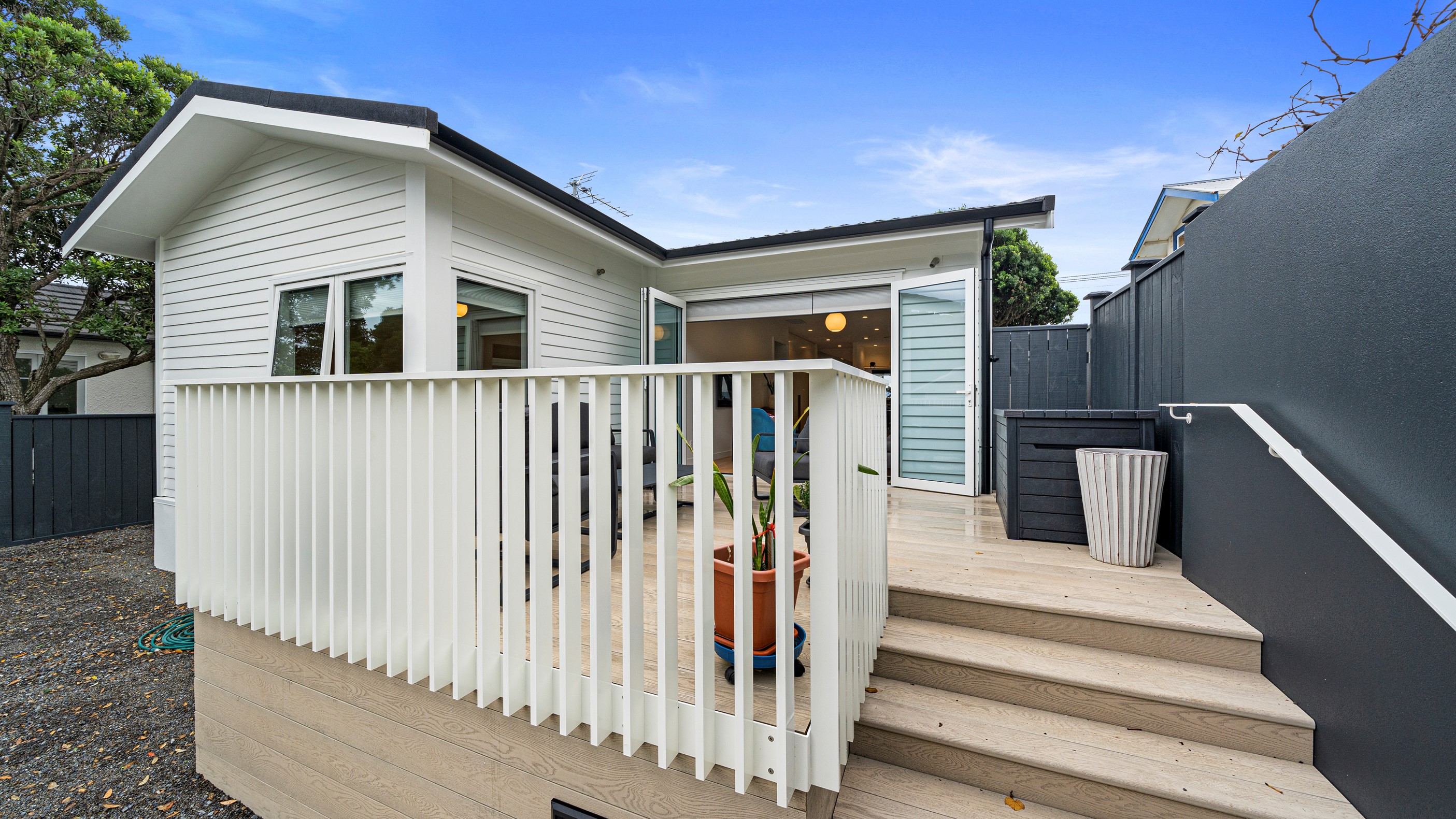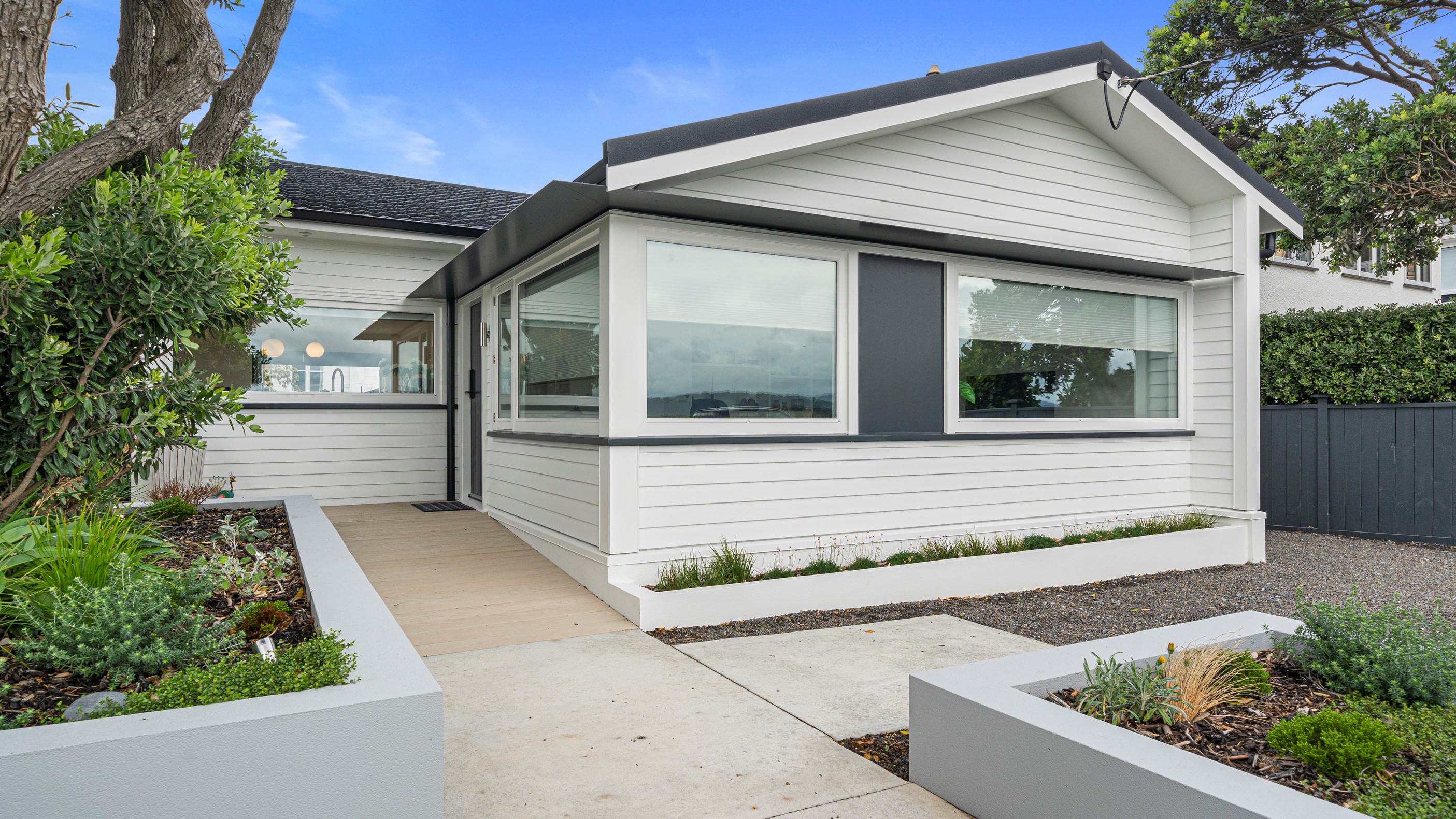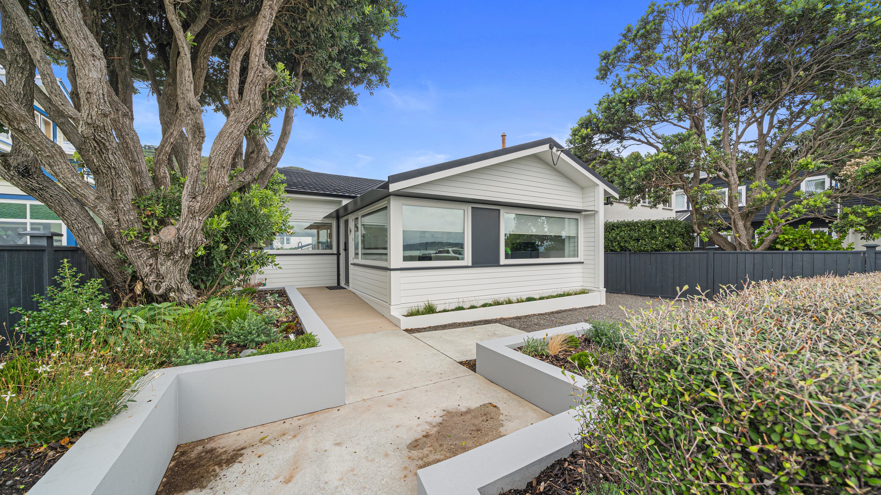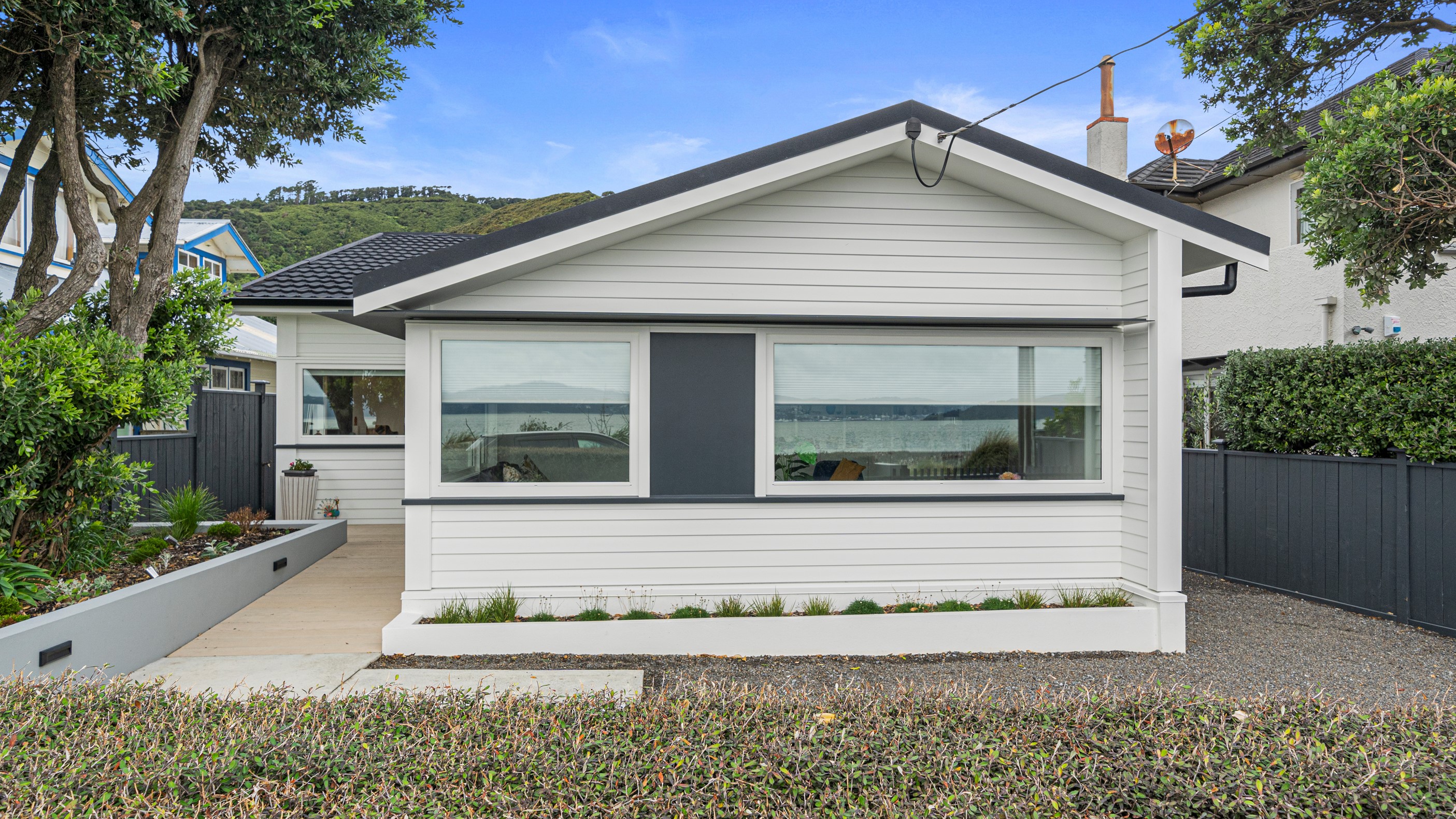 This charming beach bungalow was in serious need of a renovation from a skilled set of hands. It received both thanks to builders who managed the high-spec upgrade while retaining the home’s original vibe. The revamp brings the 188sqm house up to modern standards and has established comfortable living for decades to come. A rejigged layout, modern materials, a heating and cooling system, and above-code insulation make it a fantastic place to live – no matter what the Wellington weather throws its way. The renovation involved new timber-framed walls, wall linings, skillion ceilings, skylights, a huge amount of joinery and a mammoth upgrade of the existing deck. Floorboards were taken up and, where possible, reused. New window joinery was installed and – in one case – a door, window and weatherboards were replaced with sliders. Views over Wellington Harbour are on show through glazing along the front of the house. Light is invited in through skylights and new windows, giving the two-bedroom home a completely different feel. You’ll also find a slick new monochrome galley kitchen, two freshly updated and fully tiled bathrooms, landscaping from front to back, and a new garage.