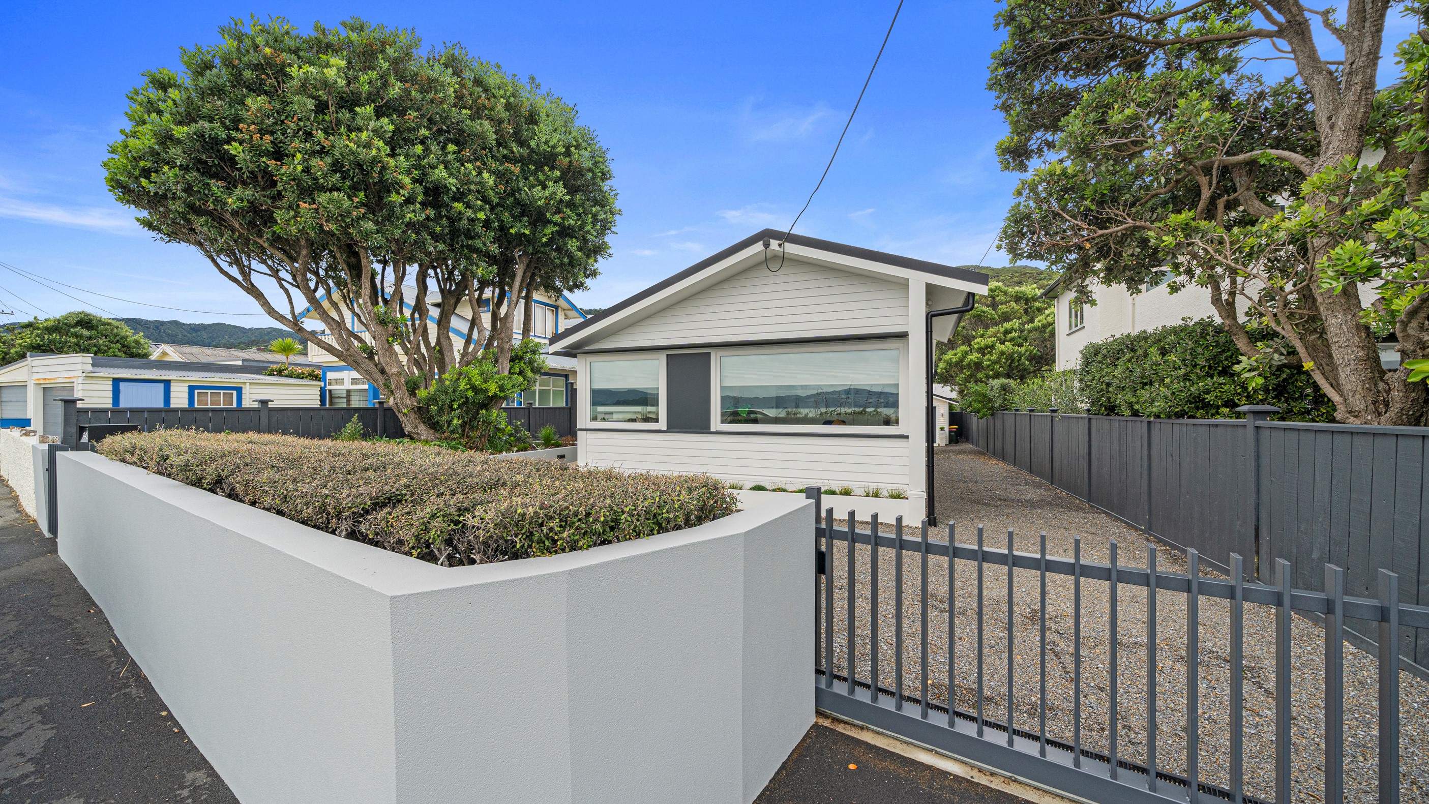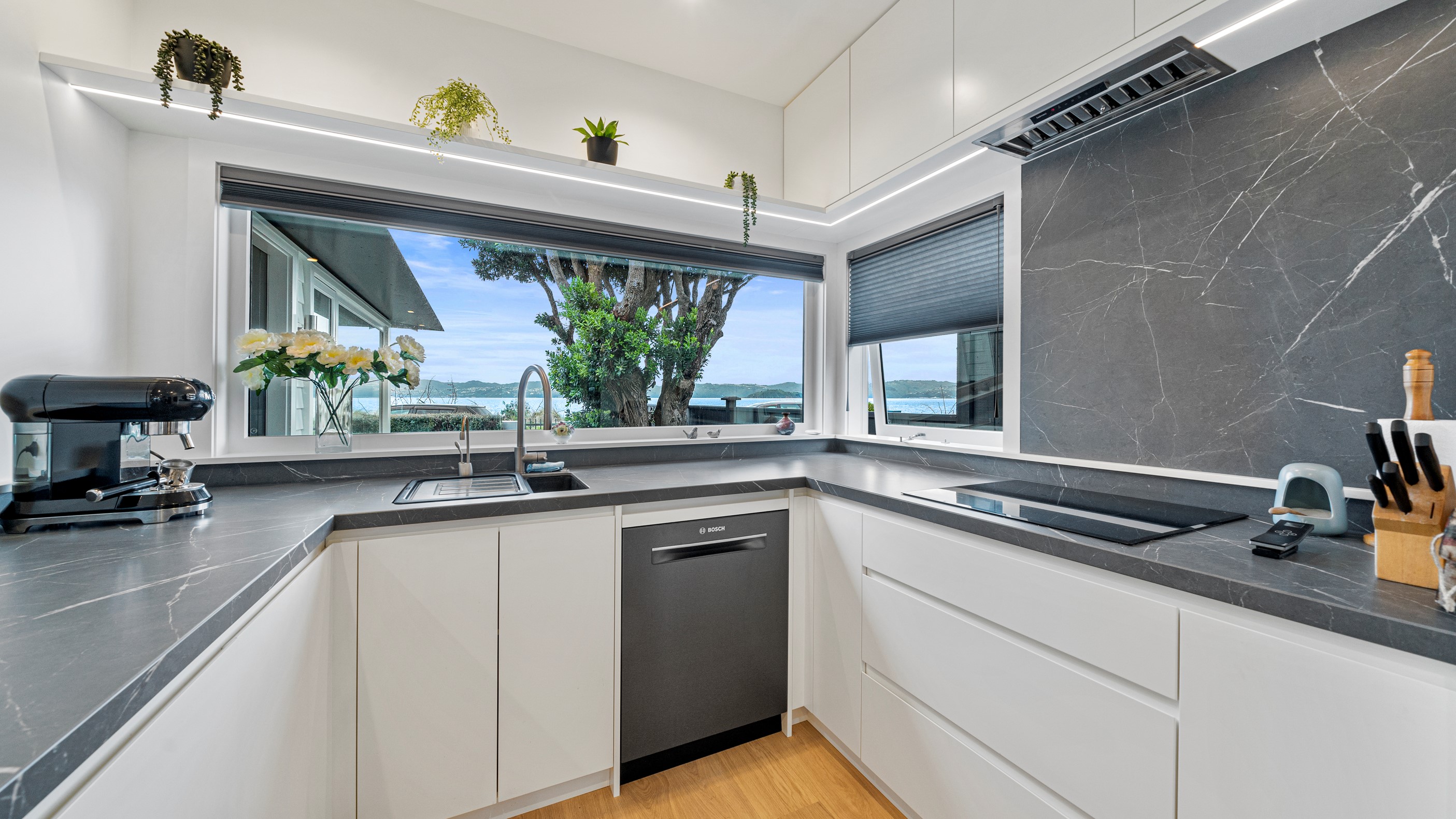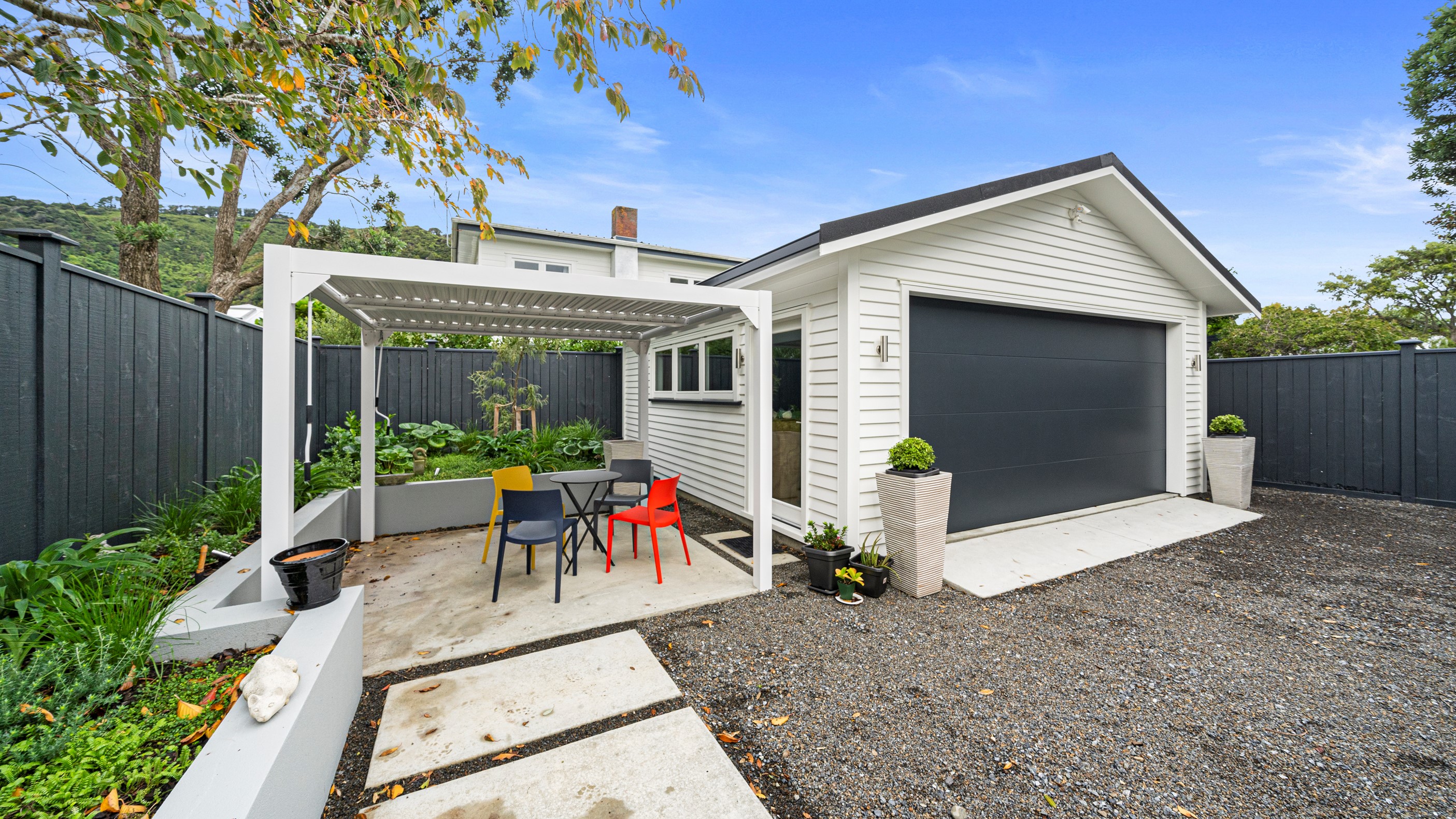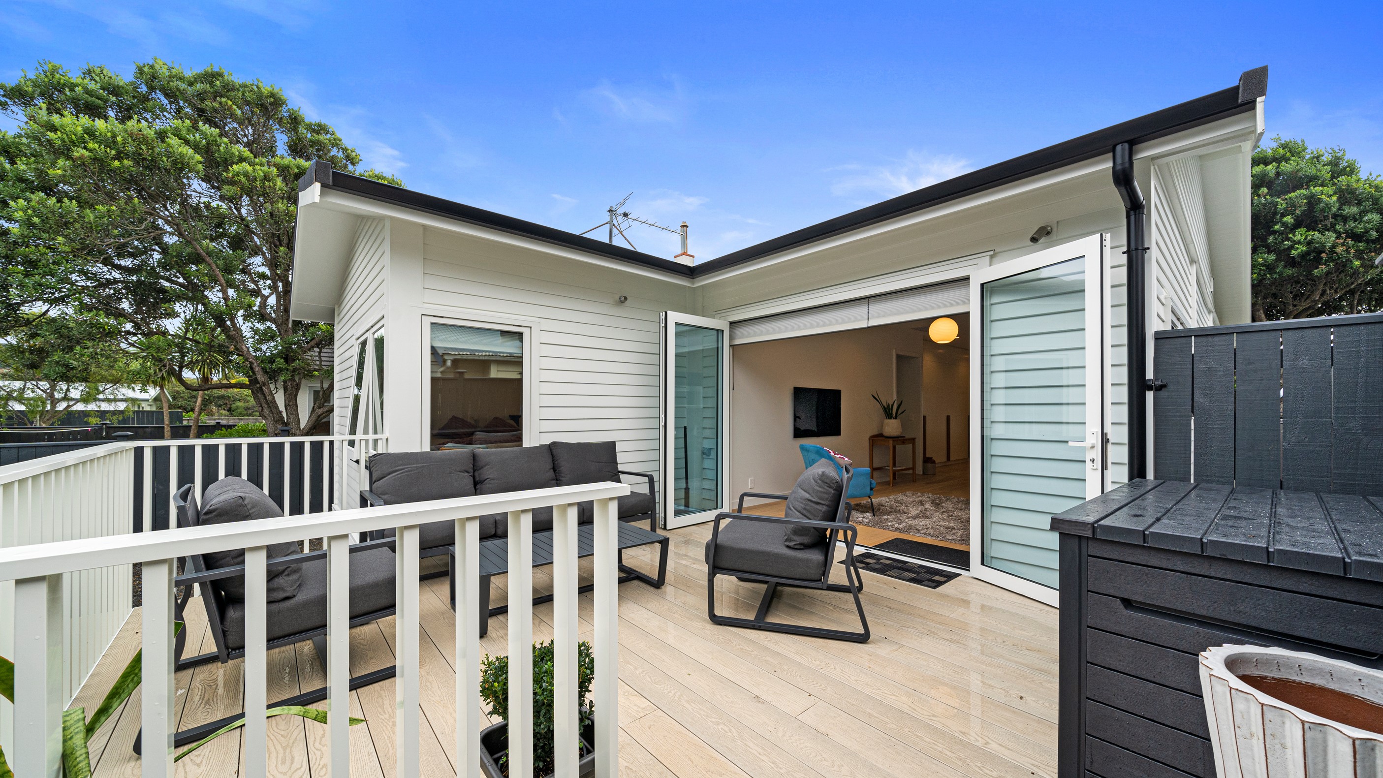 This charming beach bungalow was in serious need of a renovation from a skilled set of hands. It received both thanks to builders who managed the high-spec upgrade while retaining the home’s original vibe. The revamp brings the 188sqm house up to modern standards and has established comfortable living for decades to come. A rejigged layout, modern materials, a heating and cooling system, and above-code insulation make it a fantastic place to live – no matter what the Wellington weather throws its way. The renovation involved new timber-framed walls, wall linings, skillion ceilings, skylights, a huge amount of joinery and a mammoth upgrade of the existing deck. Floorboards were taken up and, where possible, reused. New window joinery was installed and – in one case – a door, window and weatherboards were replaced with sliders. Views over Wellington Harbour are on show through glazing along the front of the house. Light is invited in through skylights and new windows, giving the two-bedroom home a completely different feel. You’ll also find a slick new monochrome galley kitchen, two freshly updated and fully tiled bathrooms, landscaping from front to back, and a new garage.