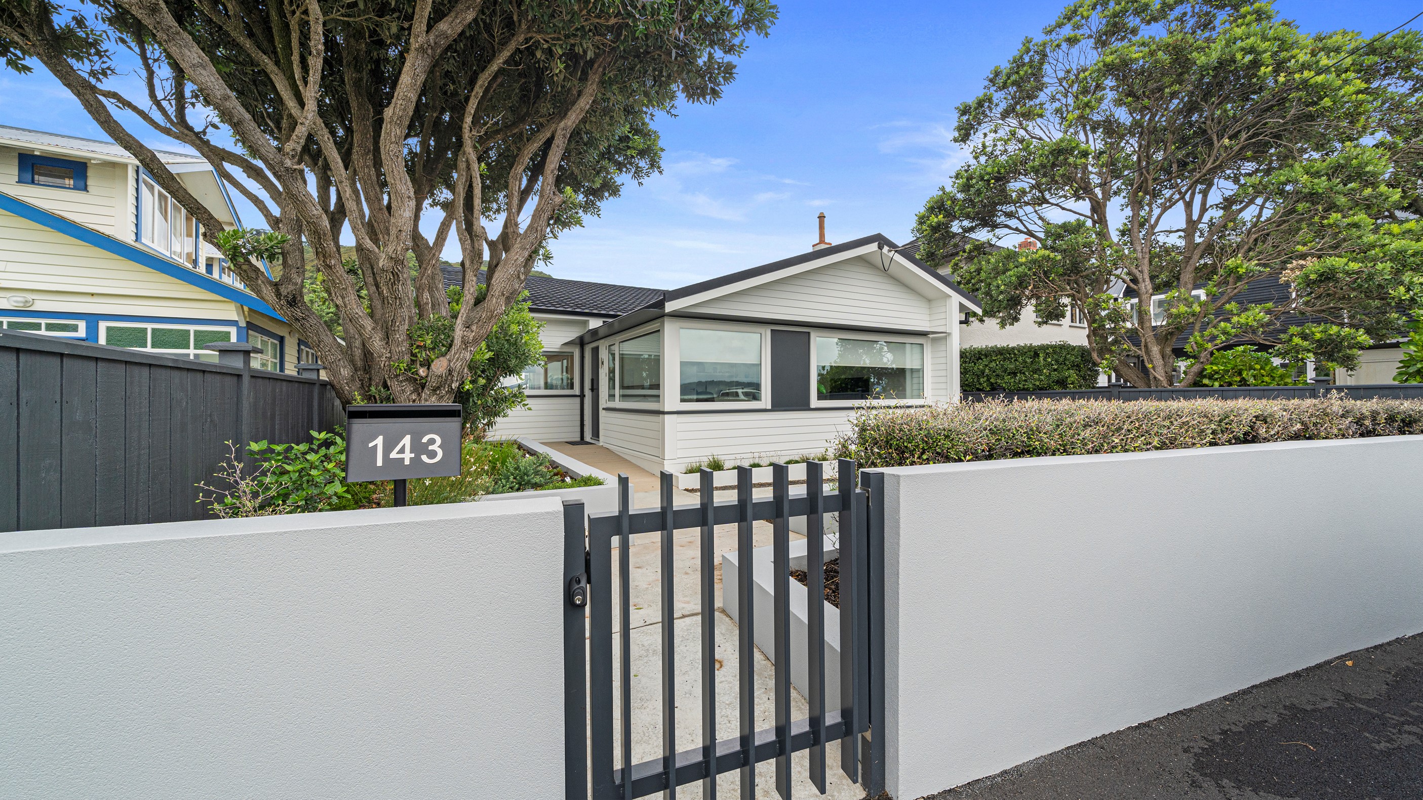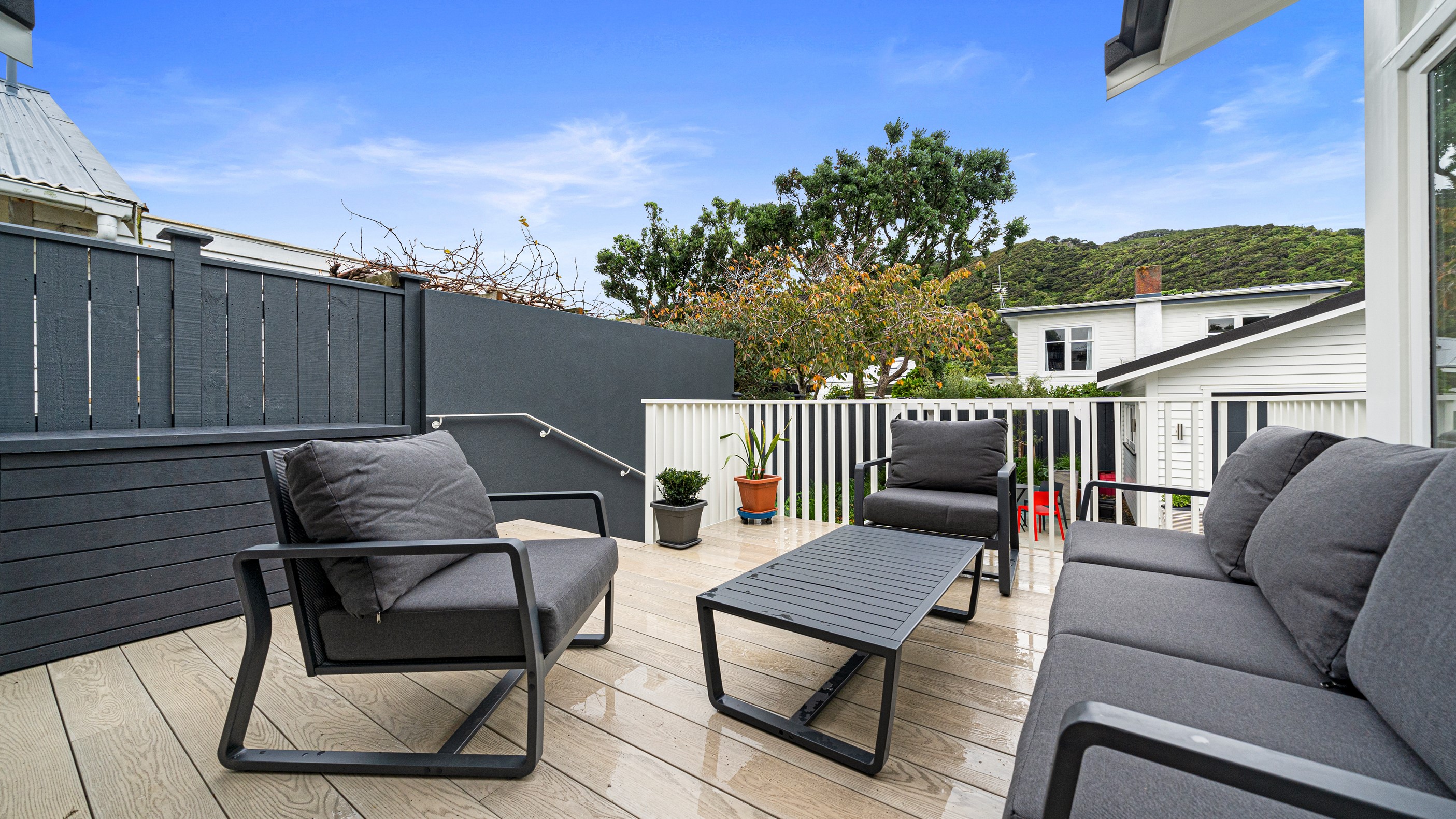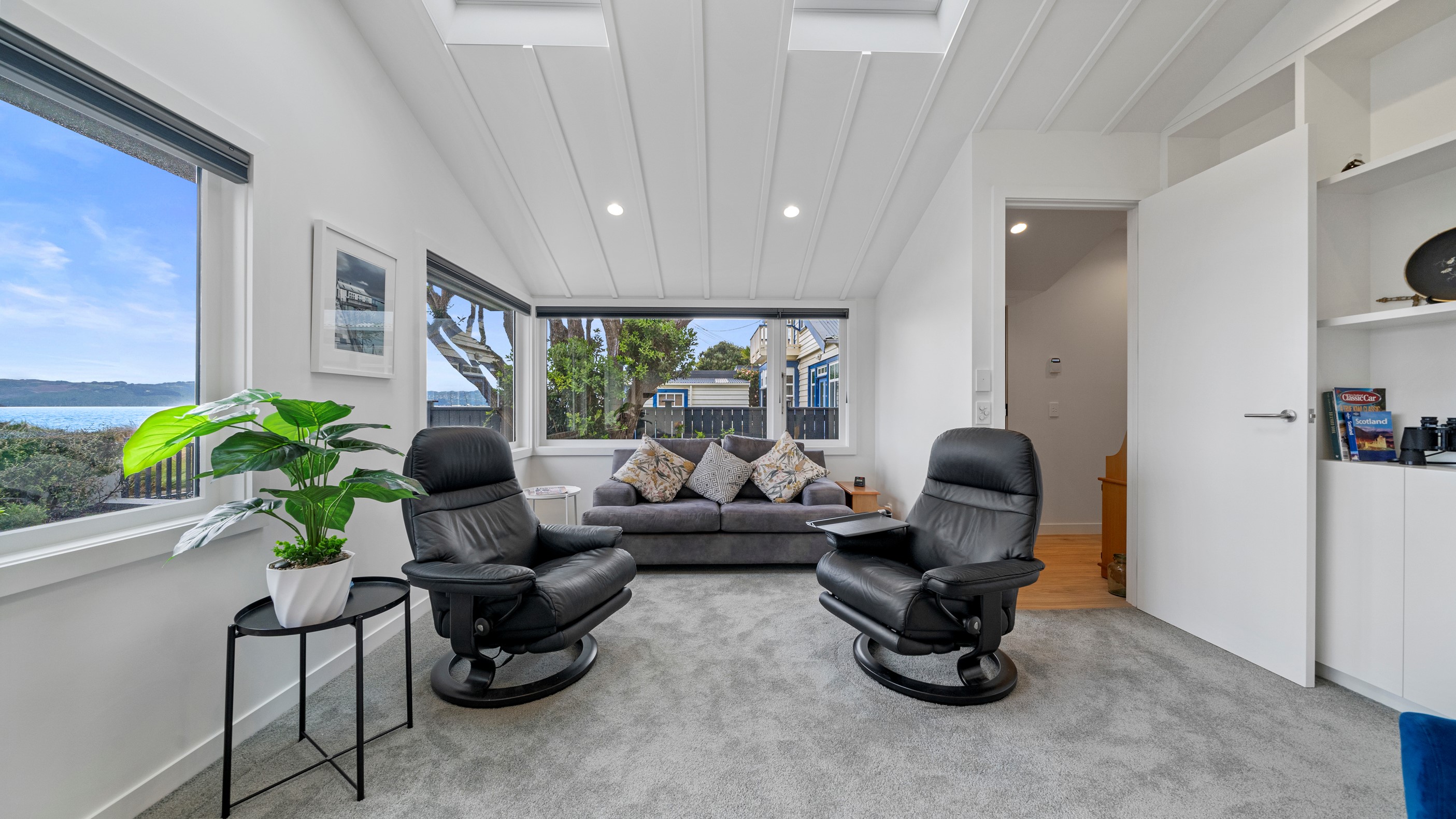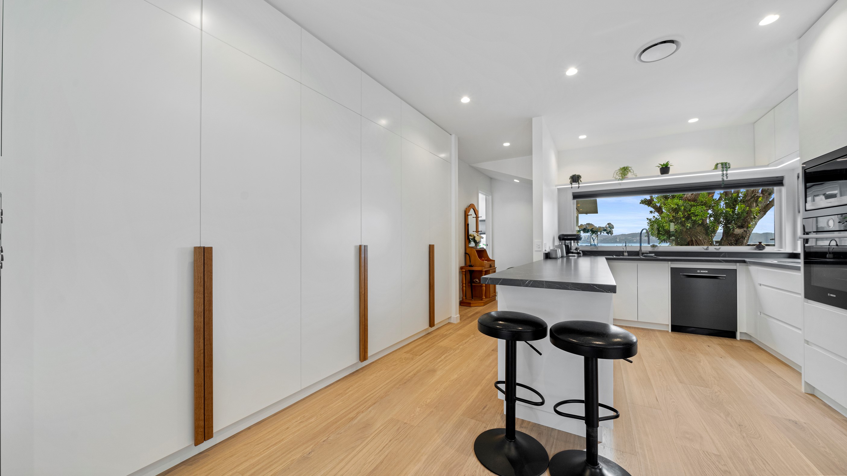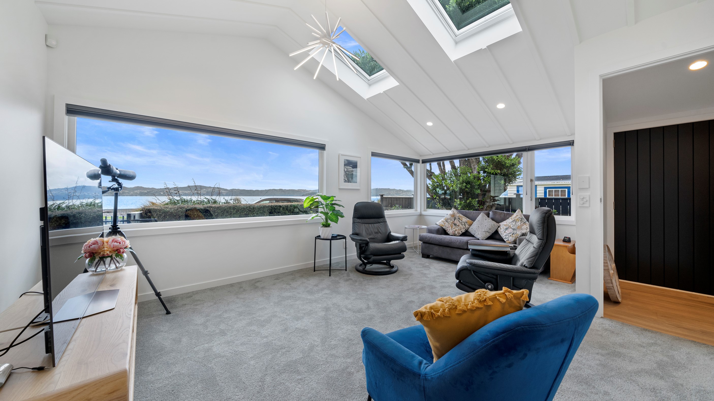 This charming beach bungalow was in serious need of a renovation from a skilled set of hands. It received both thanks to builders who managed the high-spec upgrade while retaining the home’s original vibe. The revamp brings the 188sqm house up to modern standards and has established comfortable living for decades to come. A rejigged layout, modern materials, a heating and cooling system, and above-code insulation make it a fantastic place to live – no matter what the Wellington weather throws its way. The renovation involved new timber-framed walls, wall linings, skillion ceilings, skylights, a huge amount of joinery and a mammoth upgrade of the existing deck. Floorboards were taken up and, where possible, reused. New window joinery was installed and – in one case – a door, window and weatherboards were replaced with sliders. Views over Wellington Harbour are on show through glazing along the front of the house. Light is invited in through skylights and new windows, giving the two-bedroom home a completely different feel. You’ll also find a slick new monochrome galley kitchen, two freshly updated and fully tiled bathrooms, landscaping from front to back, and a new garage.