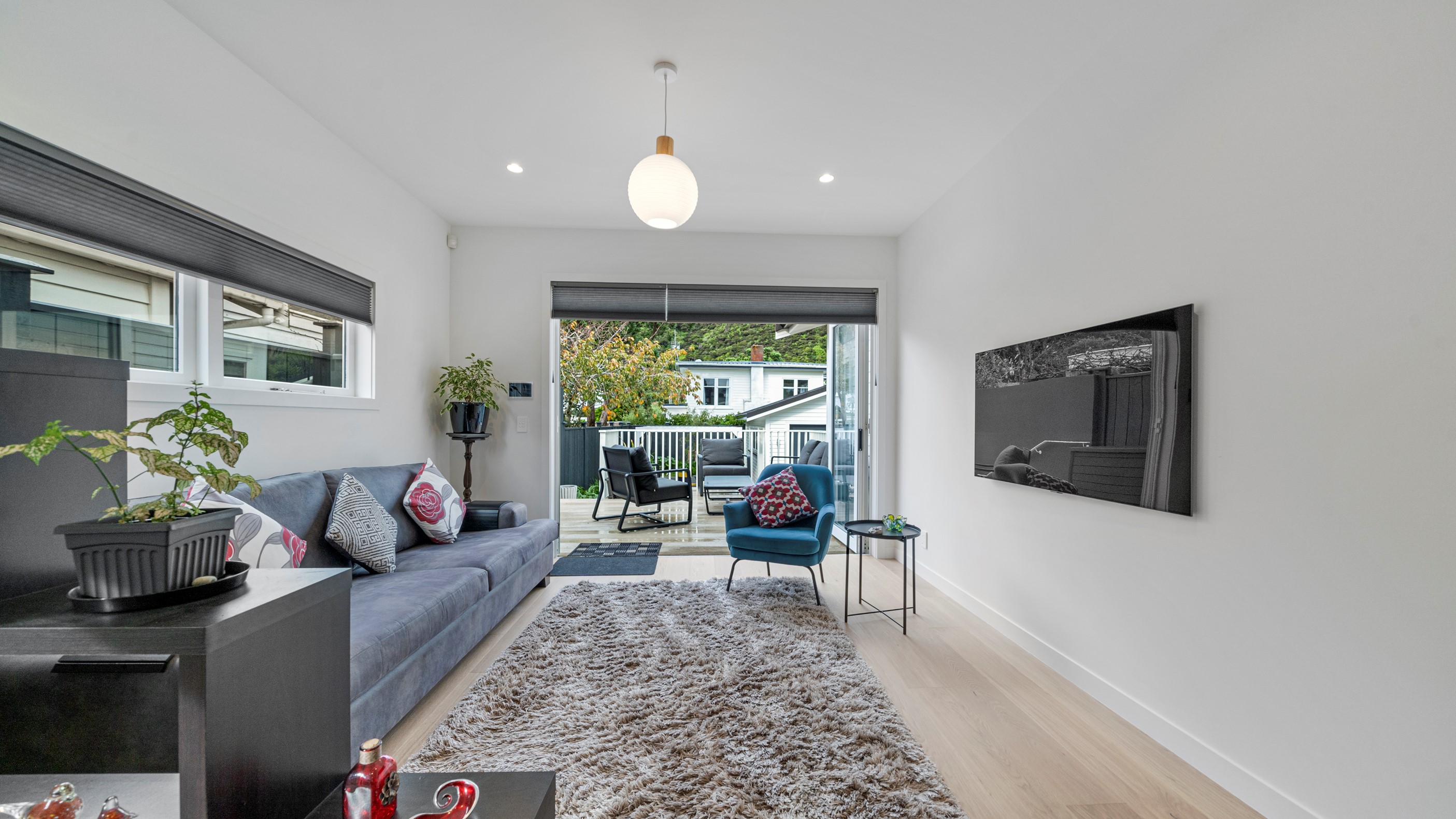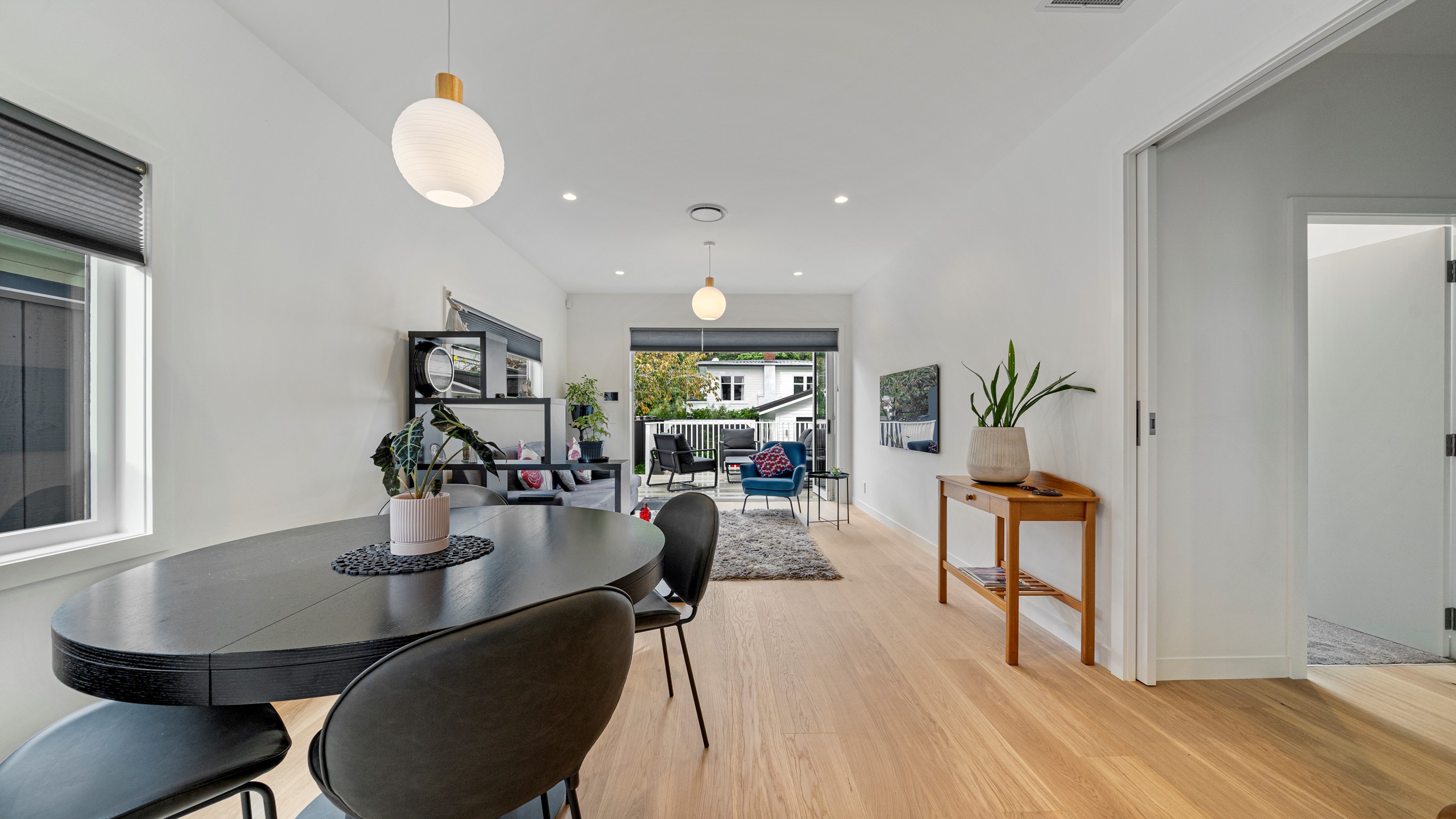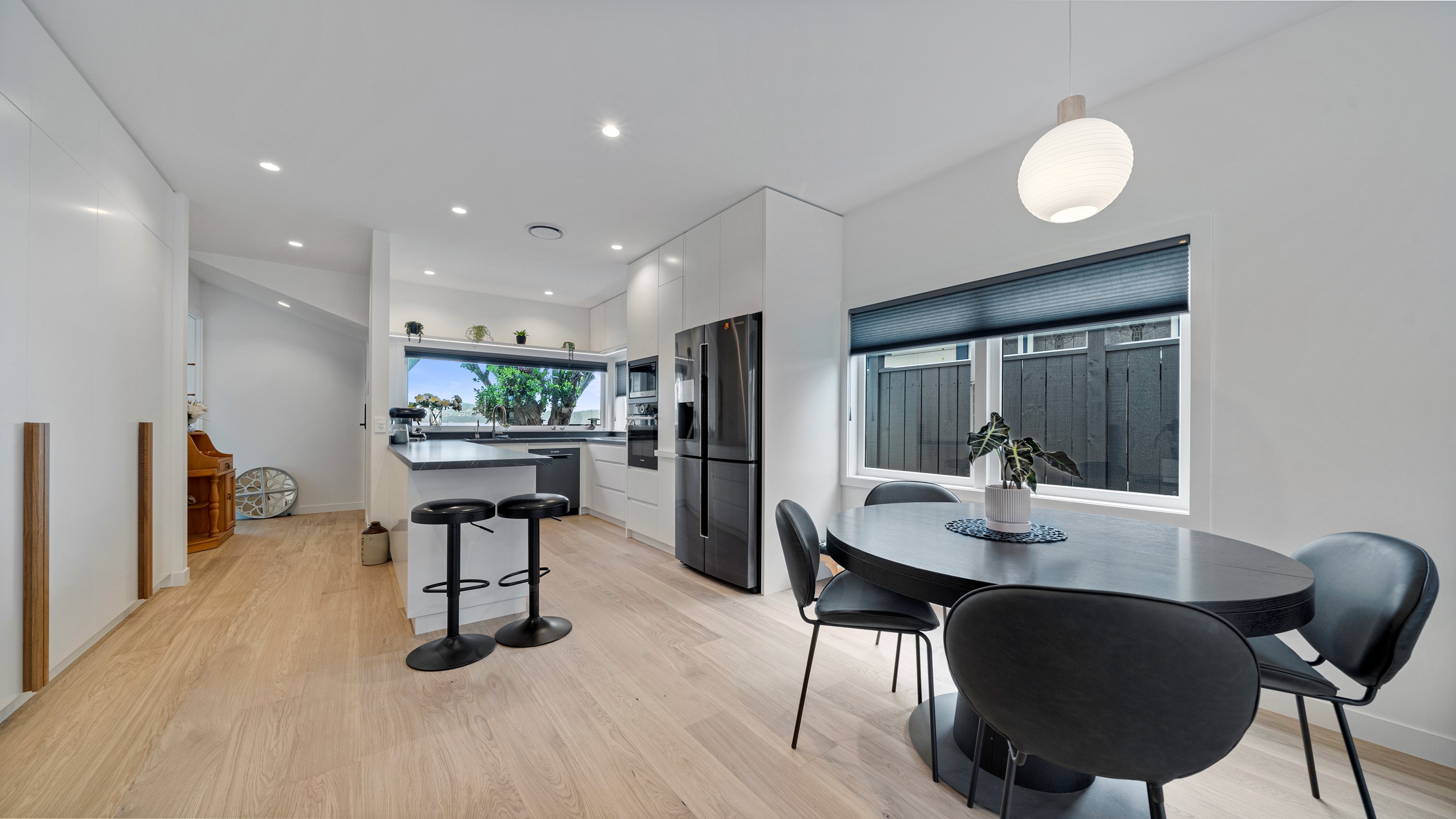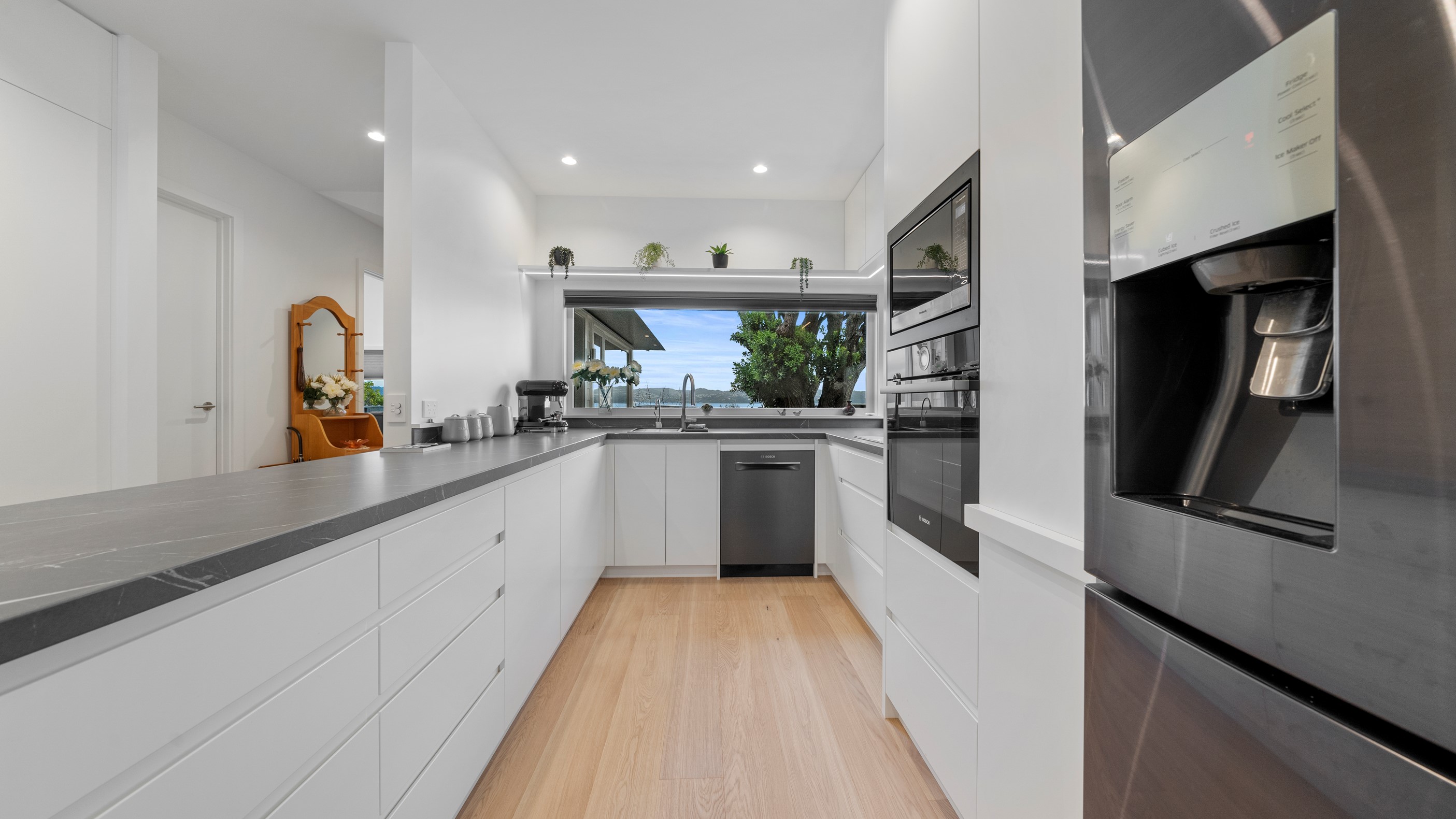 This charming beach bungalow was in serious need of a renovation from a skilled set of hands. It received both thanks to builders who managed the high-spec upgrade while retaining the home’s original vibe. The revamp brings the 188sqm house up to modern standards and has established comfortable living for decades to come. A rejigged layout, modern materials, a heating and cooling system, and above-code insulation make it a fantastic place to live – no matter what the Wellington weather throws its way. The renovation involved new timber-framed walls, wall linings, skillion ceilings, skylights, a huge amount of joinery and a mammoth upgrade of the existing deck. Floorboards were taken up and, where possible, reused. New window joinery was installed and – in one case – a door, window and weatherboards were replaced with sliders. Views over Wellington Harbour are on show through glazing along the front of the house. Light is invited in through skylights and new windows, giving the two-bedroom home a completely different feel. You’ll also find a slick new monochrome galley kitchen, two freshly updated and fully tiled bathrooms, landscaping from front to back, and a new garage.