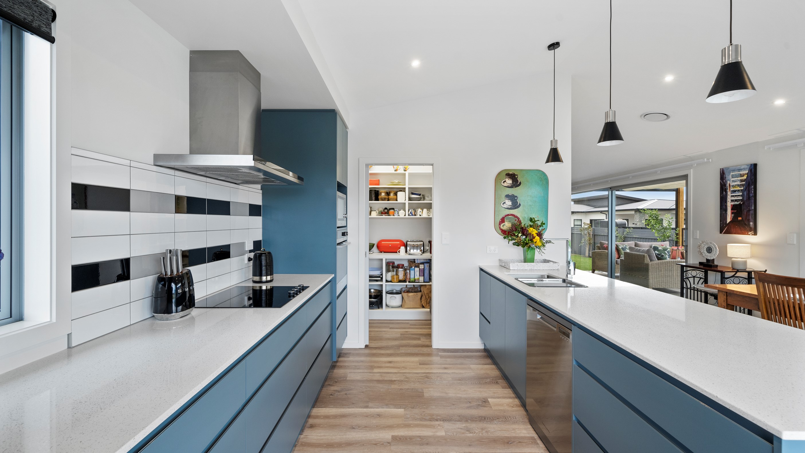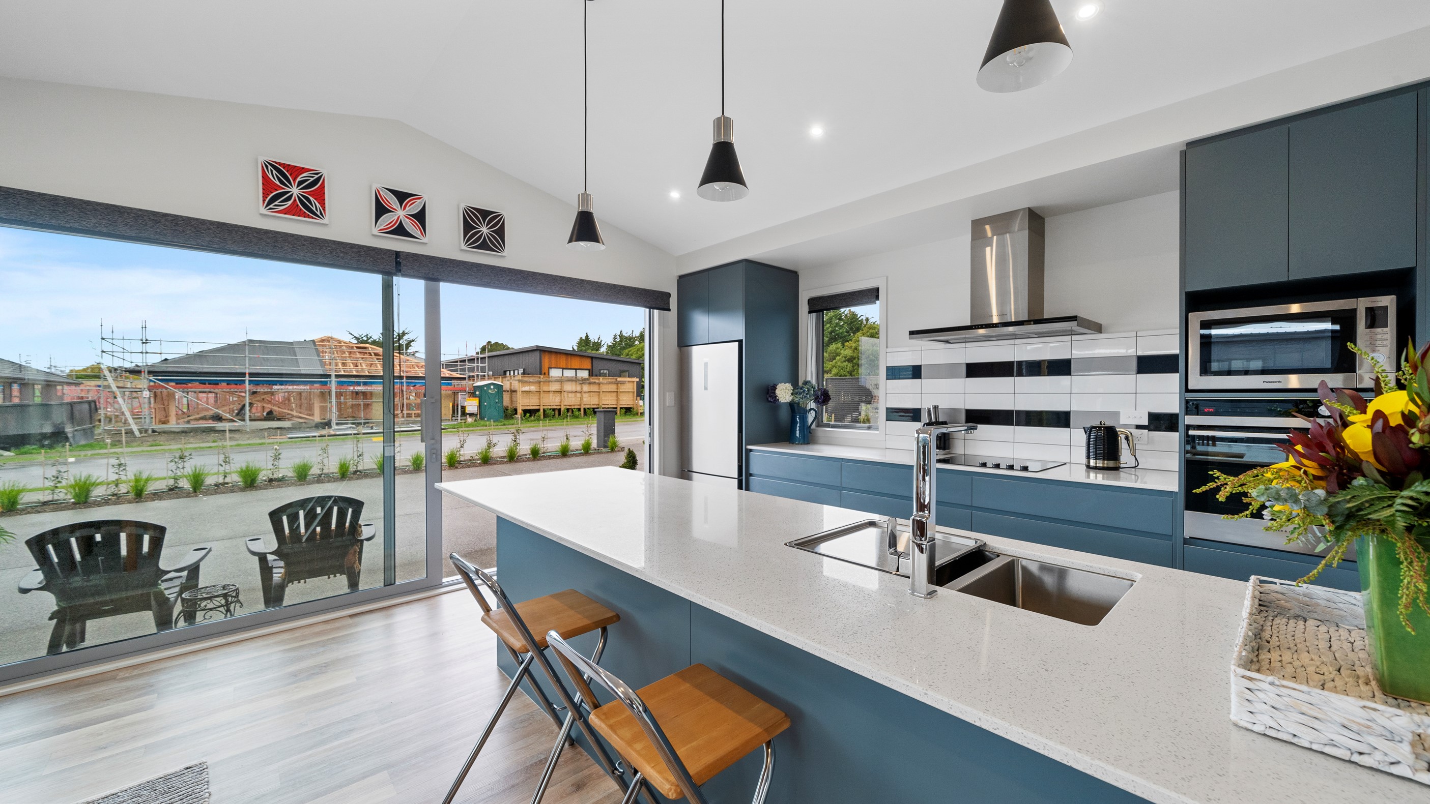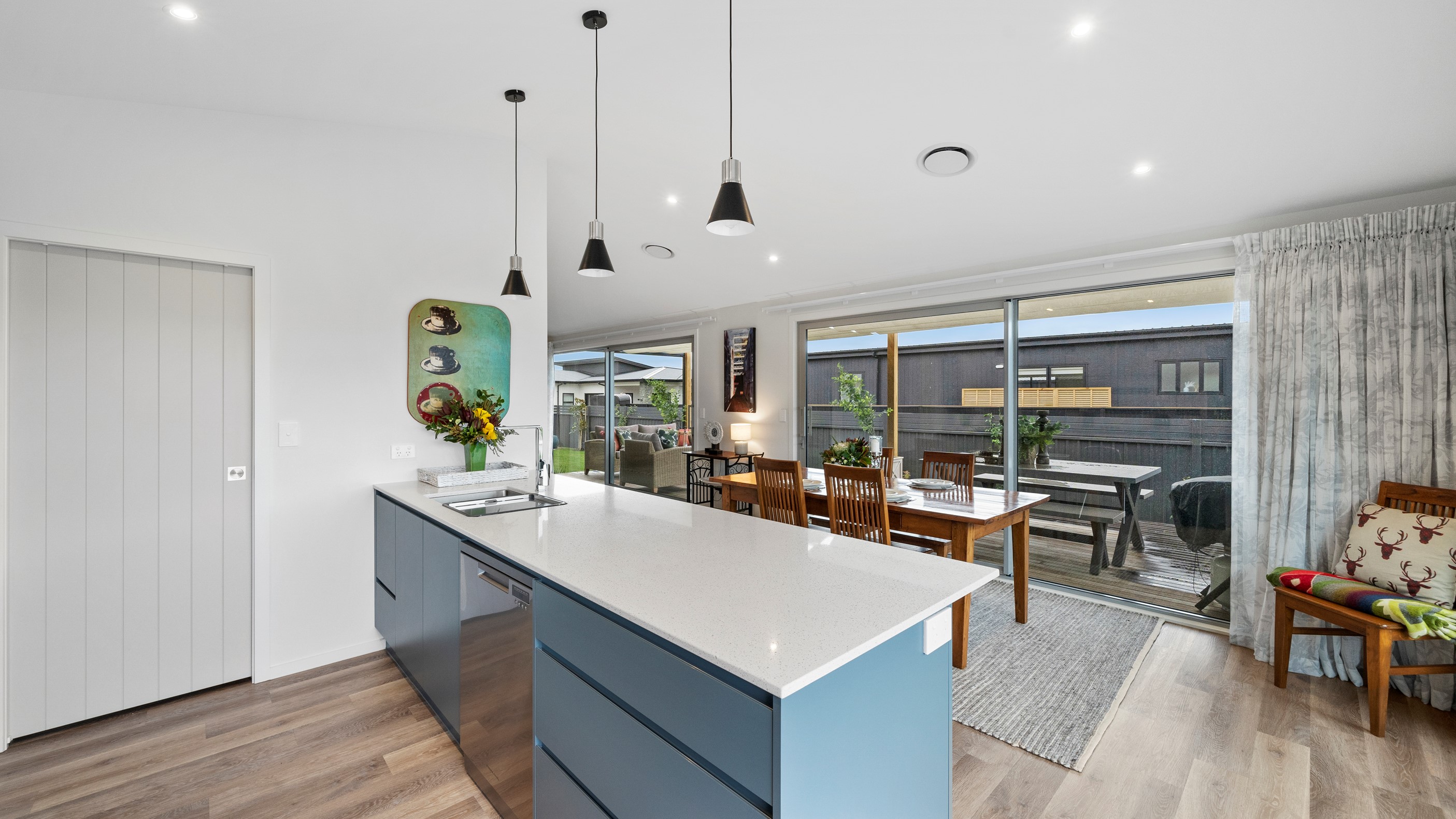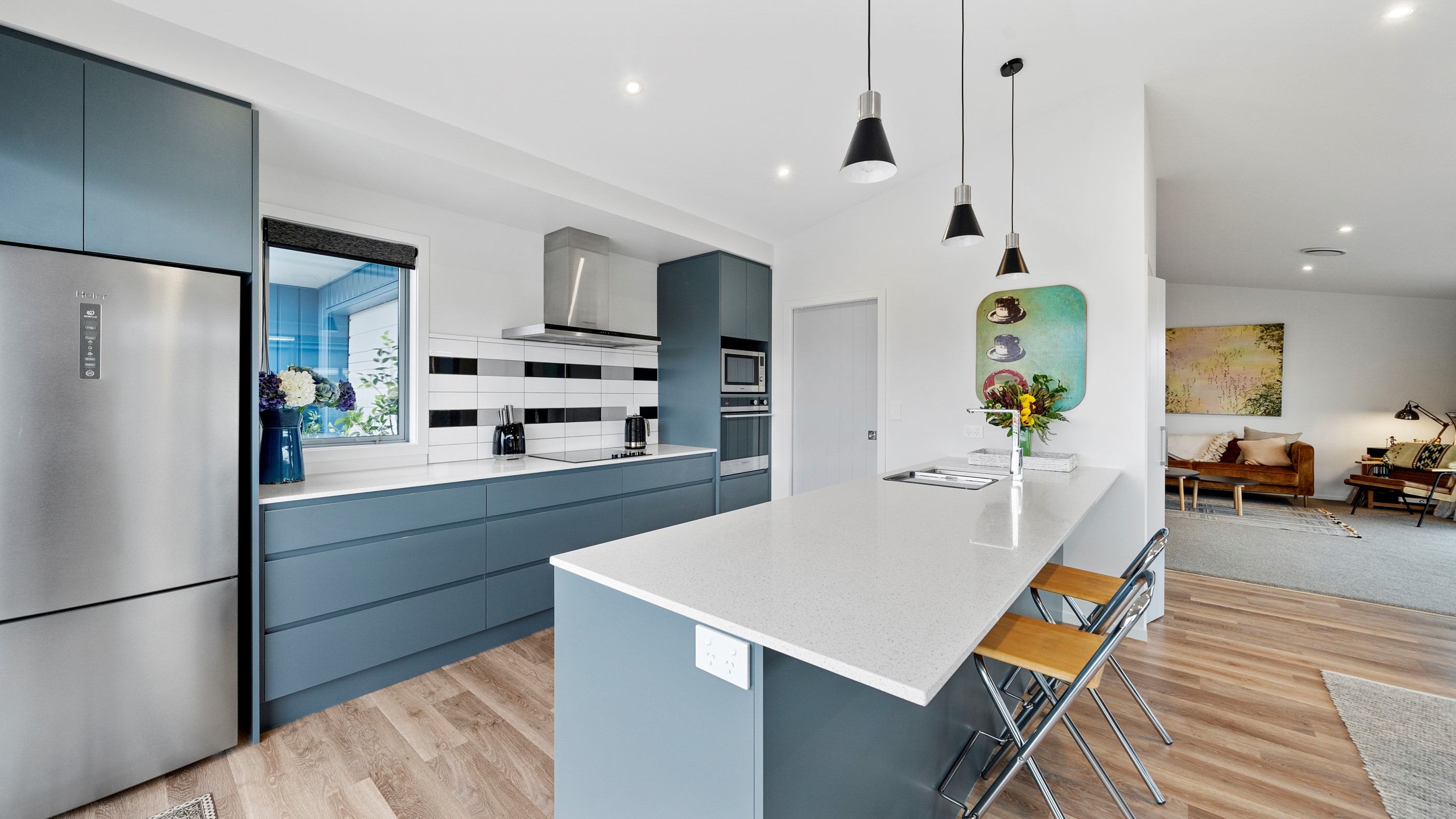 This house has undeniable street presence with its blue exterior, decorative metal screen and strong gable form. Step inside, and the rest of the 171sqm home is set up to be just as eye-catching. The blue-and-white kitchen is streamlined, thanks to handle-free cabinetry, and a walk-in pantry with ample storage for food and appliances. Features such as the tiled splashback, pendant lights and a breakfast bar inject character and personality. The open-plan living area encompasses the dining space and extends seamlessly through large sliders to private sun-soaked decks, one of which has a pergola for shade. These areas are ideal for dining and relaxing with friends and family. Walk down the hallway and you’ll come to two good-sized bright and airy bedrooms and a family bathroom with a bath and tiled shower. At the end of the hall, the generous main bedroom includes a large walk-in wardrobe and ensuite. A single garage with internal access completes this welcoming home.