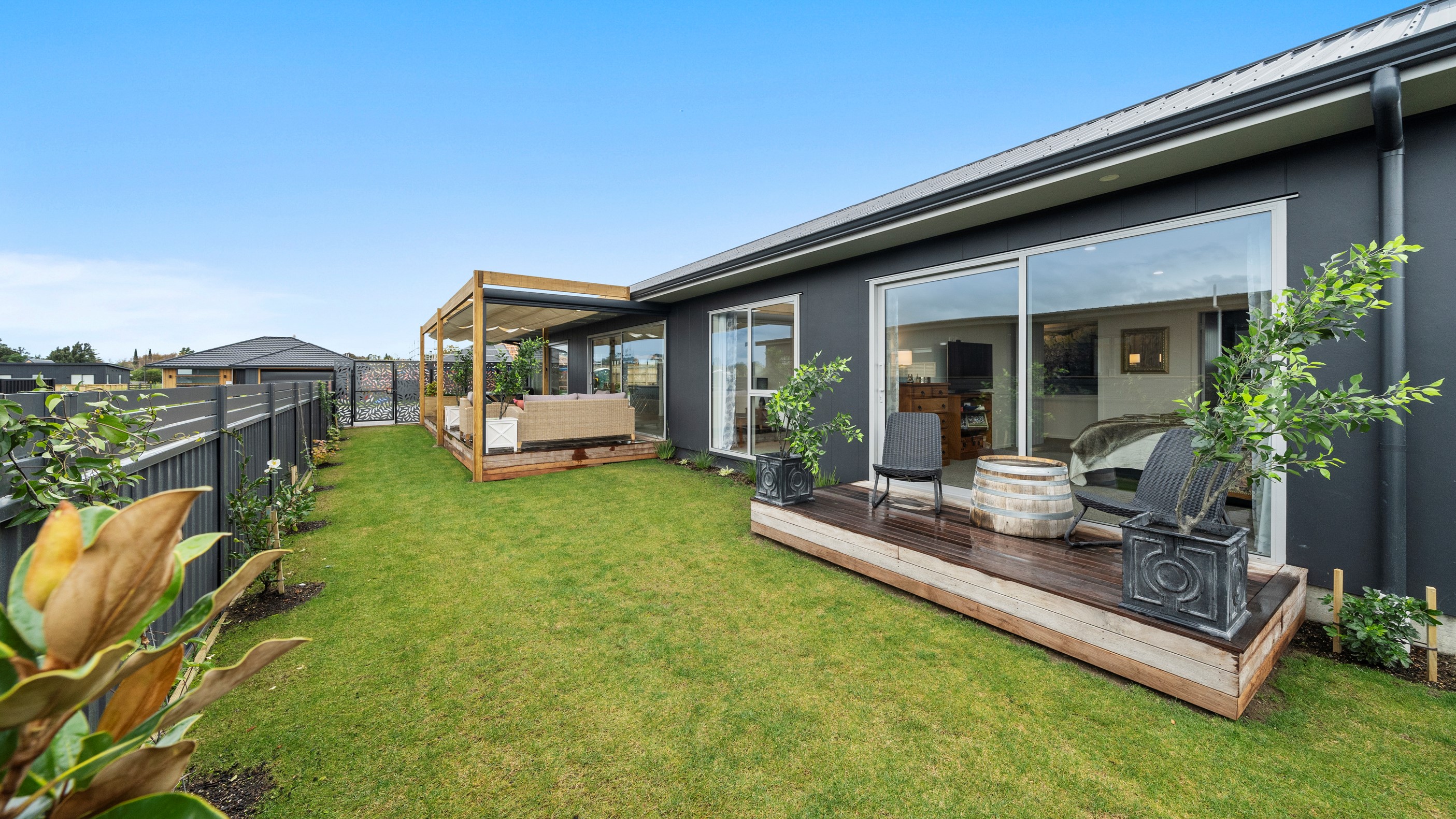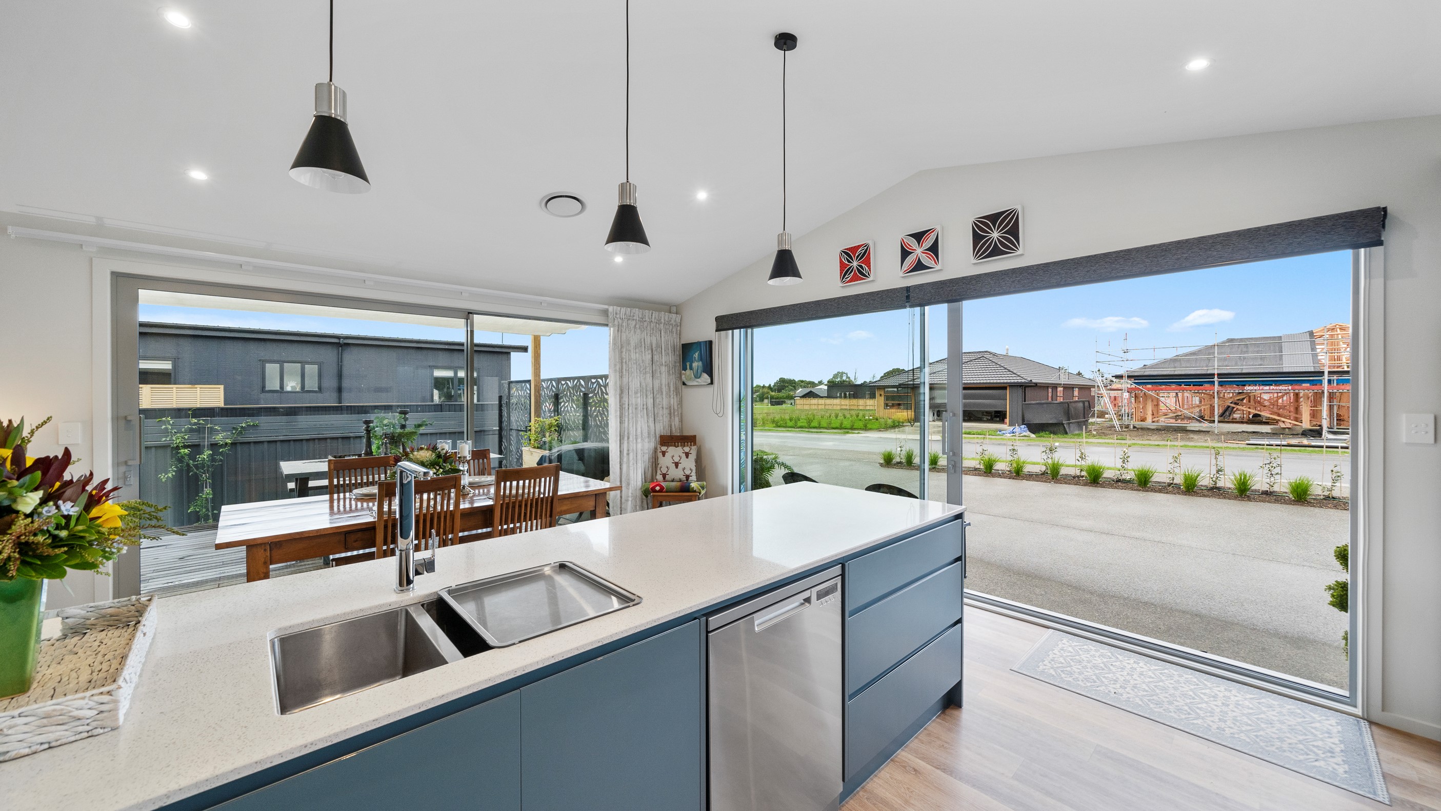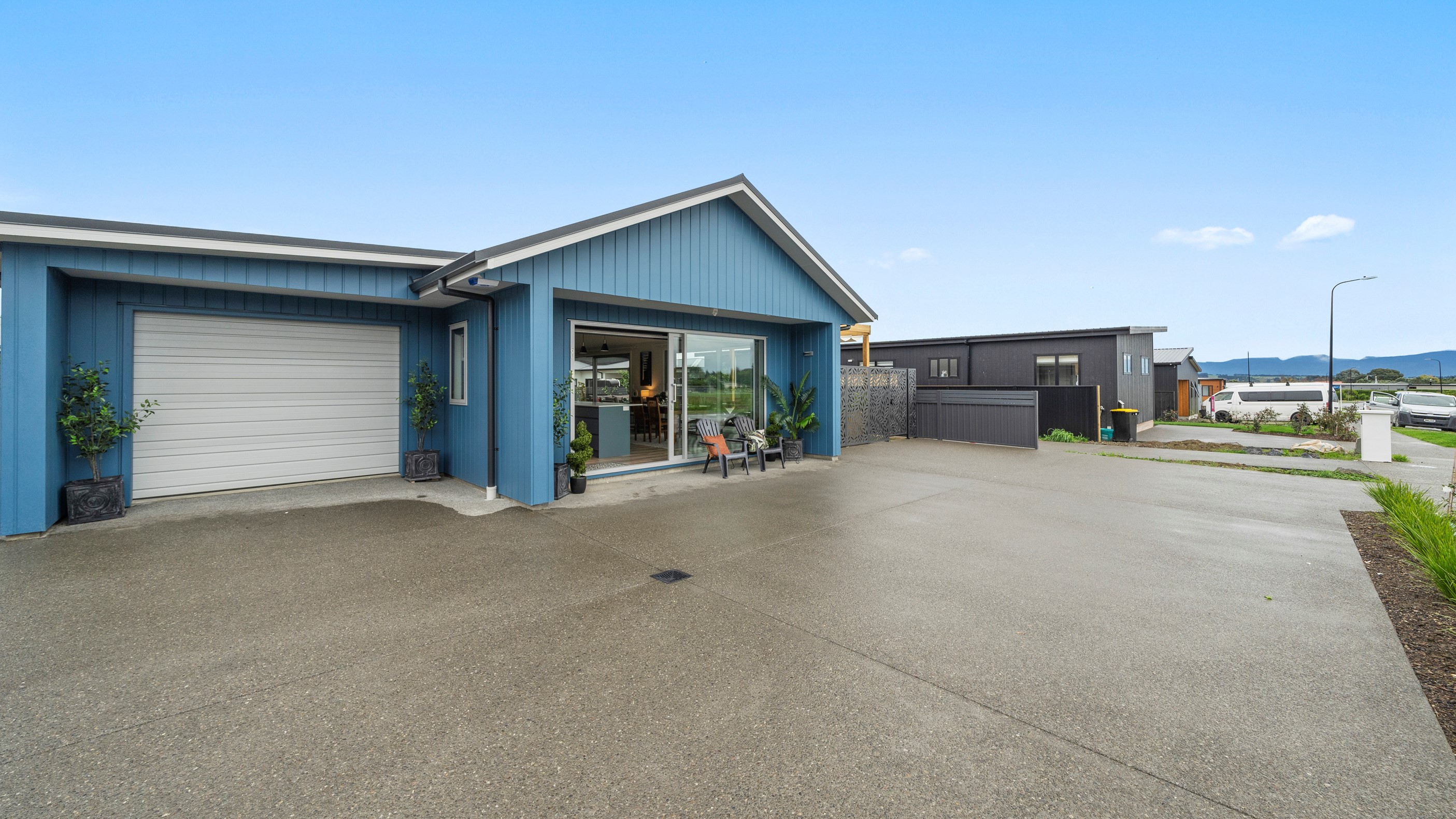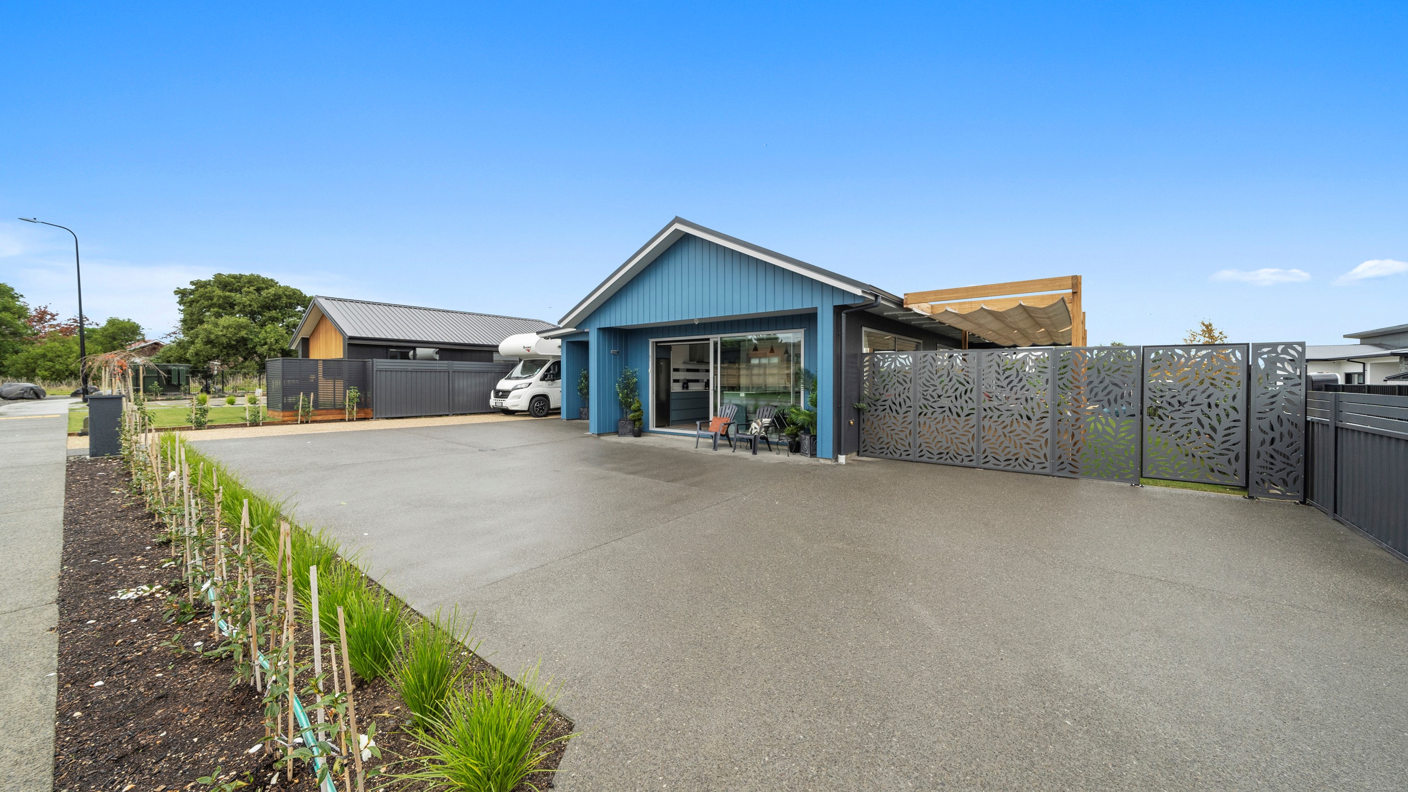 This house has undeniable street presence with its blue exterior, decorative metal screen and strong gable form. Step inside, and the rest of the 171sqm home is set up to be just as eye-catching. The blue-and-white kitchen is streamlined, thanks to handle-free cabinetry, and a walk-in pantry with ample storage for food and appliances. Features such as the tiled splashback, pendant lights and a breakfast bar inject character and personality. The open-plan living area encompasses the dining space and extends seamlessly through large sliders to private sun-soaked decks, one of which has a pergola for shade. These areas are ideal for dining and relaxing with friends and family. Walk down the hallway and you’ll come to two good-sized bright and airy bedrooms and a family bathroom with a bath and tiled shower. At the end of the hall, the generous main bedroom includes a large walk-in wardrobe and ensuite. A single garage with internal access completes this welcoming home.