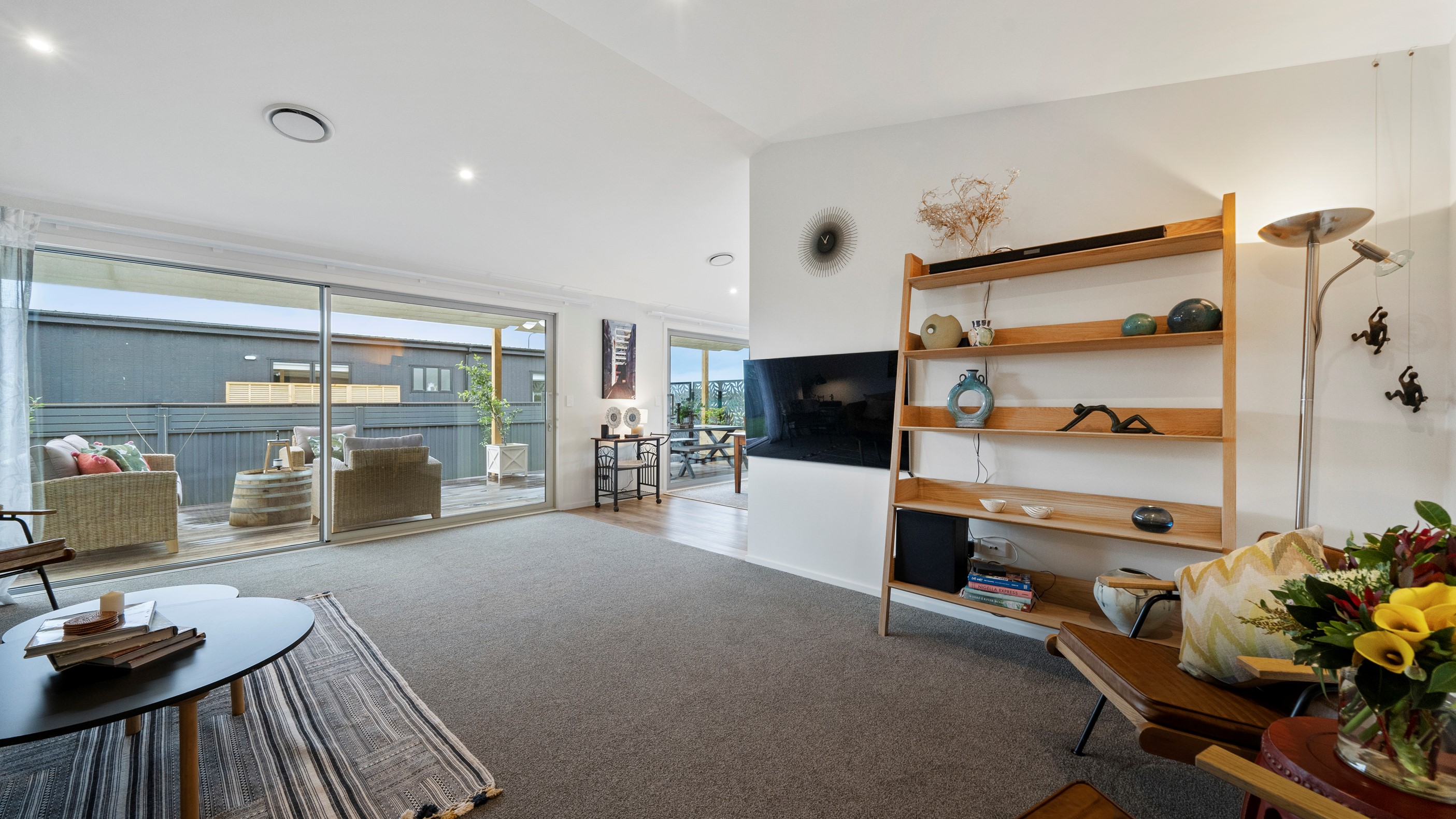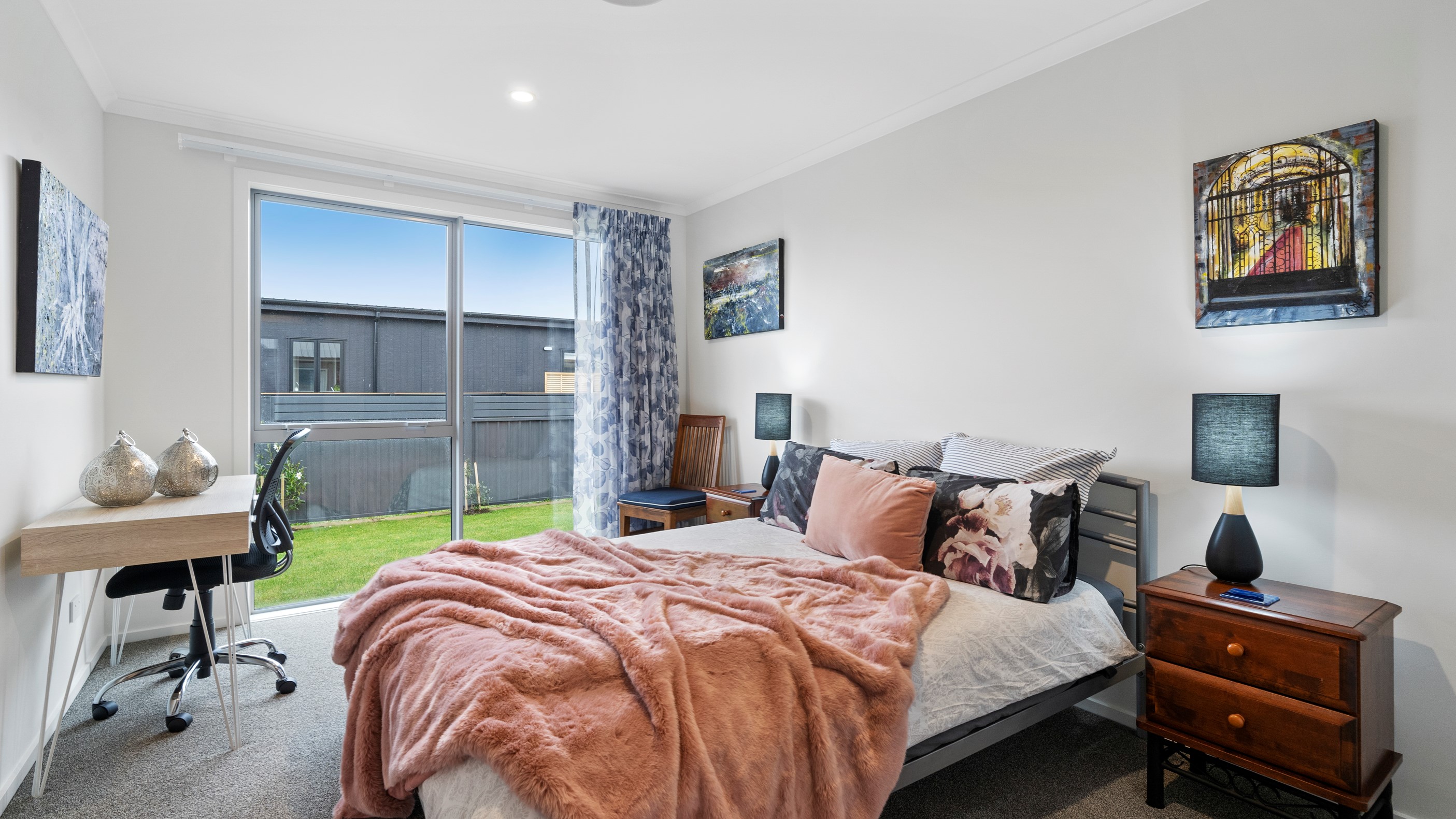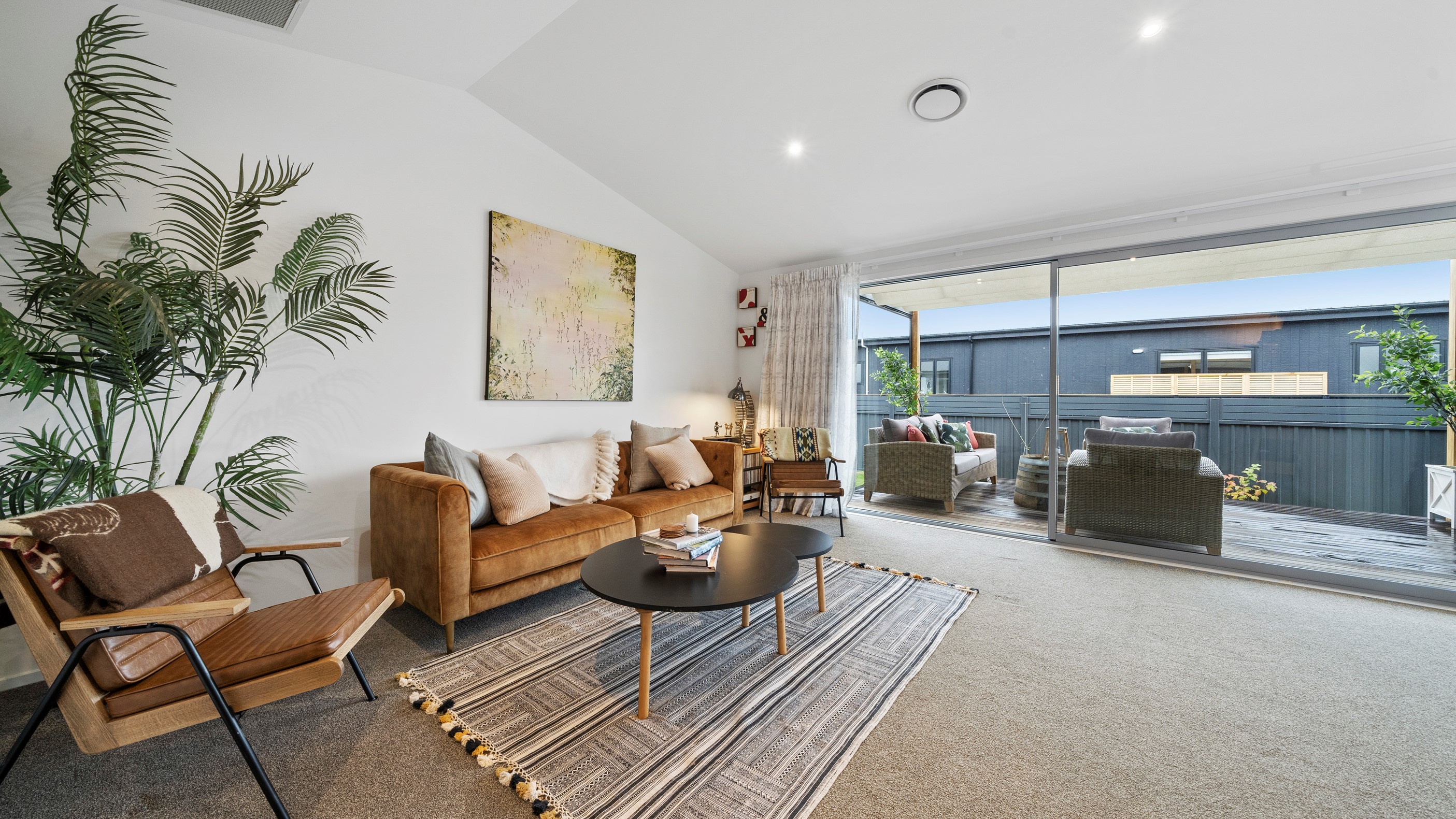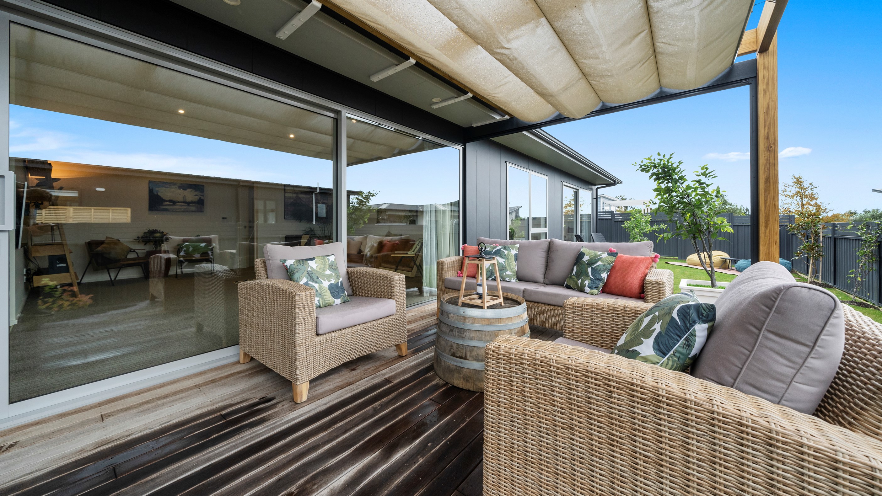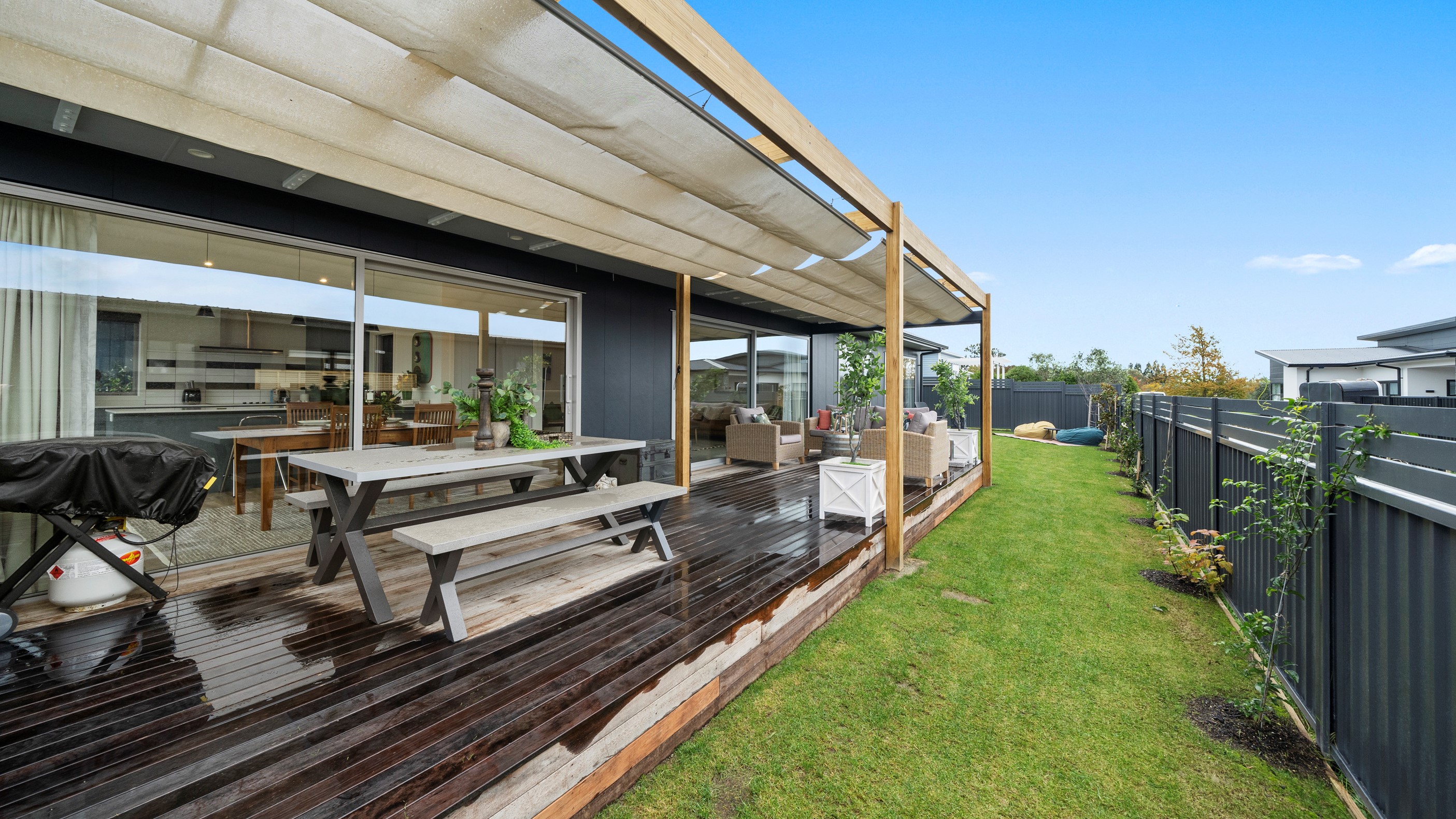 This house has undeniable street presence with its blue exterior, decorative metal screen and strong gable form. Step inside, and the rest of the 171sqm home is set up to be just as eye-catching. The blue-and-white kitchen is streamlined, thanks to handle-free cabinetry, and a walk-in pantry with ample storage for food and appliances. Features such as the tiled splashback, pendant lights and a breakfast bar inject character and personality. The open-plan living area encompasses the dining space and extends seamlessly through large sliders to private sun-soaked decks, one of which has a pergola for shade. These areas are ideal for dining and relaxing with friends and family. Walk down the hallway and you’ll come to two good-sized bright and airy bedrooms and a family bathroom with a bath and tiled shower. At the end of the hall, the generous main bedroom includes a large walk-in wardrobe and ensuite. A single garage with internal access completes this welcoming home.