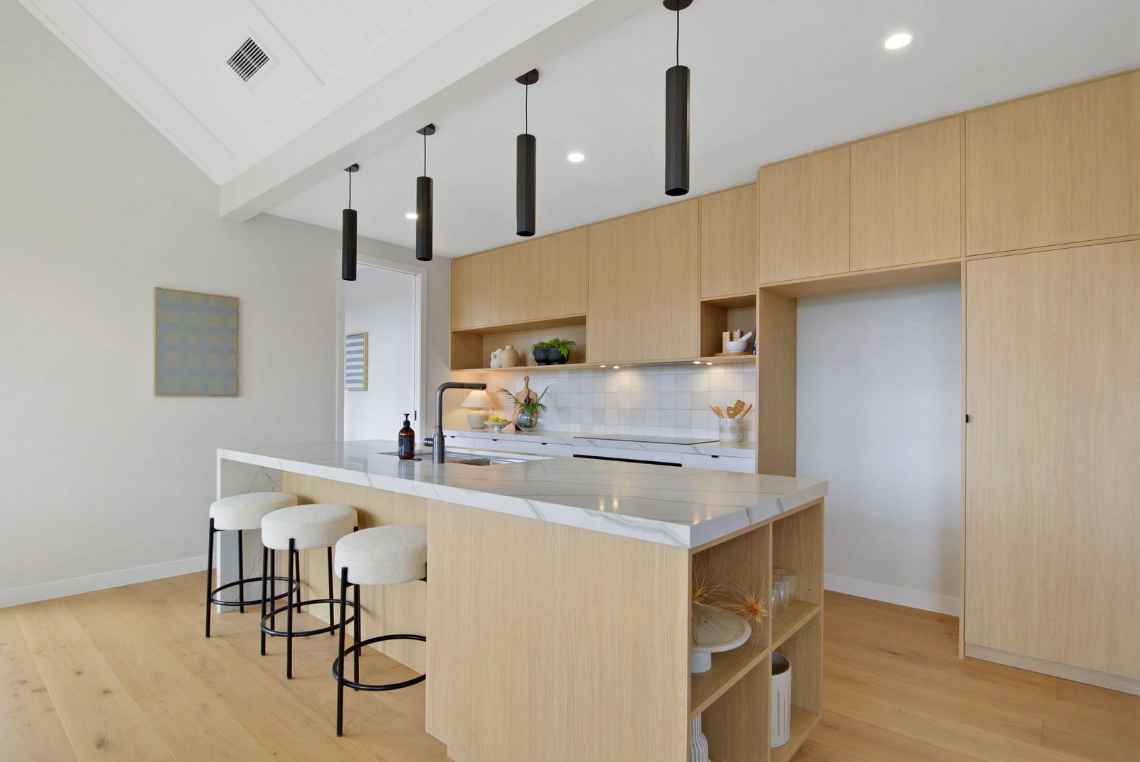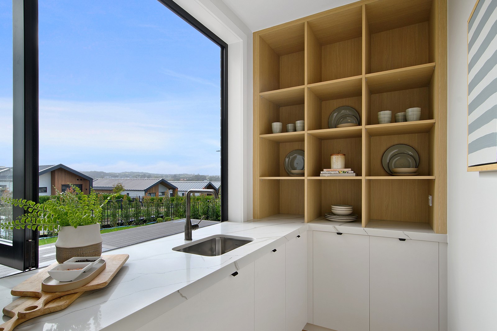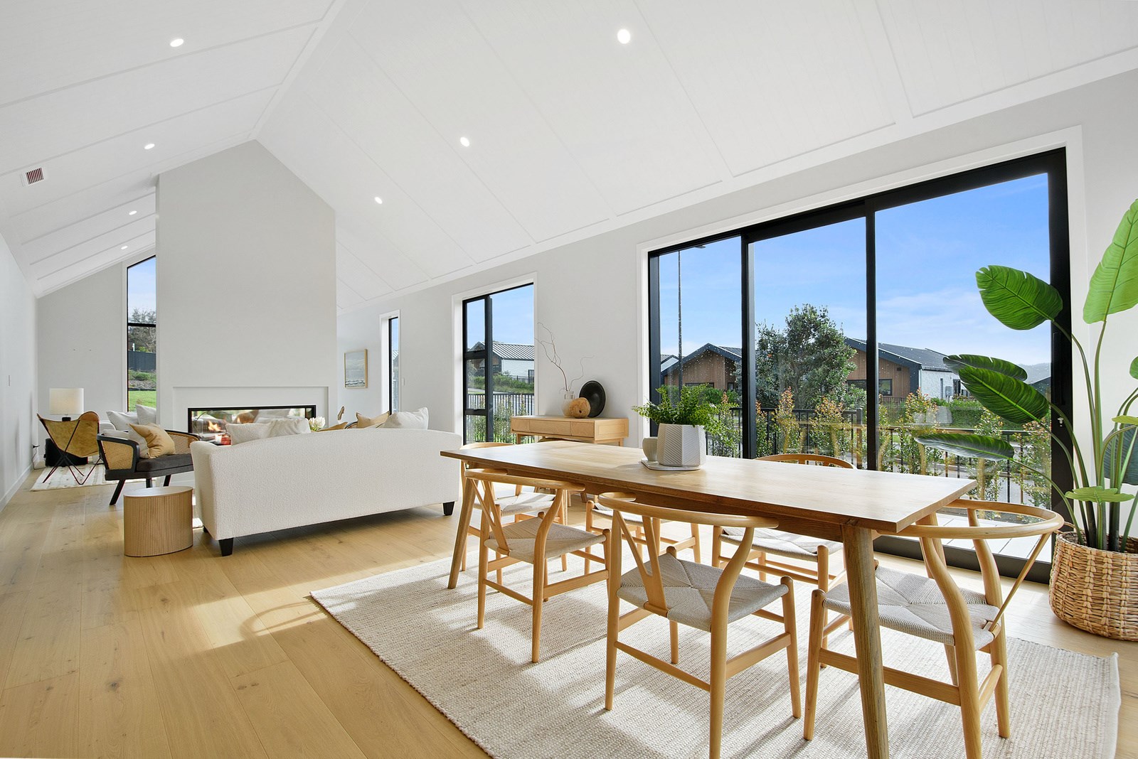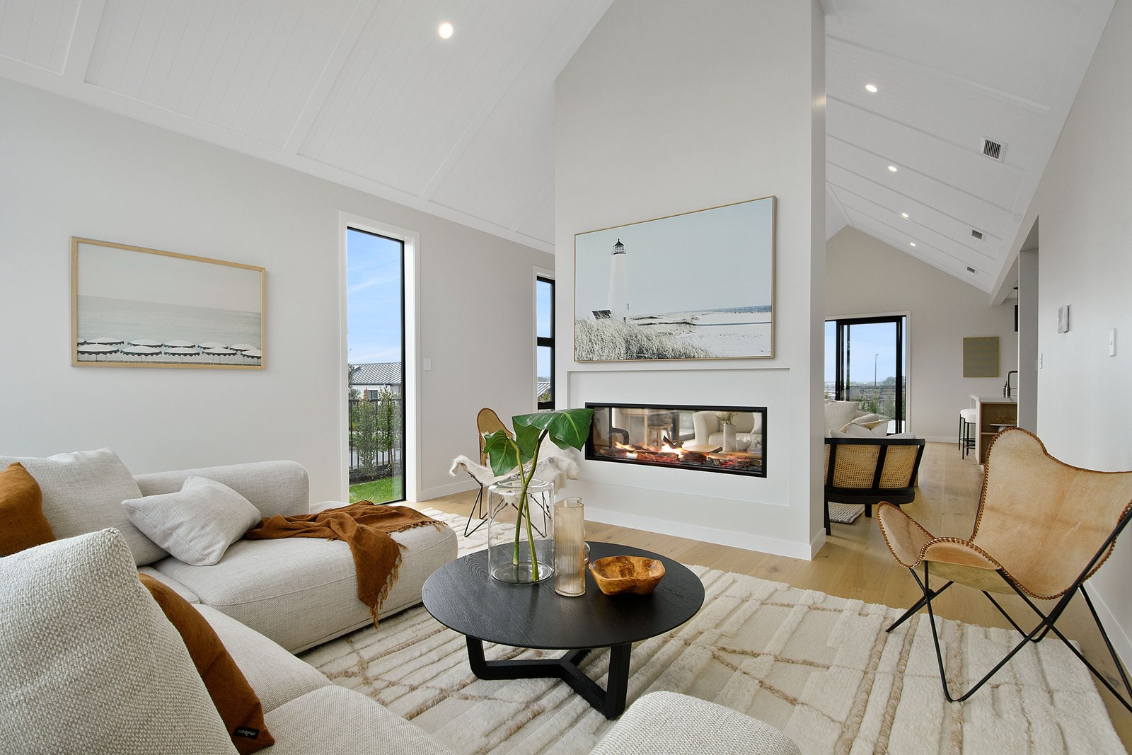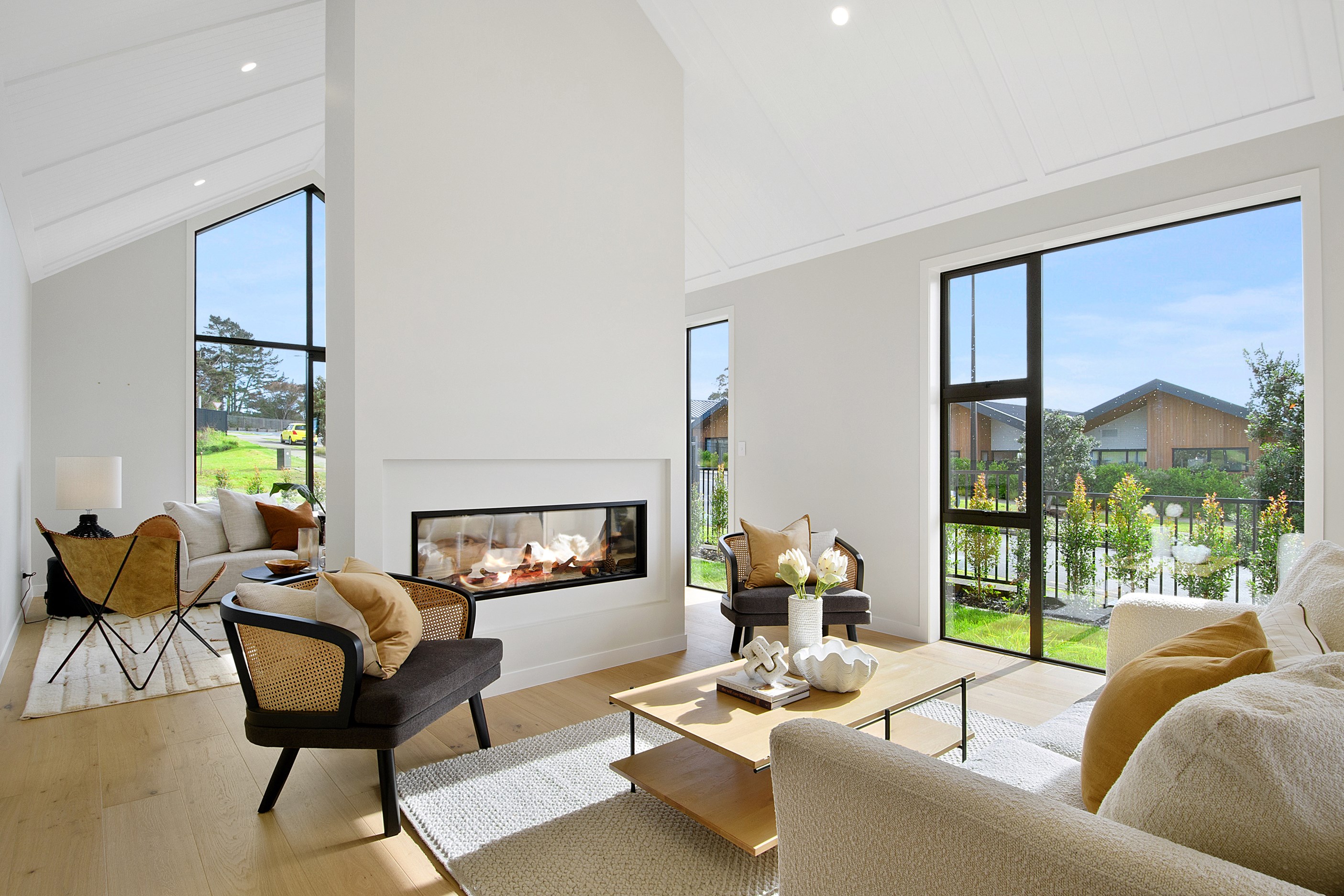 Large, bright, sunny rooms — tick. Indoor/outdoor flow — tick. An impressive fireplace providing a focal point a family can gather beside — tick. A contemporary, airy entertainer’s kitchen — you bet. This Auckland show home is the essence of modern, free-flowing living. The 196sqm home combines contemporary design elements with timeless materials including bricks and cedar weatherboards. Inside, you’ll find a double-sided fireplace between the family and living areas, giving the large, open-plan interior (no poky rooms here), a cosy ambience and providing warmth throughout. Large sliding doors beckon to a deck, merging indoor and outdoor living while showcasing the home’s premium location. The open-plan kitchen fuses functionality and style with a separate scullery/prep area and a bifold window, allowing hosts to interact with guests on the deck while preparing meals. With its three generously sized bedrooms, two well-appointed bathrooms and two living areas, this meticulous home embodies the art of open-plan design. Careful consideration of functionality and flow create an exceptional living space with room for a family to breathe.