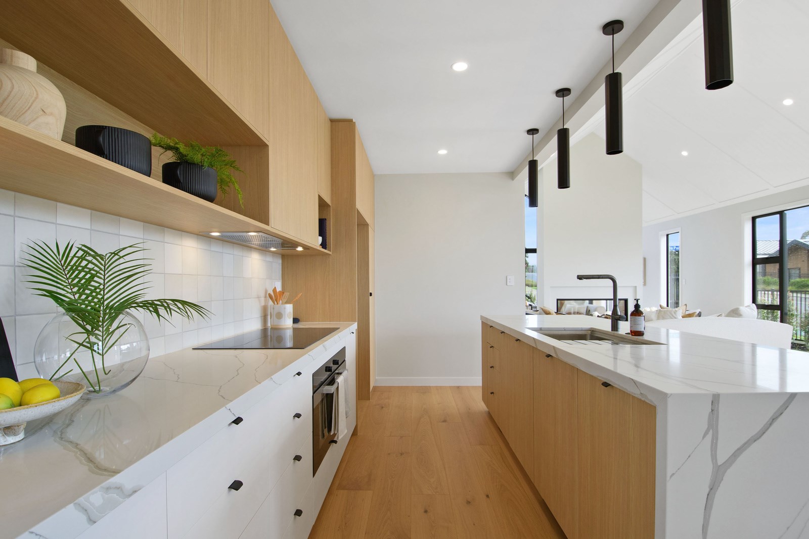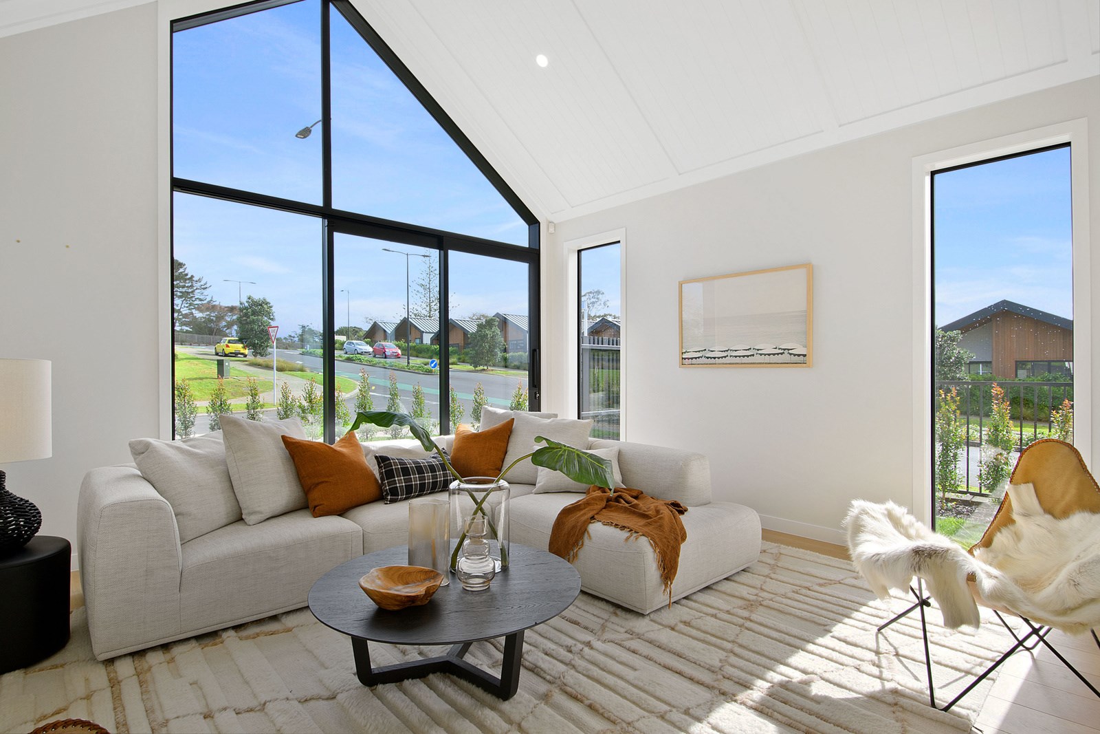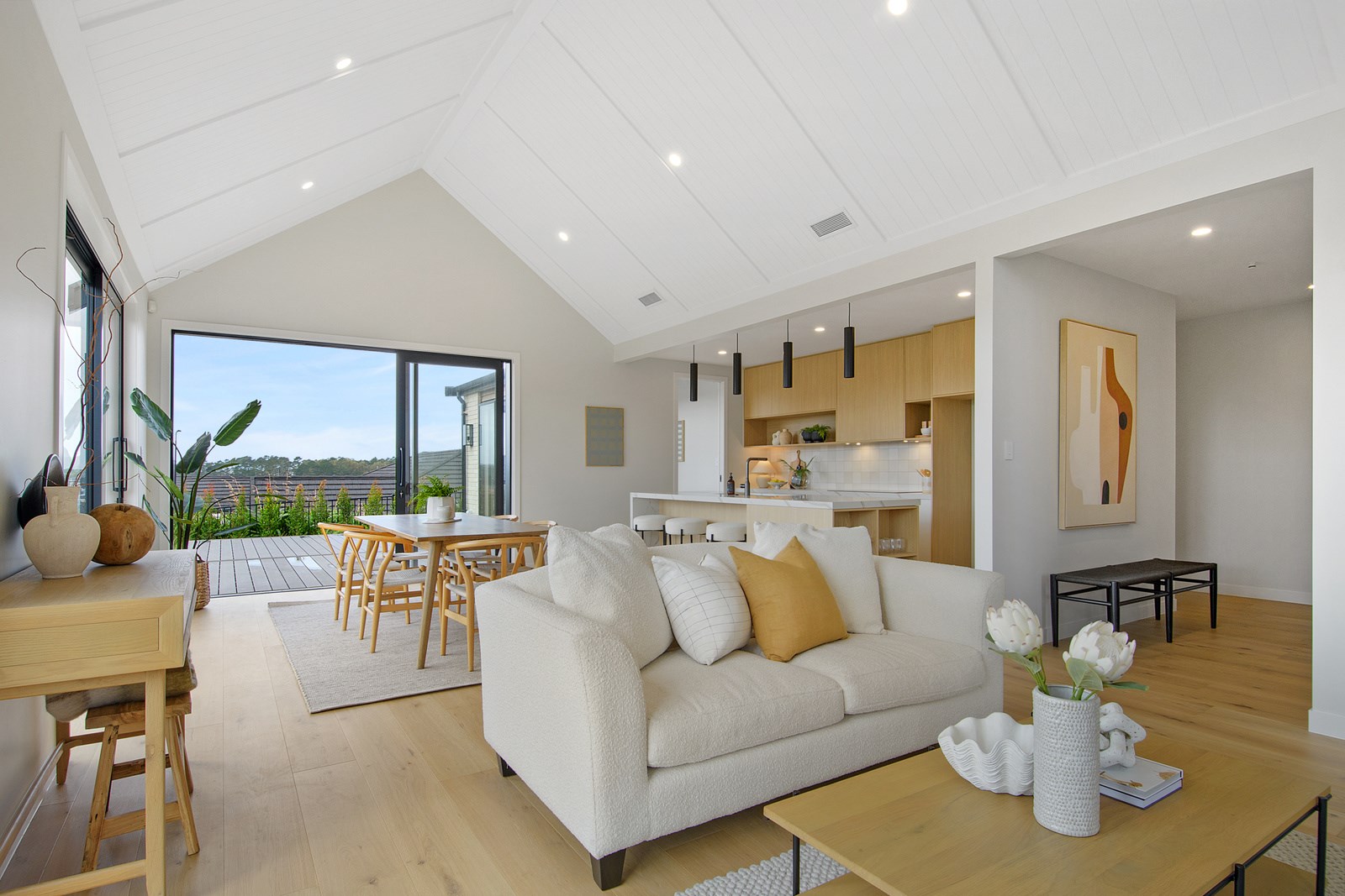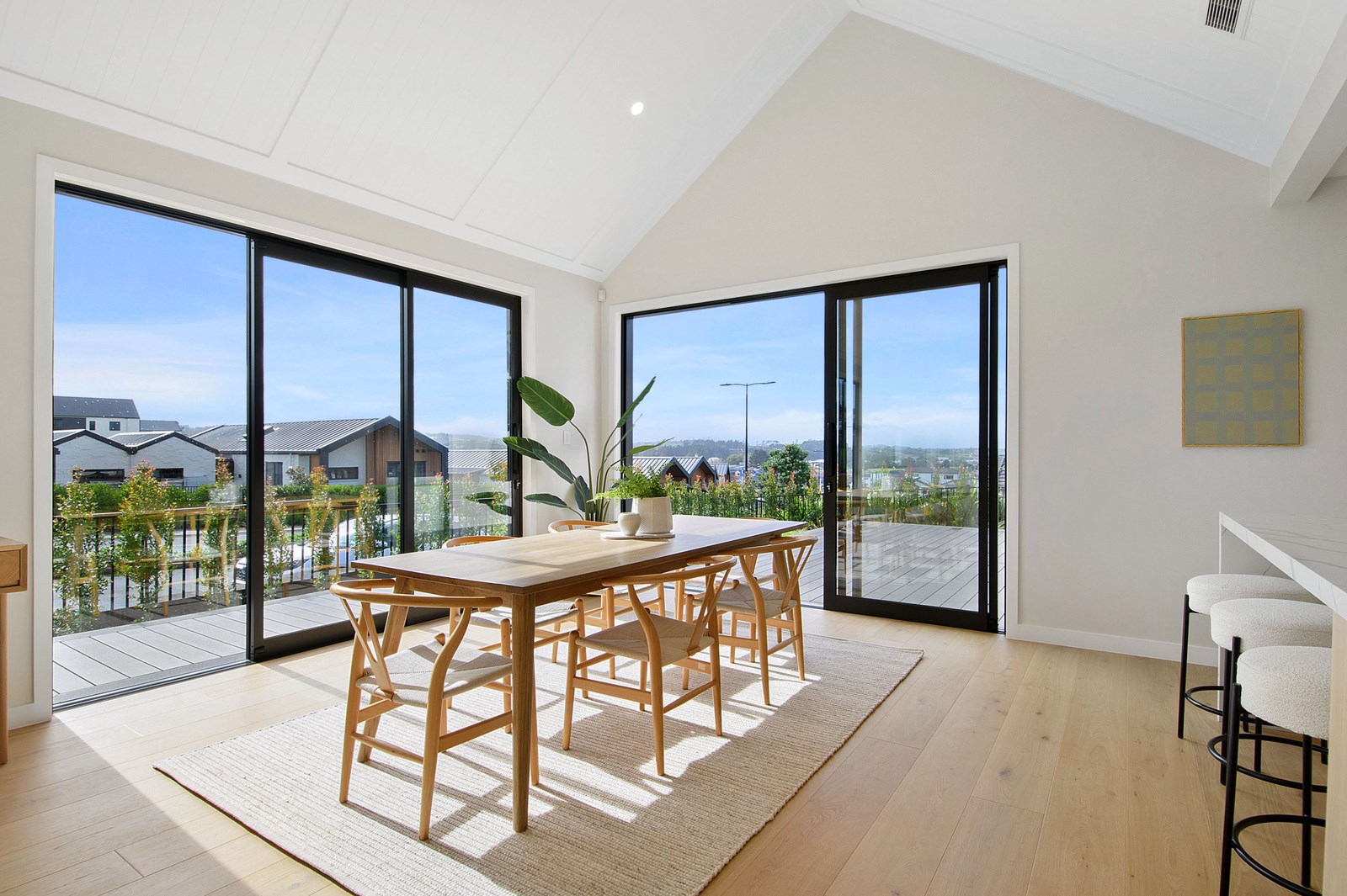 Large, bright, sunny rooms — tick. Indoor/outdoor flow — tick. An impressive fireplace providing a focal point a family can gather beside — tick. A contemporary, airy entertainer’s kitchen — you bet. This Auckland show home is the essence of modern, free-flowing living. The 196sqm home combines contemporary design elements with timeless materials including bricks and cedar weatherboards. Inside, you’ll find a double-sided fireplace between the family and living areas, giving the large, open-plan interior (no poky rooms here), a cosy ambience and providing warmth throughout. Large sliding doors beckon to a deck, merging indoor and outdoor living while showcasing the home’s premium location. The open-plan kitchen fuses functionality and style with a separate scullery/prep area and a bifold window, allowing hosts to interact with guests on the deck while preparing meals. With its three generously sized bedrooms, two well-appointed bathrooms and two living areas, this meticulous home embodies the art of open-plan design. Careful consideration of functionality and flow create an exceptional living space with room for a family to breathe.
