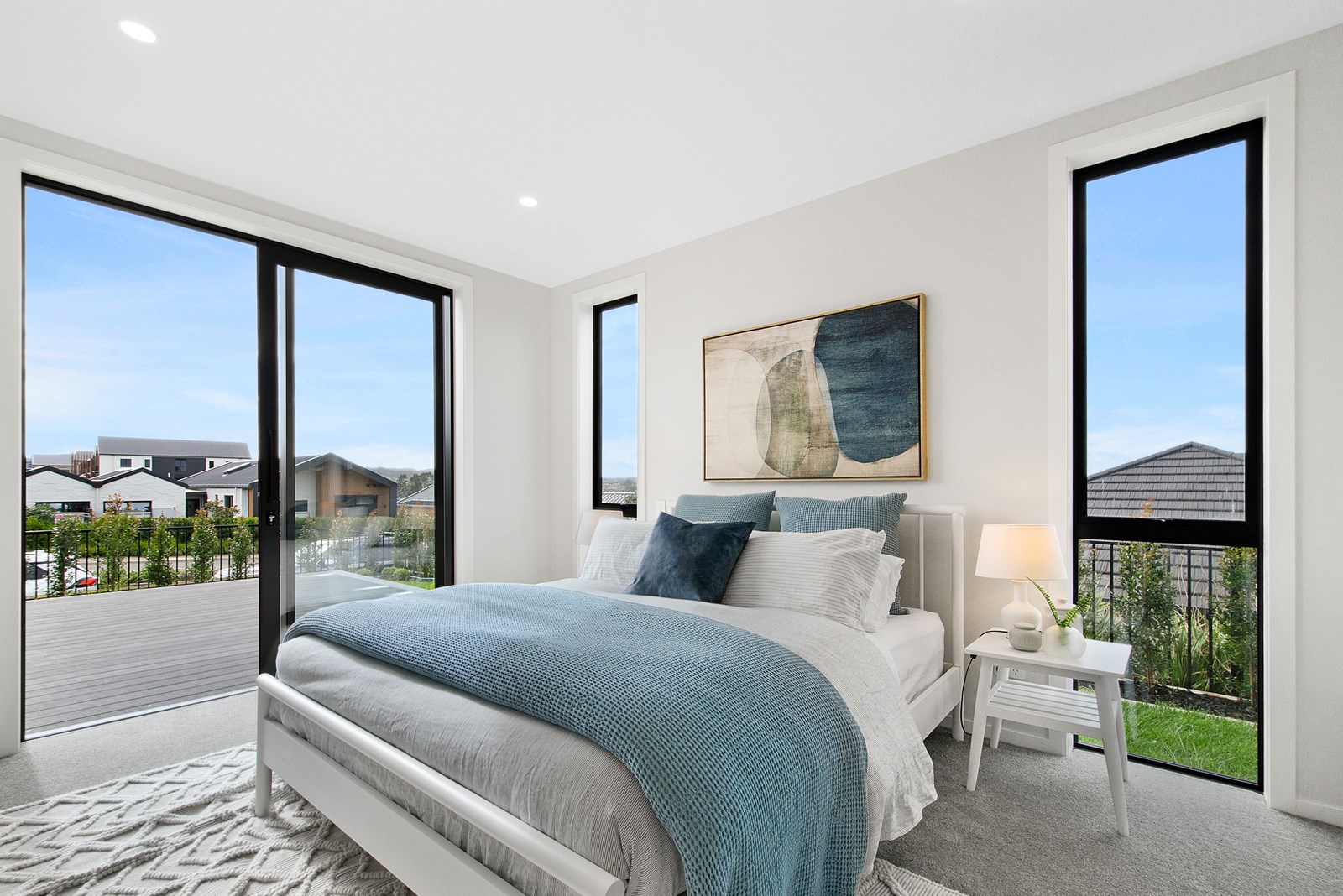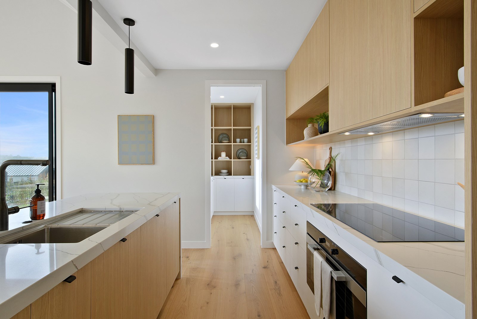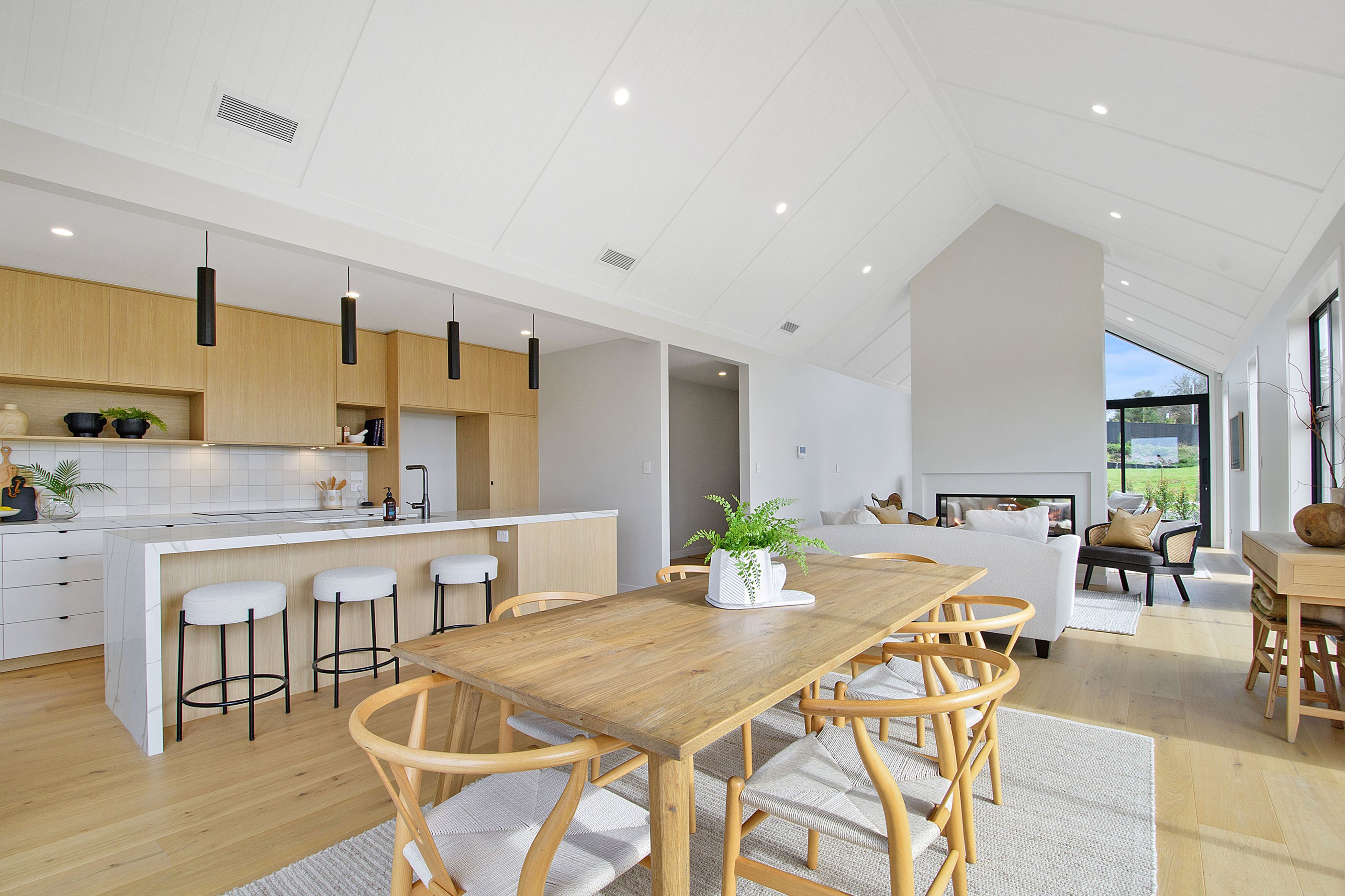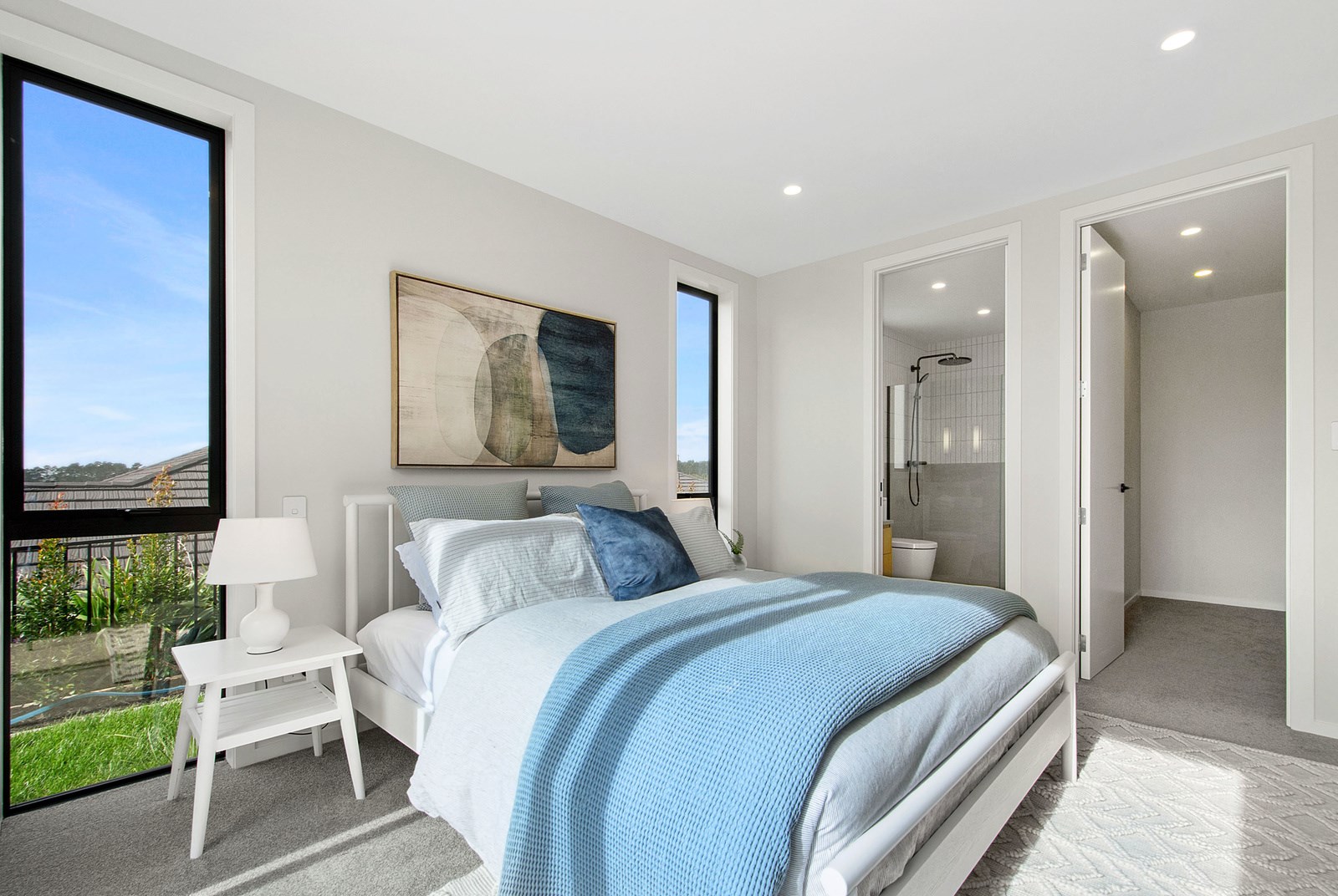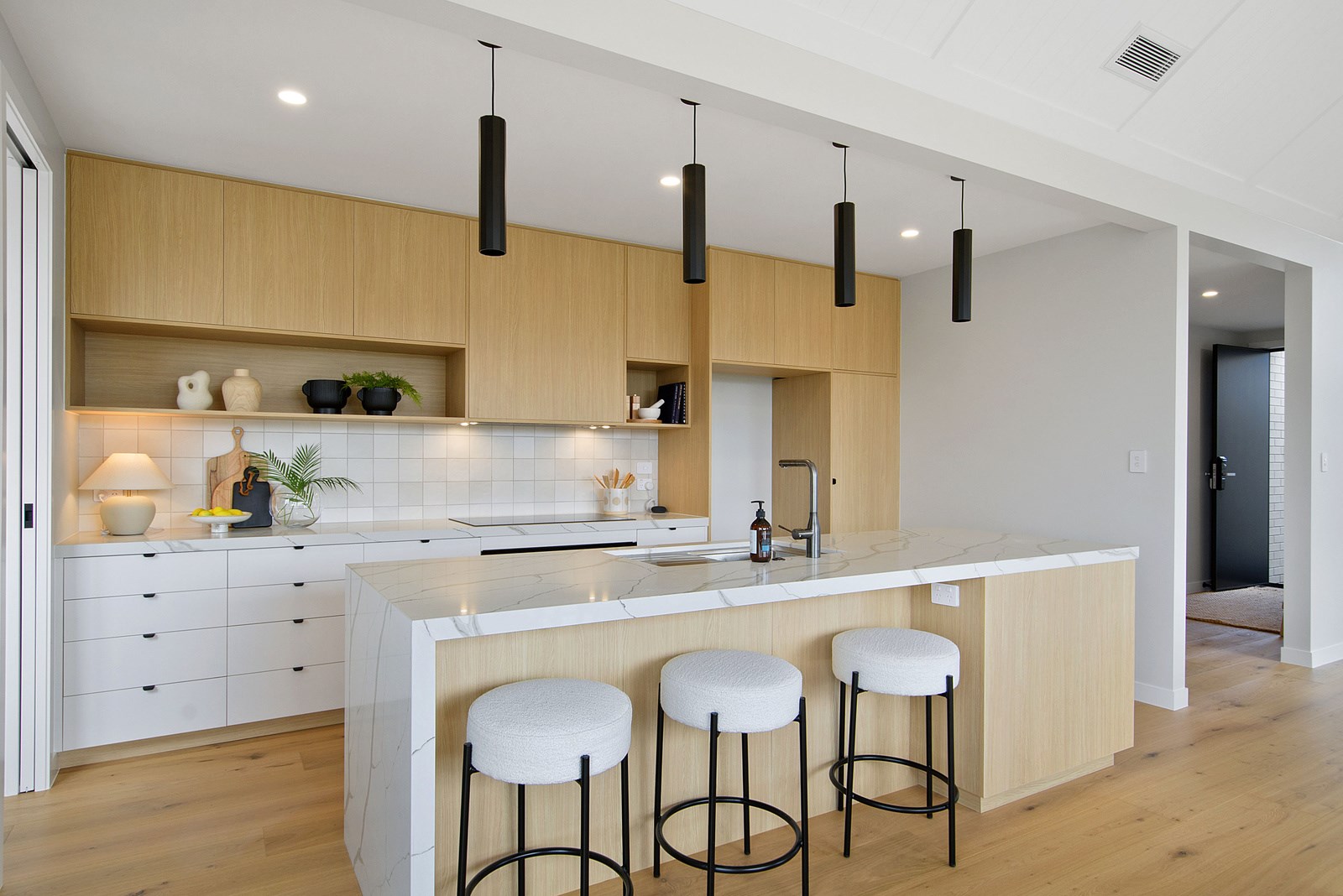 Large, bright, sunny rooms — tick. Indoor/outdoor flow — tick. An impressive fireplace providing a focal point a family can gather beside — tick. A contemporary, airy entertainer’s kitchen — you bet. This Auckland show home is the essence of modern, free-flowing living. The 196sqm home combines contemporary design elements with timeless materials including bricks and cedar weatherboards. Inside, you’ll find a double-sided fireplace between the family and living areas, giving the large, open-plan interior (no poky rooms here), a cosy ambience and providing warmth throughout. Large sliding doors beckon to a deck, merging indoor and outdoor living while showcasing the home’s premium location. The open-plan kitchen fuses functionality and style with a separate scullery/prep area and a bifold window, allowing hosts to interact with guests on the deck while preparing meals. With its three generously sized bedrooms, two well-appointed bathrooms and two living areas, this meticulous home embodies the art of open-plan design. Careful consideration of functionality and flow create an exceptional living space with room for a family to breathe.
