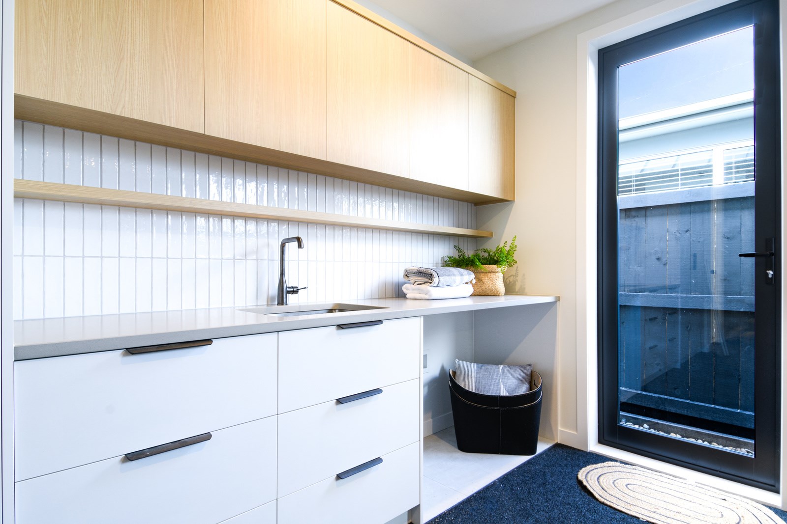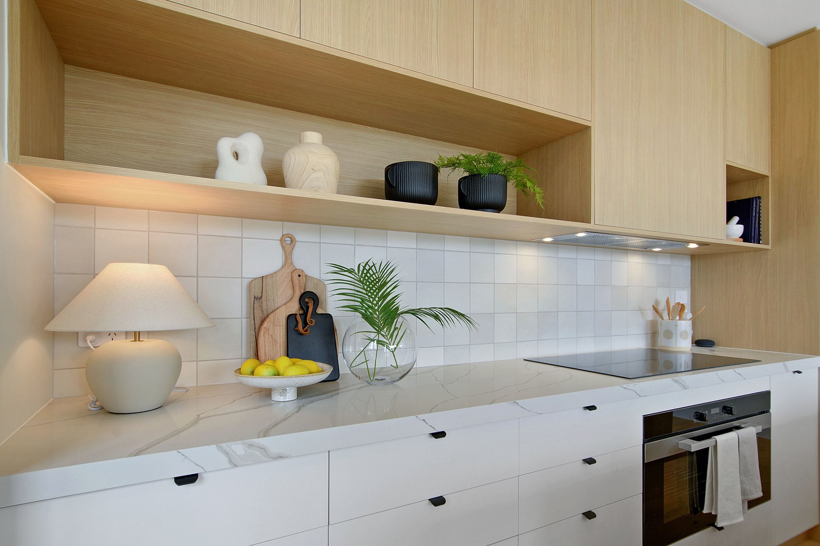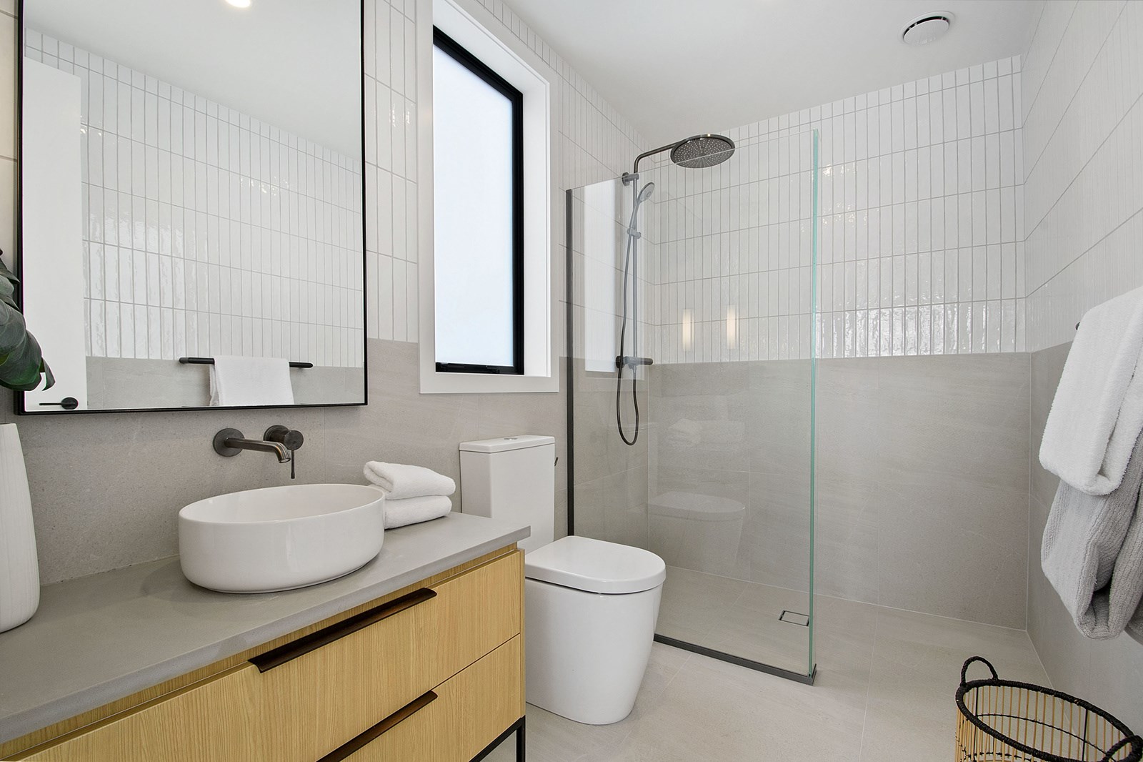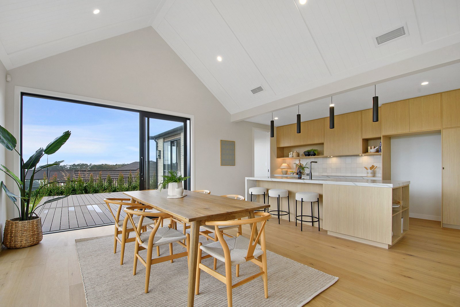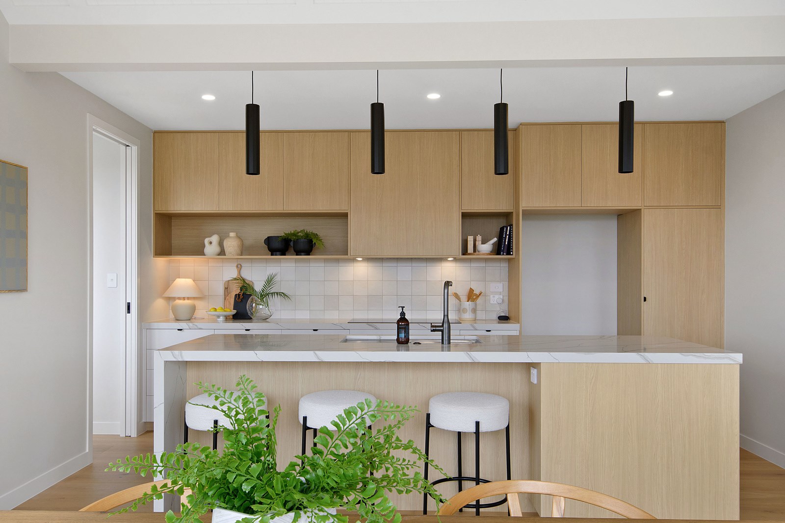 Large, bright, sunny rooms — tick. Indoor/outdoor flow — tick. An impressive fireplace providing a focal point a family can gather beside — tick. A contemporary, airy entertainer’s kitchen — you bet. This Auckland show home is the essence of modern, free-flowing living. The 196sqm home combines contemporary design elements with timeless materials including bricks and cedar weatherboards. Inside, you’ll find a double-sided fireplace between the family and living areas, giving the large, open-plan interior (no poky rooms here), a cosy ambience and providing warmth throughout. Large sliding doors beckon to a deck, merging indoor and outdoor living while showcasing the home’s premium location. The open-plan kitchen fuses functionality and style with a separate scullery/prep area and a bifold window, allowing hosts to interact with guests on the deck while preparing meals. With its three generously sized bedrooms, two well-appointed bathrooms and two living areas, this meticulous home embodies the art of open-plan design. Careful consideration of functionality and flow create an exceptional living space with room for a family to breathe.