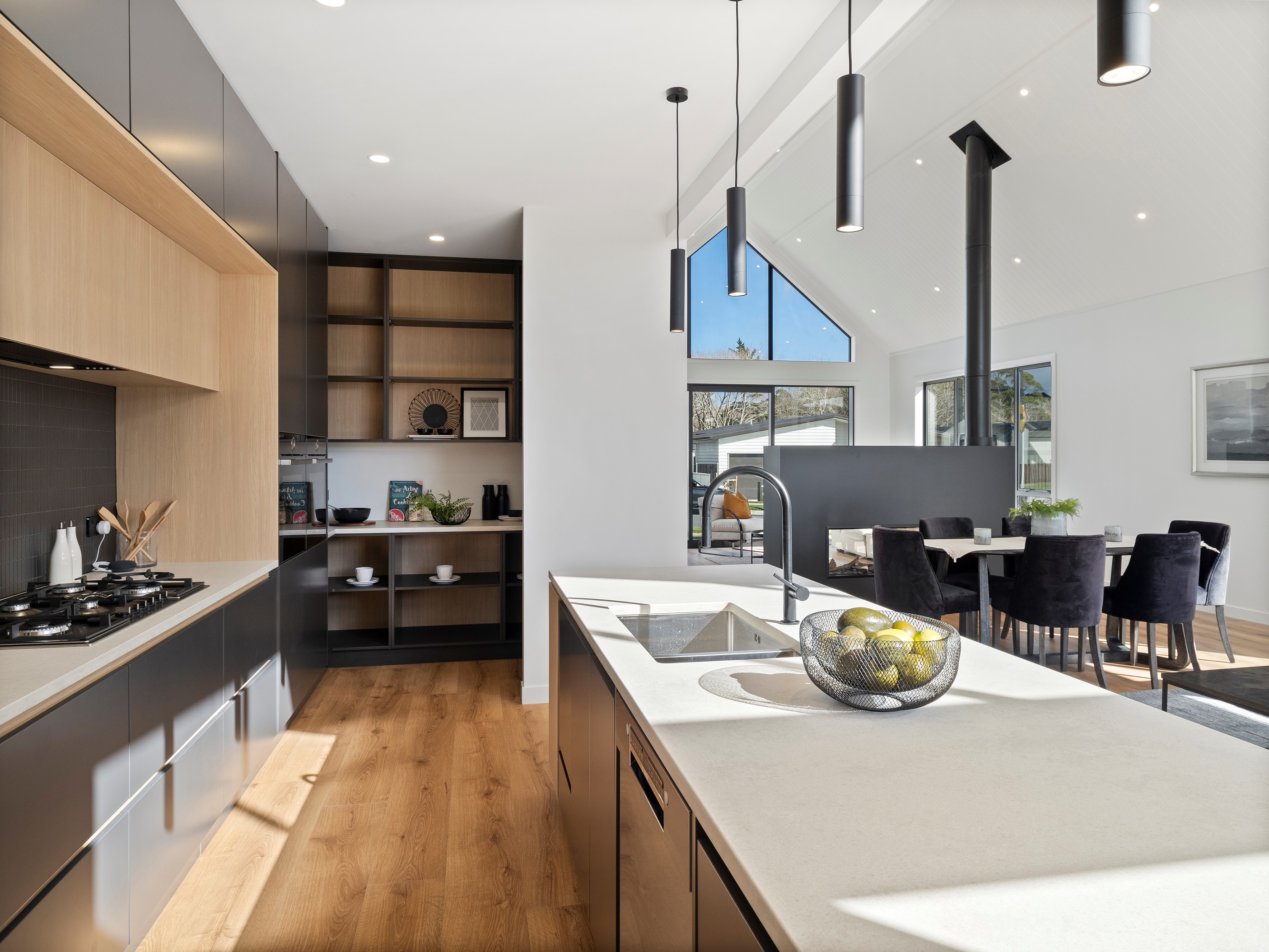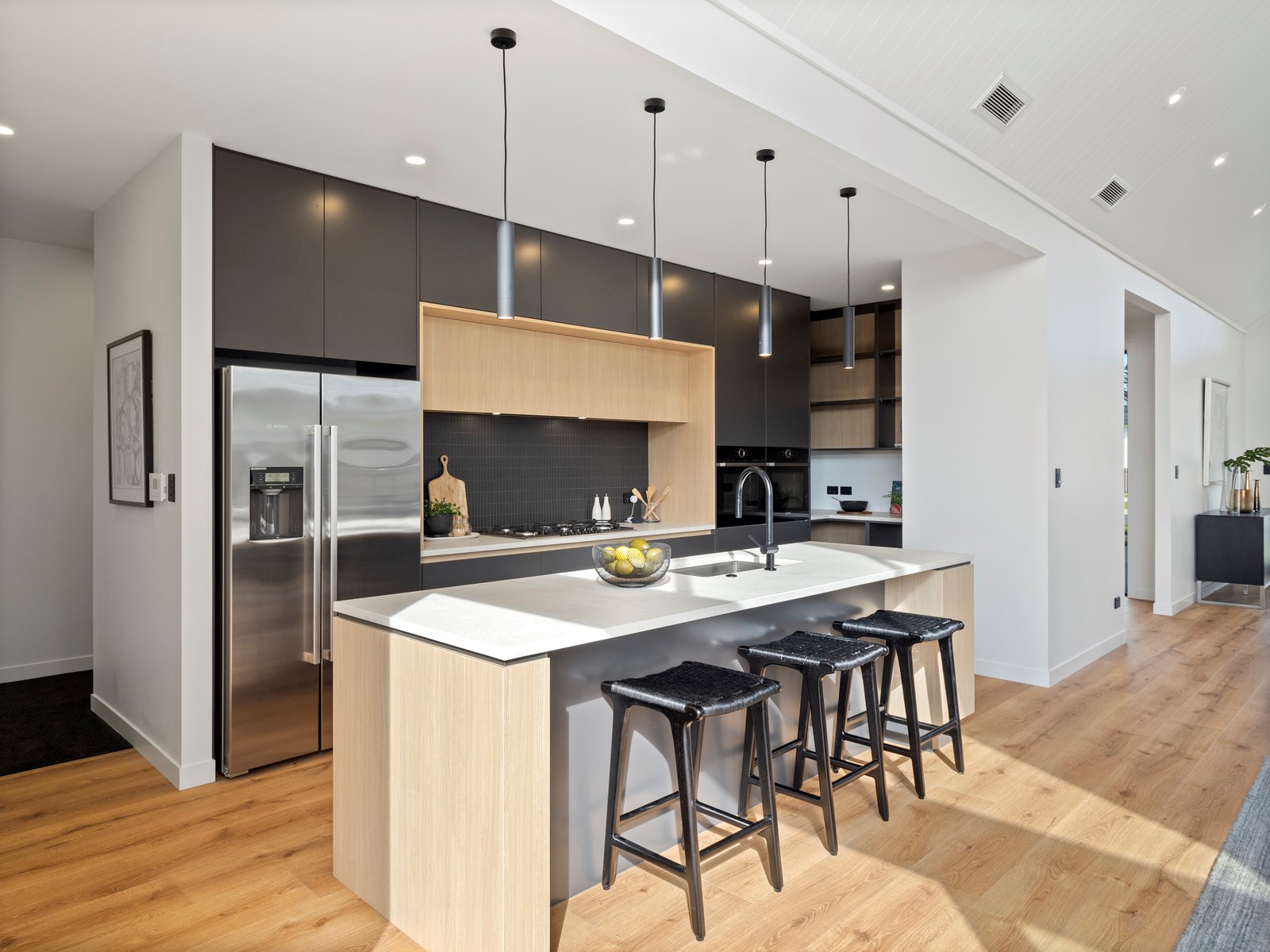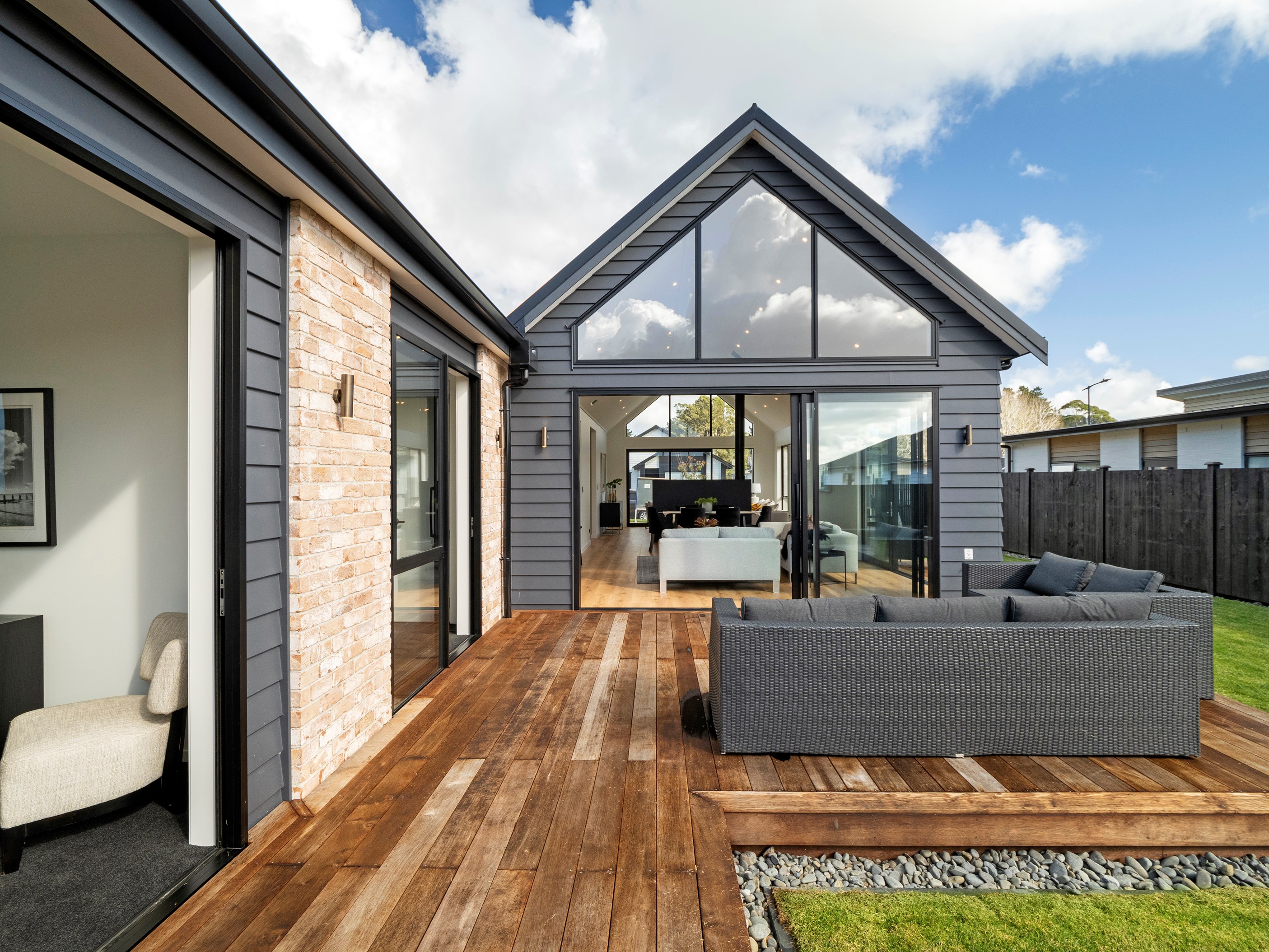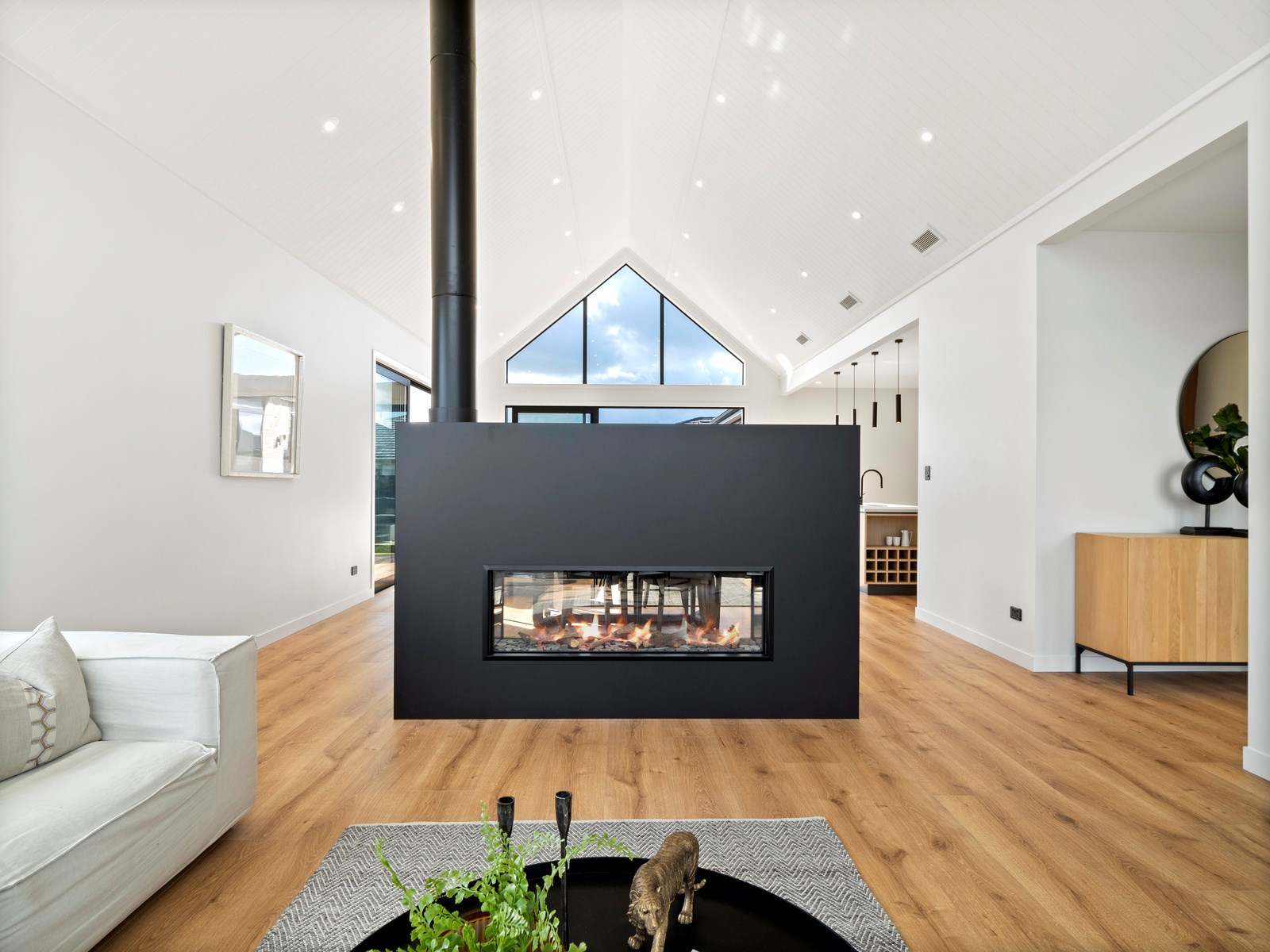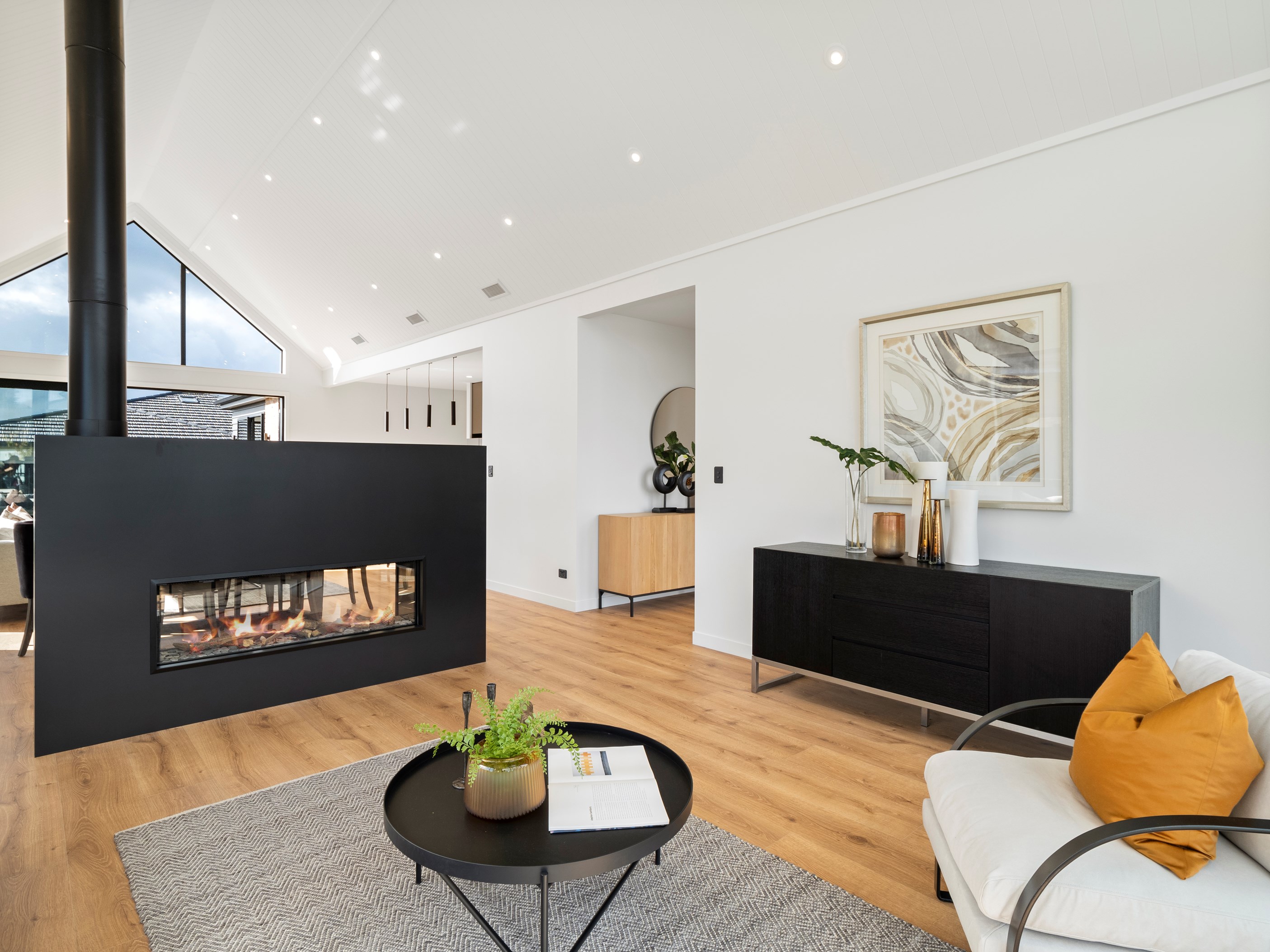 With four bedrooms, two bathrooms and natural light aplenty, this innovative design has made the most of its 213sqm space. Twin gabled forms, clad in reclaimed brick and dark Linea weatherboard, ensure this home is modern, chic, and set to leave a lasting impression. Inside, the living area is cleverly designed to create separate living zones with a large double-sided fireplace dividing the lounge and dining room. In the kitchen the design really gets cooking. A palette of blonde wood and dark cabinetry looks slick and smart, while a six-hob gas-fired oven is designed for family living. There’s a handy scullery to keep clutter at bay and a breakfast bar which makes feeding the kids a breeze. Stylish pendants and downlights in the lounge and kitchen keep these living spaces light and bright, as do clerestory windows and large sliding doors that lead to the deck area and a low-maintenance garden. The main bedroom is a sanctuary at the rear of the house, with a generous walk-in wardrobe and large ensuite with dark statement tiles and a walk-in shower. The main bathroom features those same dashing tiles, a freestanding bath and an LED-illuminated mirror. This home has everything you could need — and more.