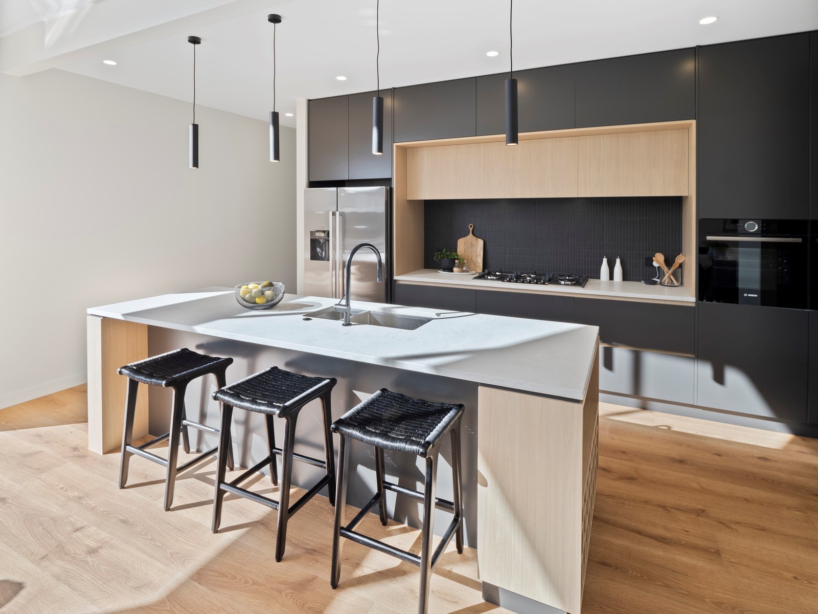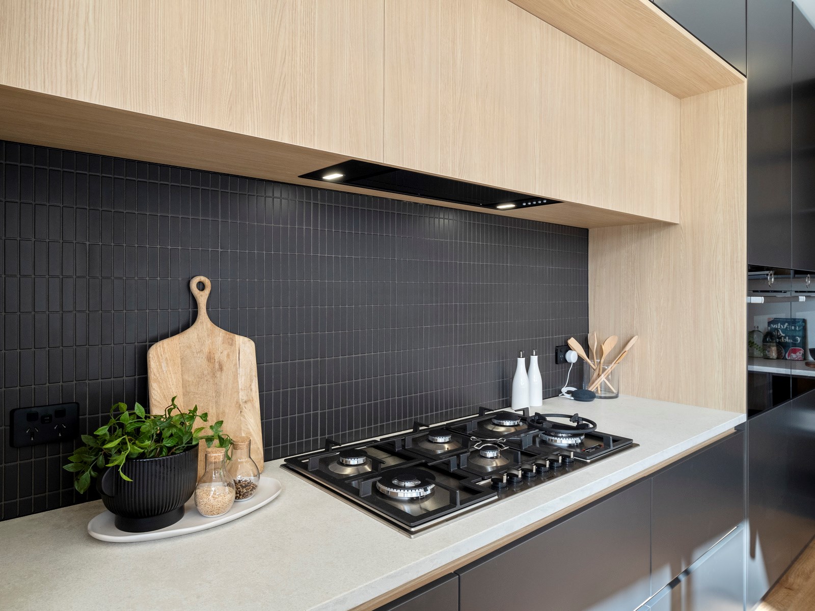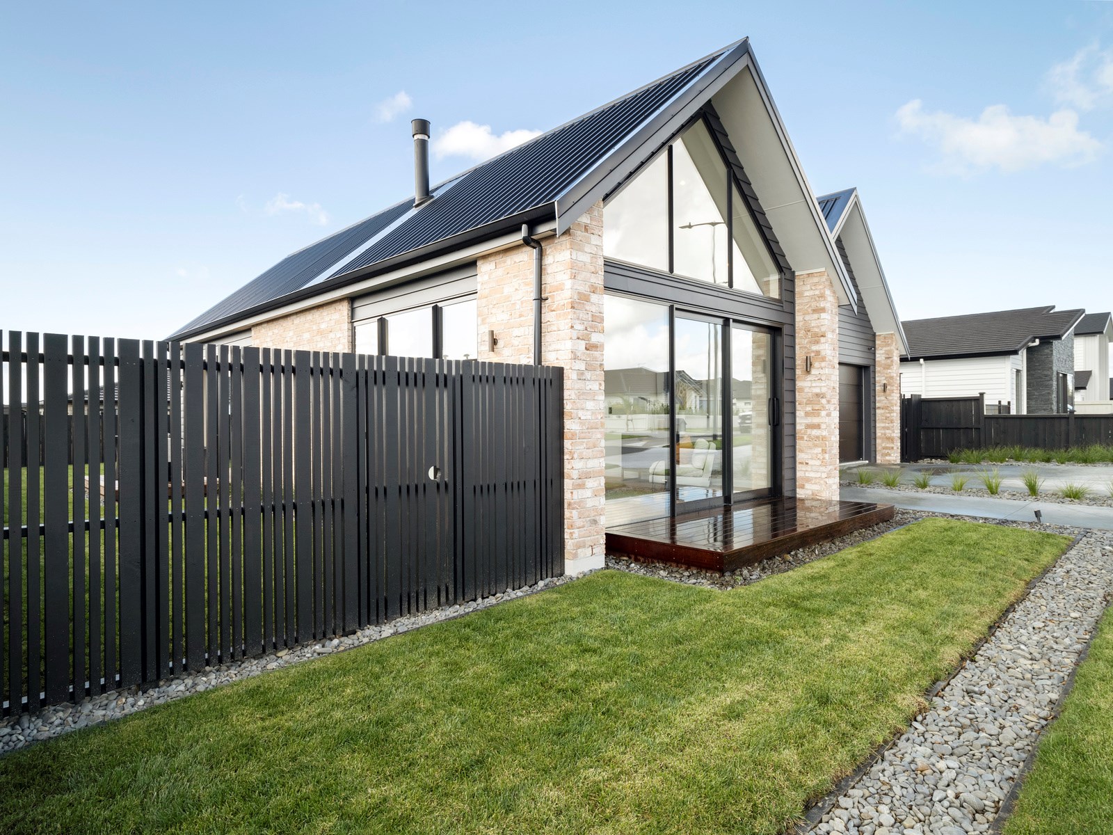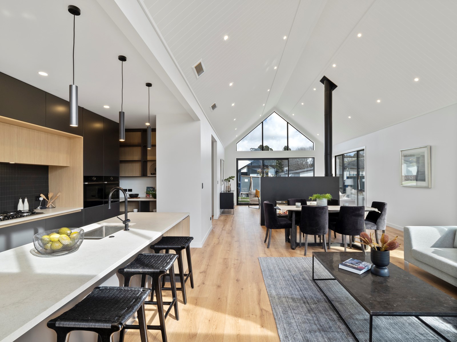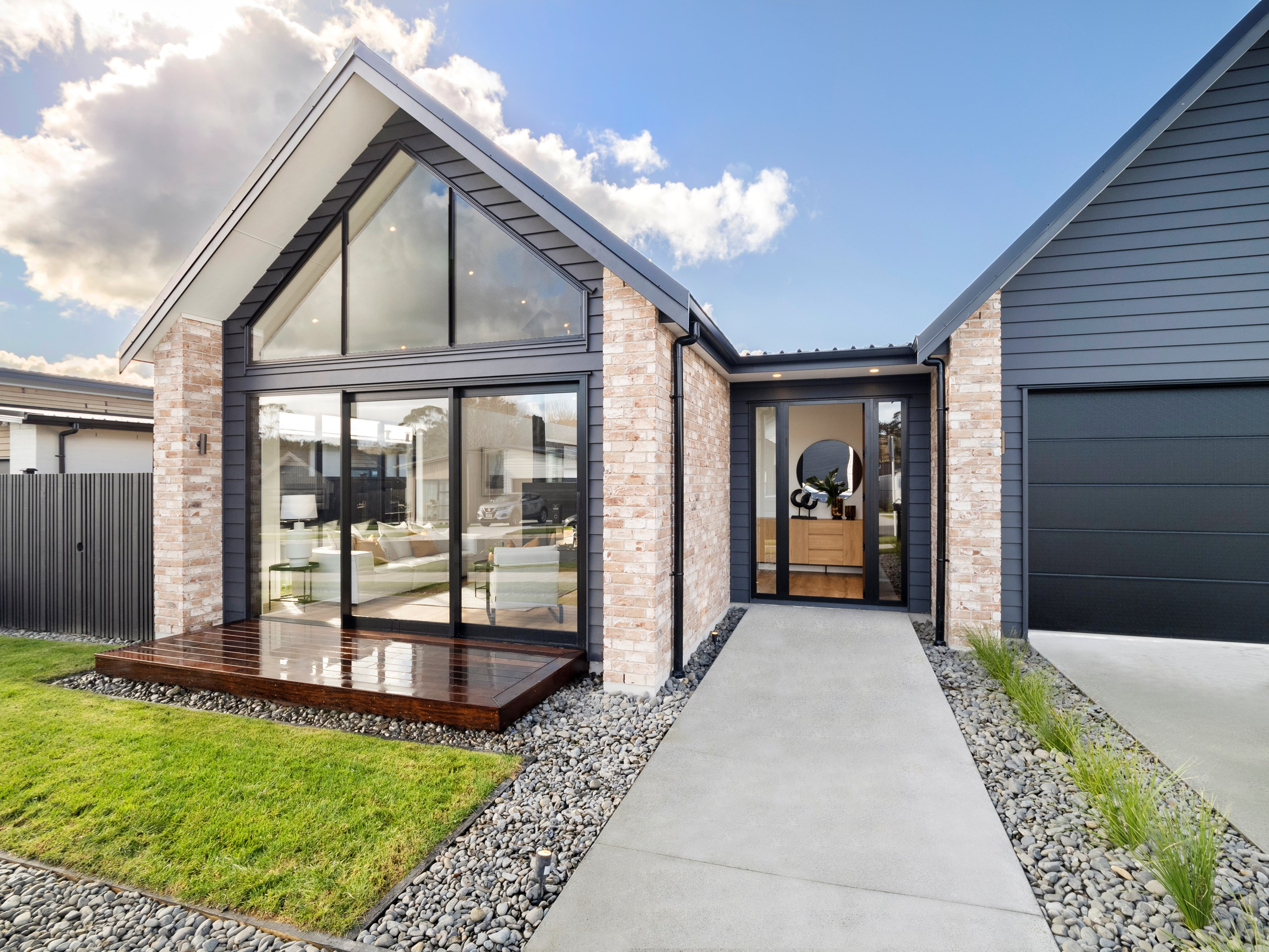 With four bedrooms, two bathrooms and natural light aplenty, this innovative design has made the most of its 213sqm space. Twin gabled forms, clad in reclaimed brick and dark Linea weatherboard, ensure this home is modern, chic, and set to leave a lasting impression. Inside, the living area is cleverly designed to create separate living zones with a large double-sided fireplace dividing the lounge and dining room. In the kitchen the design really gets cooking. A palette of blonde wood and dark cabinetry looks slick and smart, while a six-hob gas-fired oven is designed for family living. There’s a handy scullery to keep clutter at bay and a breakfast bar which makes feeding the kids a breeze. Stylish pendants and downlights in the lounge and kitchen keep these living spaces light and bright, as do clerestory windows and large sliding doors that lead to the deck area and a low-maintenance garden. The main bedroom is a sanctuary at the rear of the house, with a generous walk-in wardrobe and large ensuite with dark statement tiles and a walk-in shower. The main bathroom features those same dashing tiles, a freestanding bath and an LED-illuminated mirror. This home has everything you could need — and more.
