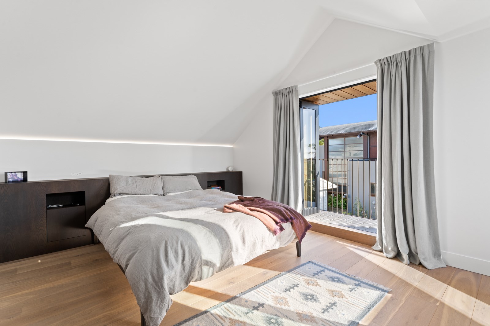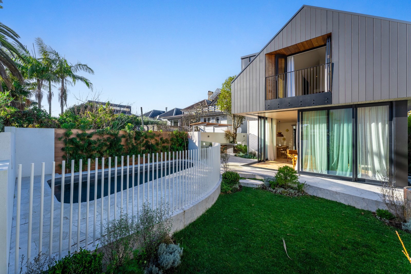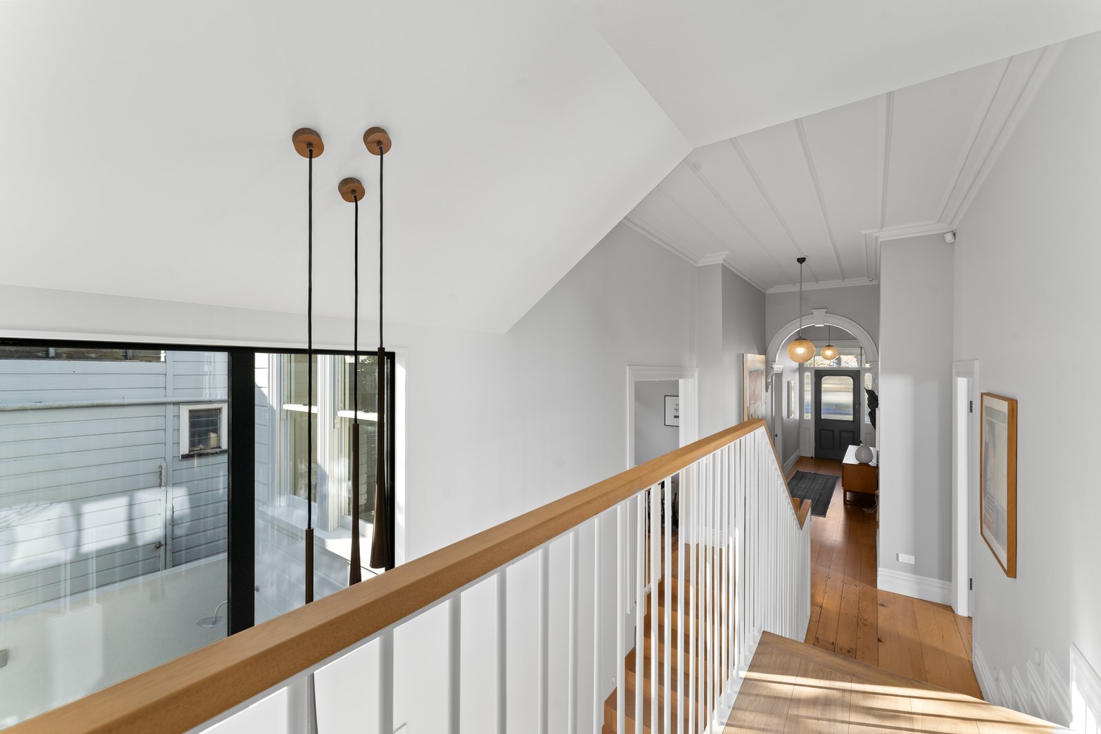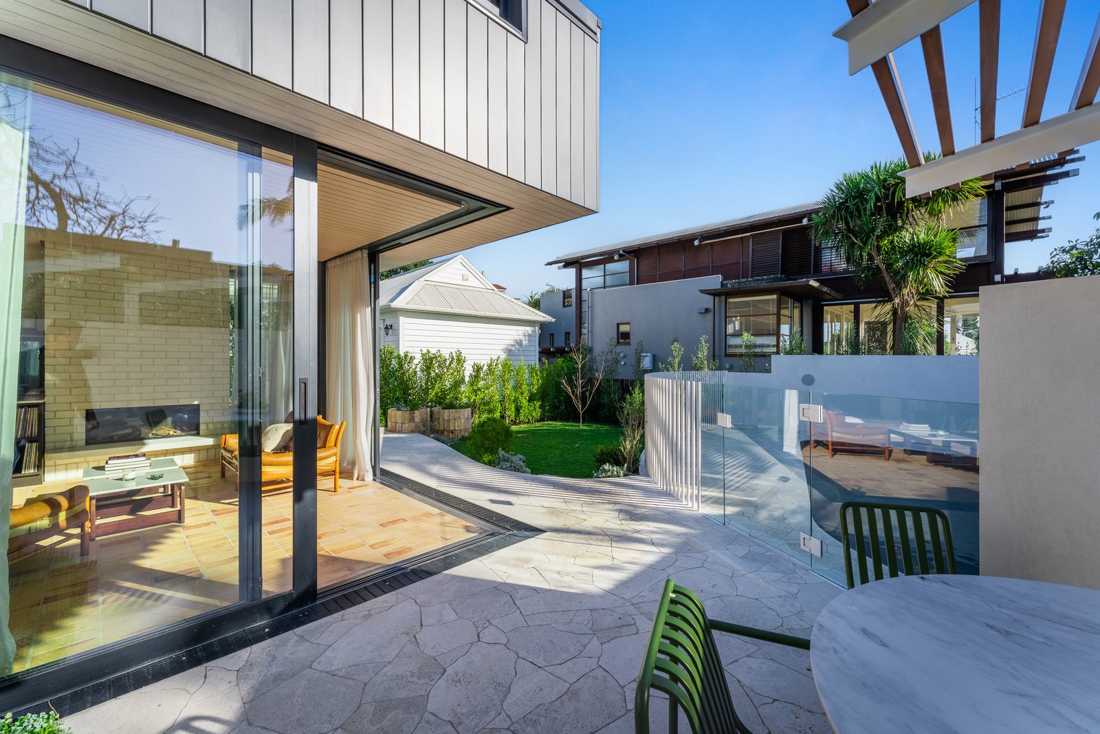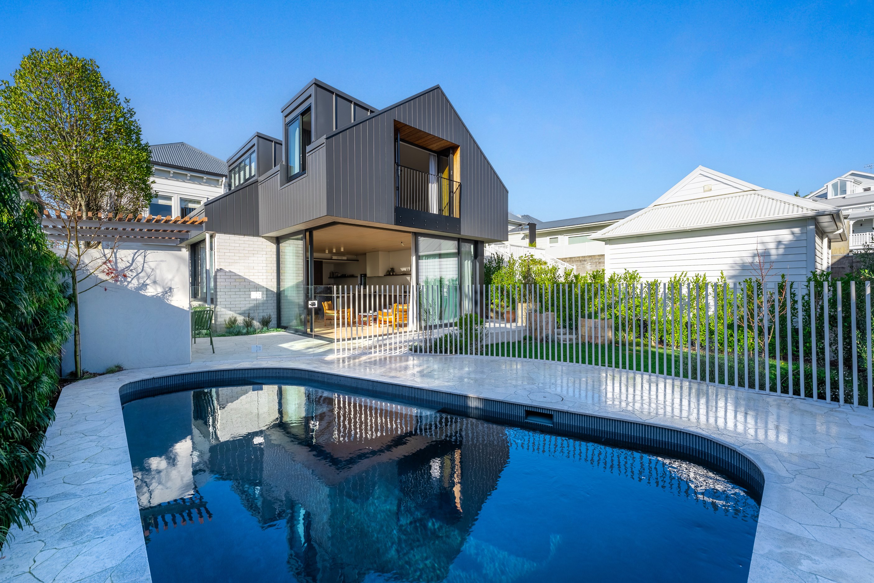 Updating a Victorian villa in a Special Character area requires careful handling. This single-storey heritage home has close neighbours and it was important that, street-side, it was in keeping with the rest of the road. The homeowners wanted a more contemporary look inside, and better access to the outdoor space at the rear. The street-side elevation has been restored, with one side of the raised garden transformed into a basement garage. A flush garage door matches the white timber exterior. Inside, the original house now contains three bedrooms, a study, bathroom and lounge, while the new build at the rear has a very modern feel. Take the short flight of stairs down to the kitchen and living area, built using recycled brick and kauri from the original home, but with a modern twist. The brick floor pairs well with the dark aesthetic of the kitchen, and the living area opens to the outdoors through corner sliding doors, with easy access to a paved patio, pool and garden. A new stairway connects the two-storey addition — a main bedroom with access to a private balcony. The walk-in wardrobe and tiled ensuite are surprisingly roomy, with a glass arch leading to a fully tiled shower. This house, historic at the front, has plenty going on at the back.