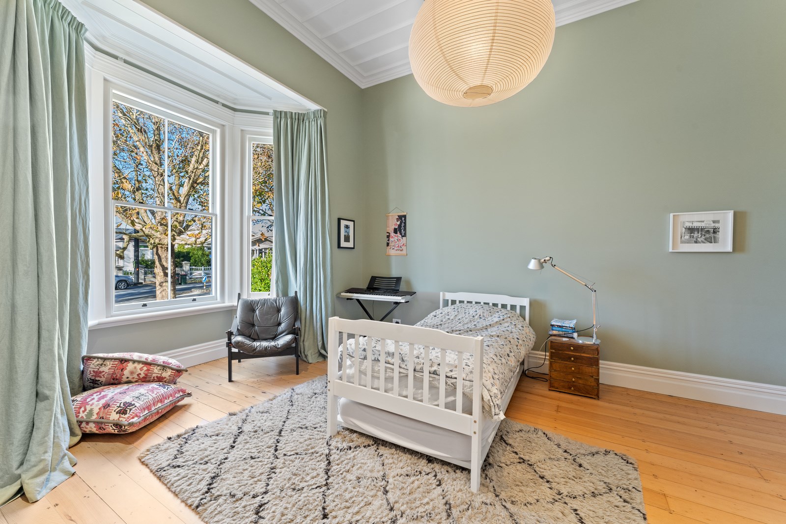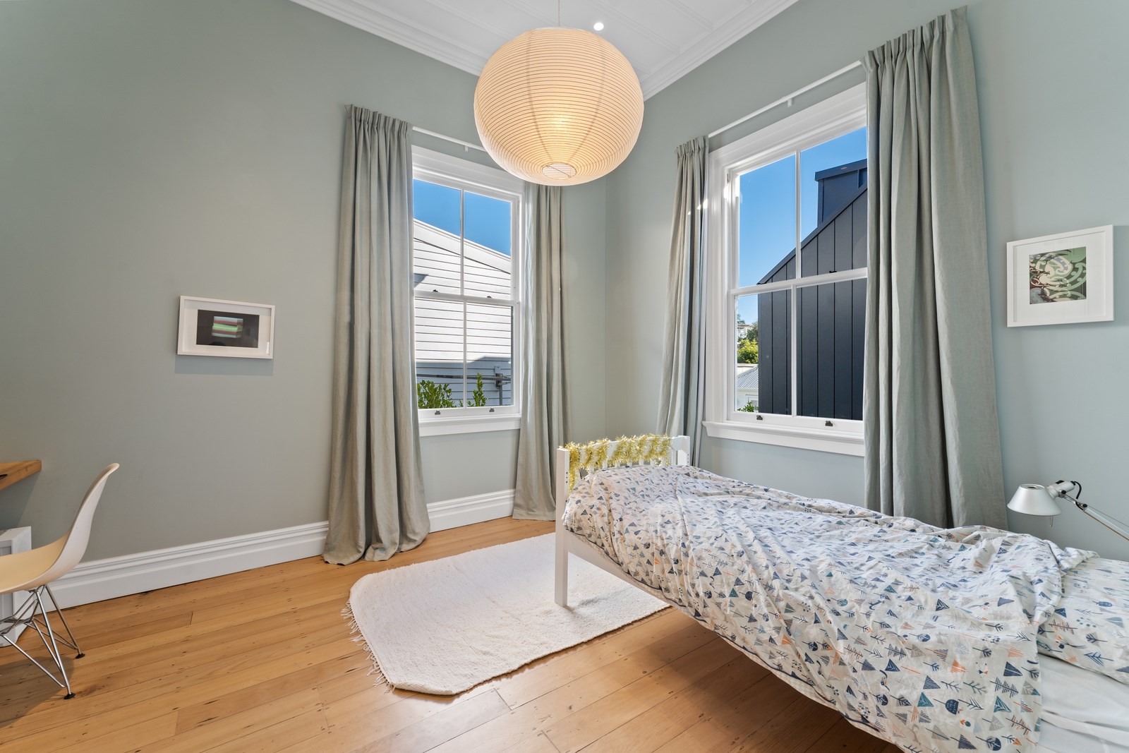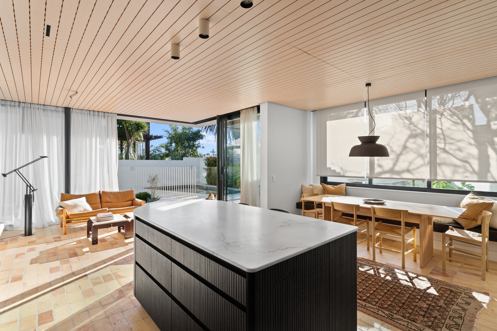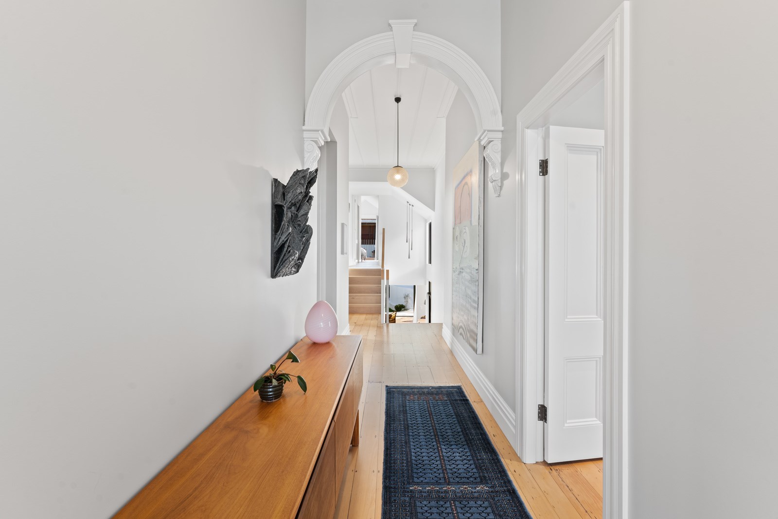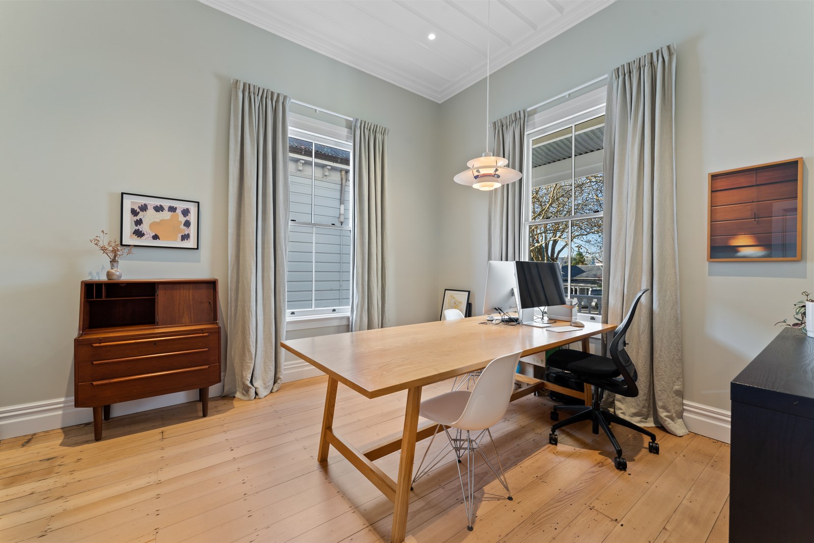 Updating a Victorian villa in a Special Character area requires careful handling. This single-storey heritage home has close neighbours and it was important that, street-side, it was in keeping with the rest of the road. The homeowners wanted a more contemporary look inside, and better access to the outdoor space at the rear. The street-side elevation has been restored, with one side of the raised garden transformed into a basement garage. A flush garage door matches the white timber exterior. Inside, the original house now contains three bedrooms, a study, bathroom and lounge, while the new build at the rear has a very modern feel. Take the short flight of stairs down to the kitchen and living area, built using recycled brick and kauri from the original home, but with a modern twist. The brick floor pairs well with the dark aesthetic of the kitchen, and the living area opens to the outdoors through corner sliding doors, with easy access to a paved patio, pool and garden. A new stairway connects the two-storey addition — a main bedroom with access to a private balcony. The walk-in wardrobe and tiled ensuite are surprisingly roomy, with a glass arch leading to a fully tiled shower. This house, historic at the front, has plenty going on at the back.