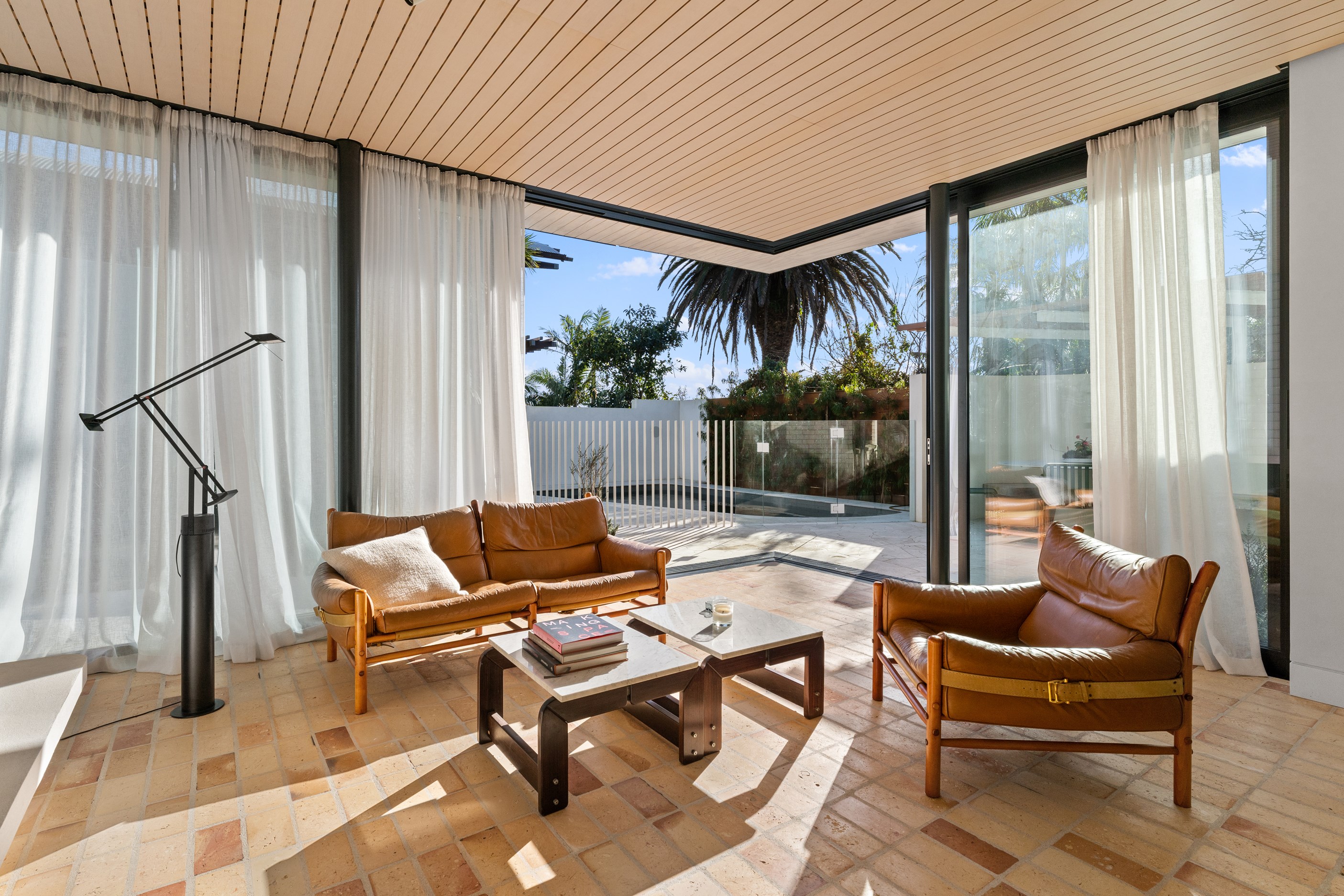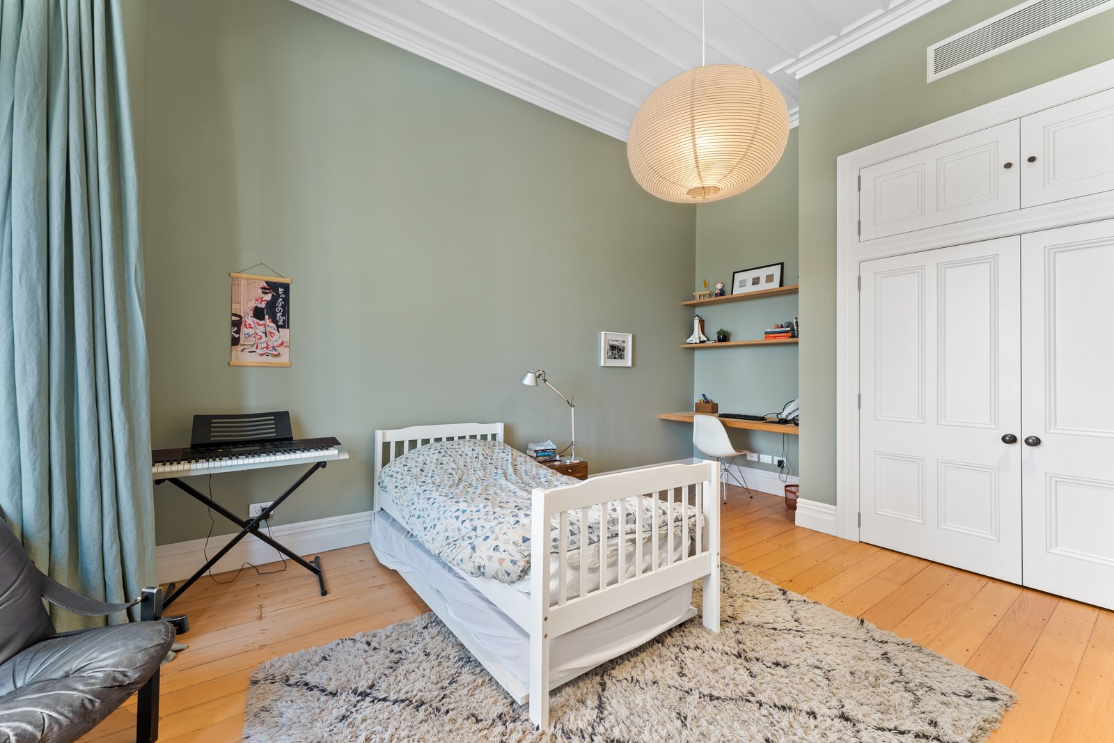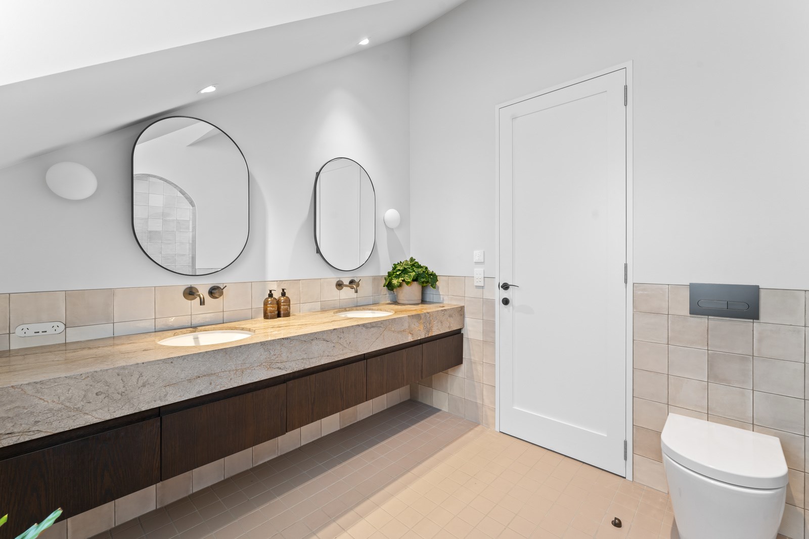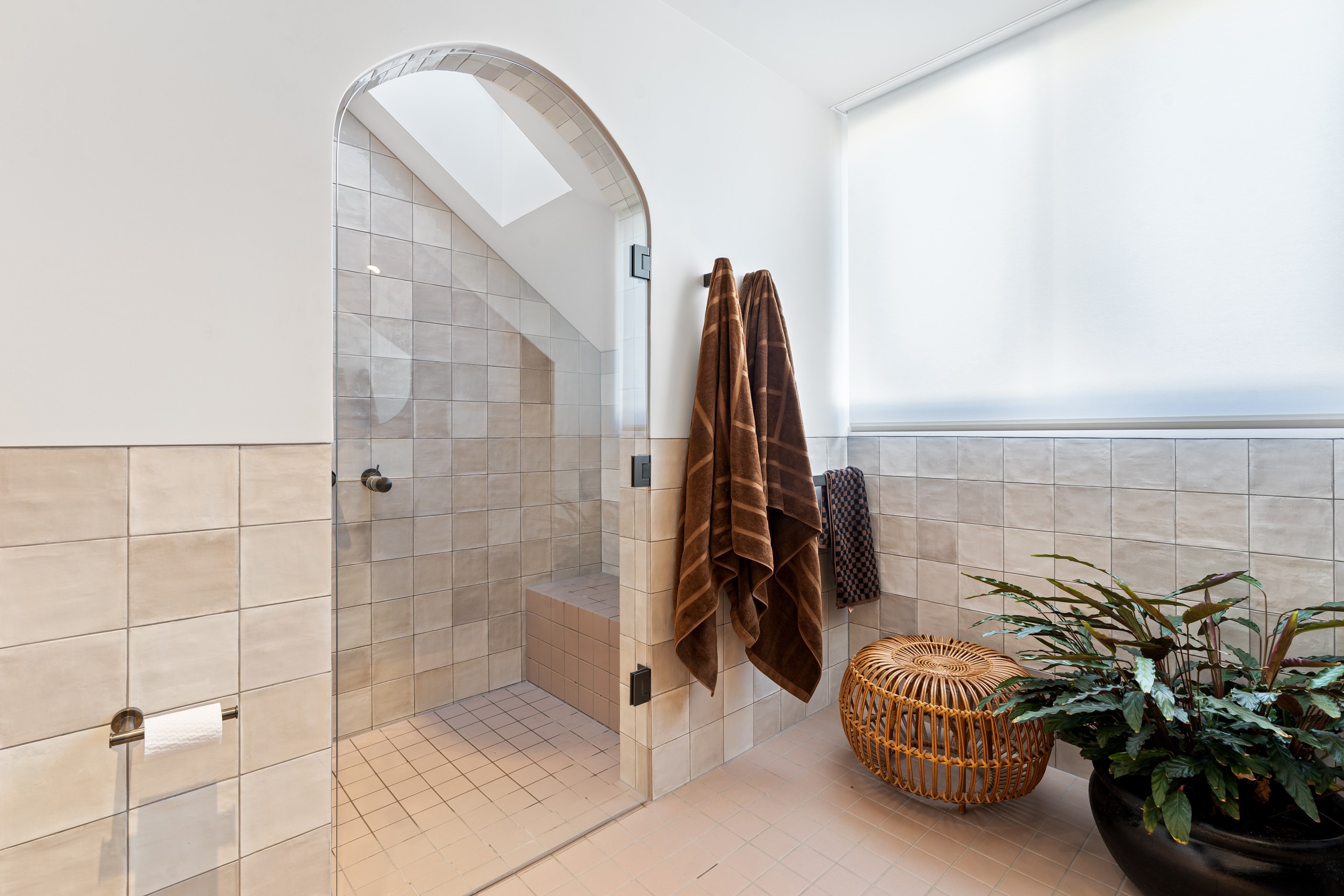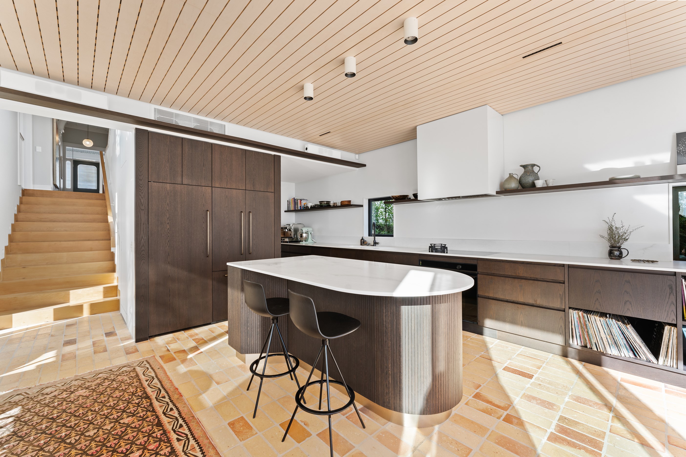 Updating a Victorian villa in a Special Character area requires careful handling. This single-storey heritage home has close neighbours and it was important that, street-side, it was in keeping with the rest of the road. The homeowners wanted a more contemporary look inside, and better access to the outdoor space at the rear. The street-side elevation has been restored, with one side of the raised garden transformed into a basement garage. A flush garage door matches the white timber exterior. Inside, the original house now contains three bedrooms, a study, bathroom and lounge, while the new build at the rear has a very modern feel. Take the short flight of stairs down to the kitchen and living area, built using recycled brick and kauri from the original home, but with a modern twist. The brick floor pairs well with the dark aesthetic of the kitchen, and the living area opens to the outdoors through corner sliding doors, with easy access to a paved patio, pool and garden. A new stairway connects the two-storey addition — a main bedroom with access to a private balcony. The walk-in wardrobe and tiled ensuite are surprisingly roomy, with a glass arch leading to a fully tiled shower. This house, historic at the front, has plenty going on at the back.