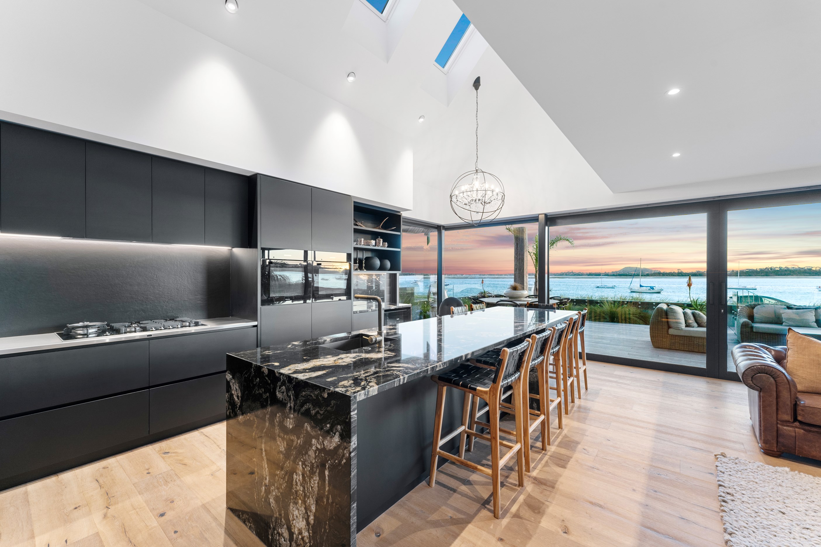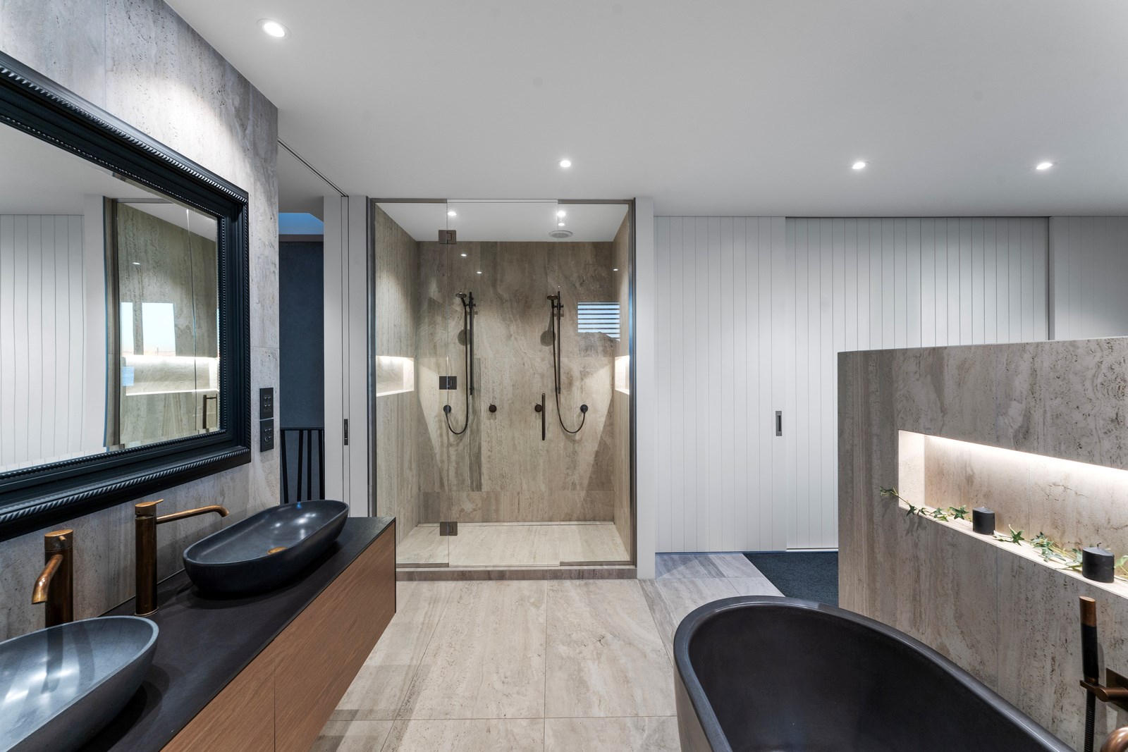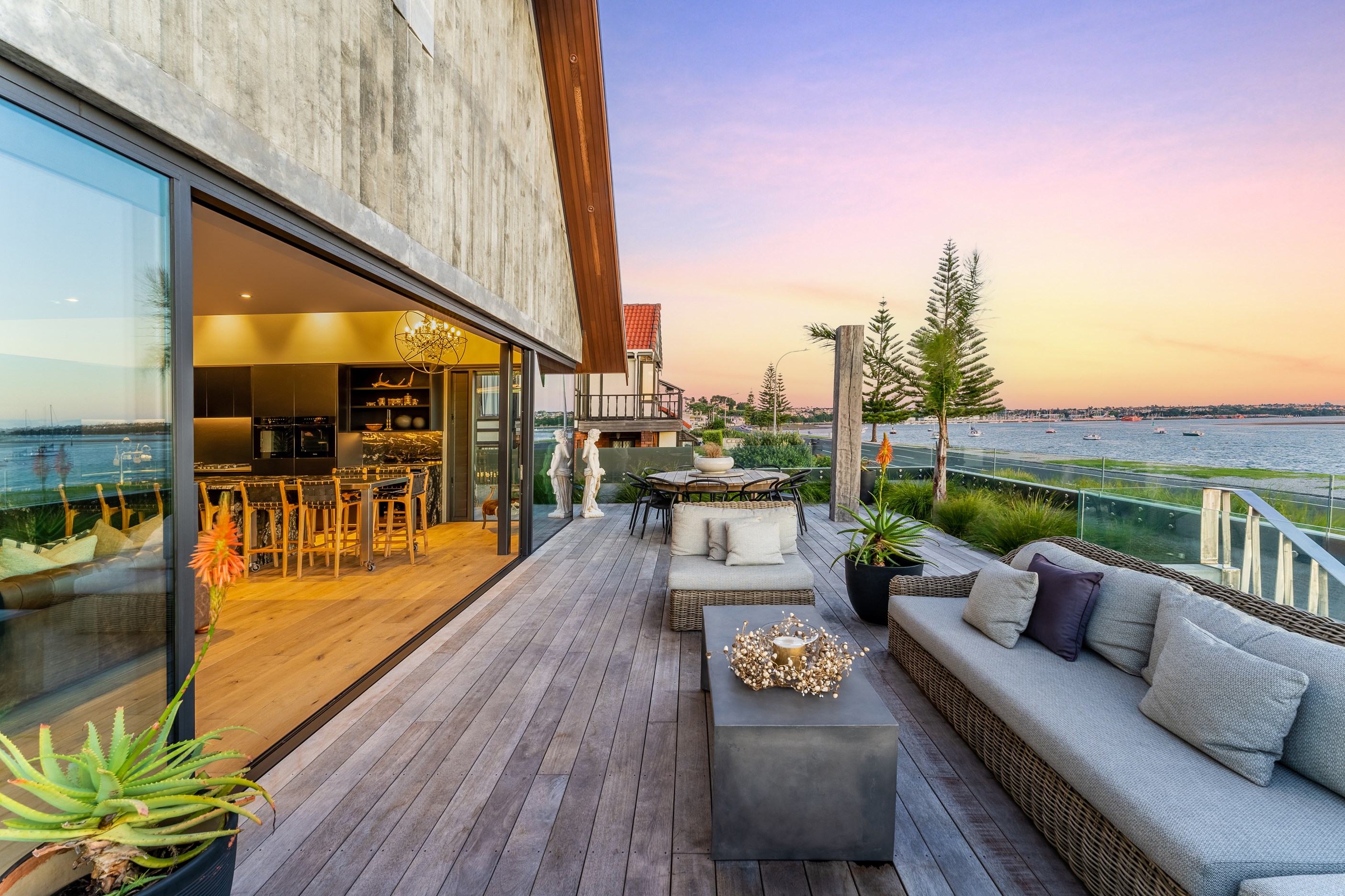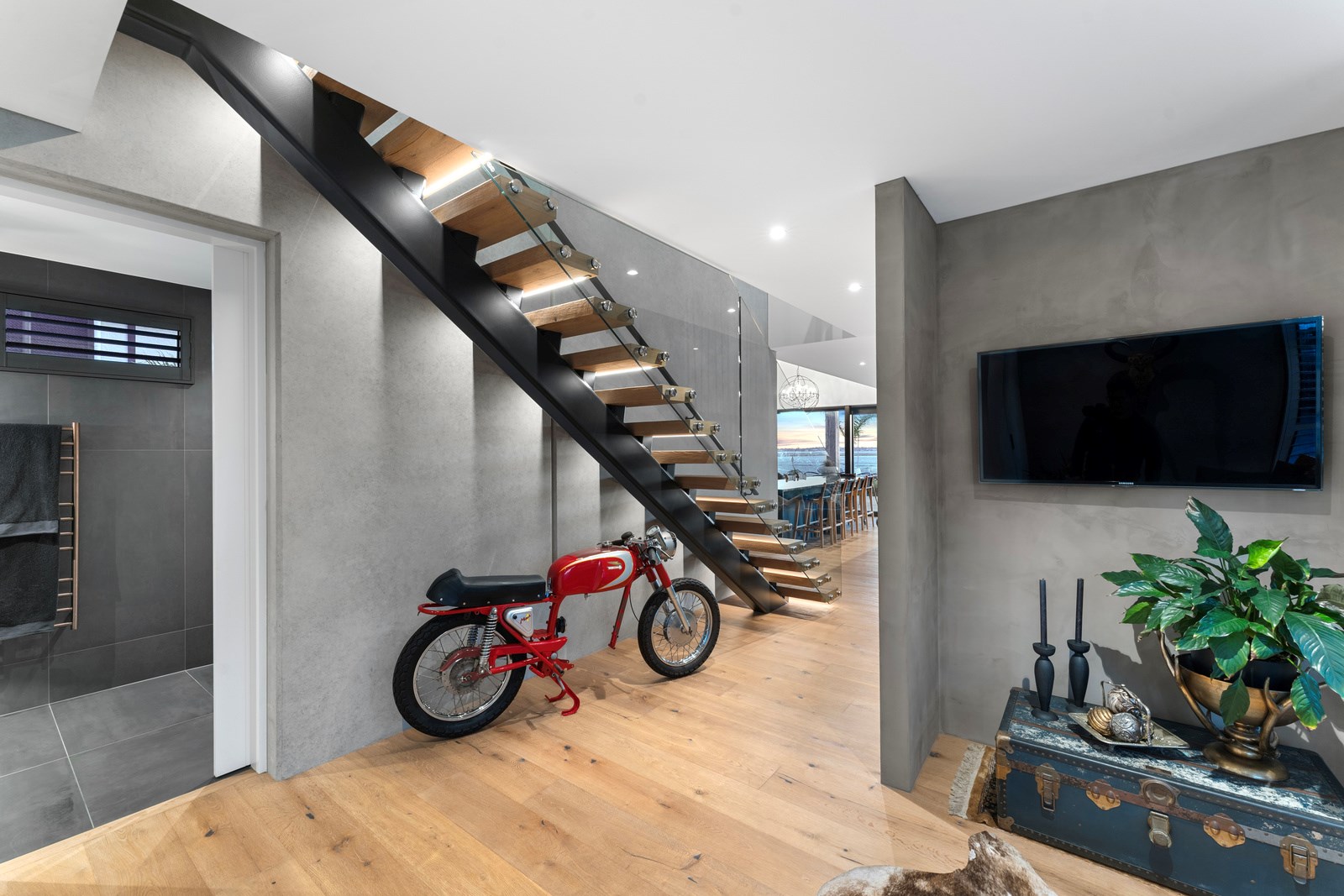 It’s the unexpected mix of materials that give this beachfront home its point of difference. The use of seemingly disparate textures — inside and out — work together to impressive effect. On the exterior, timber and weathered steel complement precast concrete panels, while on the interior yet more concrete is offset with warm timber accents, crisp white ceilings and dramatic tiles. Throughout the home there are concrete walls as well as concrete slab flooring and hydronic heating. The house was designed to maximise site space, along with daylight and water views. The main living area opens up to the sunny front deck and windows in the main bedroom take in the dramatic sunsets over the sea. The number three is a bit of a theme here, with three bedrooms, three bathrooms and three living rooms across the 271sqm footprint. On the ground floor is the kitchen-living-dining space complete with scullery, plus a separate living room, bathroom, laundry and garage. Upstairs is the main bedroom suite and two other bedrooms, a bathroom and additional living room. The bathrooms are fully tiled, with one pairing stunning black tiles with aged brass tapware and a copper-toned basin, and another with a striking black stone freestanding bath.