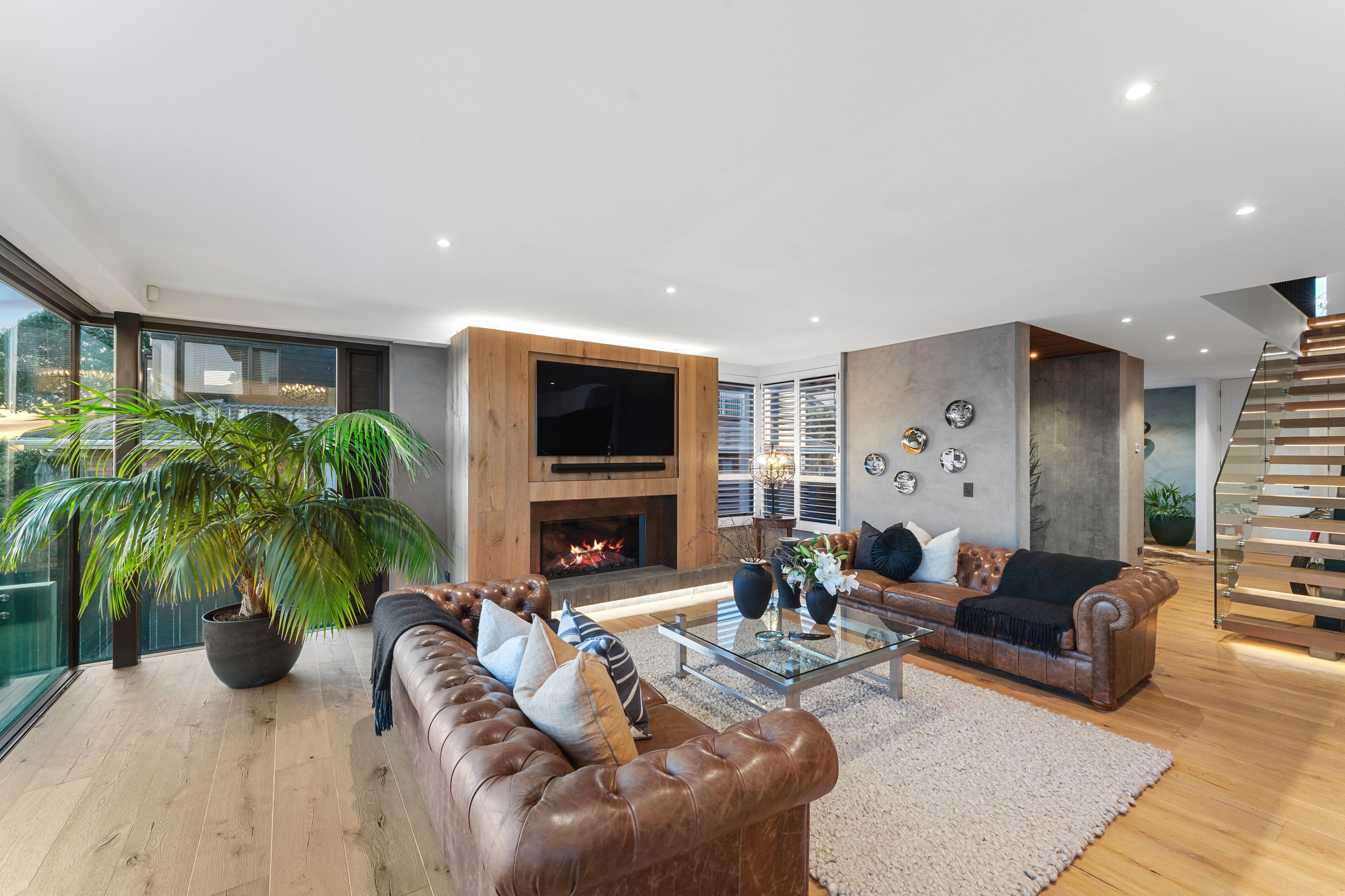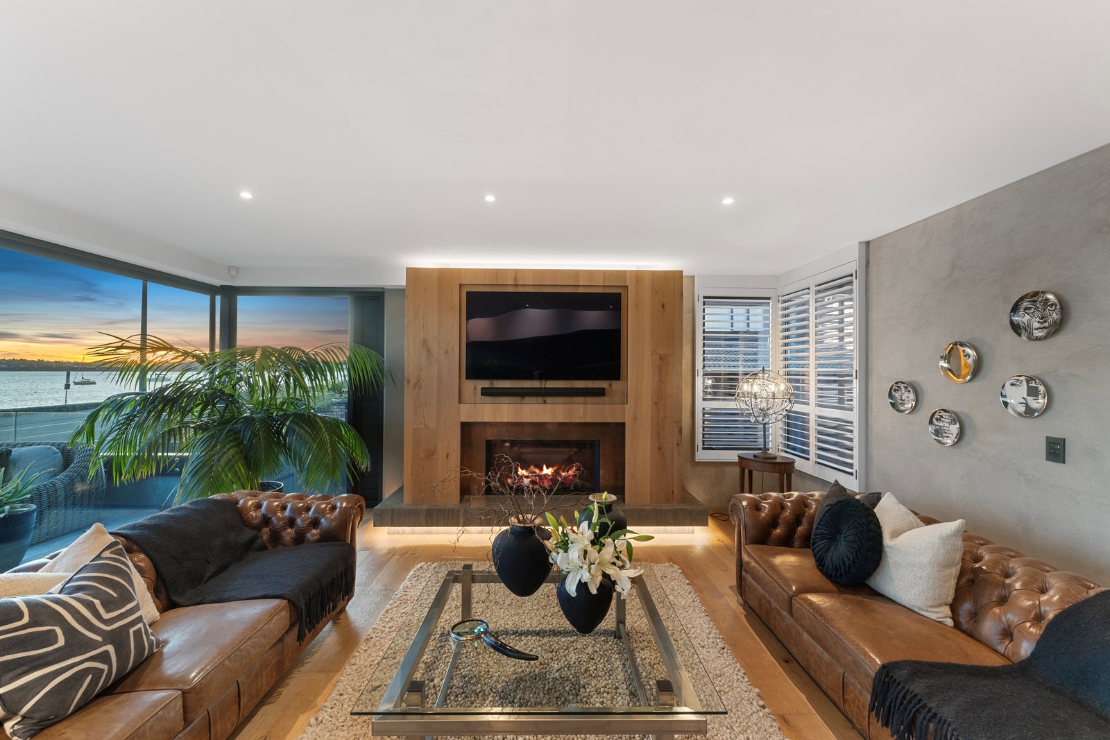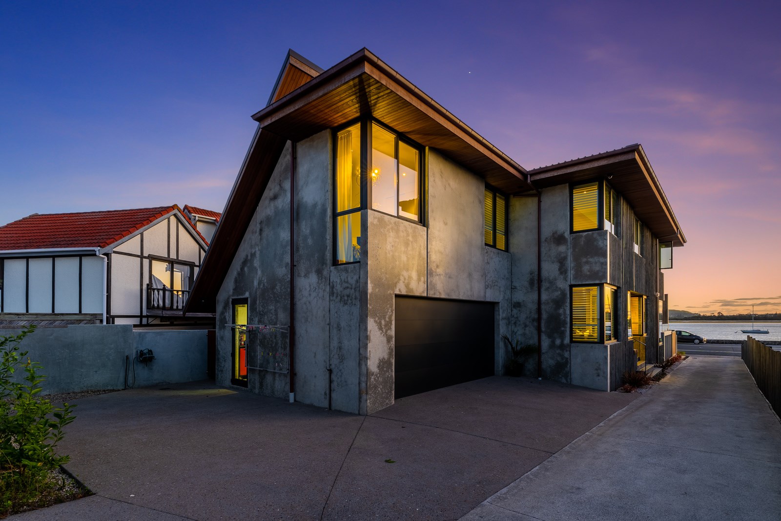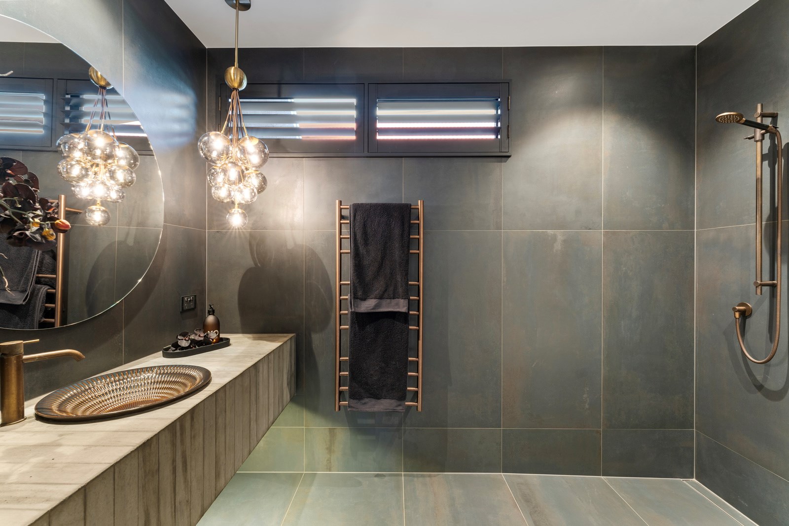 It’s the unexpected mix of materials that give this beachfront home its point of difference. The use of seemingly disparate textures — inside and out — work together to impressive effect. On the exterior, timber and weathered steel complement precast concrete panels, while on the interior yet more concrete is offset with warm timber accents, crisp white ceilings and dramatic tiles. Throughout the home there are concrete walls as well as concrete slab flooring and hydronic heating. The house was designed to maximise site space, along with daylight and water views. The main living area opens up to the sunny front deck and windows in the main bedroom take in the dramatic sunsets over the sea. The number three is a bit of a theme here, with three bedrooms, three bathrooms and three living rooms across the 271sqm footprint. On the ground floor is the kitchen-living-dining space complete with scullery, plus a separate living room, bathroom, laundry and garage. Upstairs is the main bedroom suite and two other bedrooms, a bathroom and additional living room. The bathrooms are fully tiled, with one pairing stunning black tiles with aged brass tapware and a copper-toned basin, and another with a striking black stone freestanding bath.