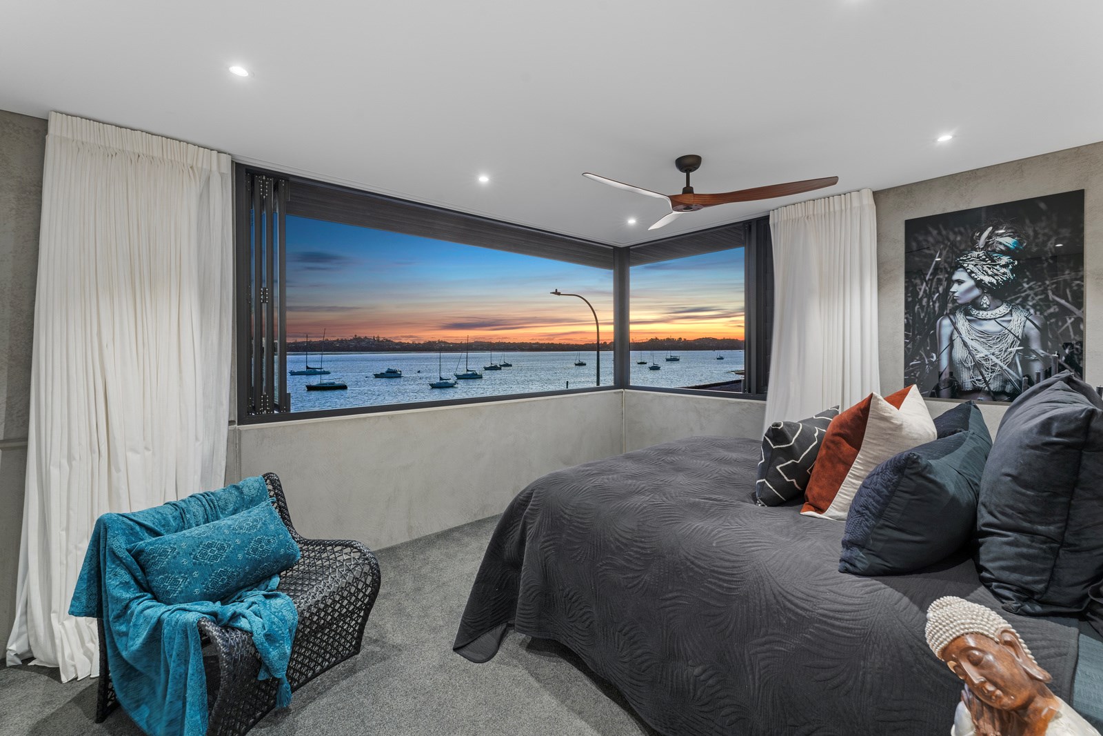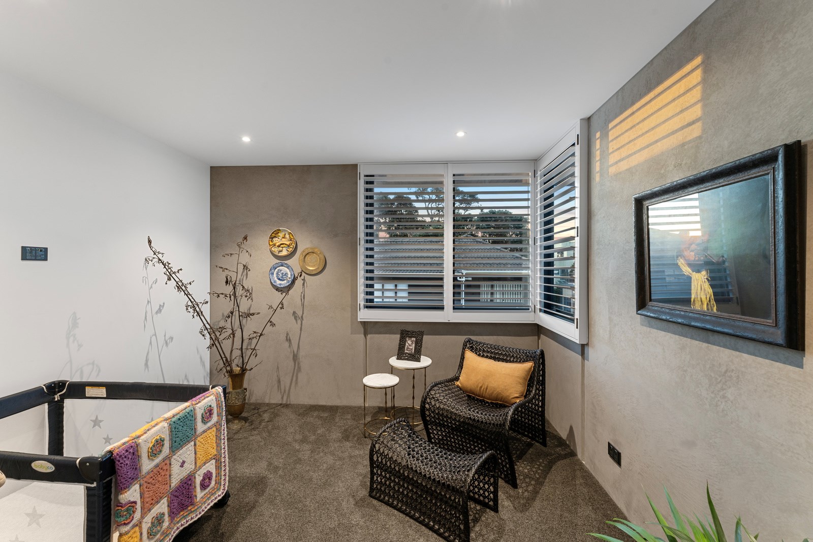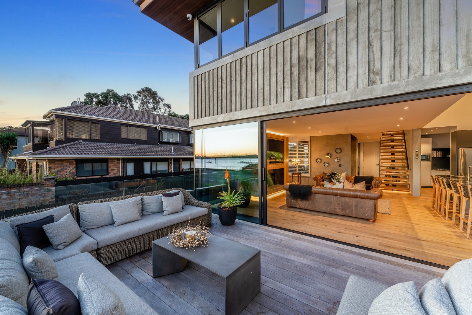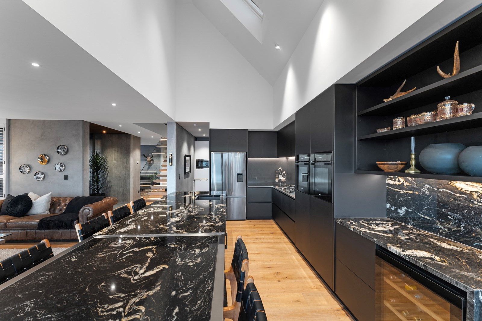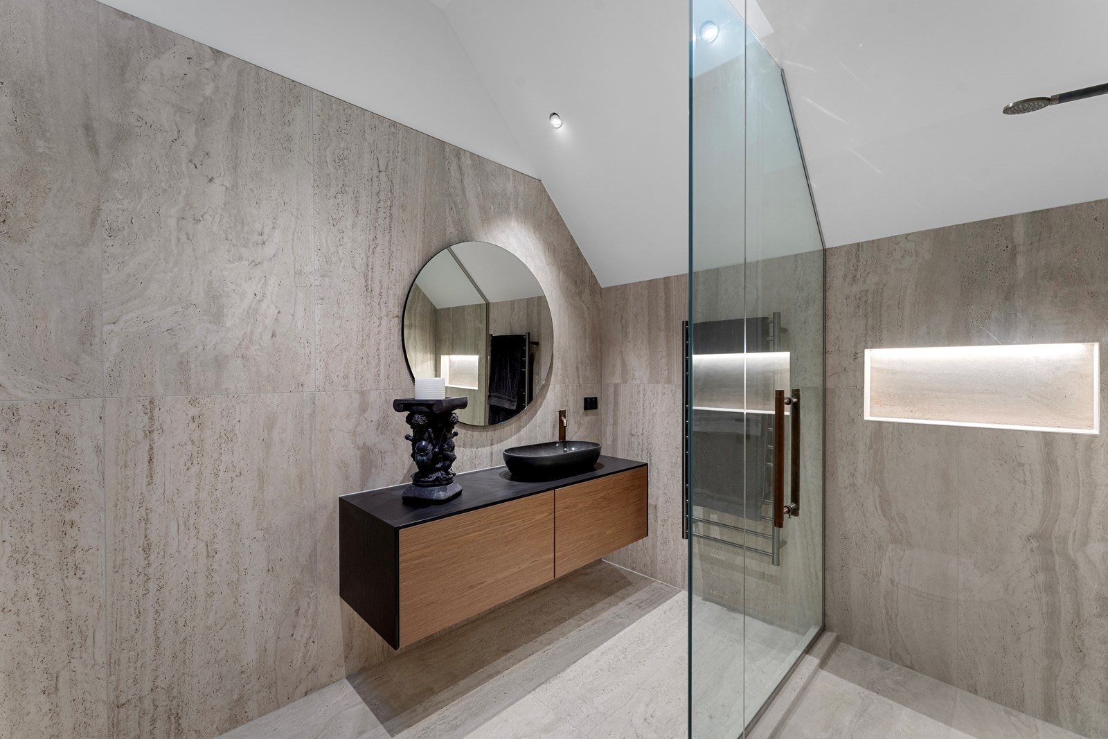 It’s the unexpected mix of materials that give this beachfront home its point of difference. The use of seemingly disparate textures — inside and out — work together to impressive effect. On the exterior, timber and weathered steel complement precast concrete panels, while on the interior yet more concrete is offset with warm timber accents, crisp white ceilings and dramatic tiles. Throughout the home there are concrete walls as well as concrete slab flooring and hydronic heating. The house was designed to maximise site space, along with daylight and water views. The main living area opens up to the sunny front deck and windows in the main bedroom take in the dramatic sunsets over the sea. The number three is a bit of a theme here, with three bedrooms, three bathrooms and three living rooms across the 271sqm footprint. On the ground floor is the kitchen-living-dining space complete with scullery, plus a separate living room, bathroom, laundry and garage. Upstairs is the main bedroom suite and two other bedrooms, a bathroom and additional living room. The bathrooms are fully tiled, with one pairing stunning black tiles with aged brass tapware and a copper-toned basin, and another with a striking black stone freestanding bath.