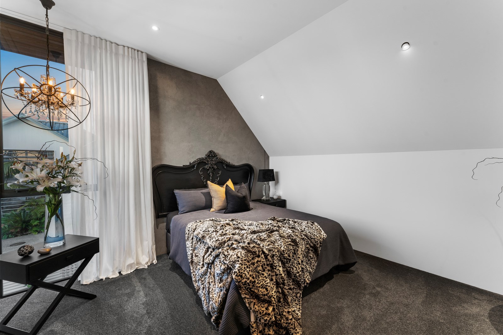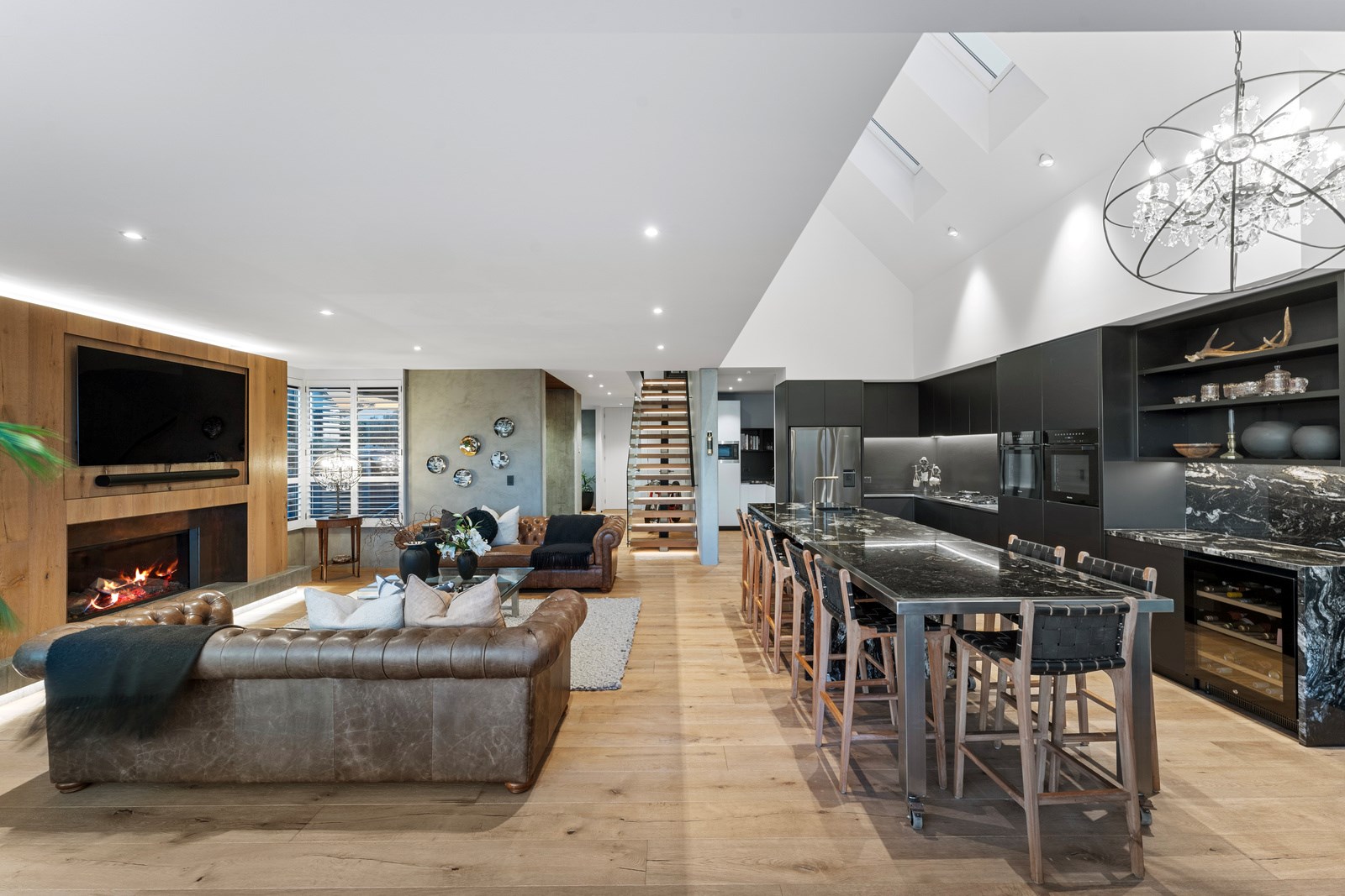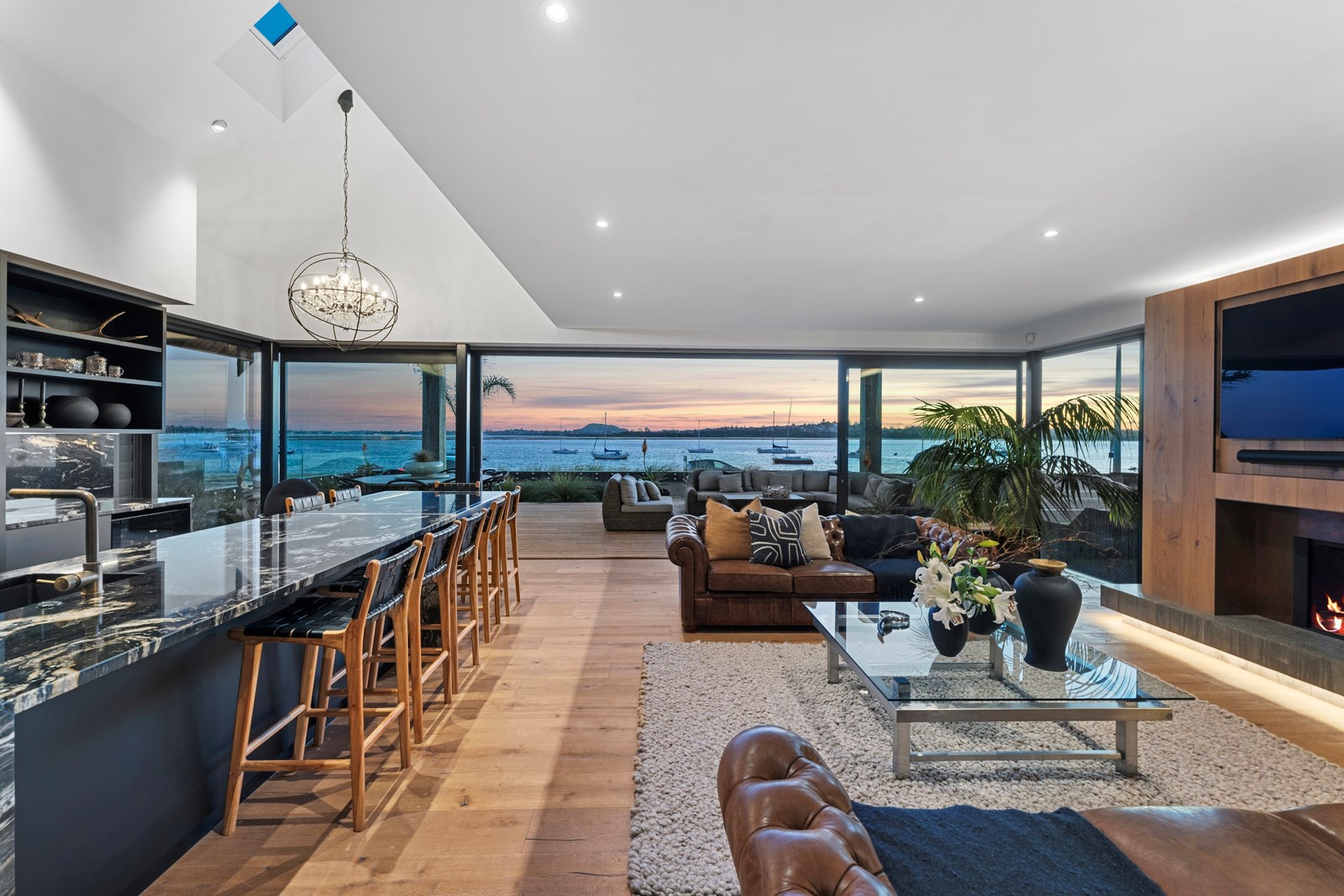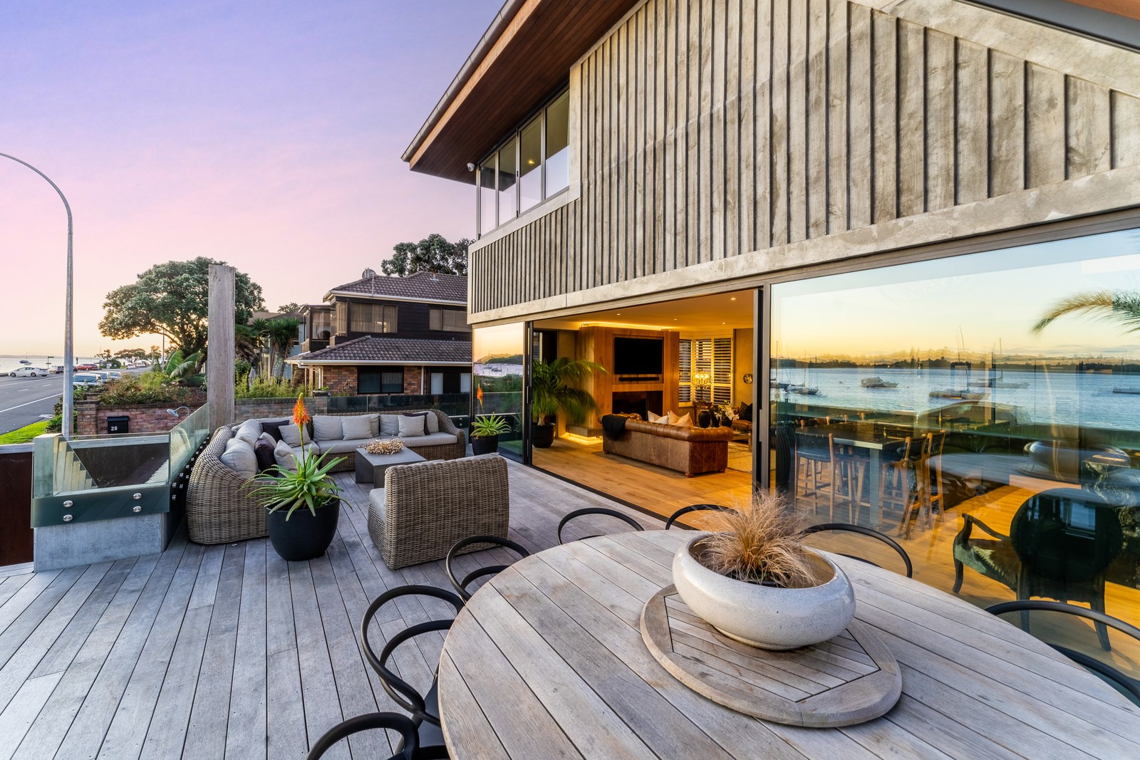 It’s the unexpected mix of materials that give this beachfront home its point of difference. The use of seemingly disparate textures — inside and out — work together to impressive effect. On the exterior, timber and weathered steel complement precast concrete panels, while on the interior yet more concrete is offset with warm timber accents, crisp white ceilings and dramatic tiles. Throughout the home there are concrete walls as well as concrete slab flooring and hydronic heating. The house was designed to maximise site space, along with daylight and water views. The main living area opens up to the sunny front deck and windows in the main bedroom take in the dramatic sunsets over the sea. The number three is a bit of a theme here, with three bedrooms, three bathrooms and three living rooms across the 271sqm footprint. On the ground floor is the kitchen-living-dining space complete with scullery, plus a separate living room, bathroom, laundry and garage. Upstairs is the main bedroom suite and two other bedrooms, a bathroom and additional living room. The bathrooms are fully tiled, with one pairing stunning black tiles with aged brass tapware and a copper-toned basin, and another with a striking black stone freestanding bath.