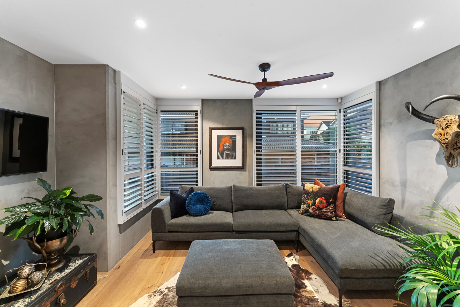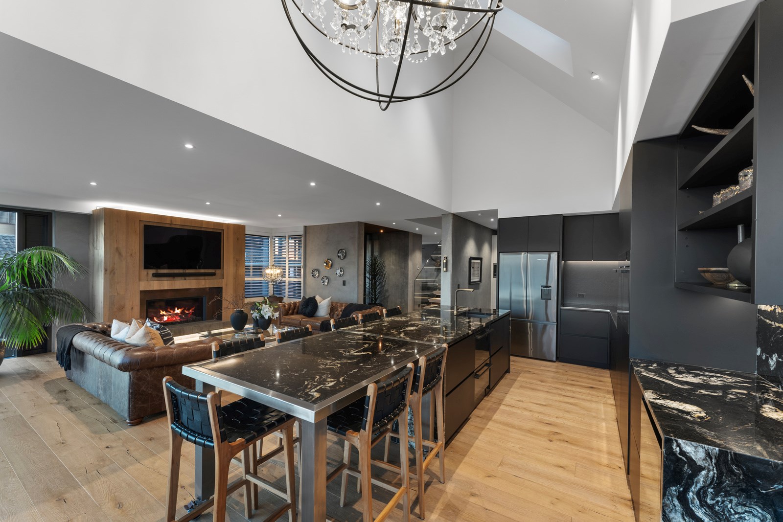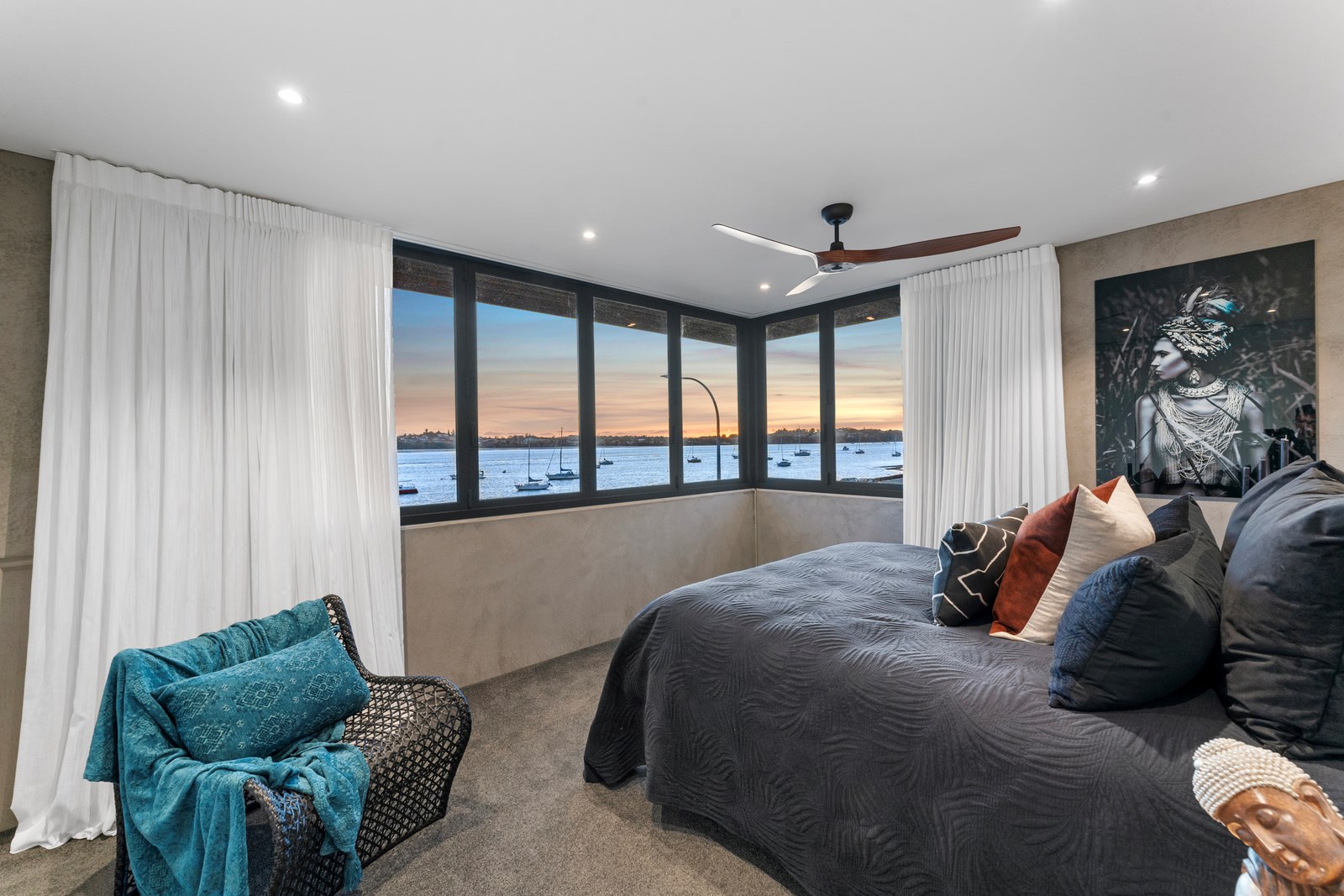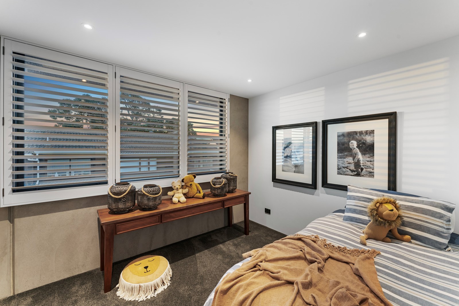 It’s the unexpected mix of materials that give this beachfront home its point of difference. The use of seemingly disparate textures — inside and out — work together to impressive effect. On the exterior, timber and weathered steel complement precast concrete panels, while on the interior yet more concrete is offset with warm timber accents, crisp white ceilings and dramatic tiles. Throughout the home there are concrete walls as well as concrete slab flooring and hydronic heating. The house was designed to maximise site space, along with daylight and water views. The main living area opens up to the sunny front deck and windows in the main bedroom take in the dramatic sunsets over the sea. The number three is a bit of a theme here, with three bedrooms, three bathrooms and three living rooms across the 271sqm footprint. On the ground floor is the kitchen-living-dining space complete with scullery, plus a separate living room, bathroom, laundry and garage. Upstairs is the main bedroom suite and two other bedrooms, a bathroom and additional living room. The bathrooms are fully tiled, with one pairing stunning black tiles with aged brass tapware and a copper-toned basin, and another with a striking black stone freestanding bath.