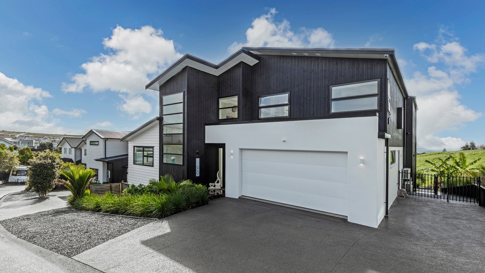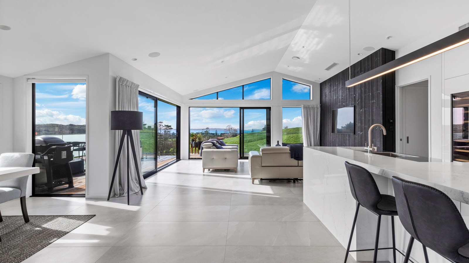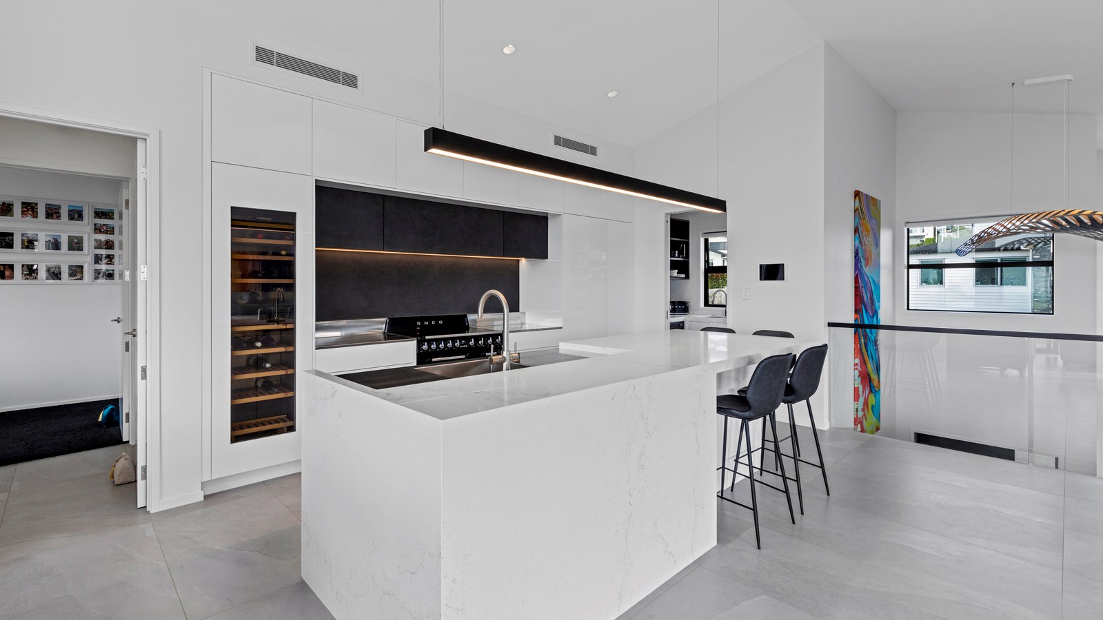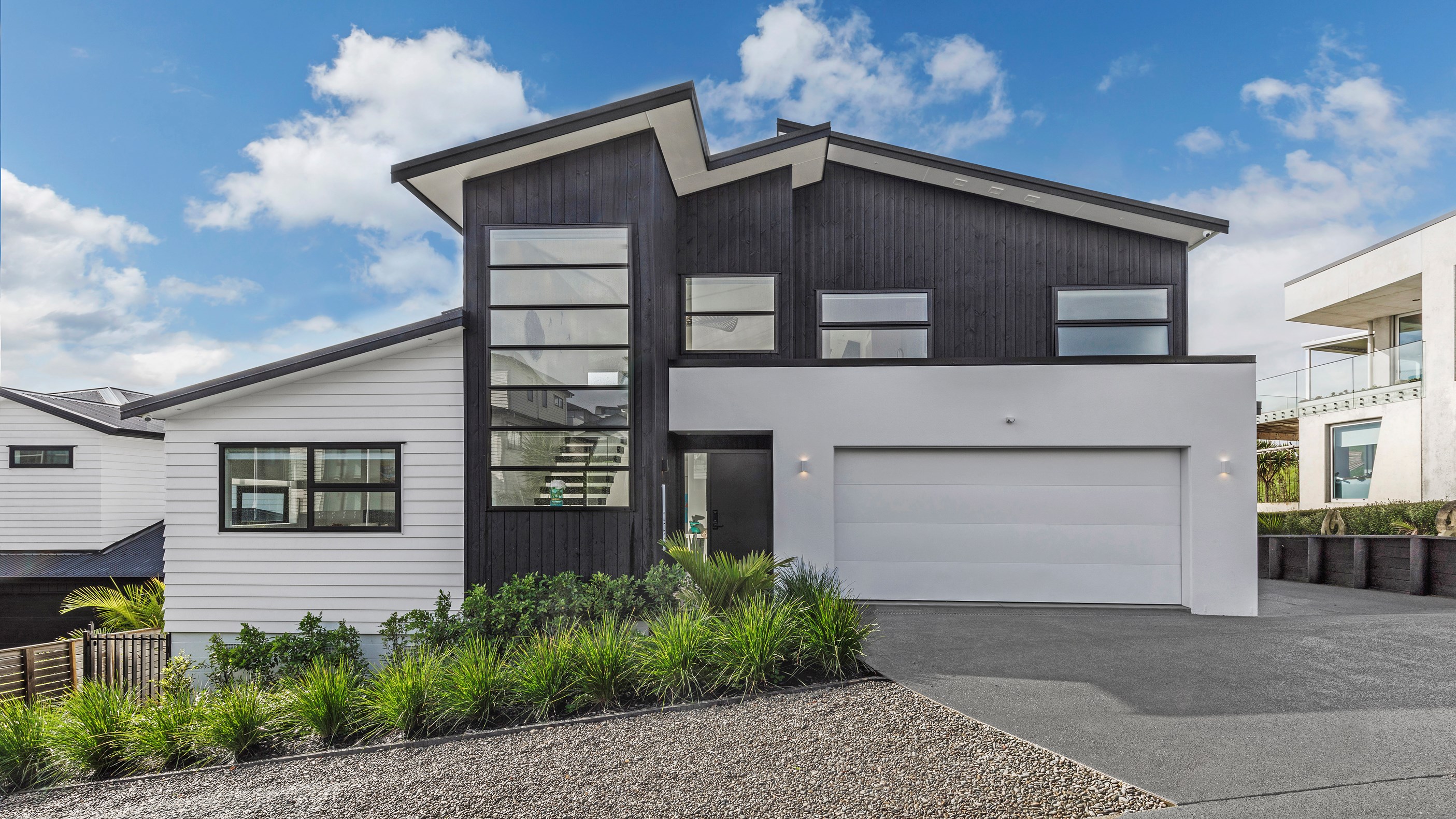 Nothing could prepare you for this stunning hilltop site. Uninterrupted views across Long Bay Regional Park to the Hauraki Gulf draw your eye out from all the living spaces, and some of the bedrooms too. Making the most of this scenery was a key factor in the design, as was a focus on entertaining, with living areas opening onto large decks on both floors. In an unconventional twist, the kitchen-living-dining area is located on the second floor, along with the main bedroom suite and a guest toilet, while a ‘man cave’ with bar, pool table and covered deck bring the ground floor to life. Downstairs you’ll also find three bedrooms, an ensuite and family bathroom, office, laundry and garage including a designated fishing storage area to make sure you fall for this house, hook, line and sinker. Outside the 312sqm home, a mix of vertical shiplap and horizontal bevel-back weatherboard cladding is chic. The monochrome colour scheme continues inside, where the kitchen incorporates Italian porcelain slab and a shiplap feature wall adds drama to the living space. An extensive home-automation system means heating, lighting, window coverings and security can be controlled with a smartphone at the touch of a button.