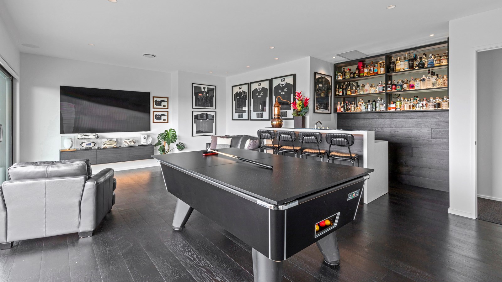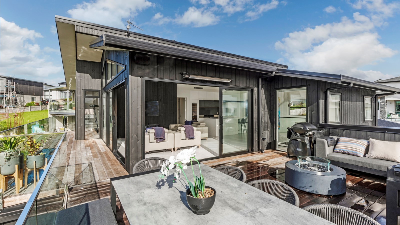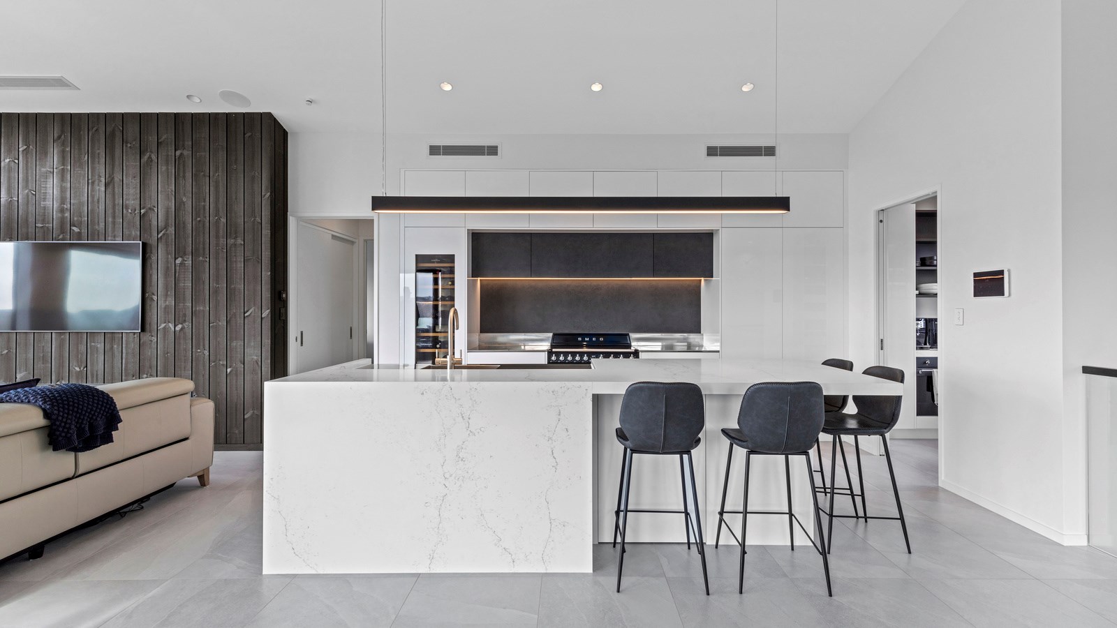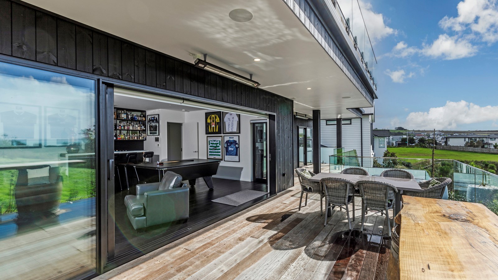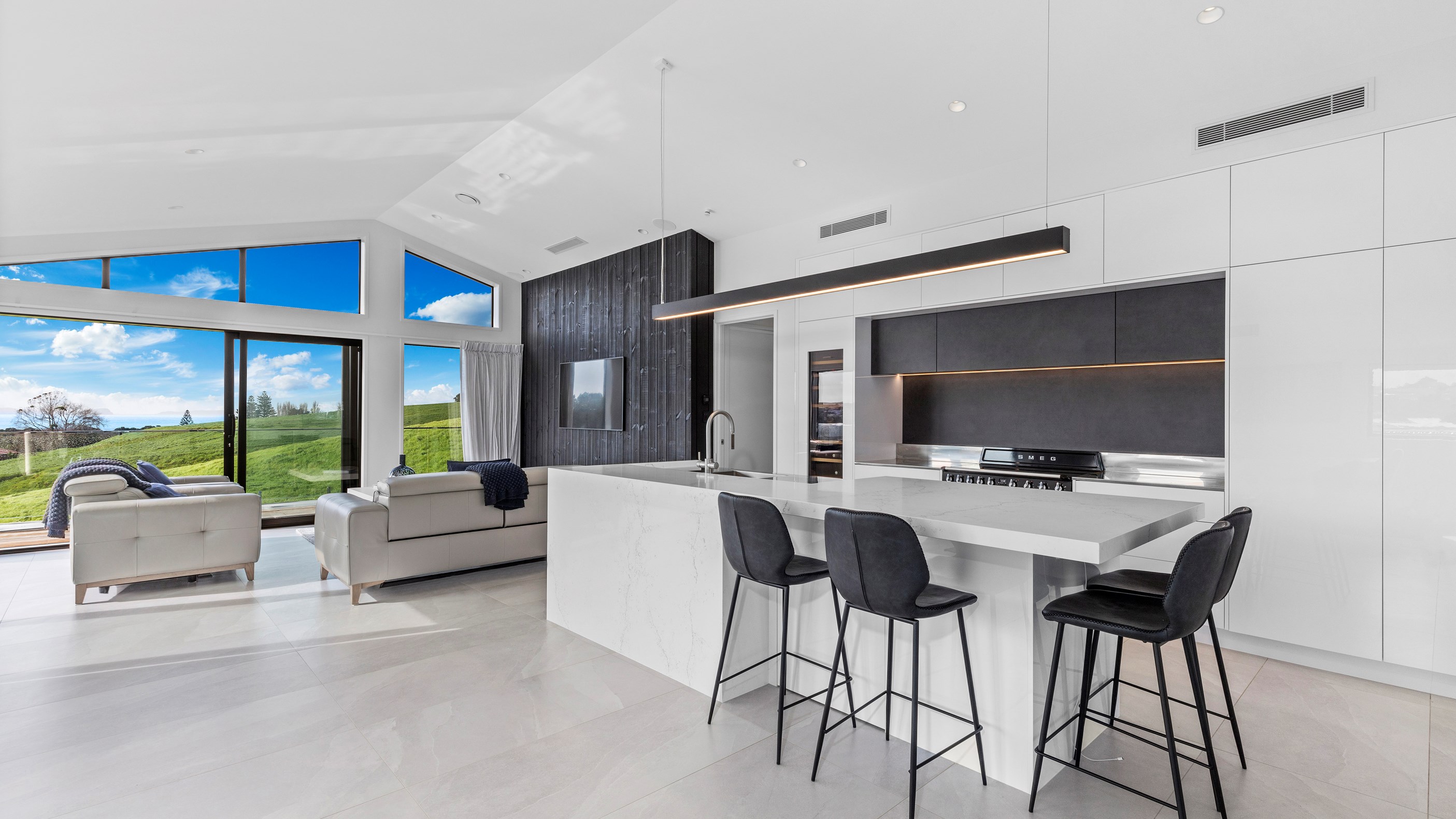 Nothing could prepare you for this stunning hilltop site. Uninterrupted views across Long Bay Regional Park to the Hauraki Gulf draw your eye out from all the living spaces, and some of the bedrooms too. Making the most of this scenery was a key factor in the design, as was a focus on entertaining, with living areas opening onto large decks on both floors. In an unconventional twist, the kitchen-living-dining area is located on the second floor, along with the main bedroom suite and a guest toilet, while a ‘man cave’ with bar, pool table and covered deck bring the ground floor to life. Downstairs you’ll also find three bedrooms, an ensuite and family bathroom, office, laundry and garage including a designated fishing storage area to make sure you fall for this house, hook, line and sinker. Outside the 312sqm home, a mix of vertical shiplap and horizontal bevel-back weatherboard cladding is chic. The monochrome colour scheme continues inside, where the kitchen incorporates Italian porcelain slab and a shiplap feature wall adds drama to the living space. An extensive home-automation system means heating, lighting, window coverings and security can be controlled with a smartphone at the touch of a button.