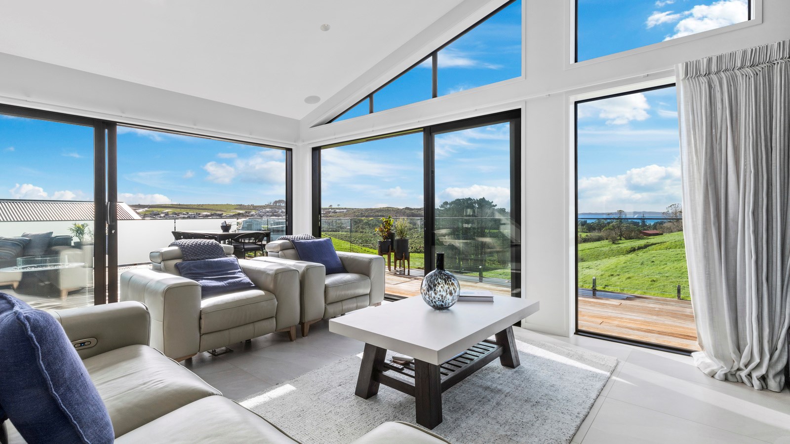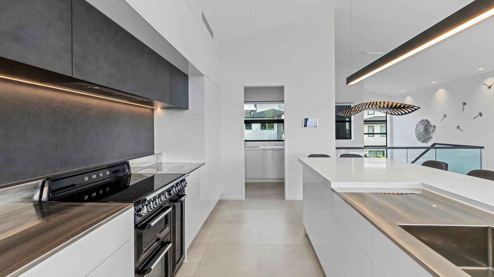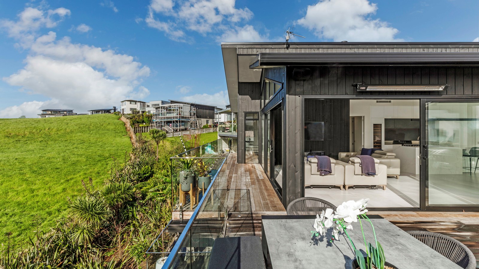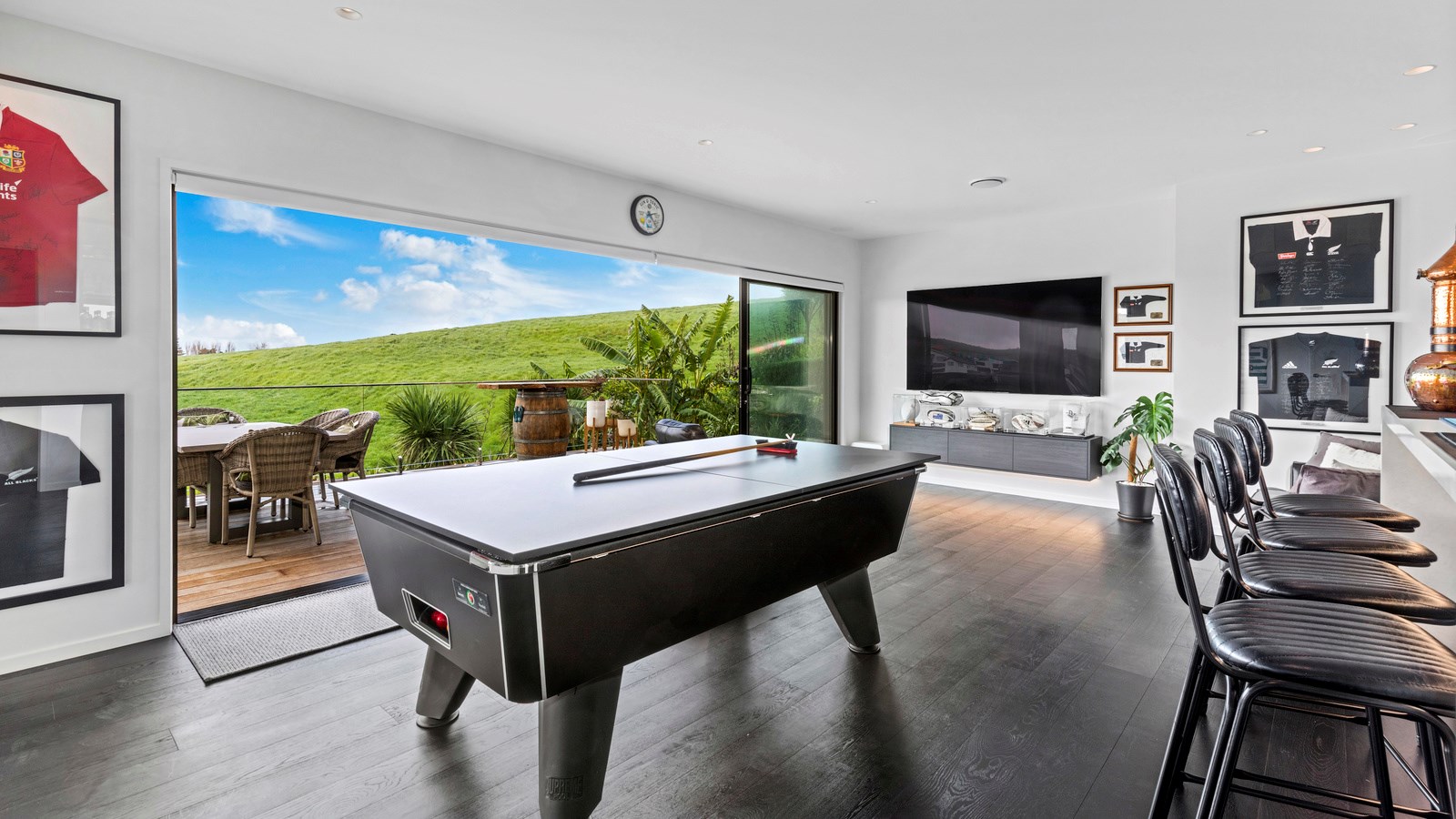 Nothing could prepare you for this stunning hilltop site. Uninterrupted views across Long Bay Regional Park to the Hauraki Gulf draw your eye out from all the living spaces, and some of the bedrooms too. Making the most of this scenery was a key factor in the design, as was a focus on entertaining, with living areas opening onto large decks on both floors. In an unconventional twist, the kitchen-living-dining area is located on the second floor, along with the main bedroom suite and a guest toilet, while a ‘man cave’ with bar, pool table and covered deck bring the ground floor to life. Downstairs you’ll also find three bedrooms, an ensuite and family bathroom, office, laundry and garage including a designated fishing storage area to make sure you fall for this house, hook, line and sinker. Outside the 312sqm home, a mix of vertical shiplap and horizontal bevel-back weatherboard cladding is chic. The monochrome colour scheme continues inside, where the kitchen incorporates Italian porcelain slab and a shiplap feature wall adds drama to the living space. An extensive home-automation system means heating, lighting, window coverings and security can be controlled with a smartphone at the touch of a button.
