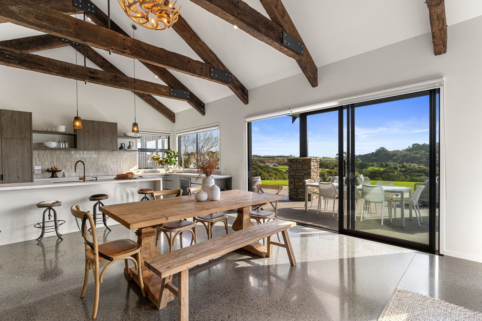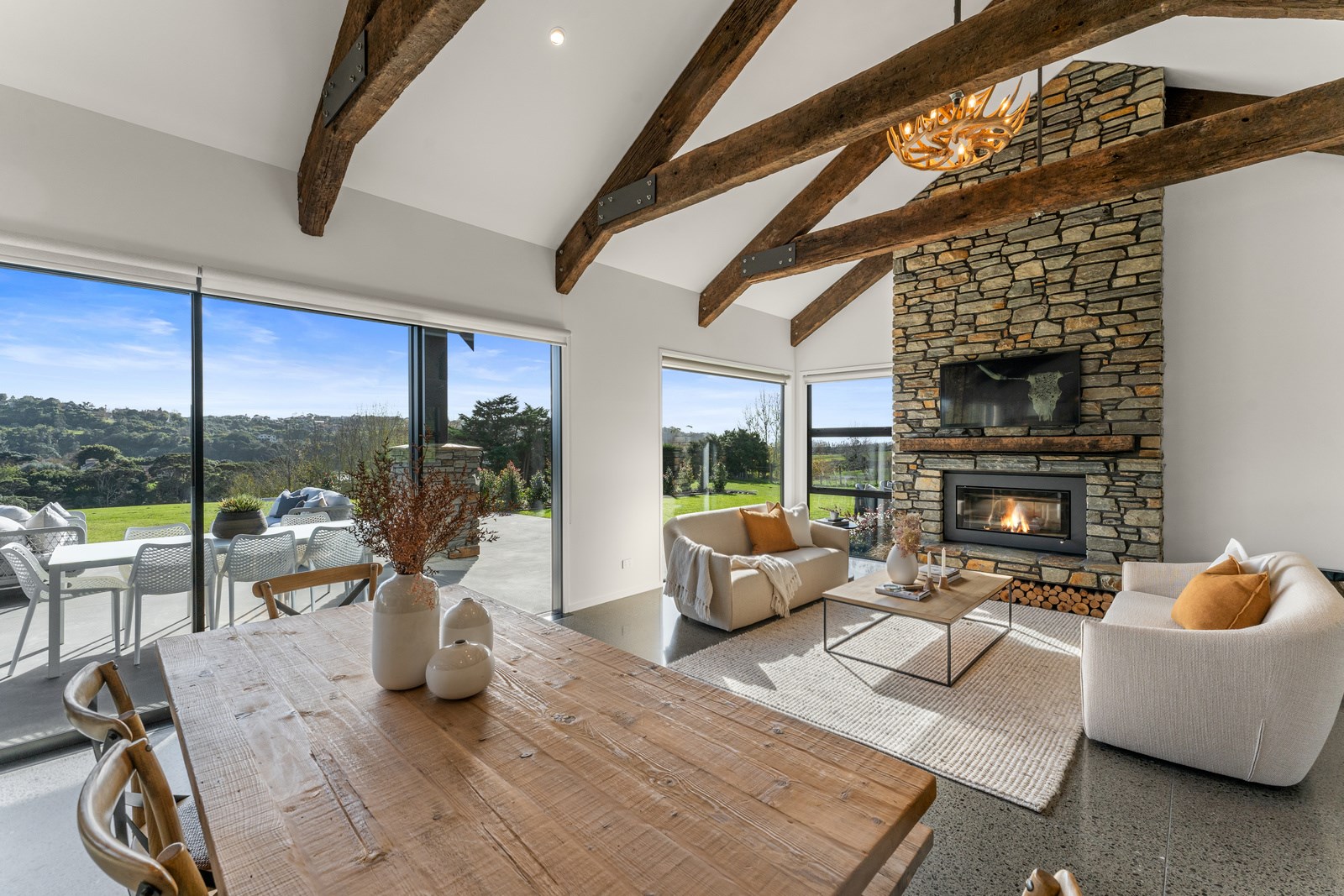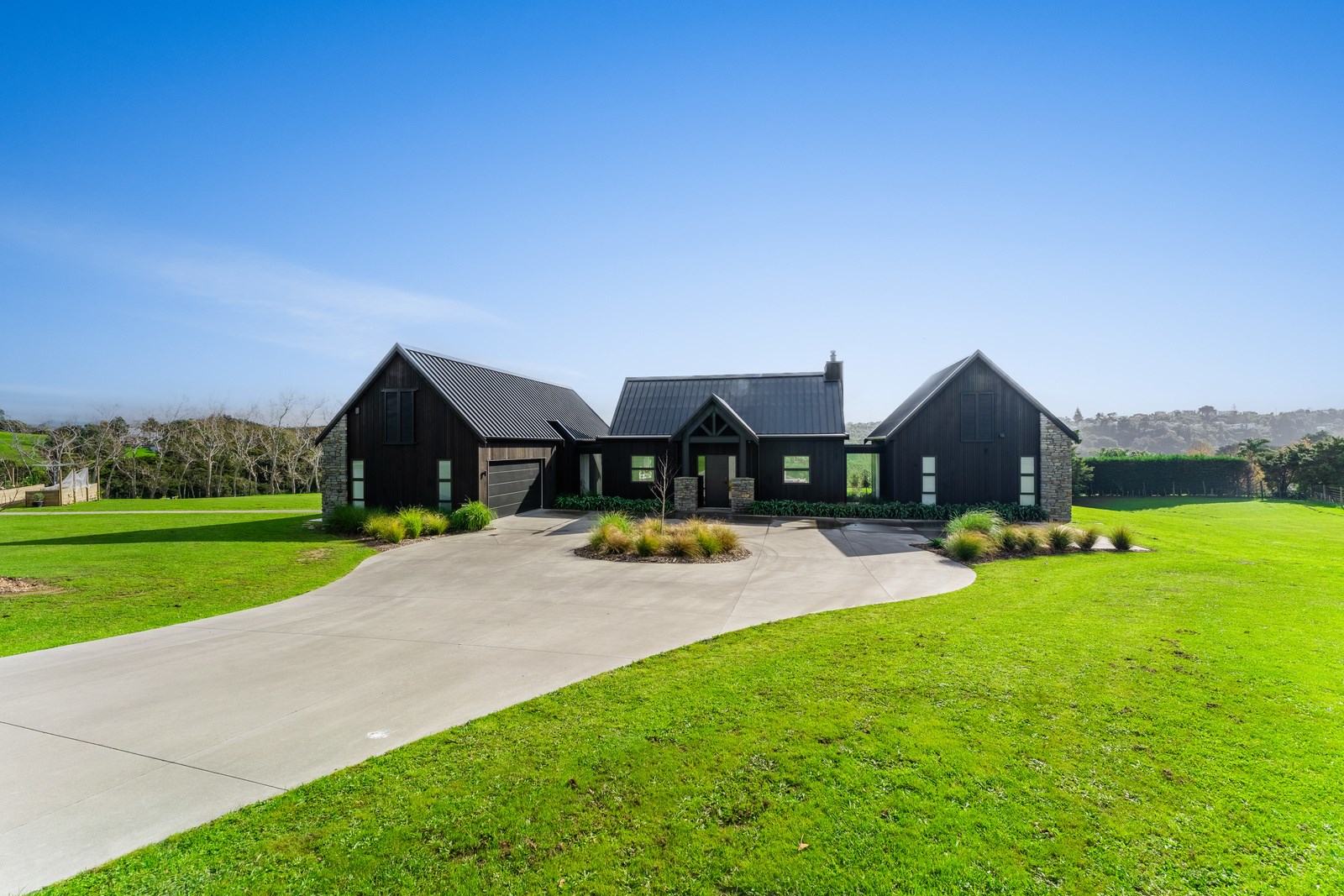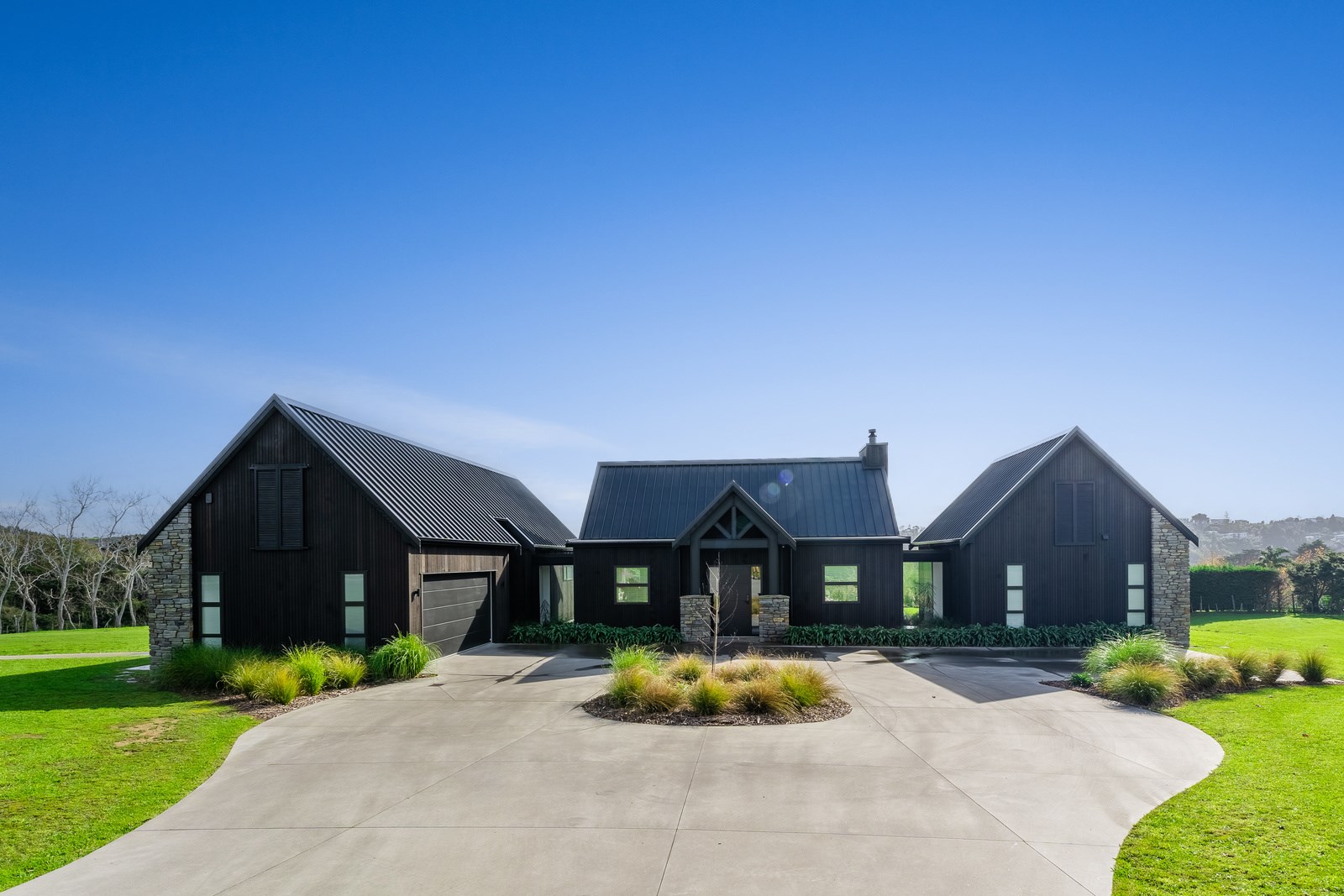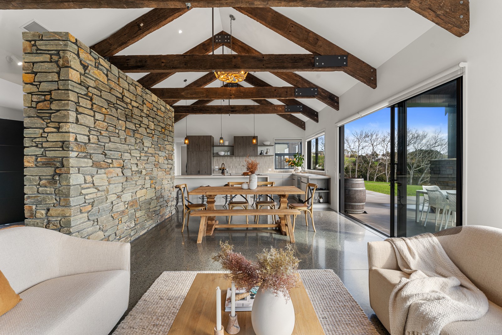 This rural 310sqm house juxtaposes the elegance of an old-style country homestead with all the mod cons. A long driveway leads to a schist and black cedar frontage sectioned into three and connected by glass hallways. On entry, a 2.7m feature stone wall complements the polished concrete floors and wooden ceiling trusses that are a hallmark of the main room. The living area features a wood-burning fireplace with stone mantel, and a sitting alcove creates a cosy nook. A vision for keen cooks, the kitchen features a barn door that provides access to the butler’s pantry. Both kitchen and dining share the benefits of the central sliding door that opens to the outdoor entertaining, overlooking the Mangemangeroa estuary. Four bedrooms occupy the wings of the home, with the carpeted main bedroom leading off the living zone. This impressive room has a gabled ceiling, outdoor access and a spacious ensuite and walk-in dressing room. Behind the kitchen a second glass link leads to a two-storey wing. On the ground floor there are two bedrooms, a bathroom, separate toilet and double garage with laundry. Carpeted stairs lead upstairs to a delightful fourth bedroom and lounge/media room.