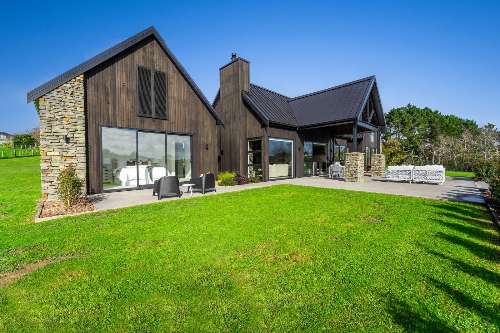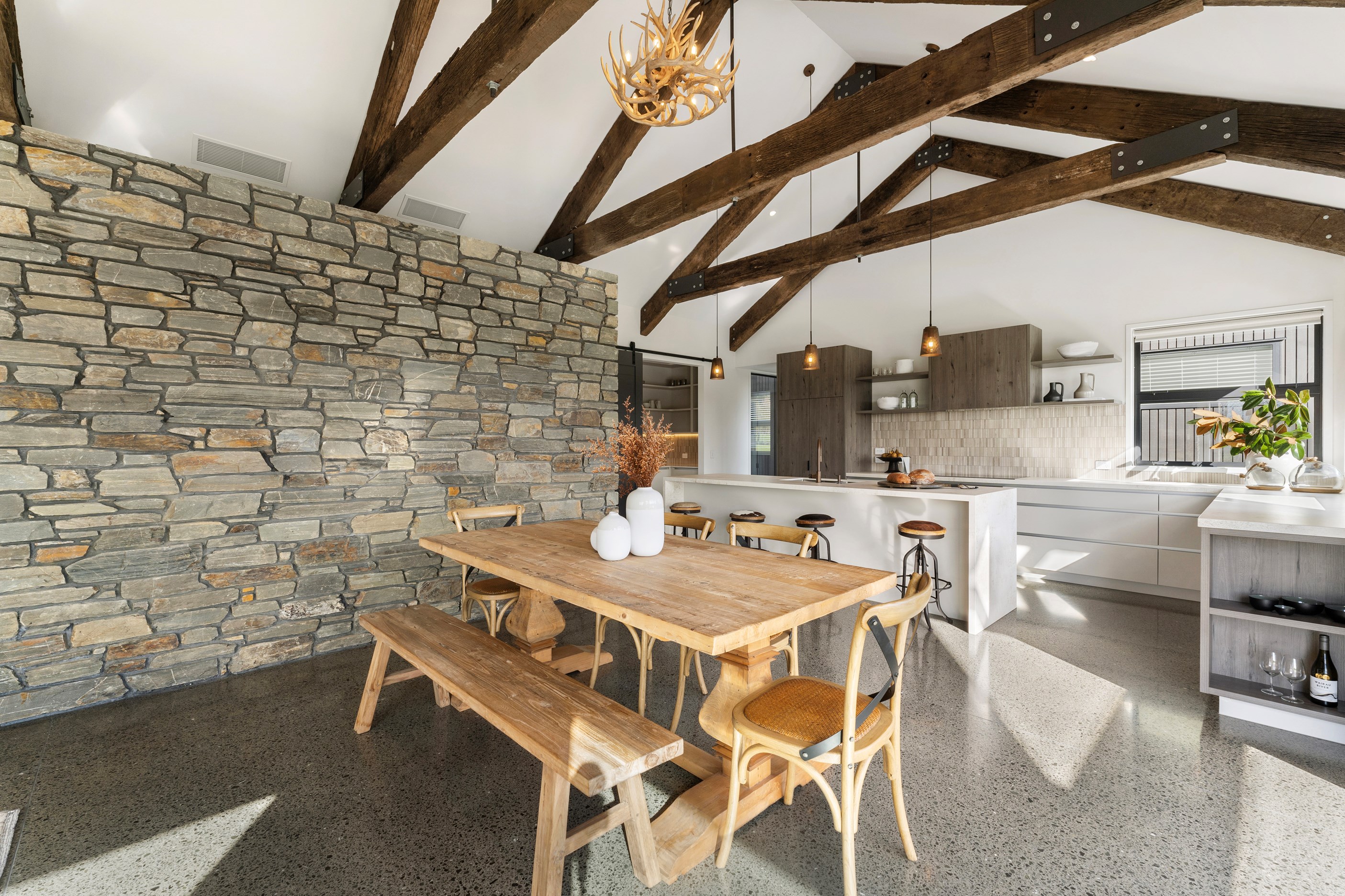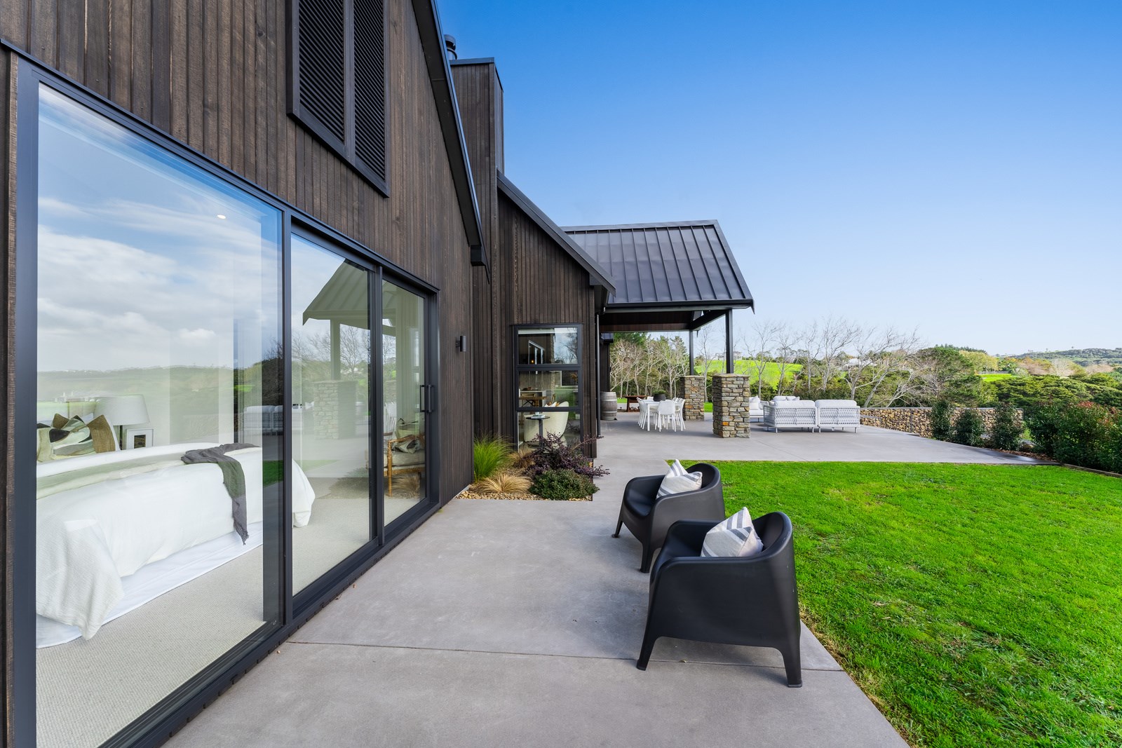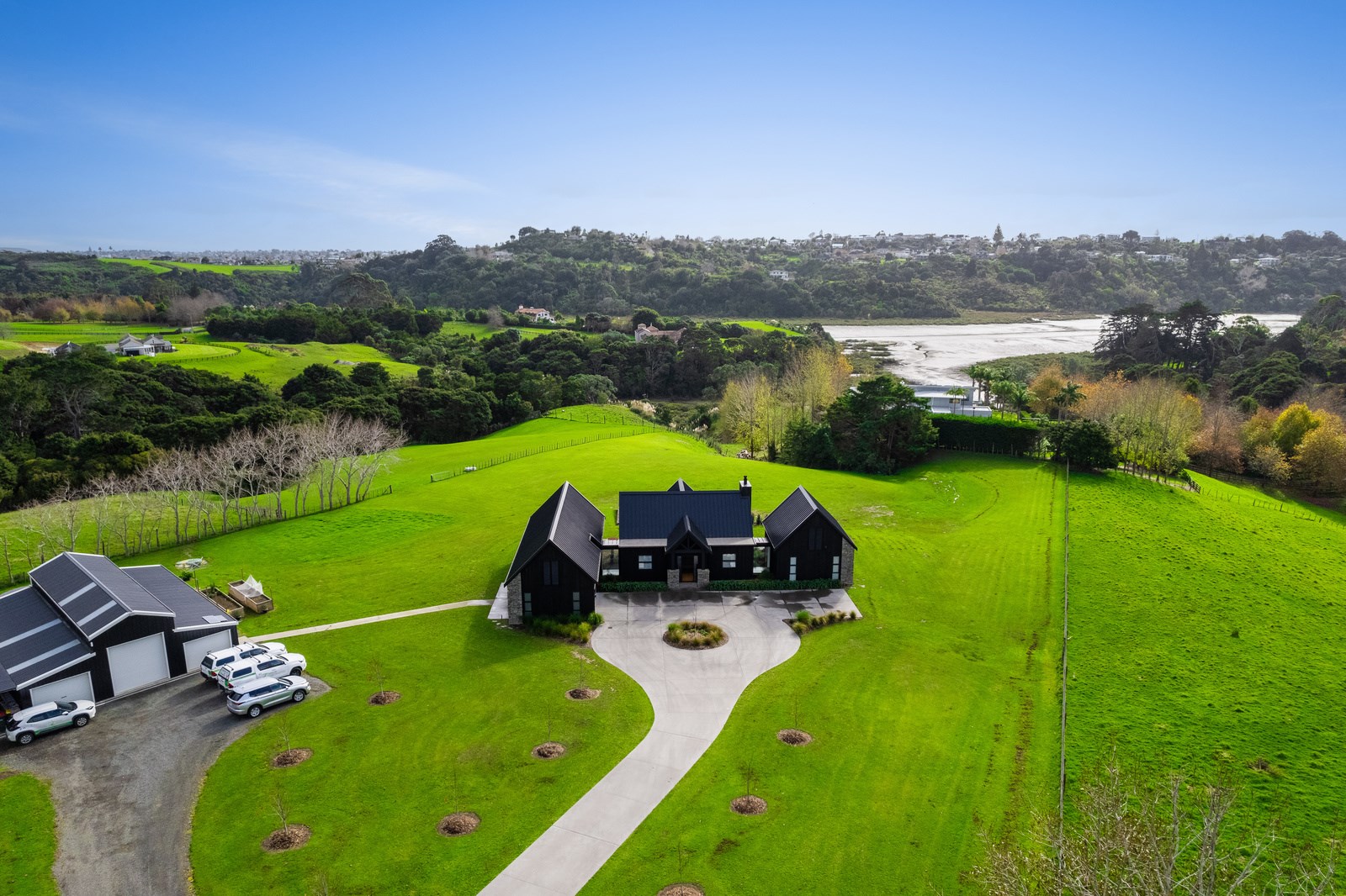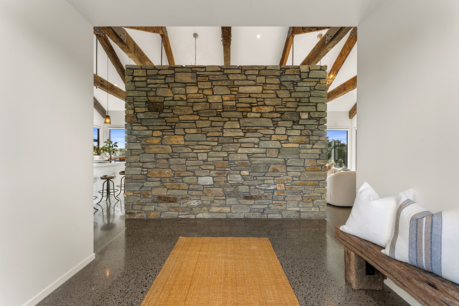 This rural 310sqm house juxtaposes the elegance of an old-style country homestead with all the mod cons. A long driveway leads to a schist and black cedar frontage sectioned into three and connected by glass hallways. On entry, a 2.7m feature stone wall complements the polished concrete floors and wooden ceiling trusses that are a hallmark of the main room. The living area features a wood-burning fireplace with stone mantel, and a sitting alcove creates a cosy nook. A vision for keen cooks, the kitchen features a barn door that provides access to the butler’s pantry. Both kitchen and dining share the benefits of the central sliding door that opens to the outdoor entertaining, overlooking the Mangemangeroa estuary. Four bedrooms occupy the wings of the home, with the carpeted main bedroom leading off the living zone. This impressive room has a gabled ceiling, outdoor access and a spacious ensuite and walk-in dressing room. Behind the kitchen a second glass link leads to a two-storey wing. On the ground floor there are two bedrooms, a bathroom, separate toilet and double garage with laundry. Carpeted stairs lead upstairs to a delightful fourth bedroom and lounge/media room.