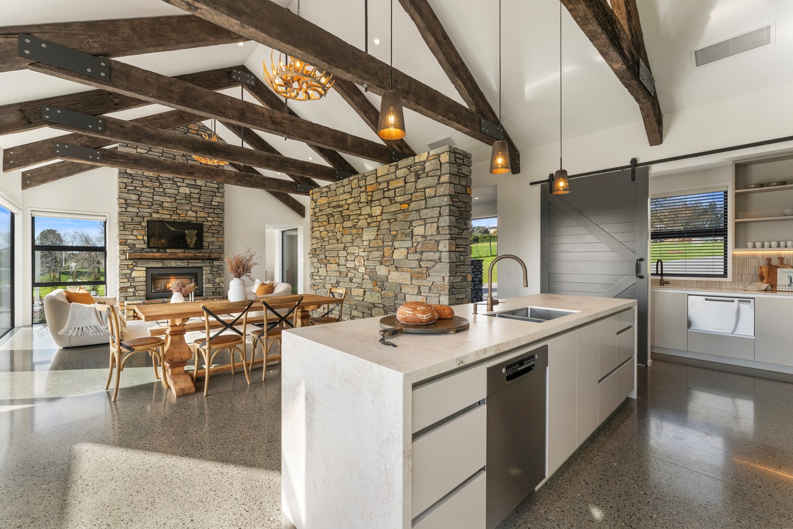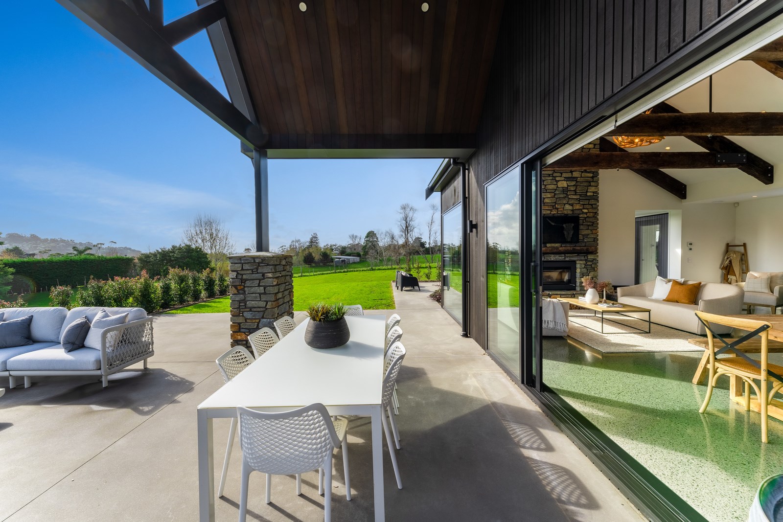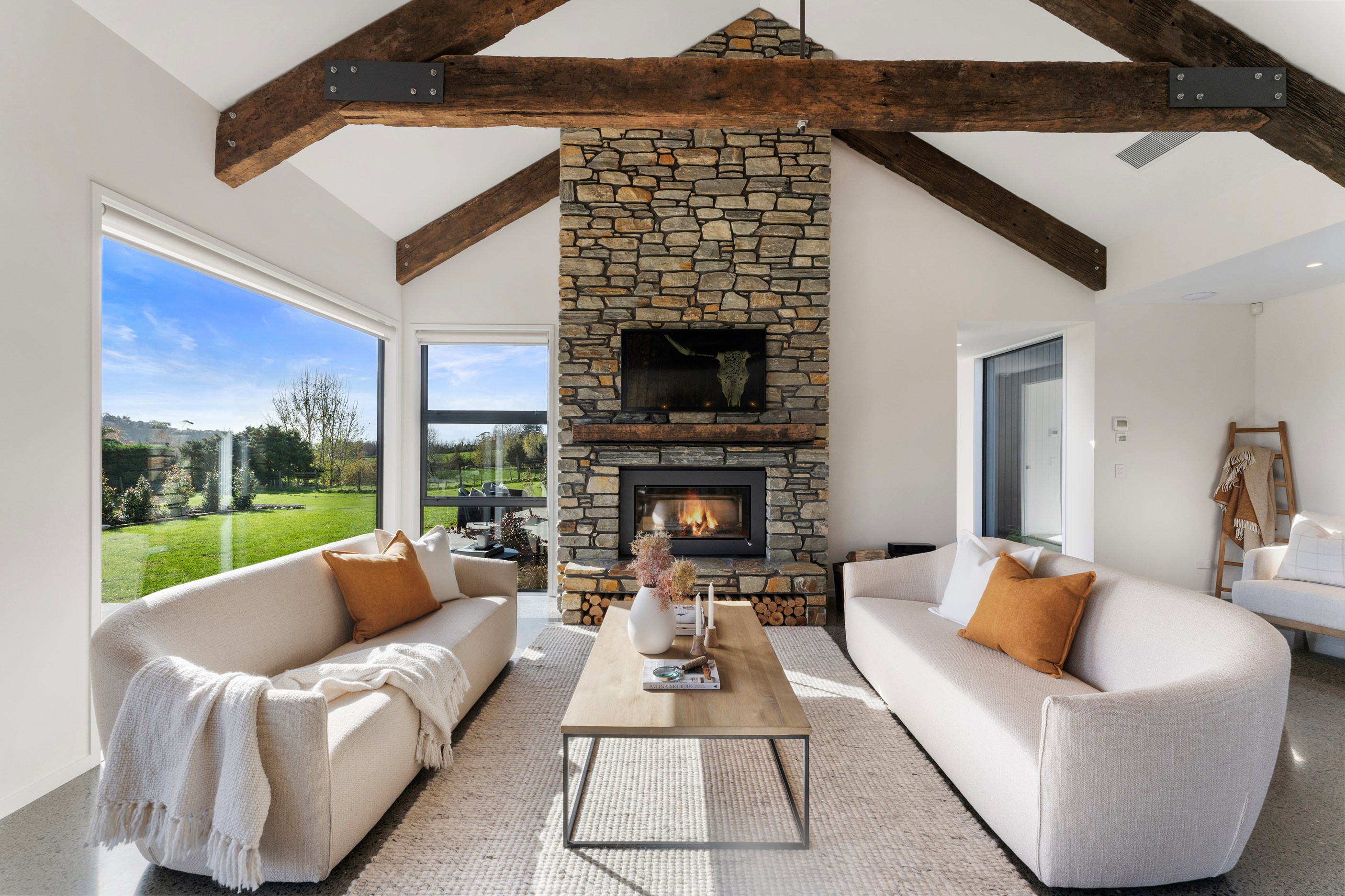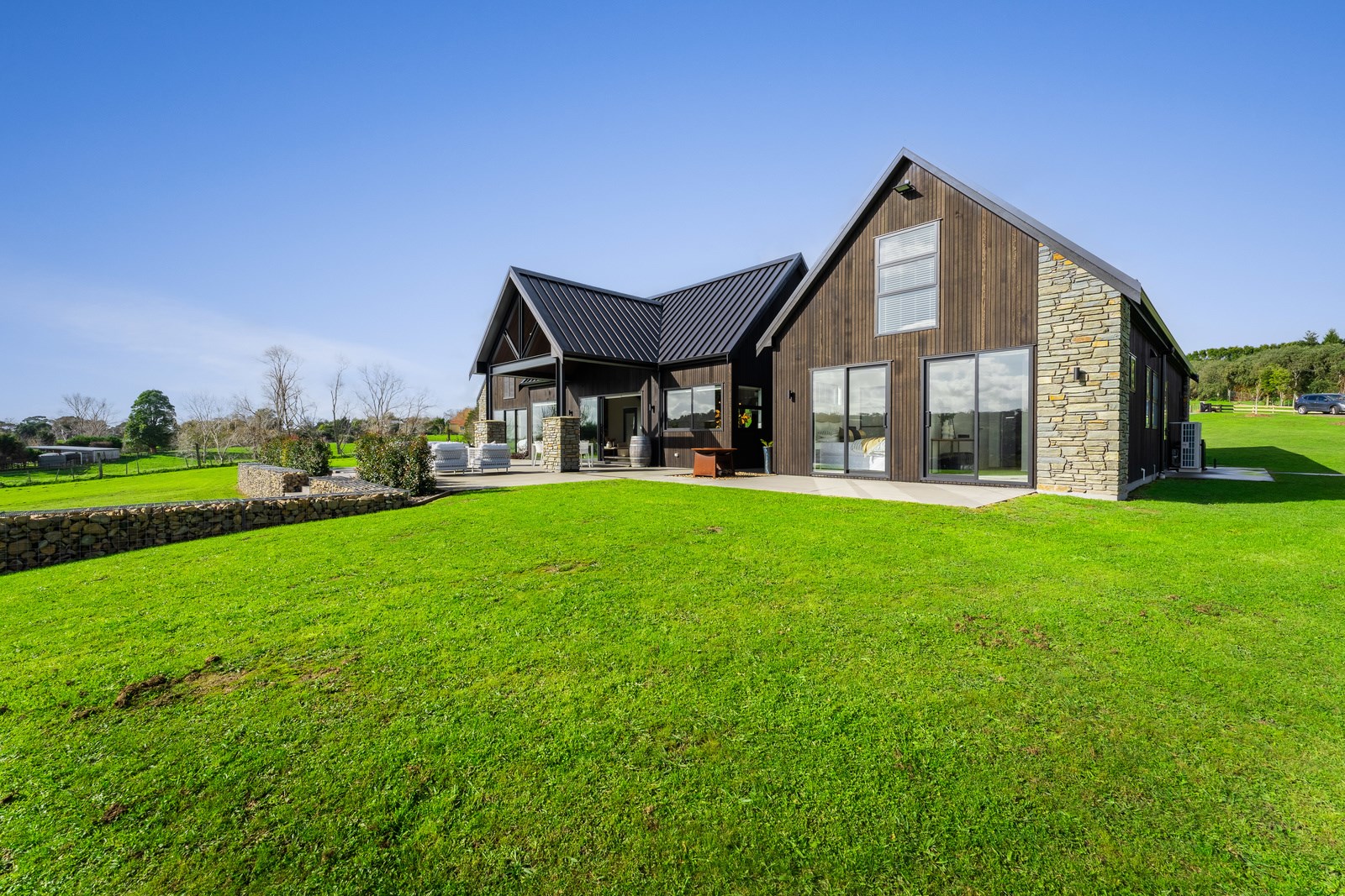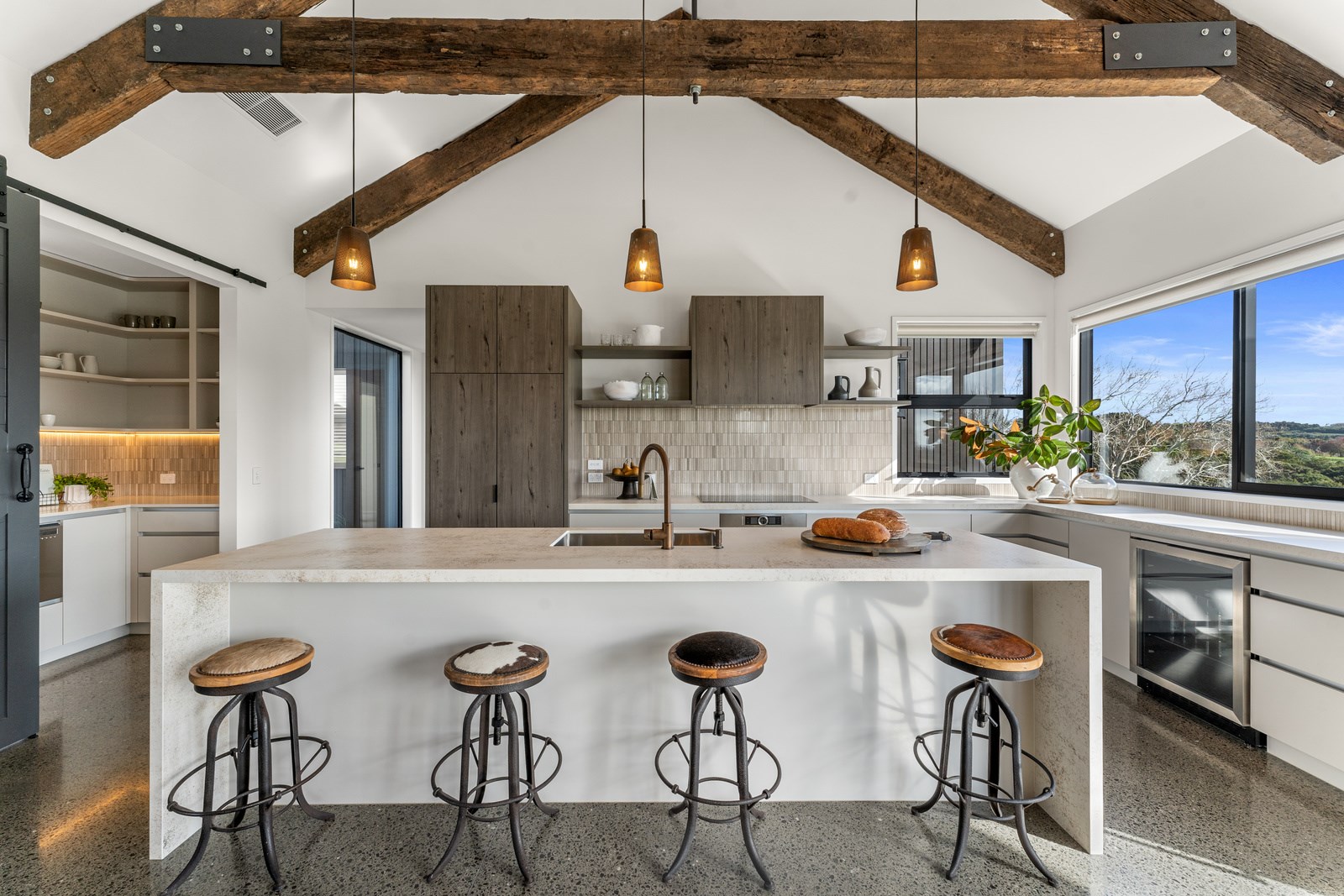 This rural 310sqm house juxtaposes the elegance of an old-style country homestead with all the mod cons. A long driveway leads to a schist and black cedar frontage sectioned into three and connected by glass hallways. On entry, a 2.7m feature stone wall complements the polished concrete floors and wooden ceiling trusses that are a hallmark of the main room. The living area features a wood-burning fireplace with stone mantel, and a sitting alcove creates a cosy nook. A vision for keen cooks, the kitchen features a barn door that provides access to the butler’s pantry. Both kitchen and dining share the benefits of the central sliding door that opens to the outdoor entertaining, overlooking the Mangemangeroa estuary. Four bedrooms occupy the wings of the home, with the carpeted main bedroom leading off the living zone. This impressive room has a gabled ceiling, outdoor access and a spacious ensuite and walk-in dressing room. Behind the kitchen a second glass link leads to a two-storey wing. On the ground floor there are two bedrooms, a bathroom, separate toilet and double garage with laundry. Carpeted stairs lead upstairs to a delightful fourth bedroom and lounge/media room.