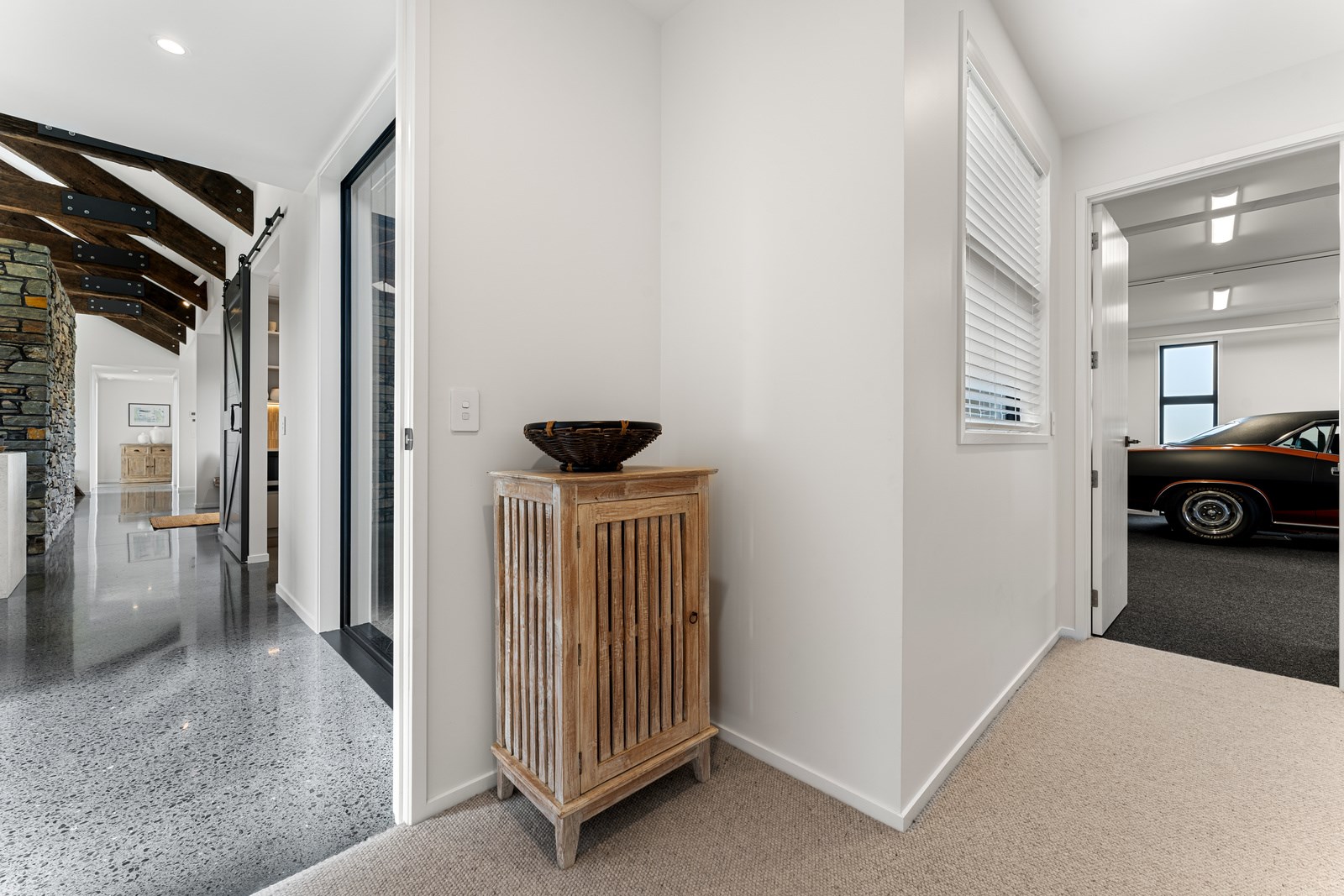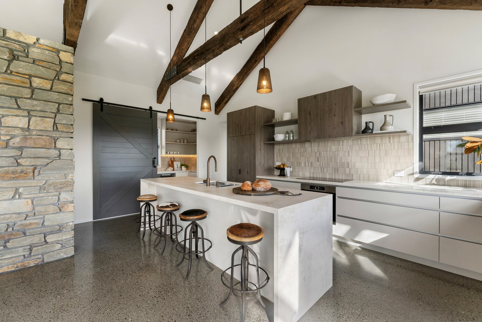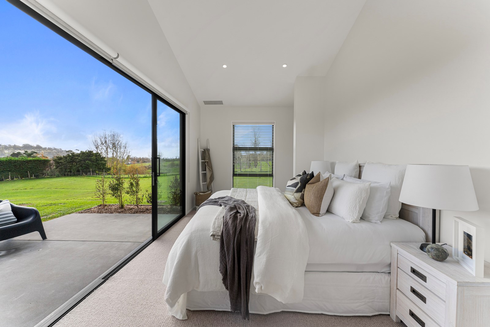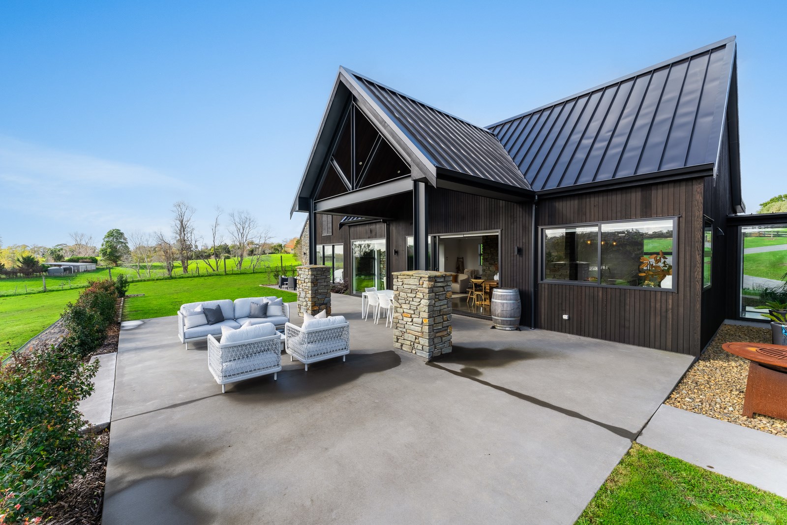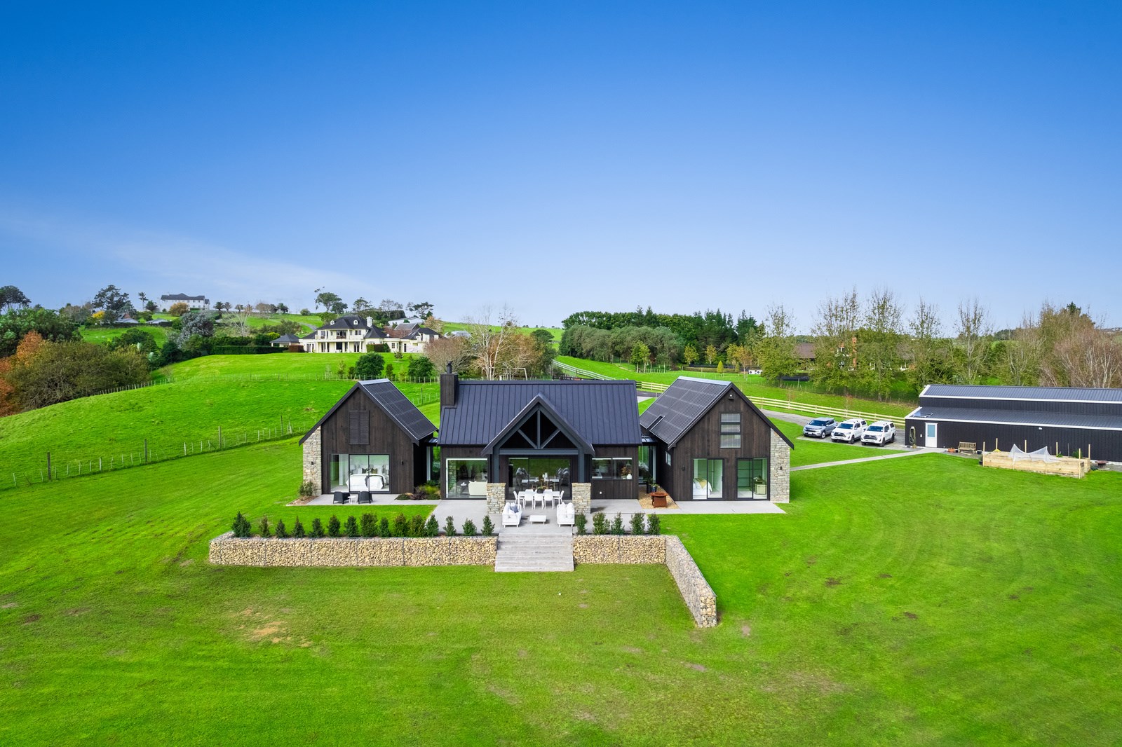 This rural 310sqm house juxtaposes the elegance of an old-style country homestead with all the mod cons. A long driveway leads to a schist and black cedar frontage sectioned into three and connected by glass hallways. On entry, a 2.7m feature stone wall complements the polished concrete floors and wooden ceiling trusses that are a hallmark of the main room. The living area features a wood-burning fireplace with stone mantel, and a sitting alcove creates a cosy nook. A vision for keen cooks, the kitchen features a barn door that provides access to the butler’s pantry. Both kitchen and dining share the benefits of the central sliding door that opens to the outdoor entertaining, overlooking the Mangemangeroa estuary. Four bedrooms occupy the wings of the home, with the carpeted main bedroom leading off the living zone. This impressive room has a gabled ceiling, outdoor access and a spacious ensuite and walk-in dressing room. Behind the kitchen a second glass link leads to a two-storey wing. On the ground floor there are two bedrooms, a bathroom, separate toilet and double garage with laundry. Carpeted stairs lead upstairs to a delightful fourth bedroom and lounge/media room.
