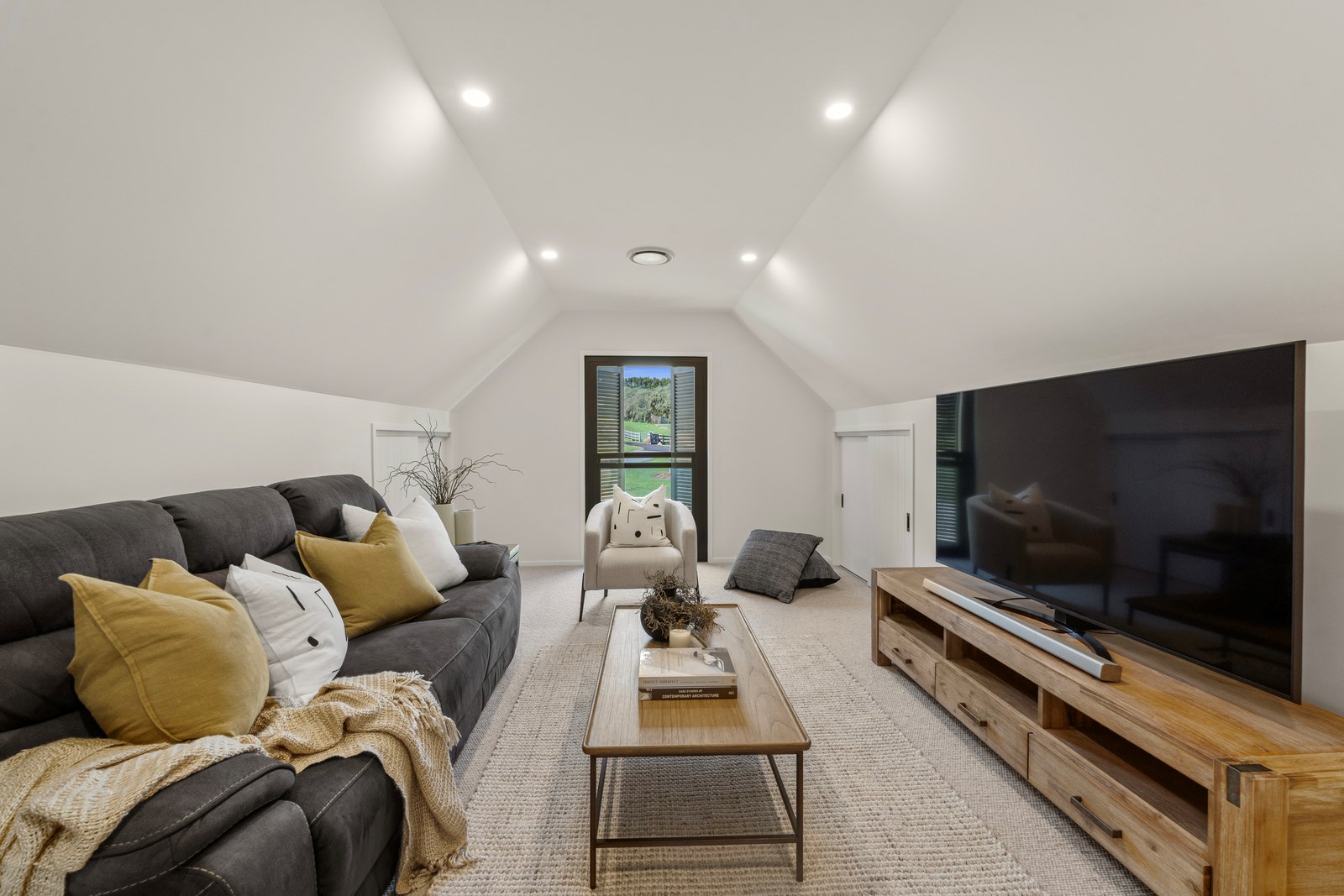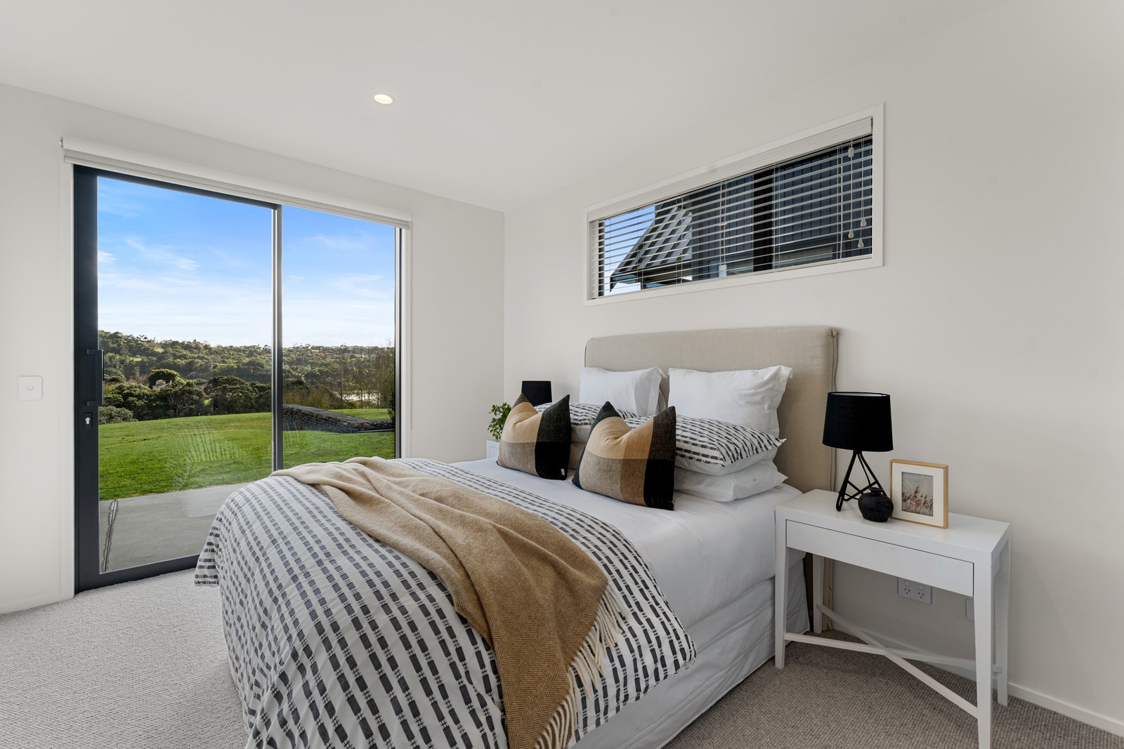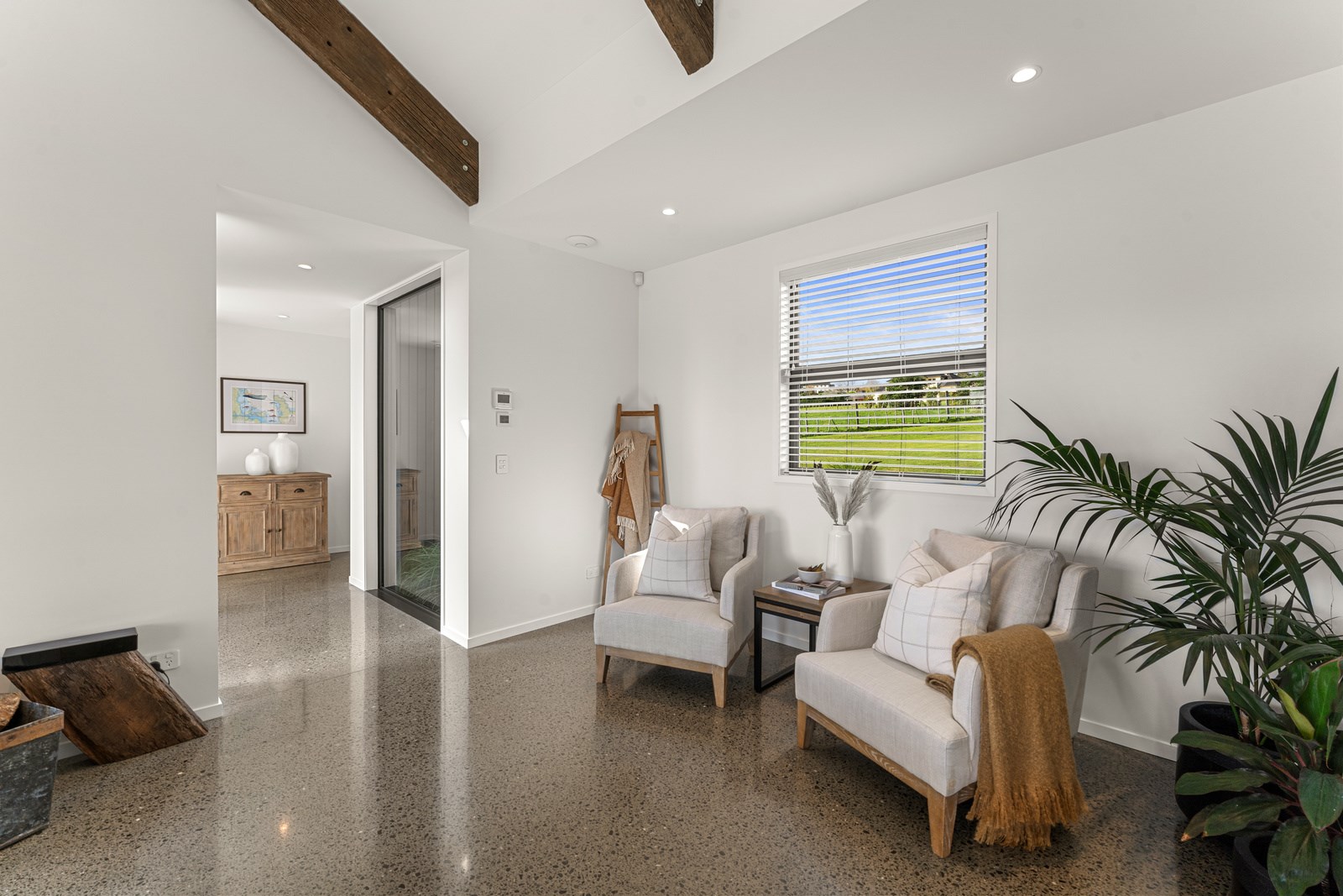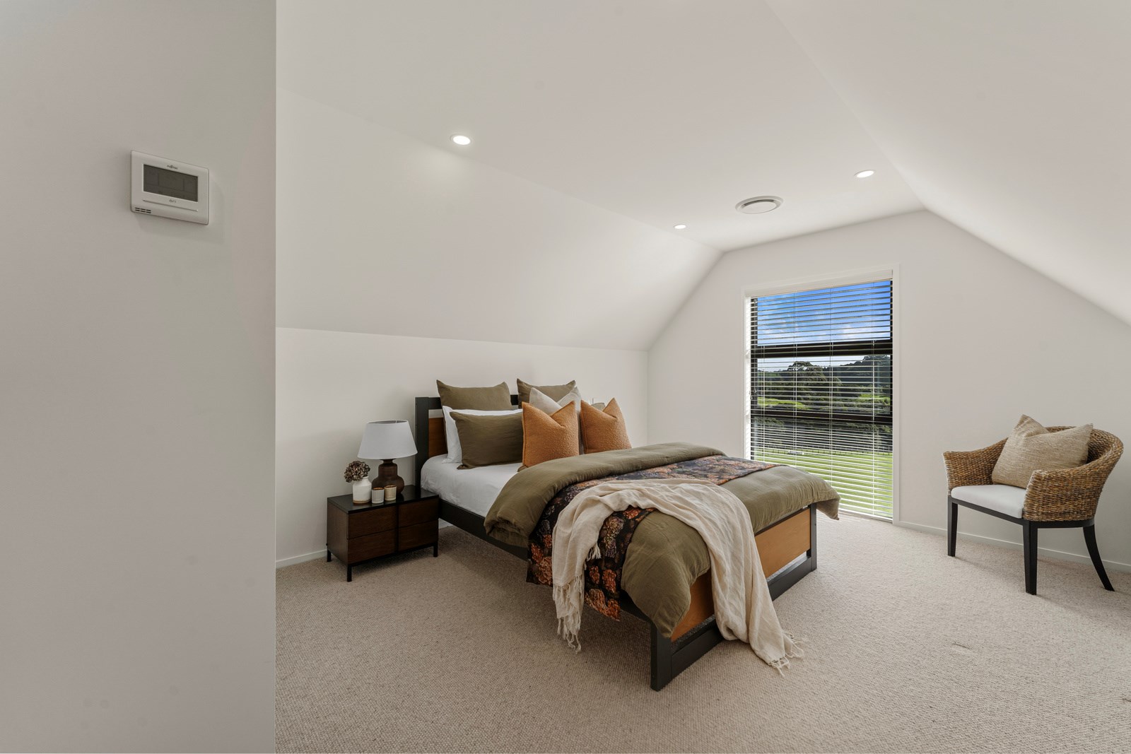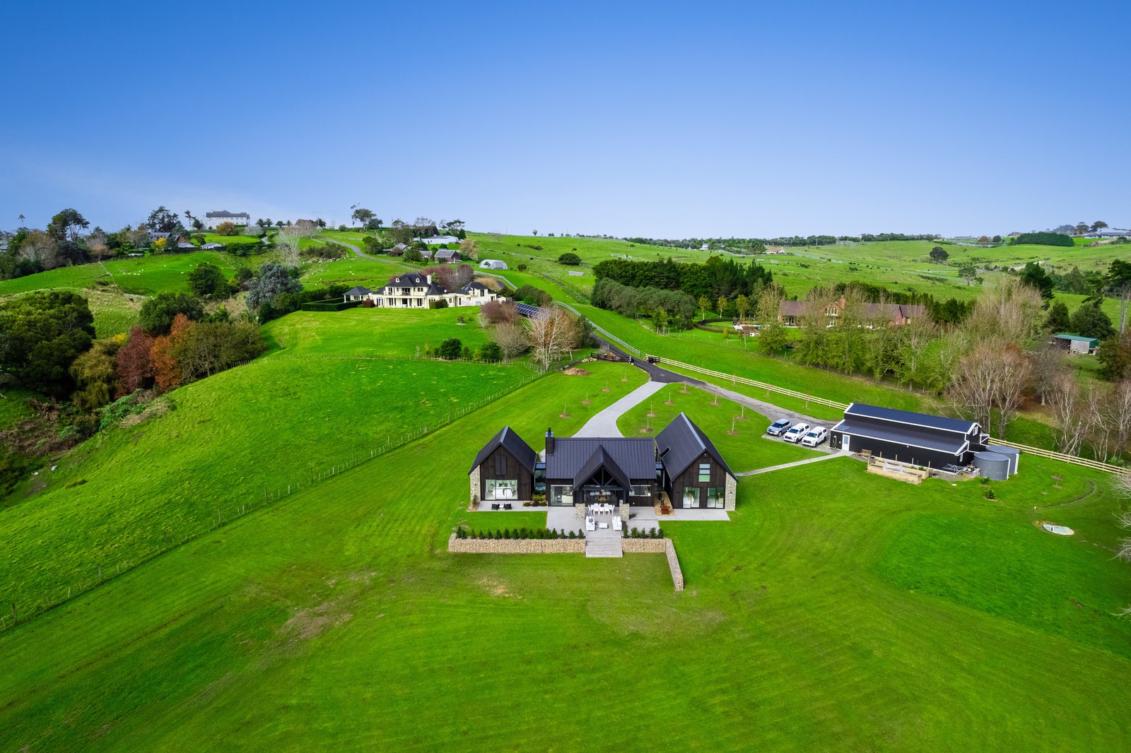 This rural 310sqm house juxtaposes the elegance of an old-style country homestead with all the mod cons. A long driveway leads to a schist and black cedar frontage sectioned into three and connected by glass hallways. On entry, a 2.7m feature stone wall complements the polished concrete floors and wooden ceiling trusses that are a hallmark of the main room. The living area features a wood-burning fireplace with stone mantel, and a sitting alcove creates a cosy nook. A vision for keen cooks, the kitchen features a barn door that provides access to the butler’s pantry. Both kitchen and dining share the benefits of the central sliding door that opens to the outdoor entertaining, overlooking the Mangemangeroa estuary. Four bedrooms occupy the wings of the home, with the carpeted main bedroom leading off the living zone. This impressive room has a gabled ceiling, outdoor access and a spacious ensuite and walk-in dressing room. Behind the kitchen a second glass link leads to a two-storey wing. On the ground floor there are two bedrooms, a bathroom, separate toilet and double garage with laundry. Carpeted stairs lead upstairs to a delightful fourth bedroom and lounge/media room.