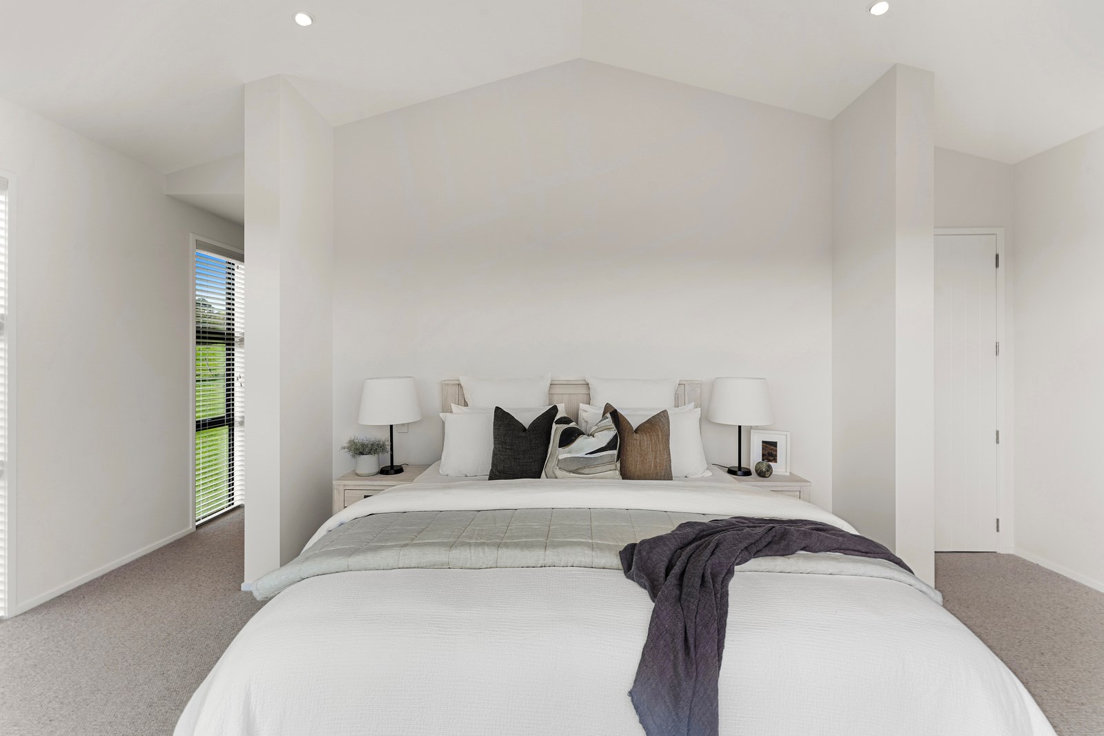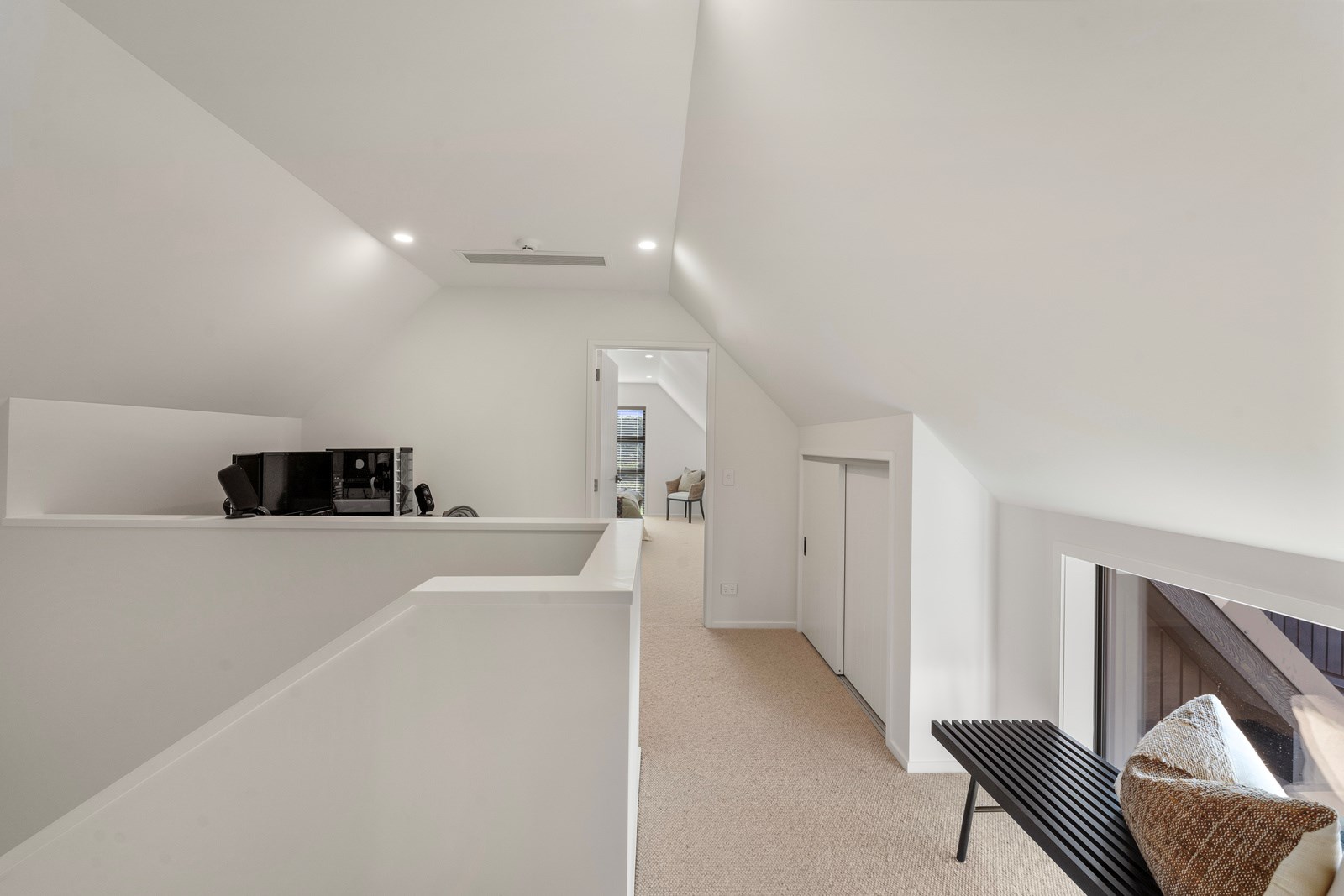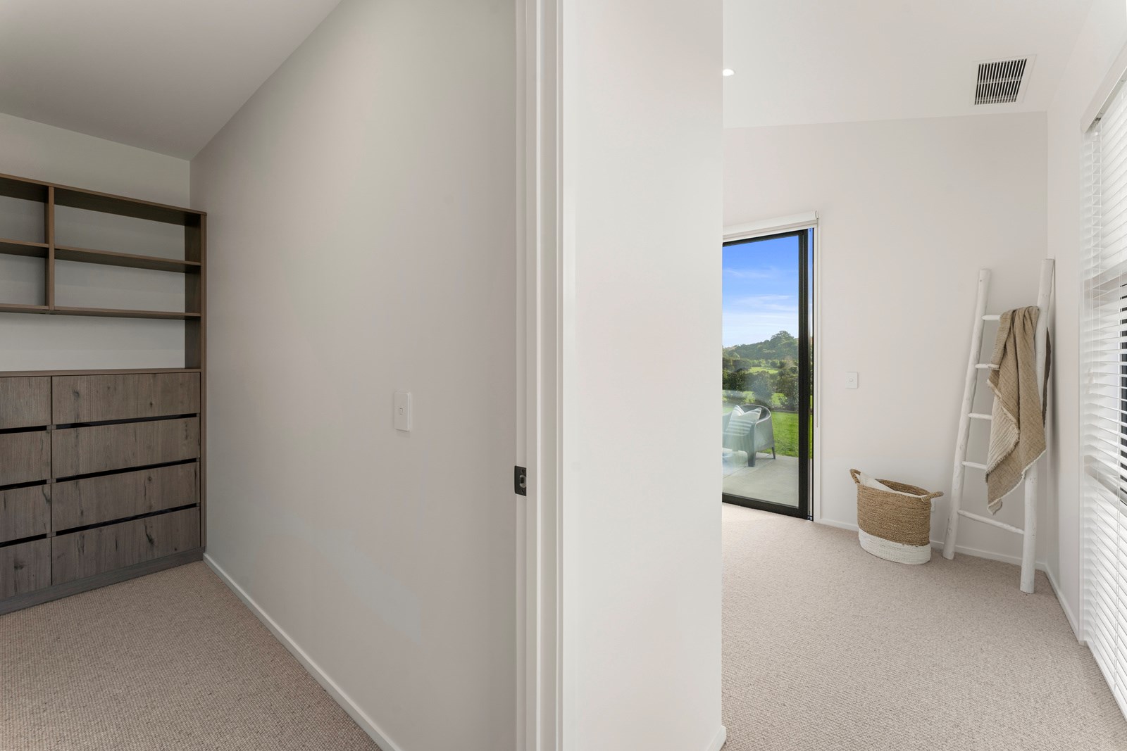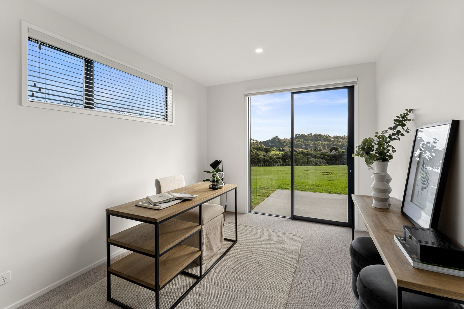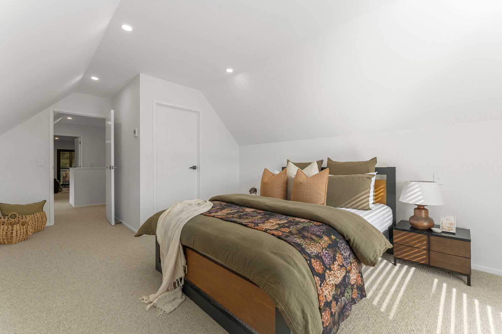 This rural 310sqm house juxtaposes the elegance of an old-style country homestead with all the mod cons. A long driveway leads to a schist and black cedar frontage sectioned into three and connected by glass hallways. On entry, a 2.7m feature stone wall complements the polished concrete floors and wooden ceiling trusses that are a hallmark of the main room. The living area features a wood-burning fireplace with stone mantel, and a sitting alcove creates a cosy nook. A vision for keen cooks, the kitchen features a barn door that provides access to the butler’s pantry. Both kitchen and dining share the benefits of the central sliding door that opens to the outdoor entertaining, overlooking the Mangemangeroa estuary. Four bedrooms occupy the wings of the home, with the carpeted main bedroom leading off the living zone. This impressive room has a gabled ceiling, outdoor access and a spacious ensuite and walk-in dressing room. Behind the kitchen a second glass link leads to a two-storey wing. On the ground floor there are two bedrooms, a bathroom, separate toilet and double garage with laundry. Carpeted stairs lead upstairs to a delightful fourth bedroom and lounge/media room.