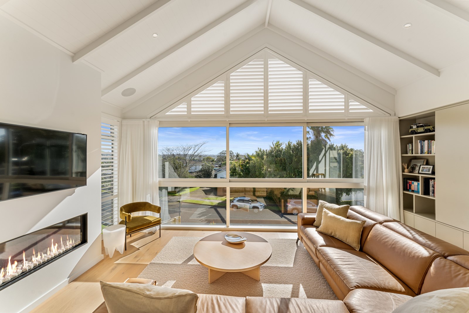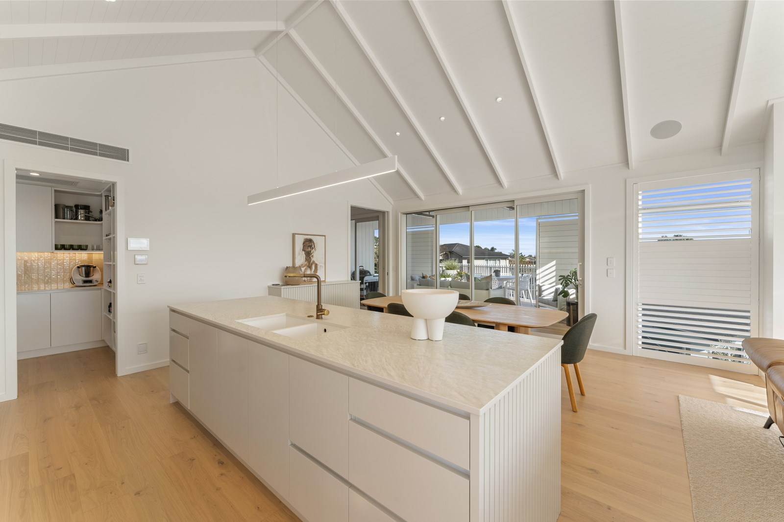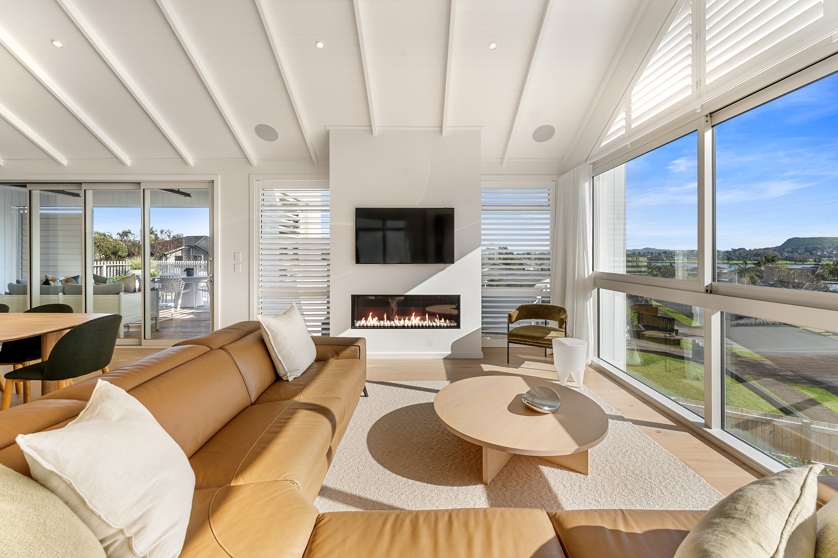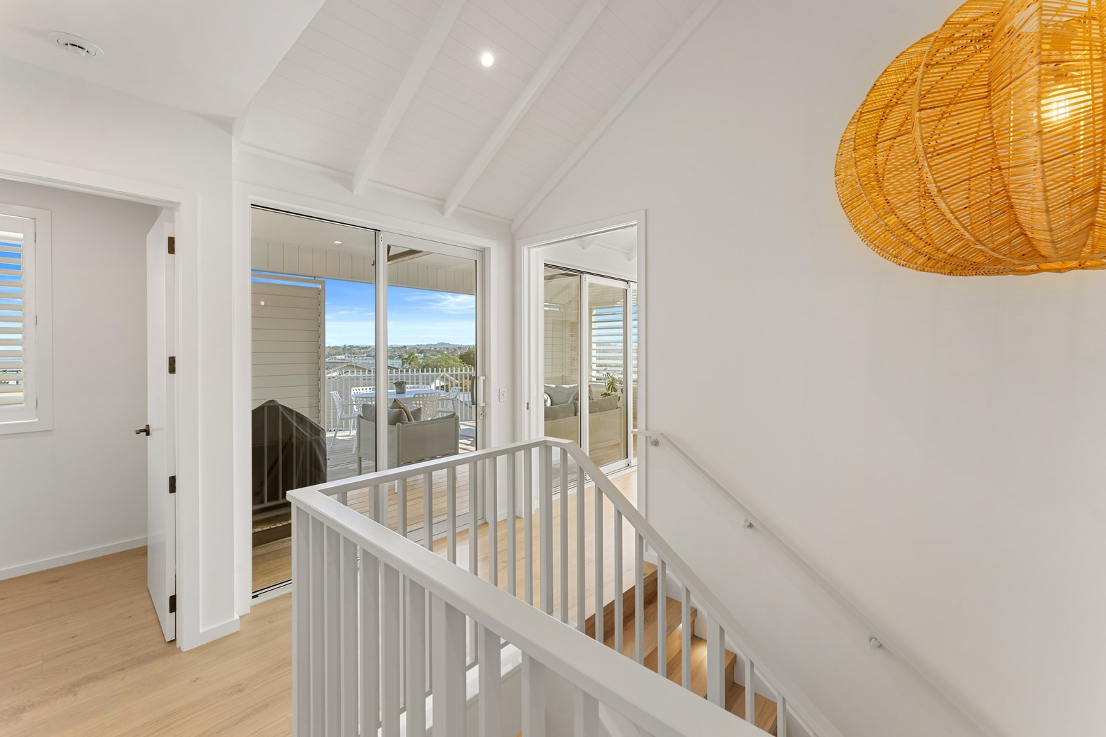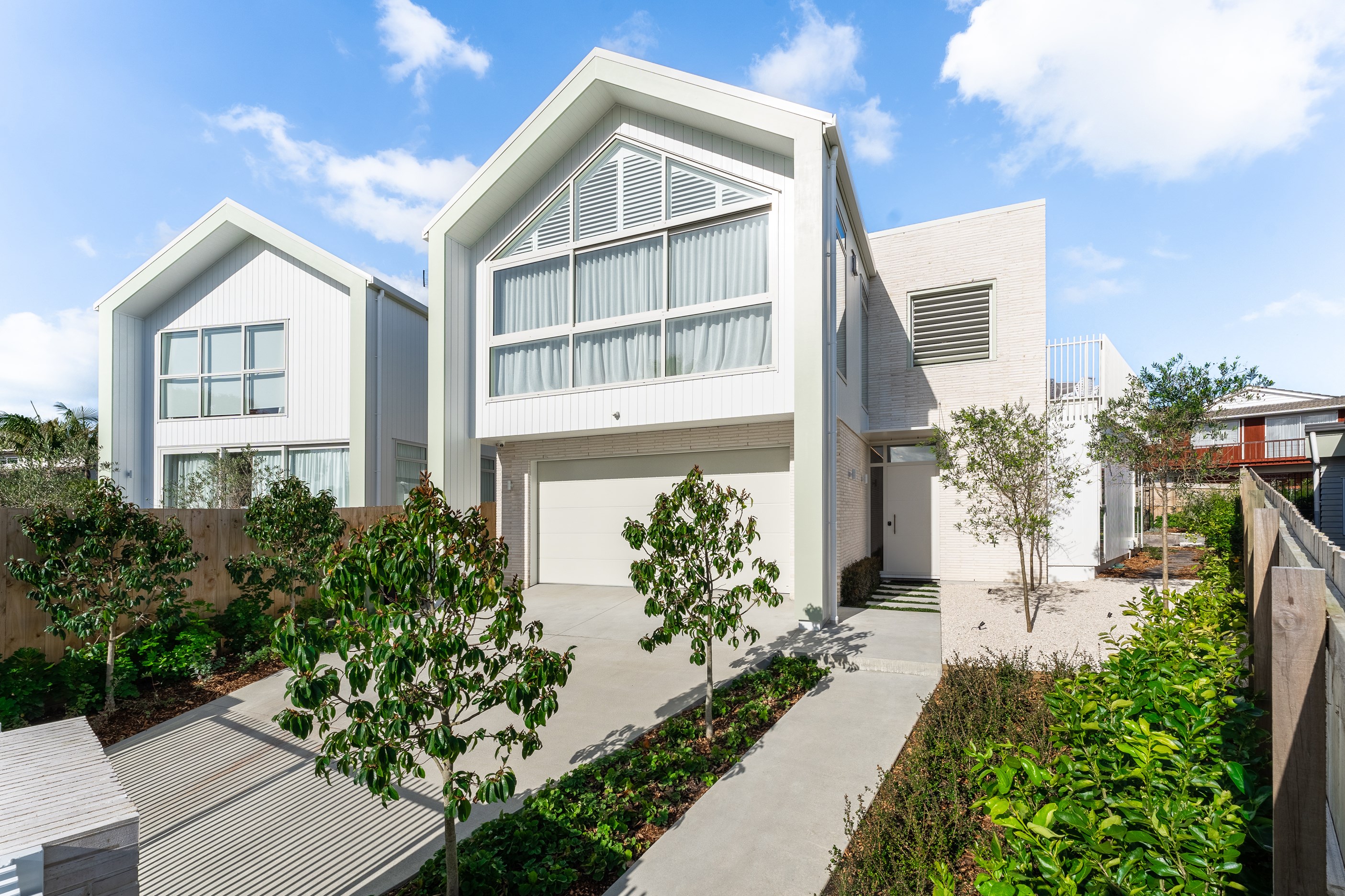 Standing tall and drinking in the sunshine, this two-level, three-bedroom, two-bathroom house is a vision in white. Above the double garage, a large gabled window takes full advantage of the north-eastern outlook. Entry is on the right; from here take the stairs up to a bright, inviting open-plan room that makes full use of natural light. This space is white with light wood-effect floors and a gabled ceiling. The living zone, positioned to optimise the view of Rangitoto Island and Auckland’s CBD, has a rear-vented gas fireplace with a recessed TV above, which means you’ll be entertained no matter which way you look. The white kitchen boasts a five-hob gas cooktop, and a large scullery for an array of gadgets and goodies. Adjoining it is the dining area, beyond which an angled timber deck is a great place to watch the sunset. The main bedroom features a handy chute for sending washing to the downstairs laundry, and a tiled ensuite in muted tones, with a double vanity, freestanding bath and shower. Downstairs, two more bedrooms have their own bathroom with a tiled shower. Cross the hallway by the entrance and you’re in a second living area with its own bathroom — perfect as a guest suite or for teenagers.