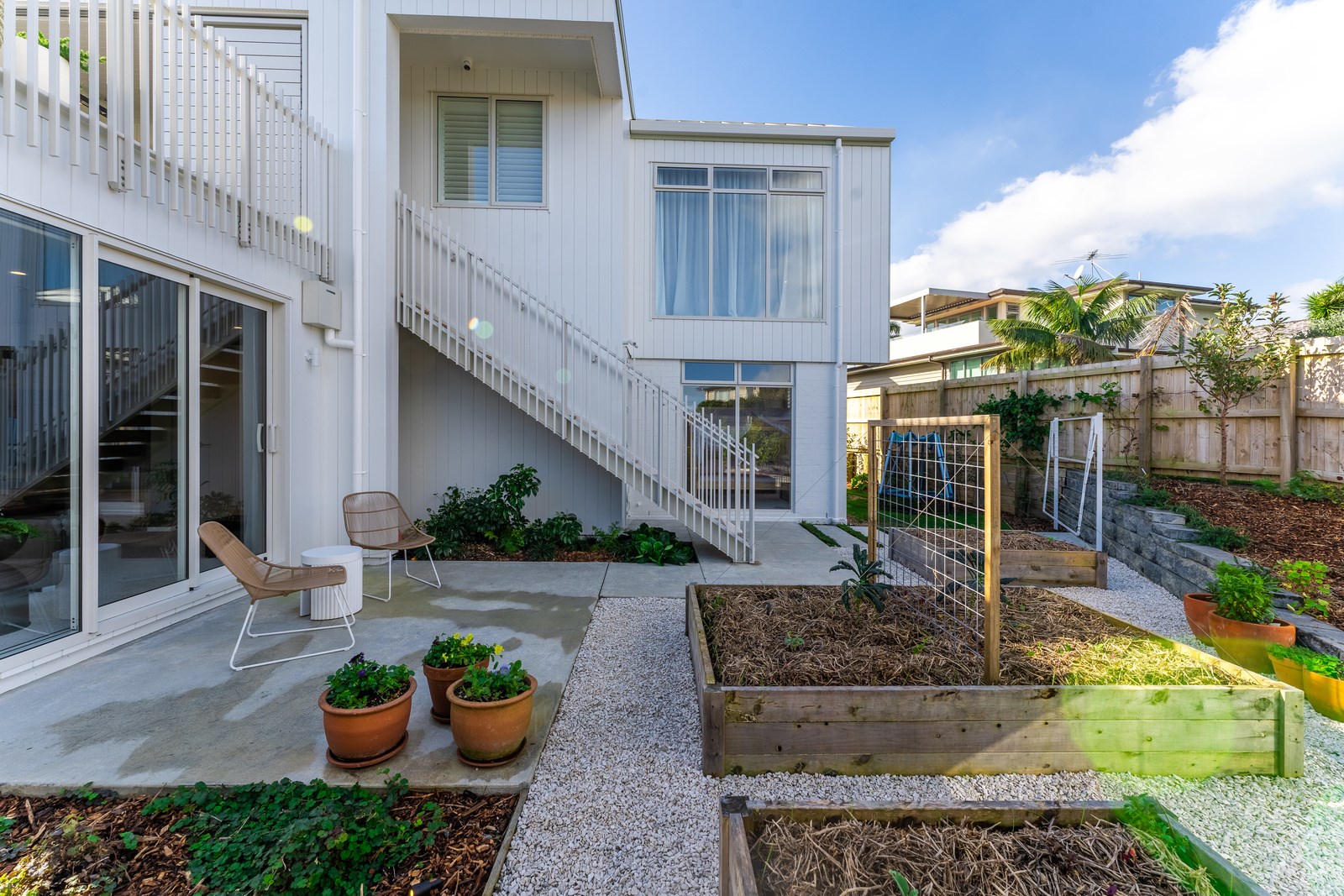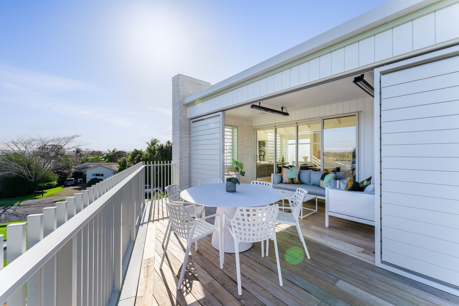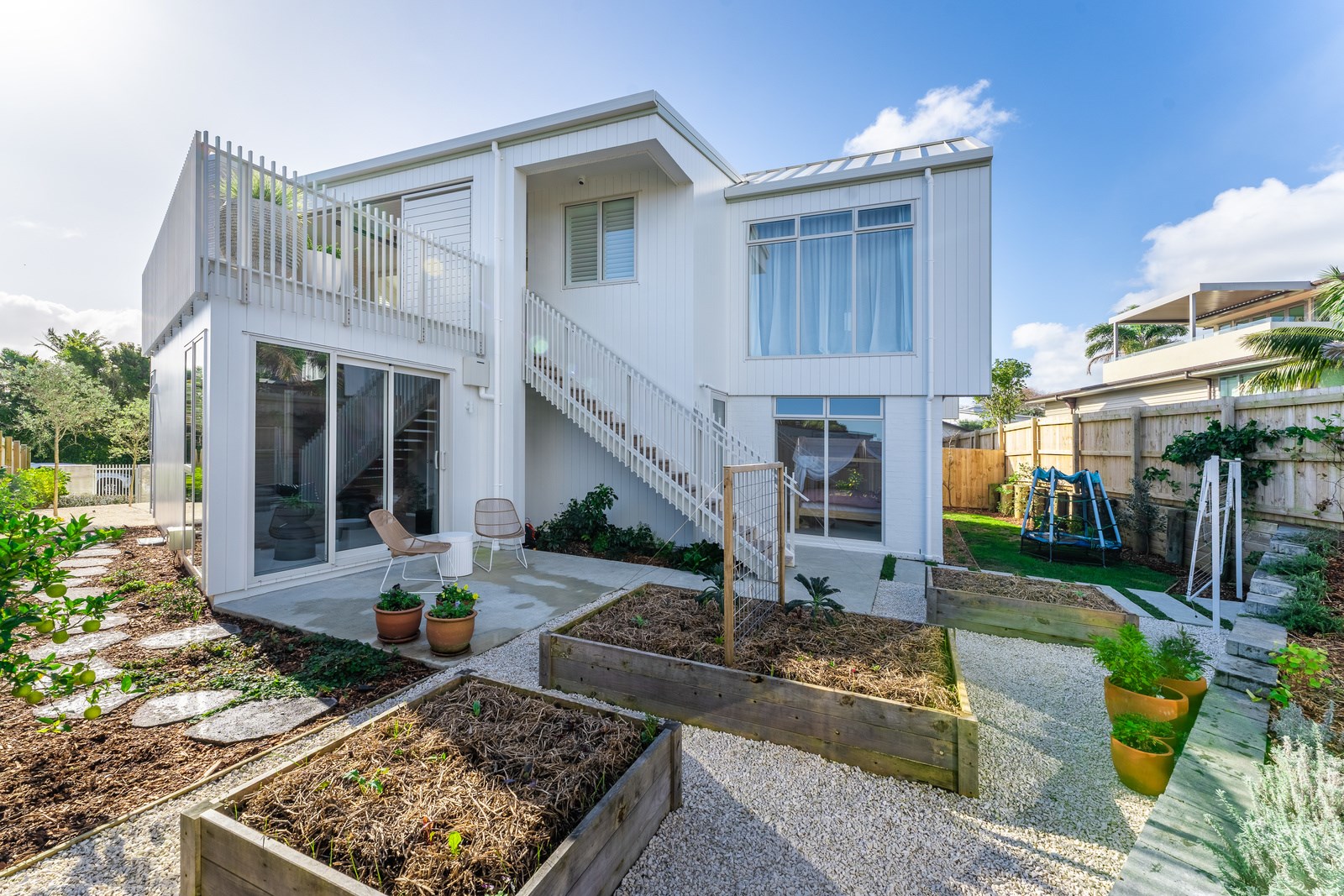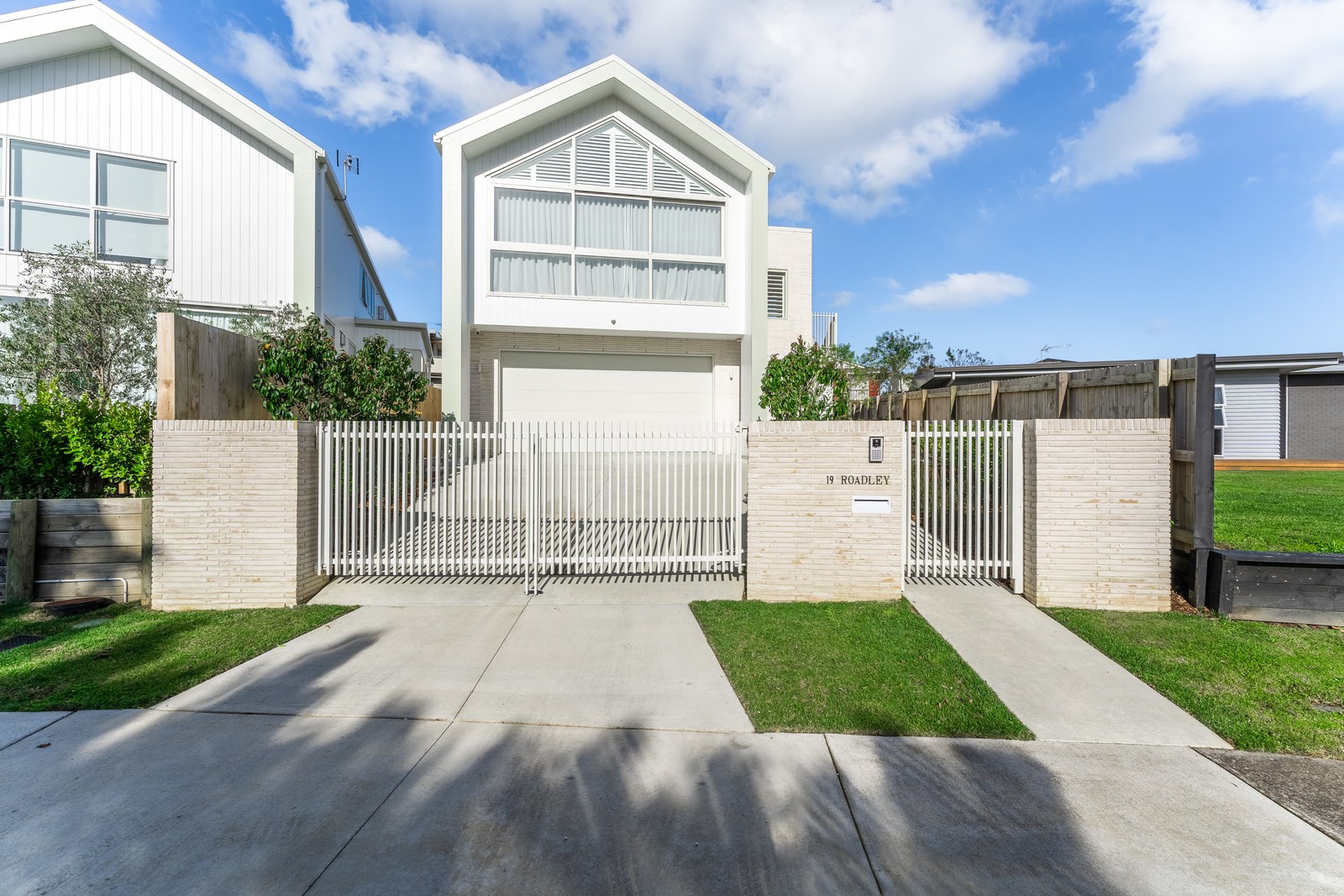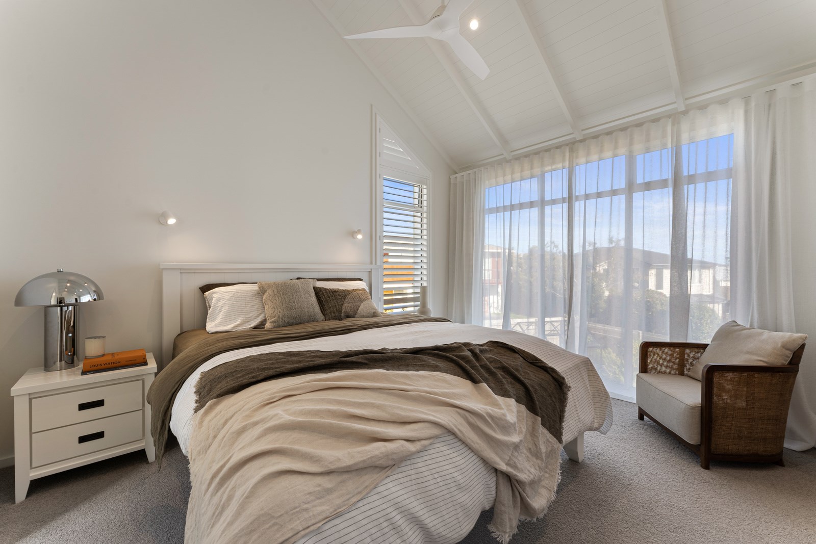 Standing tall and drinking in the sunshine, this two-level, three-bedroom, two-bathroom house is a vision in white. Above the double garage, a large gabled window takes full advantage of the north-eastern outlook. Entry is on the right; from here take the stairs up to a bright, inviting open-plan room that makes full use of natural light. This space is white with light wood-effect floors and a gabled ceiling. The living zone, positioned to optimise the view of Rangitoto Island and Auckland’s CBD, has a rear-vented gas fireplace with a recessed TV above, which means you’ll be entertained no matter which way you look. The white kitchen boasts a five-hob gas cooktop, and a large scullery for an array of gadgets and goodies. Adjoining it is the dining area, beyond which an angled timber deck is a great place to watch the sunset. The main bedroom features a handy chute for sending washing to the downstairs laundry, and a tiled ensuite in muted tones, with a double vanity, freestanding bath and shower. Downstairs, two more bedrooms have their own bathroom with a tiled shower. Cross the hallway by the entrance and you’re in a second living area with its own bathroom — perfect as a guest suite or for teenagers.