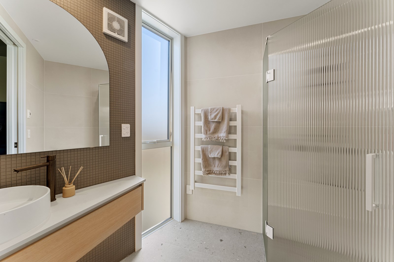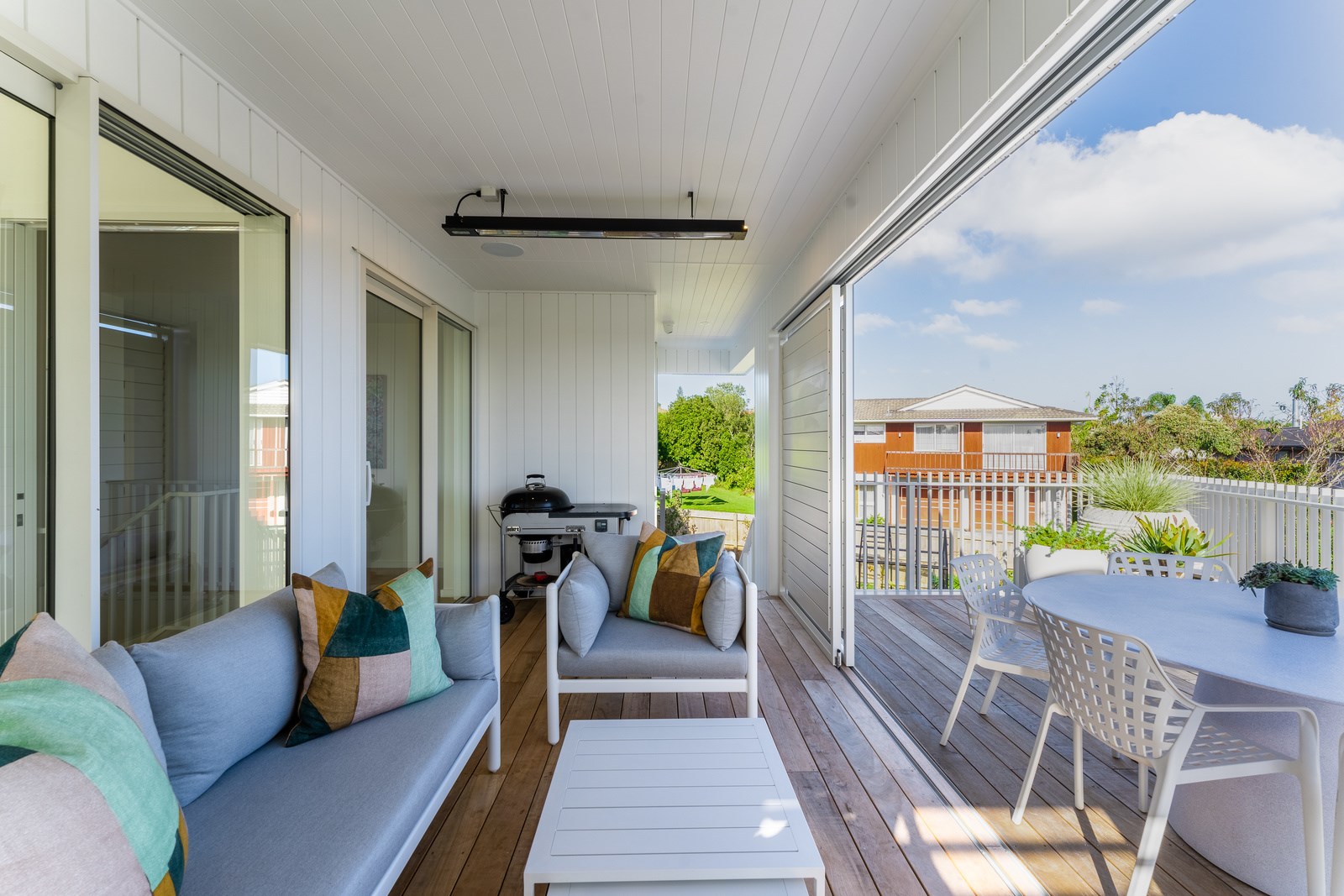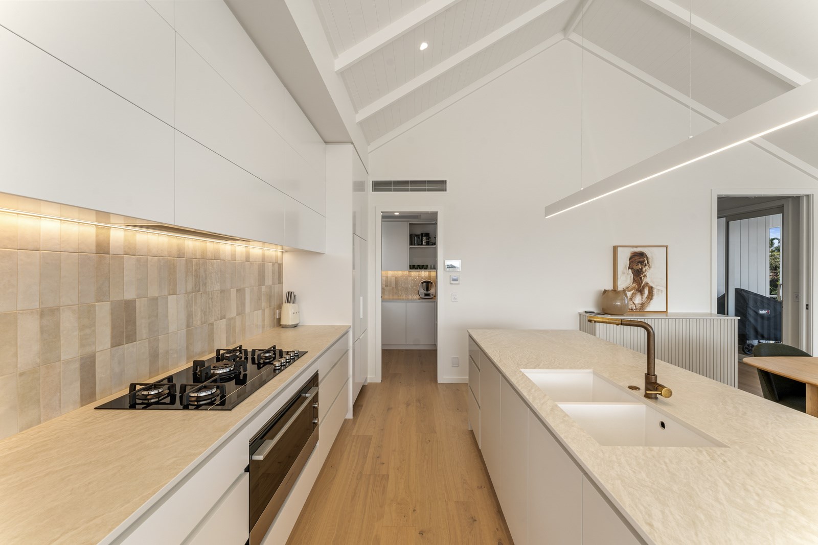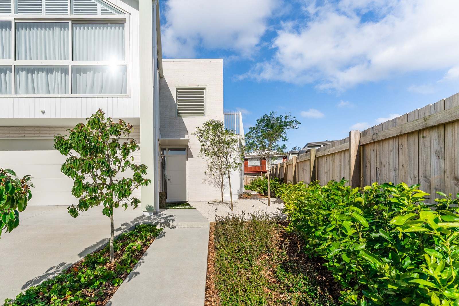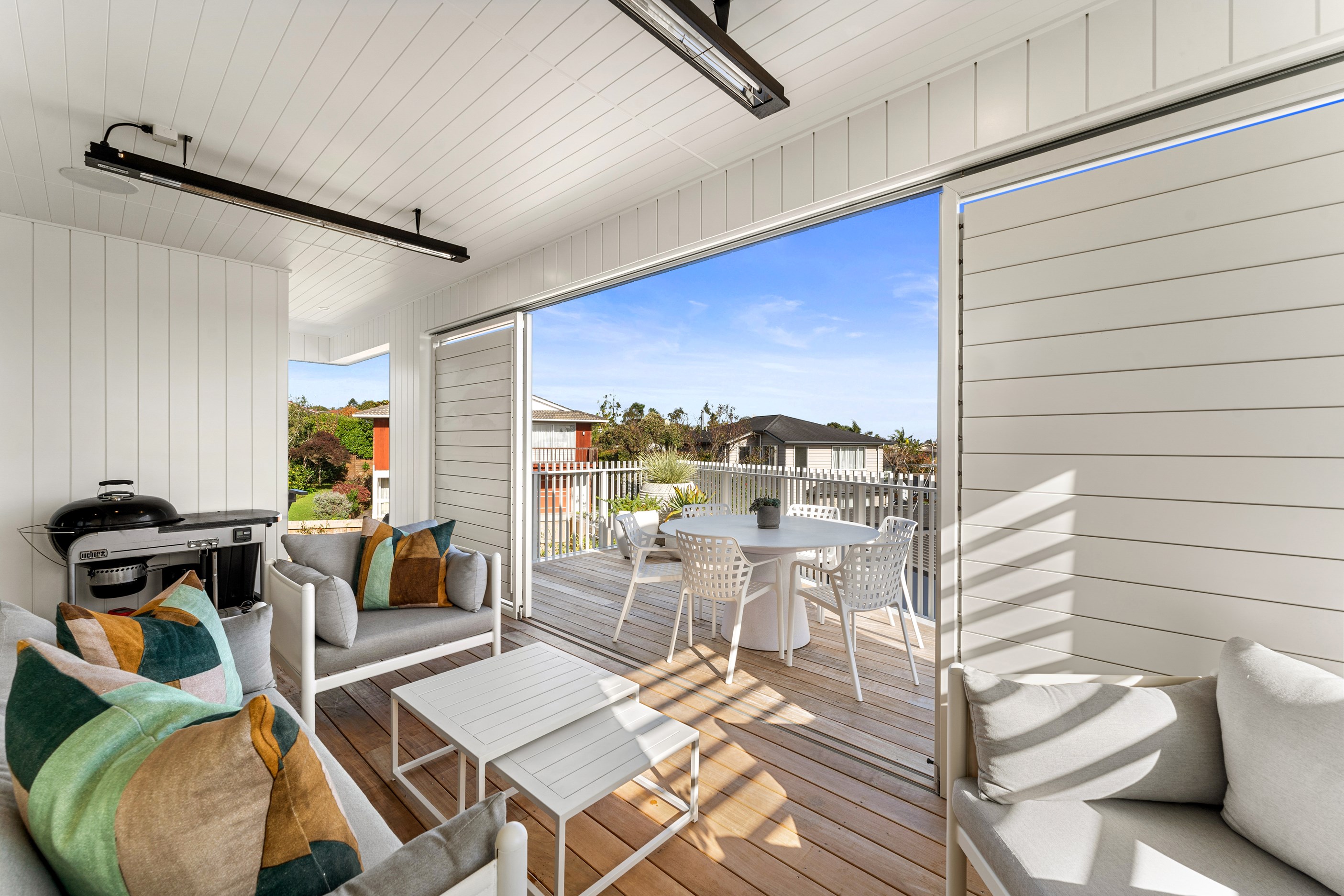 Standing tall and drinking in the sunshine, this two-level, three-bedroom, two-bathroom house is a vision in white. Above the double garage, a large gabled window takes full advantage of the north-eastern outlook. Entry is on the right; from here take the stairs up to a bright, inviting open-plan room that makes full use of natural light. This space is white with light wood-effect floors and a gabled ceiling. The living zone, positioned to optimise the view of Rangitoto Island and Auckland’s CBD, has a rear-vented gas fireplace with a recessed TV above, which means you’ll be entertained no matter which way you look. The white kitchen boasts a five-hob gas cooktop, and a large scullery for an array of gadgets and goodies. Adjoining it is the dining area, beyond which an angled timber deck is a great place to watch the sunset. The main bedroom features a handy chute for sending washing to the downstairs laundry, and a tiled ensuite in muted tones, with a double vanity, freestanding bath and shower. Downstairs, two more bedrooms have their own bathroom with a tiled shower. Cross the hallway by the entrance and you’re in a second living area with its own bathroom — perfect as a guest suite or for teenagers.