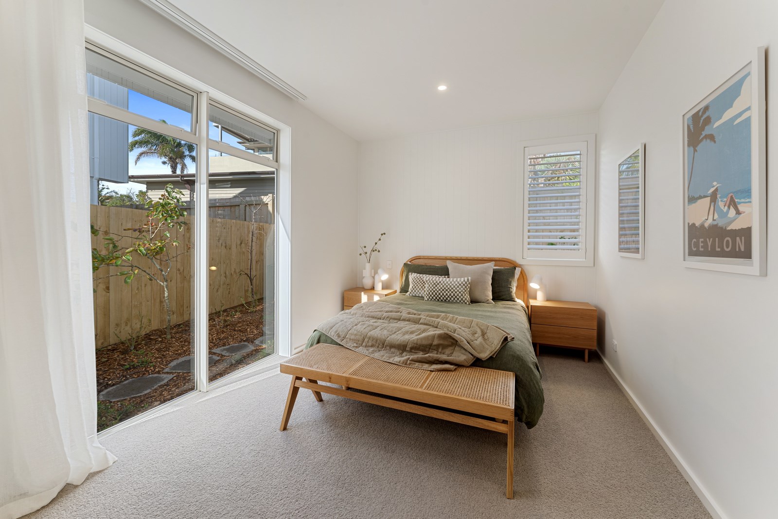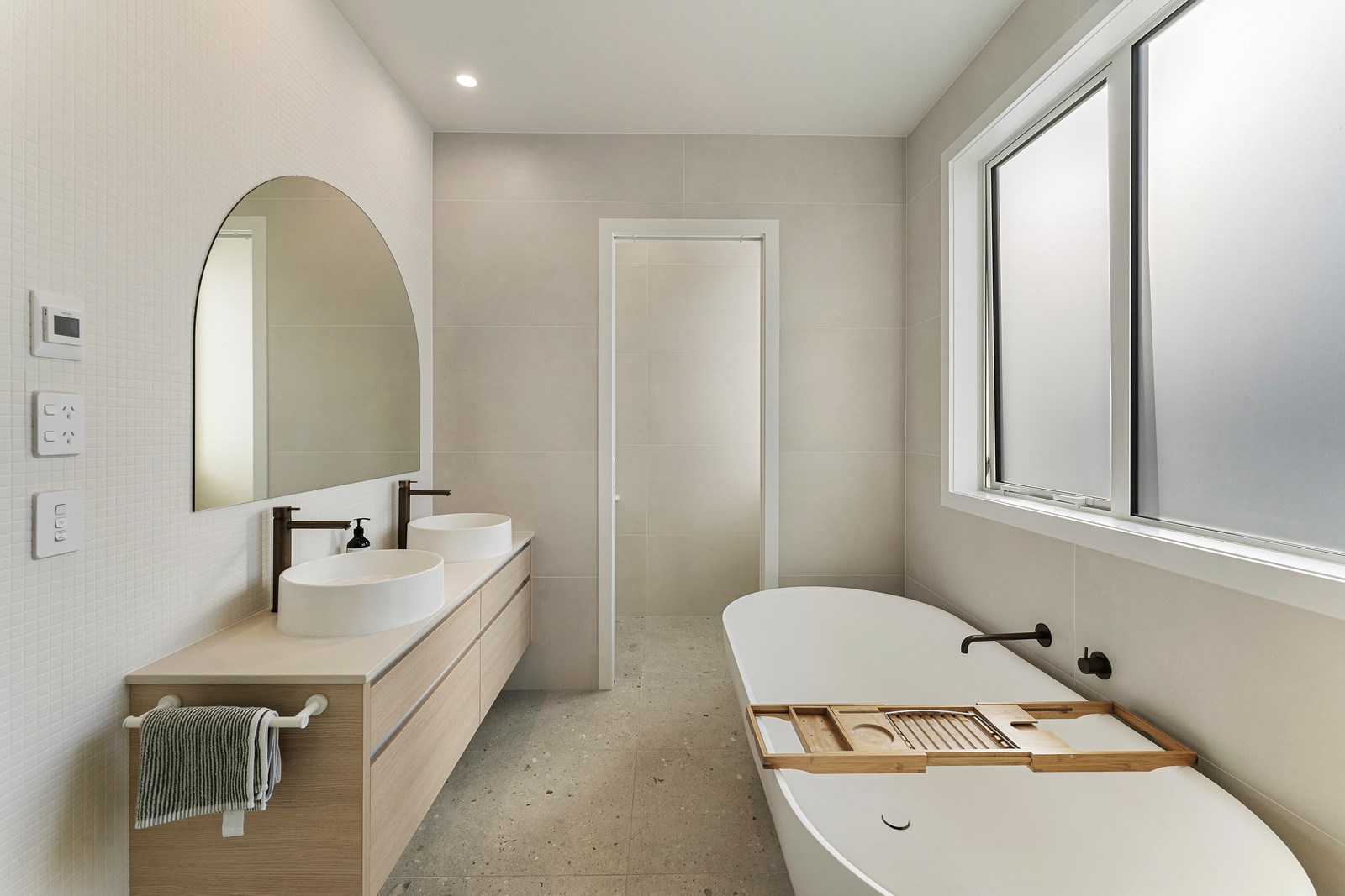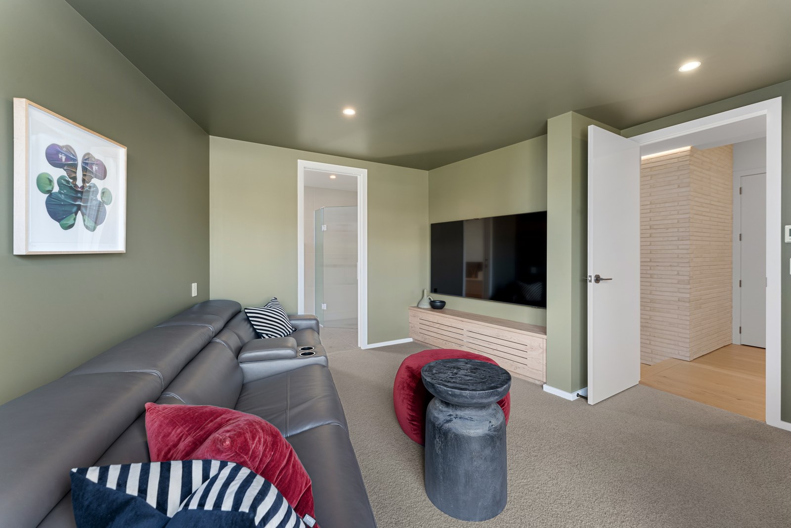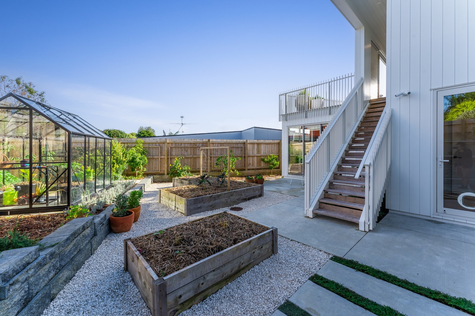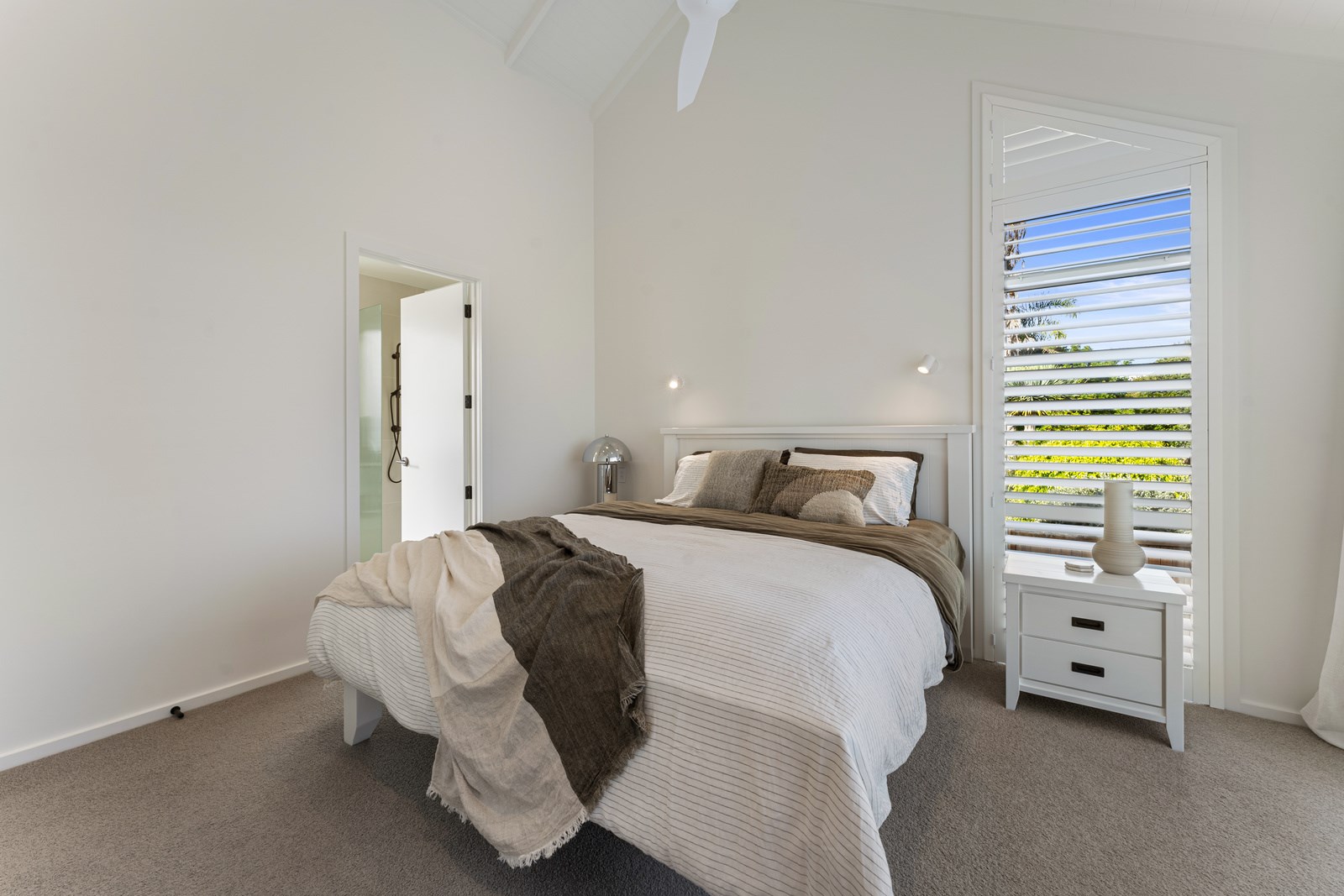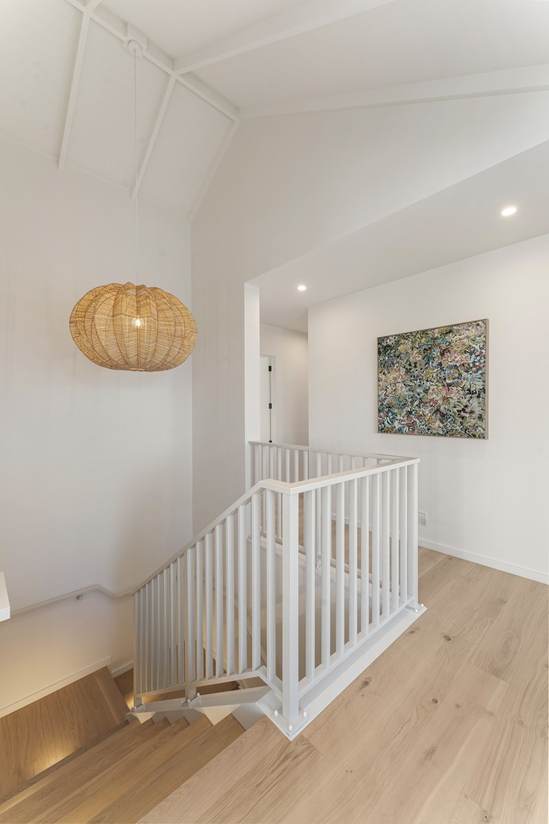 Standing tall and drinking in the sunshine, this two-level, three-bedroom, two-bathroom house is a vision in white. Above the double garage, a large gabled window takes full advantage of the north-eastern outlook. Entry is on the right; from here take the stairs up to a bright, inviting open-plan room that makes full use of natural light. This space is white with light wood-effect floors and a gabled ceiling. The living zone, positioned to optimise the view of Rangitoto Island and Auckland’s CBD, has a rear-vented gas fireplace with a recessed TV above, which means you’ll be entertained no matter which way you look. The white kitchen boasts a five-hob gas cooktop, and a large scullery for an array of gadgets and goodies. Adjoining it is the dining area, beyond which an angled timber deck is a great place to watch the sunset. The main bedroom features a handy chute for sending washing to the downstairs laundry, and a tiled ensuite in muted tones, with a double vanity, freestanding bath and shower. Downstairs, two more bedrooms have their own bathroom with a tiled shower. Cross the hallway by the entrance and you’re in a second living area with its own bathroom — perfect as a guest suite or for teenagers.