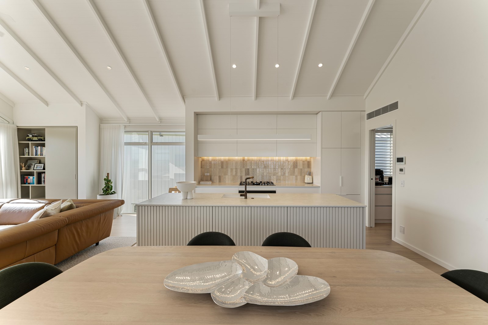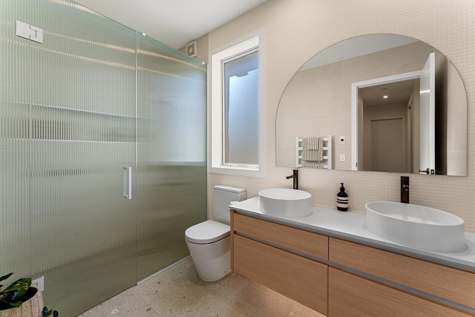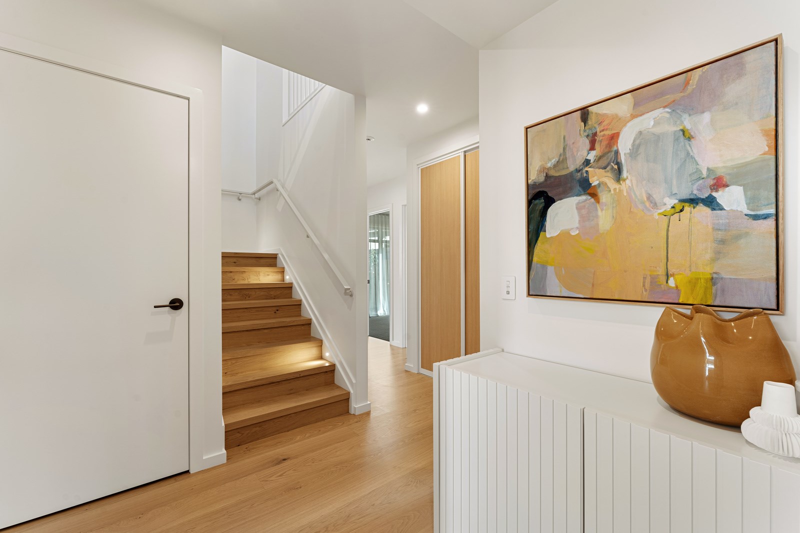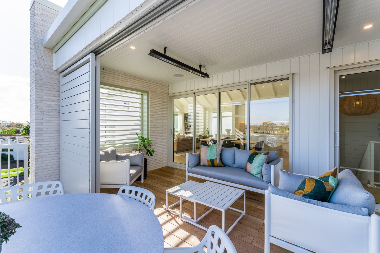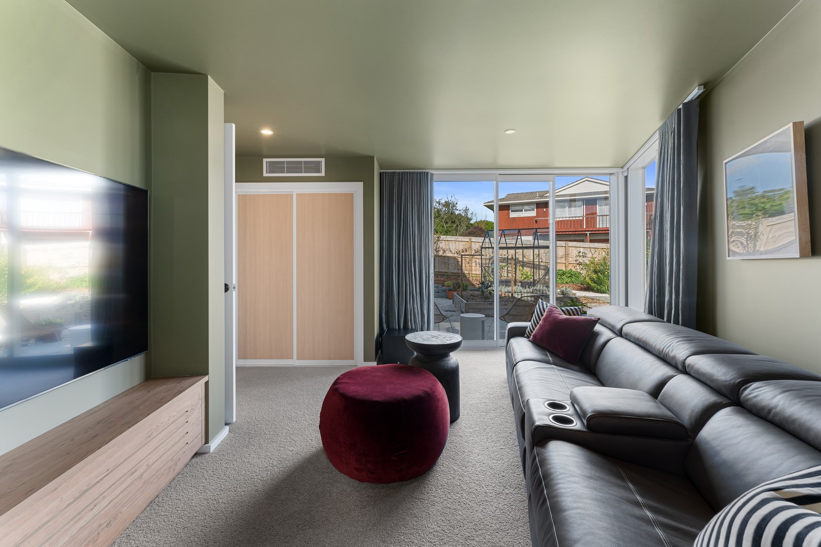 Standing tall and drinking in the sunshine, this two-level, three-bedroom, two-bathroom house is a vision in white. Above the double garage, a large gabled window takes full advantage of the north-eastern outlook. Entry is on the right; from here take the stairs up to a bright, inviting open-plan room that makes full use of natural light. This space is white with light wood-effect floors and a gabled ceiling. The living zone, positioned to optimise the view of Rangitoto Island and Auckland’s CBD, has a rear-vented gas fireplace with a recessed TV above, which means you’ll be entertained no matter which way you look. The white kitchen boasts a five-hob gas cooktop, and a large scullery for an array of gadgets and goodies. Adjoining it is the dining area, beyond which an angled timber deck is a great place to watch the sunset. The main bedroom features a handy chute for sending washing to the downstairs laundry, and a tiled ensuite in muted tones, with a double vanity, freestanding bath and shower. Downstairs, two more bedrooms have their own bathroom with a tiled shower. Cross the hallway by the entrance and you’re in a second living area with its own bathroom — perfect as a guest suite or for teenagers.