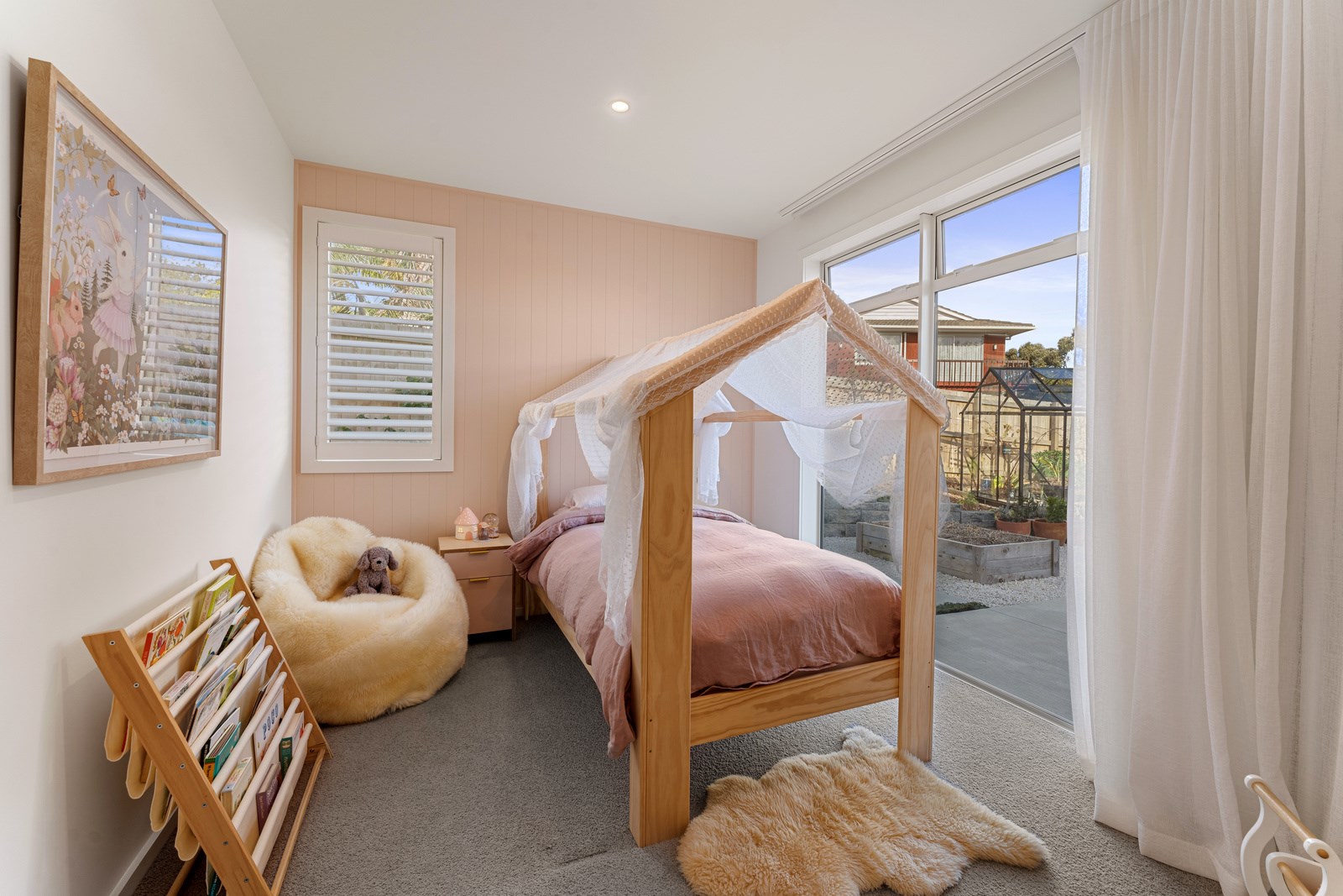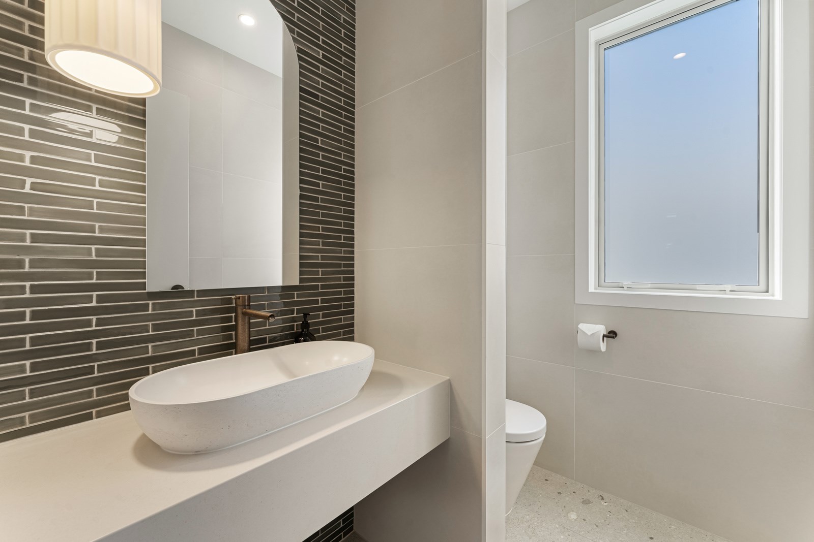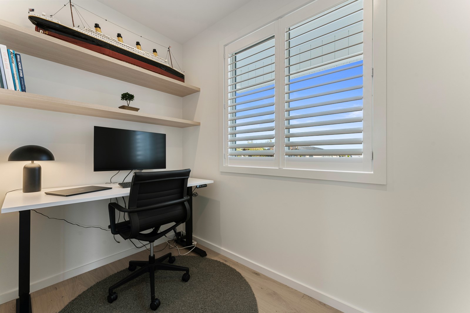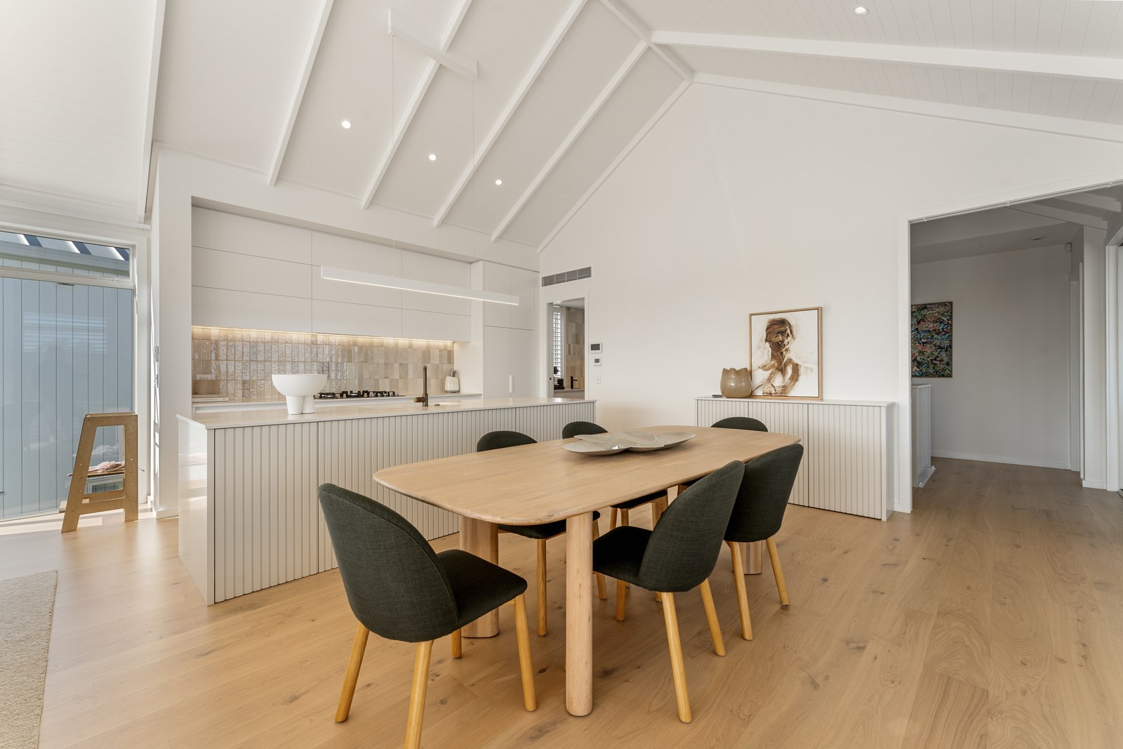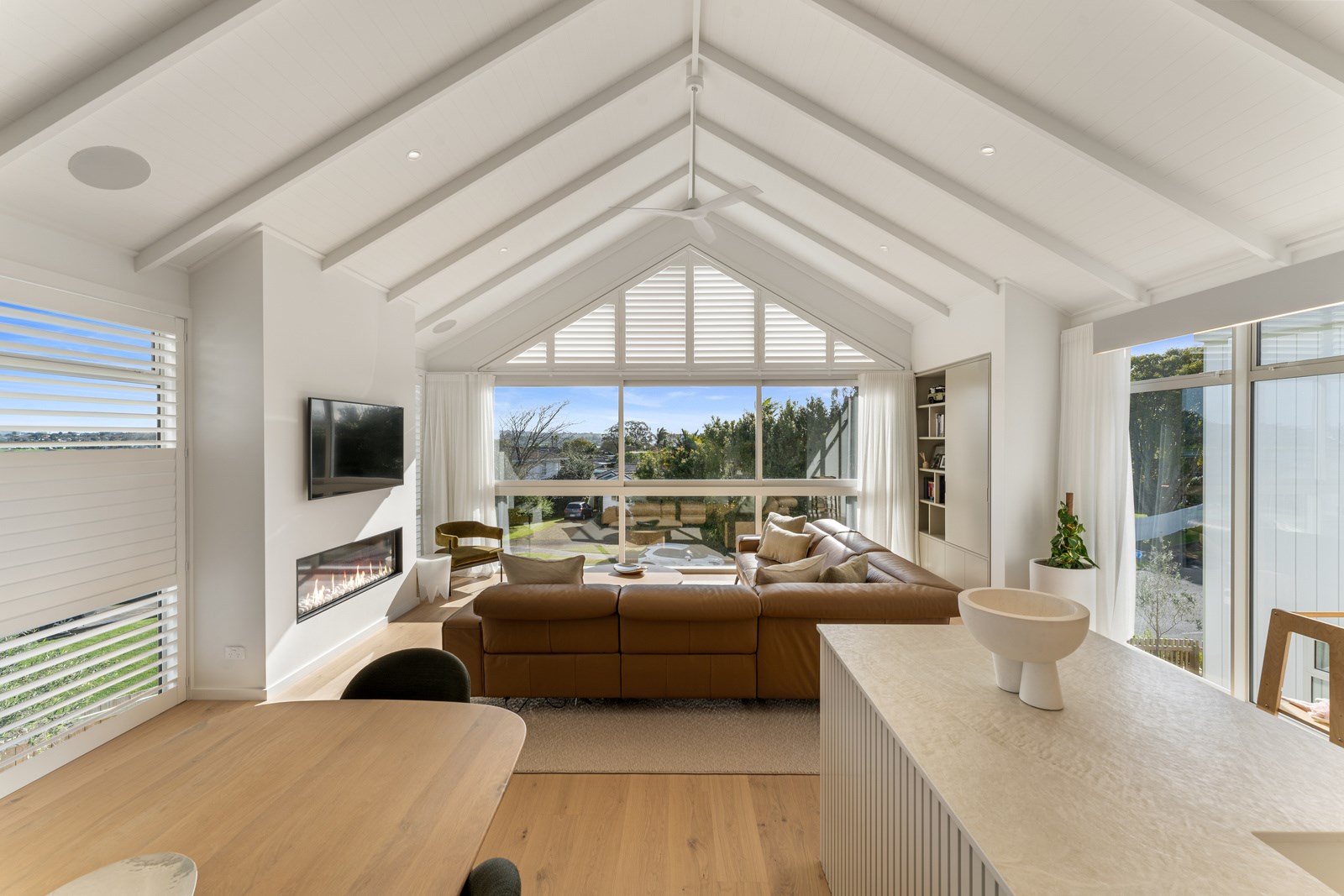 Standing tall and drinking in the sunshine, this two-level, three-bedroom, two-bathroom house is a vision in white. Above the double garage, a large gabled window takes full advantage of the north-eastern outlook. Entry is on the right; from here take the stairs up to a bright, inviting open-plan room that makes full use of natural light. This space is white with light wood-effect floors and a gabled ceiling. The living zone, positioned to optimise the view of Rangitoto Island and Auckland’s CBD, has a rear-vented gas fireplace with a recessed TV above, which means you’ll be entertained no matter which way you look. The white kitchen boasts a five-hob gas cooktop, and a large scullery for an array of gadgets and goodies. Adjoining it is the dining area, beyond which an angled timber deck is a great place to watch the sunset. The main bedroom features a handy chute for sending washing to the downstairs laundry, and a tiled ensuite in muted tones, with a double vanity, freestanding bath and shower. Downstairs, two more bedrooms have their own bathroom with a tiled shower. Cross the hallway by the entrance and you’re in a second living area with its own bathroom — perfect as a guest suite or for teenagers.