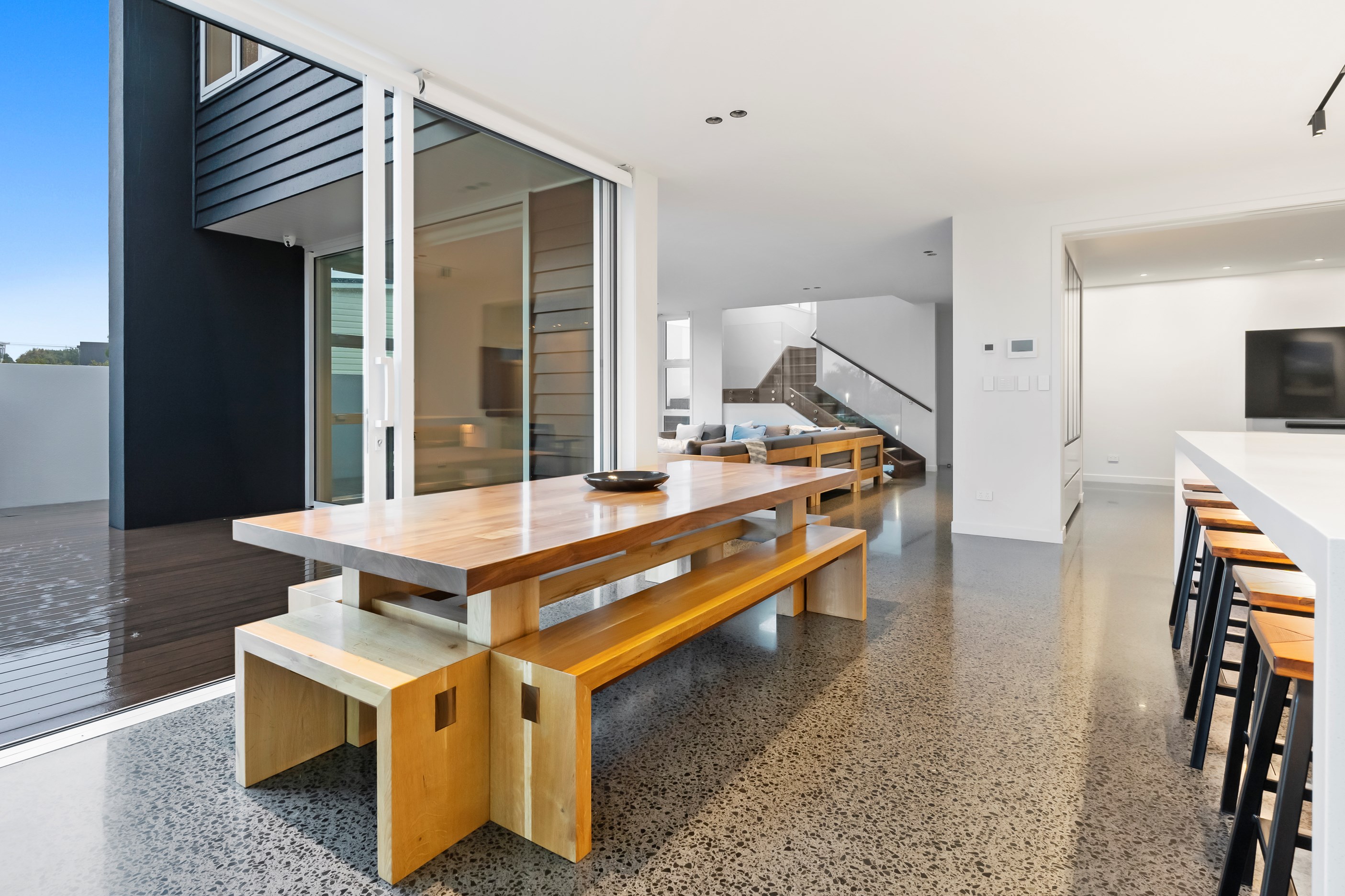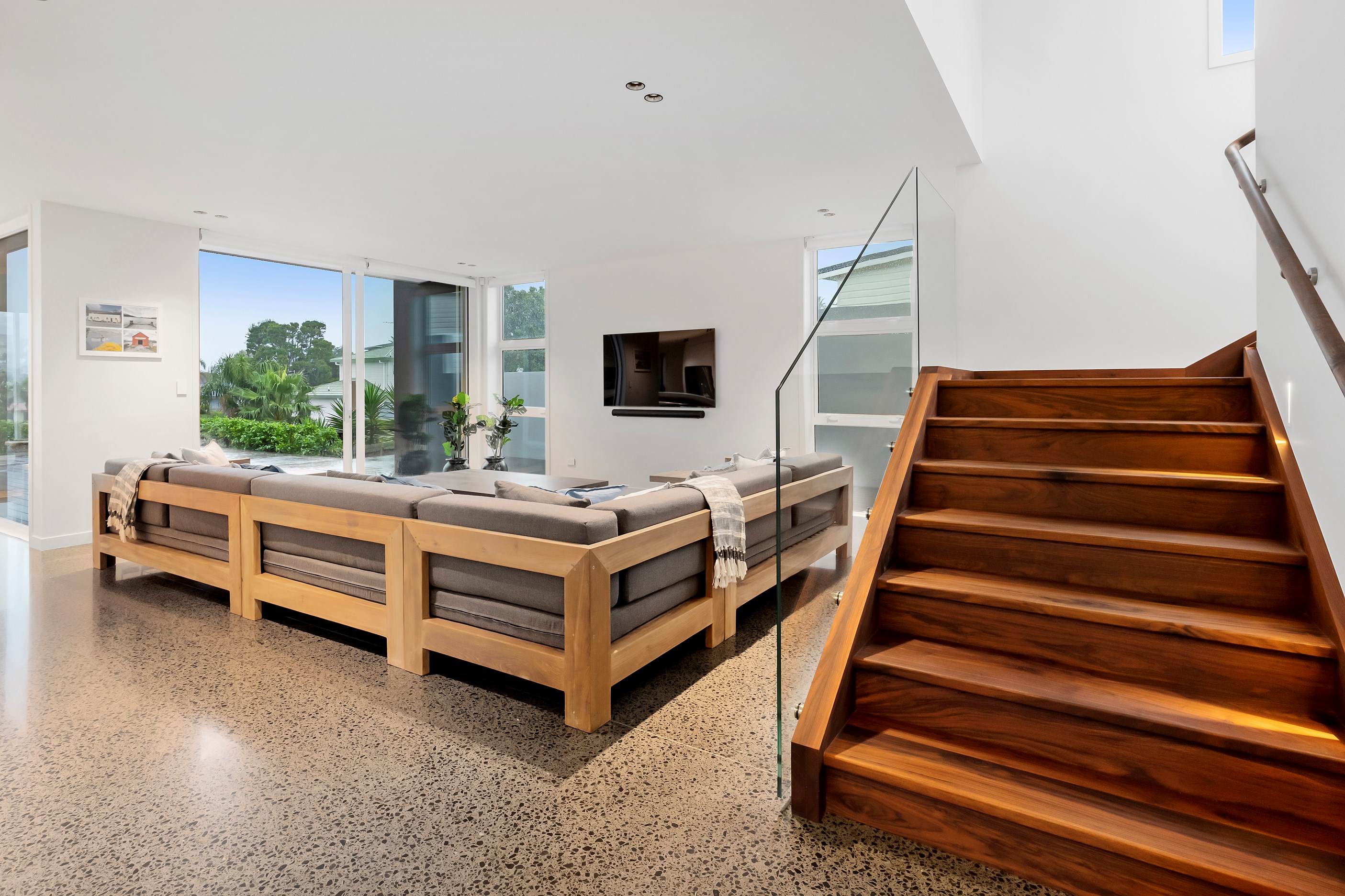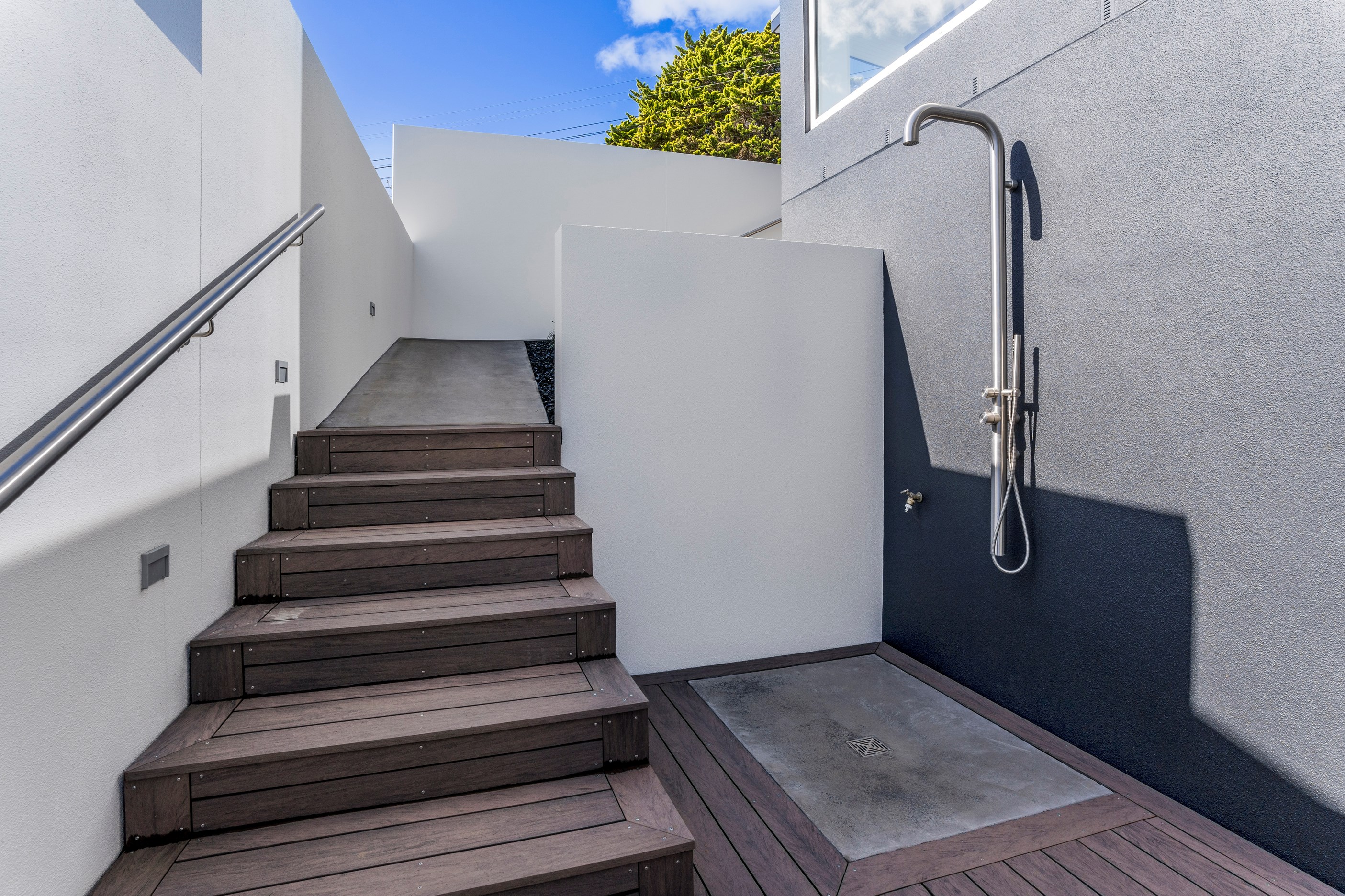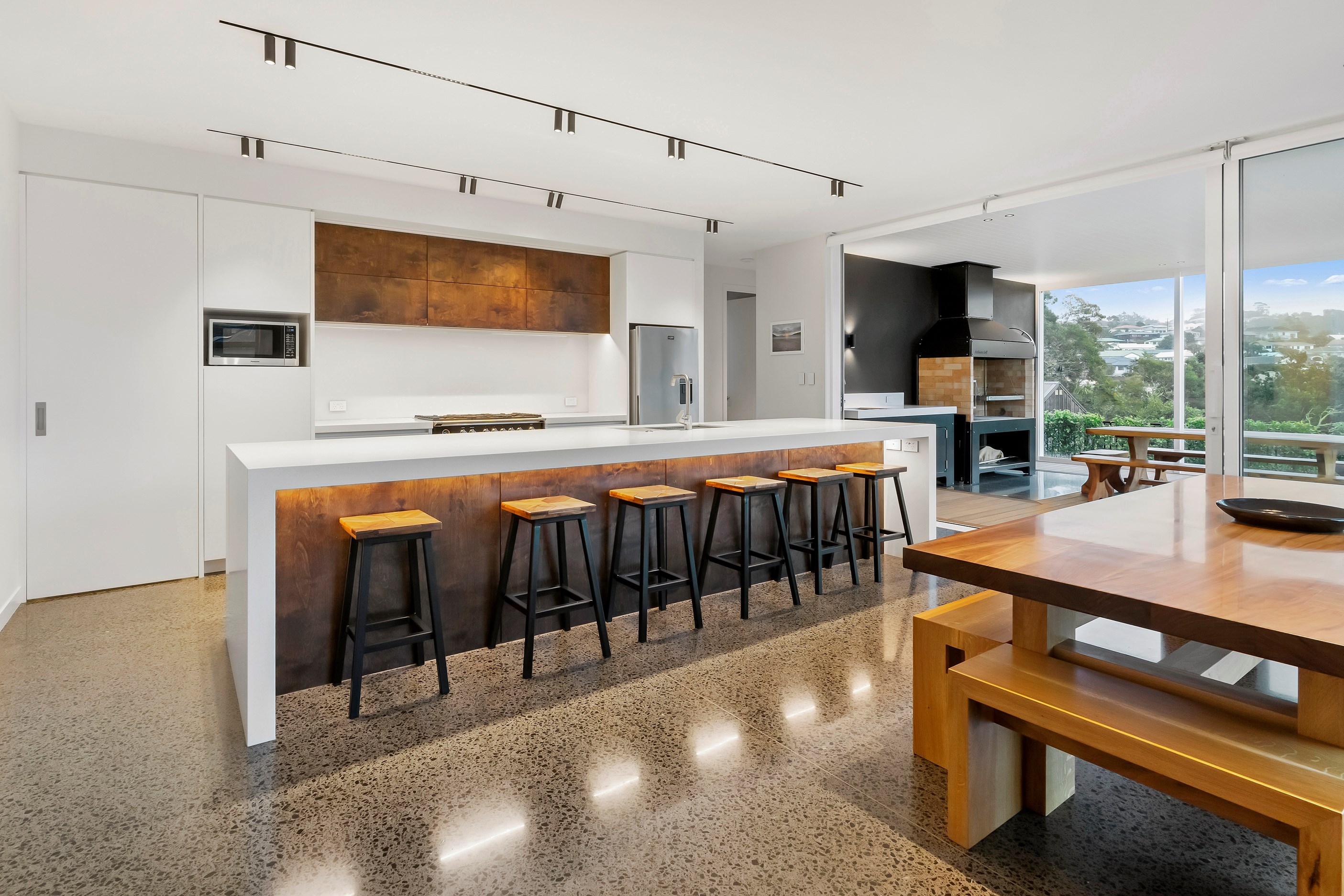 Coastal living doesn’t get much better than this — start your day by strolling to the beach for a morning dip then freshen up back home in the private outdoor shower, before enjoying breakfast on the sun-soaked deck. On the weekends it’s all about entertaining, with a walk-in commercial chiller to store the drinks and living spaces which flow seamlessly out to the partially covered deck, where the centrepiece is the Argentinian-style brick grill. Light filters into the 306sqm home, making details like the polished concrete floors and the solid walnut used on the wide staircase shine. The flooring in the entryway is also walnut as is the elevator flooring (accessibility is another highlight of this home). There’s plenty of room for family life, with two large living spaces on the open-plan ground floor partitioned off from the kitchen and dining area with carefully placed built-in shelving. Downstairs also houses a laundry, garage and guest toilet, and a scullery incorporating that famous walk-in chiller. Upstairs are four bedrooms, including a spacious main bedroom with ensuite, plus a study and family bathroom. Importantly, the house is also set up for a sustainable future, with solar panels and an EV car charging station.