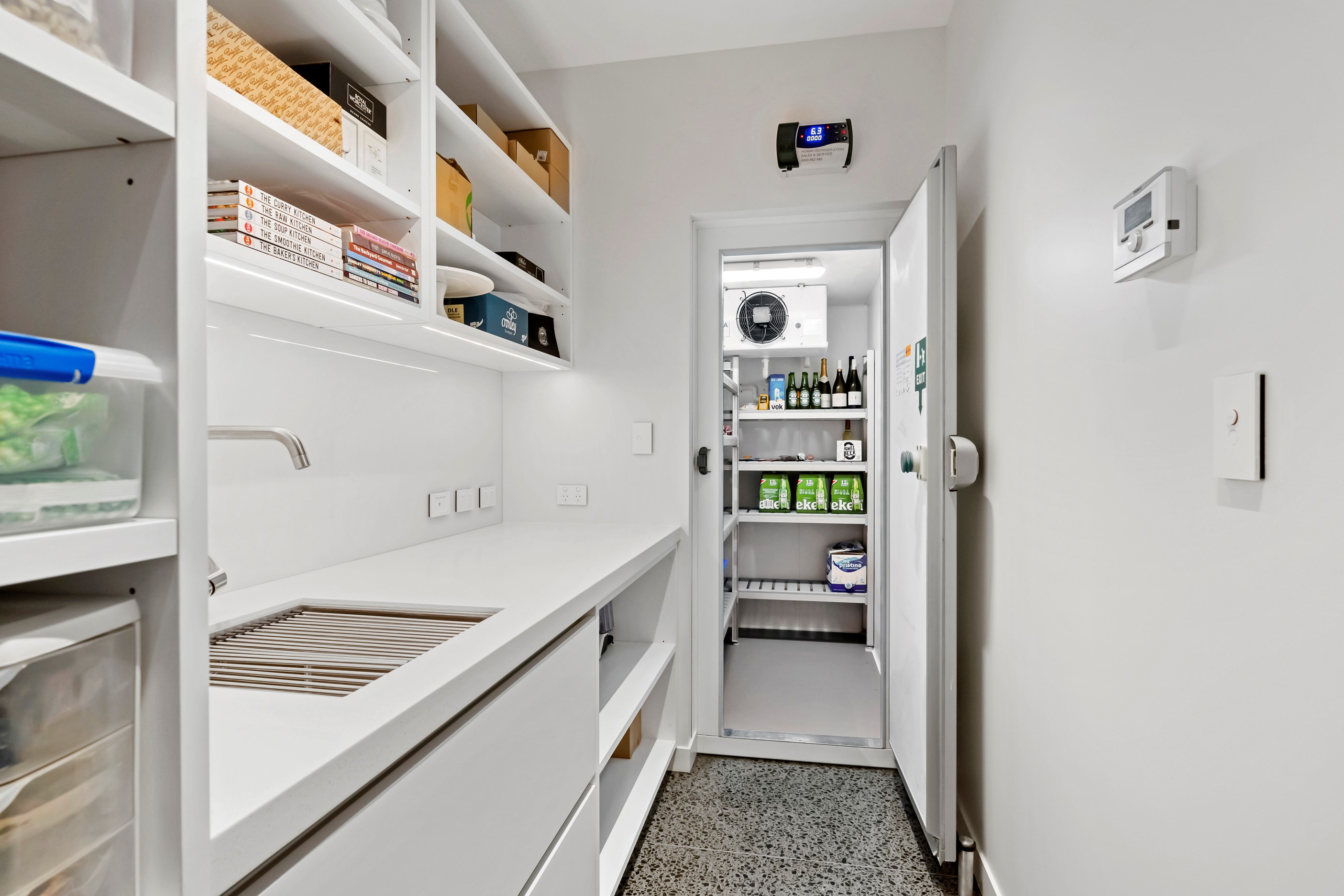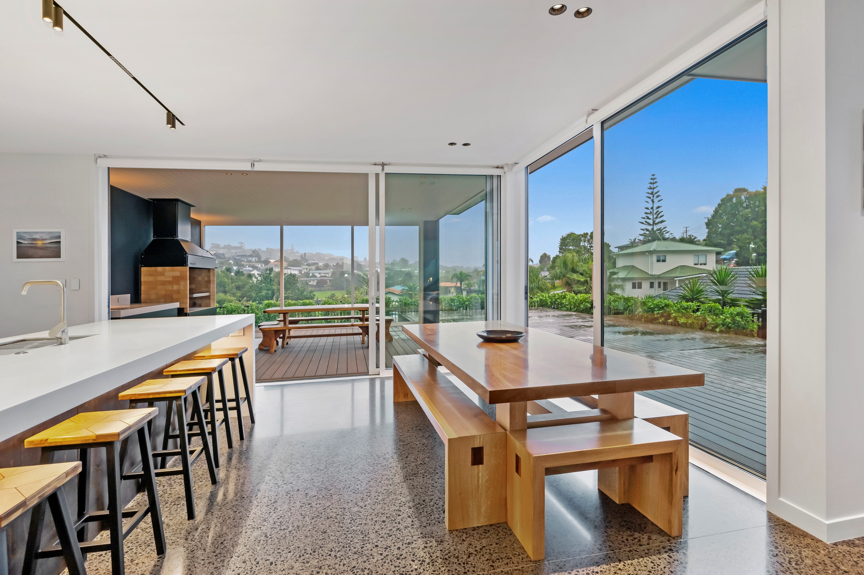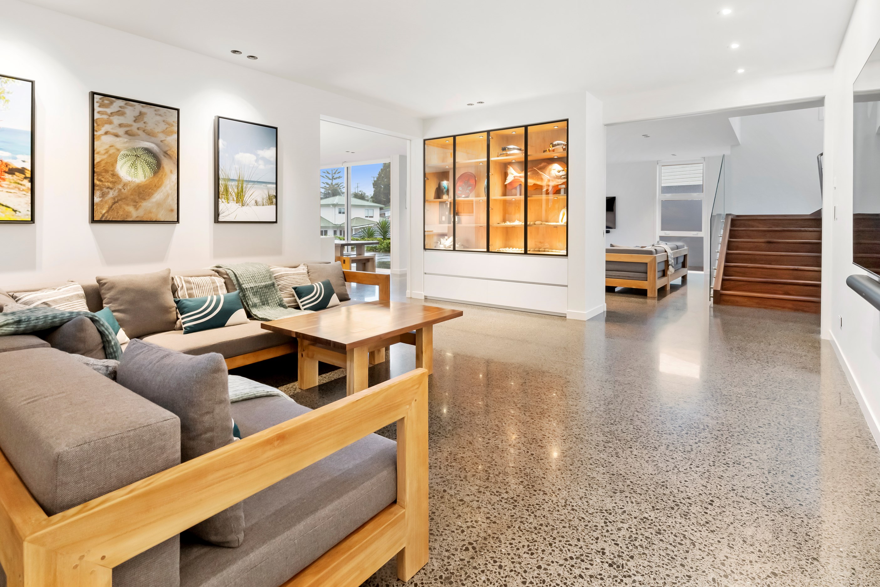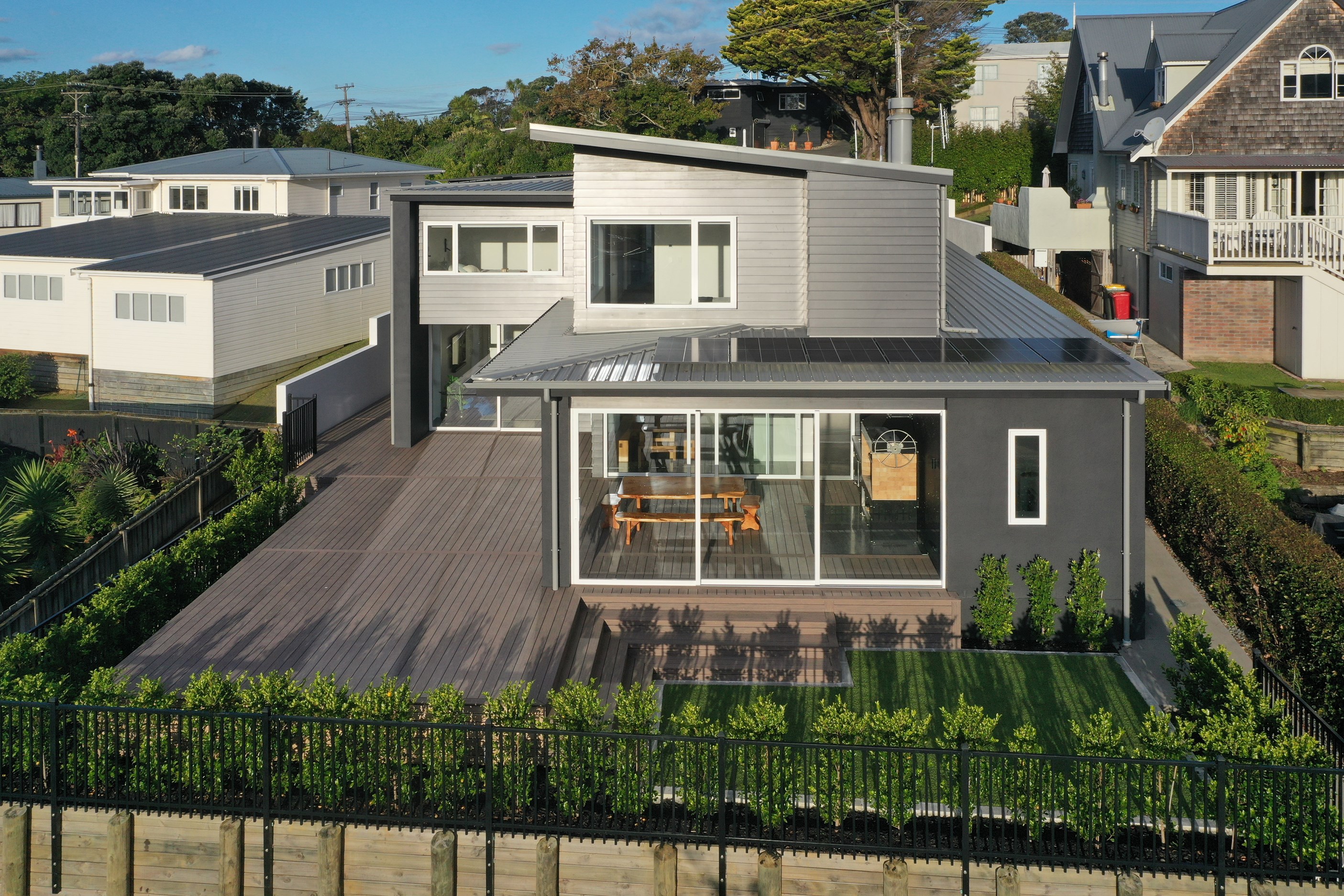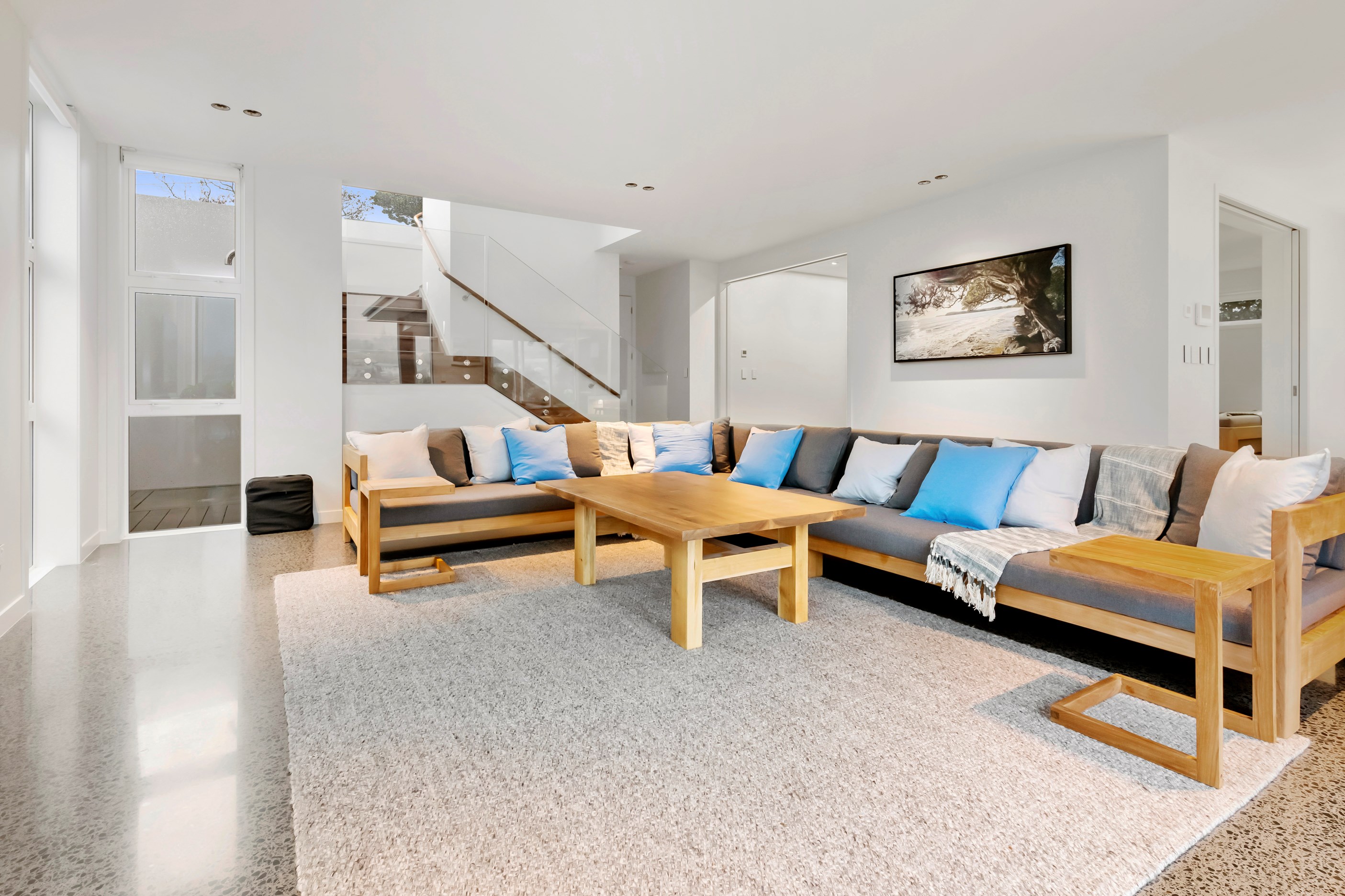 Coastal living doesn’t get much better than this — start your day by strolling to the beach for a morning dip then freshen up back home in the private outdoor shower, before enjoying breakfast on the sun-soaked deck. On the weekends it’s all about entertaining, with a walk-in commercial chiller to store the drinks and living spaces which flow seamlessly out to the partially covered deck, where the centrepiece is the Argentinian-style brick grill. Light filters into the 306sqm home, making details like the polished concrete floors and the solid walnut used on the wide staircase shine. The flooring in the entryway is also walnut as is the elevator flooring (accessibility is another highlight of this home). There’s plenty of room for family life, with two large living spaces on the open-plan ground floor partitioned off from the kitchen and dining area with carefully placed built-in shelving. Downstairs also houses a laundry, garage and guest toilet, and a scullery incorporating that famous walk-in chiller. Upstairs are four bedrooms, including a spacious main bedroom with ensuite, plus a study and family bathroom. Importantly, the house is also set up for a sustainable future, with solar panels and an EV car charging station.