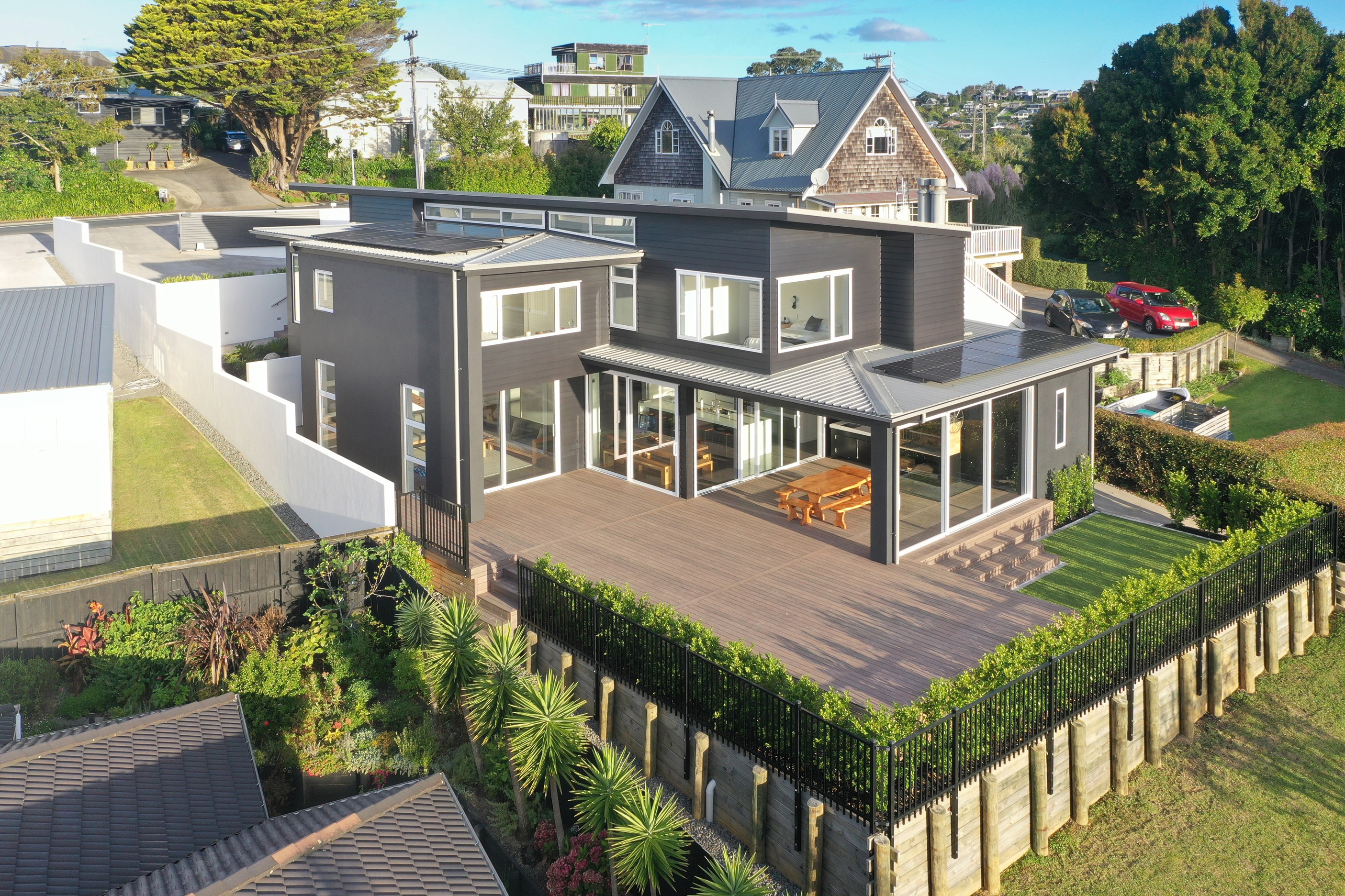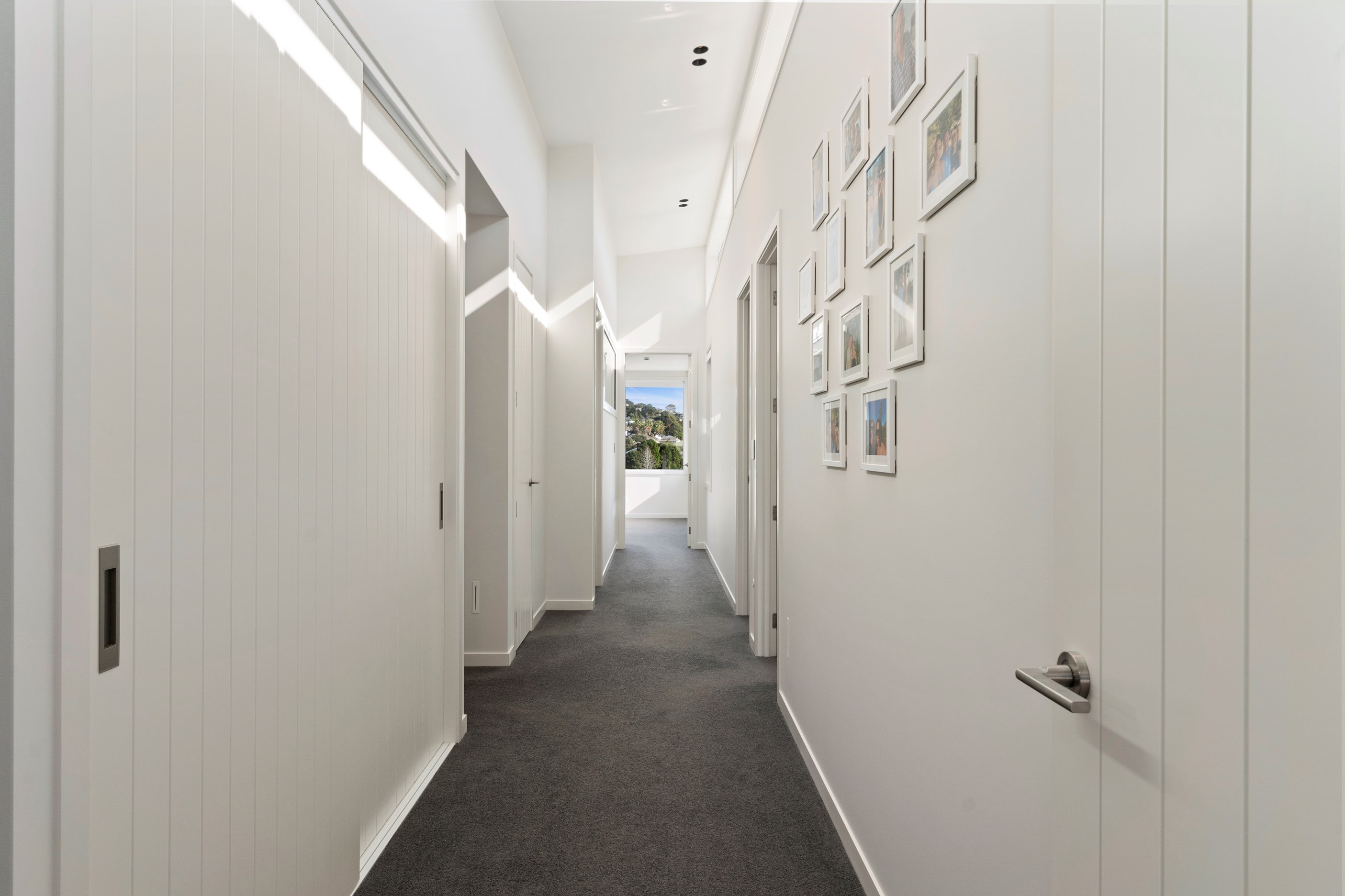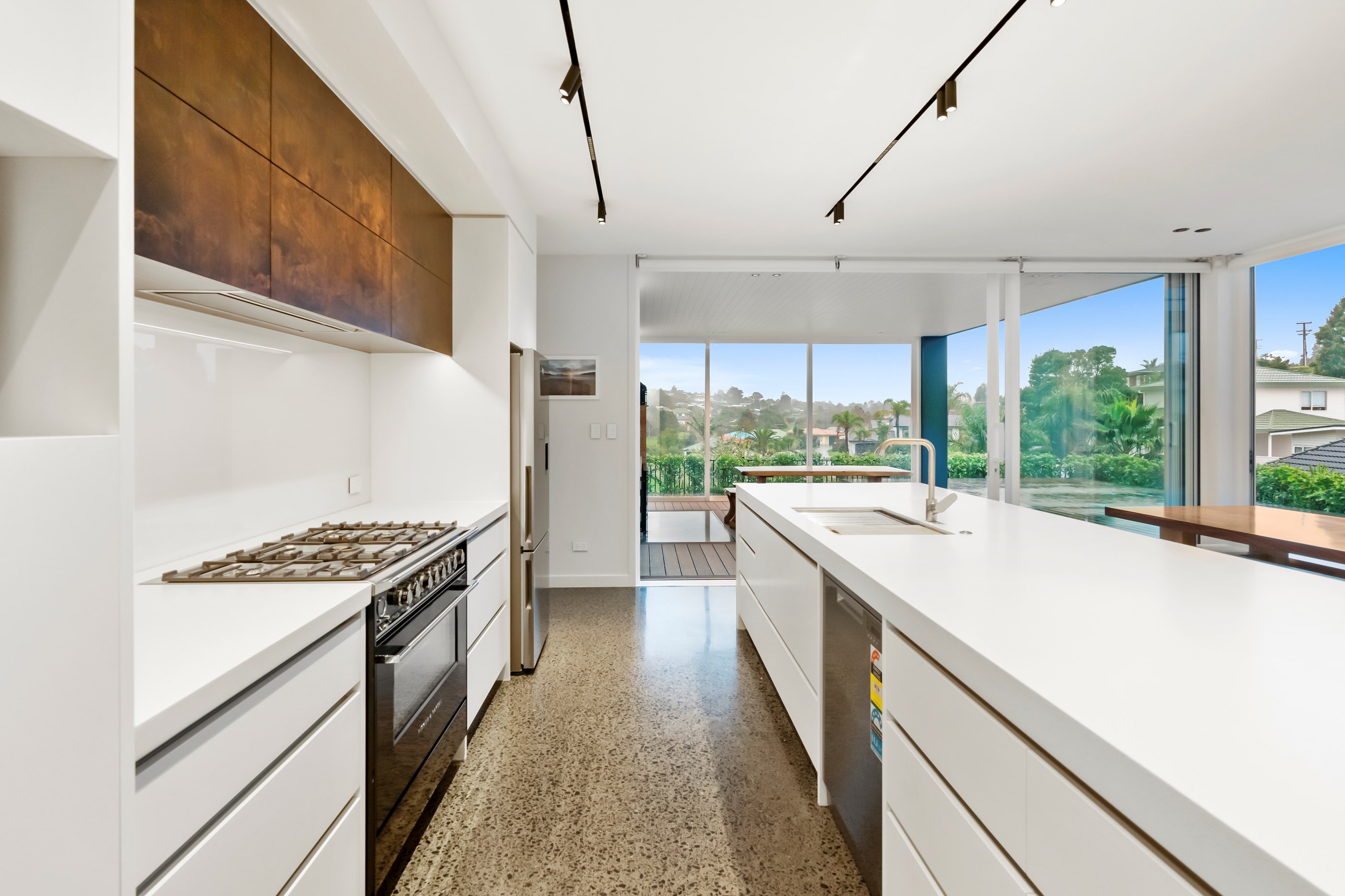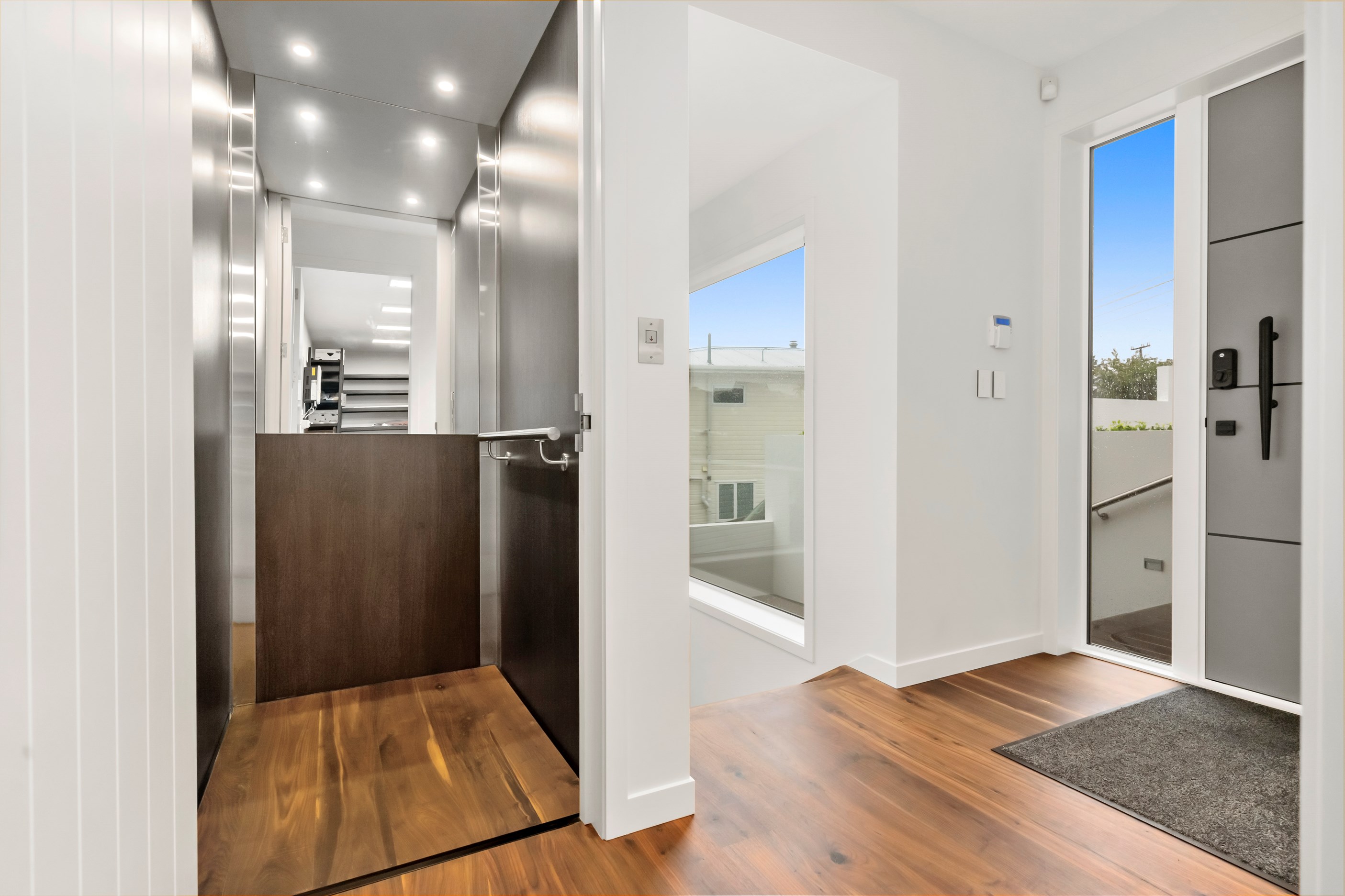 Coastal living doesn’t get much better than this — start your day by strolling to the beach for a morning dip then freshen up back home in the private outdoor shower, before enjoying breakfast on the sun-soaked deck. On the weekends it’s all about entertaining, with a walk-in commercial chiller to store the drinks and living spaces which flow seamlessly out to the partially covered deck, where the centrepiece is the Argentinian-style brick grill. Light filters into the 306sqm home, making details like the polished concrete floors and the solid walnut used on the wide staircase shine. The flooring in the entryway is also walnut as is the elevator flooring (accessibility is another highlight of this home). There’s plenty of room for family life, with two large living spaces on the open-plan ground floor partitioned off from the kitchen and dining area with carefully placed built-in shelving. Downstairs also houses a laundry, garage and guest toilet, and a scullery incorporating that famous walk-in chiller. Upstairs are four bedrooms, including a spacious main bedroom with ensuite, plus a study and family bathroom. Importantly, the house is also set up for a sustainable future, with solar panels and an EV car charging station.
